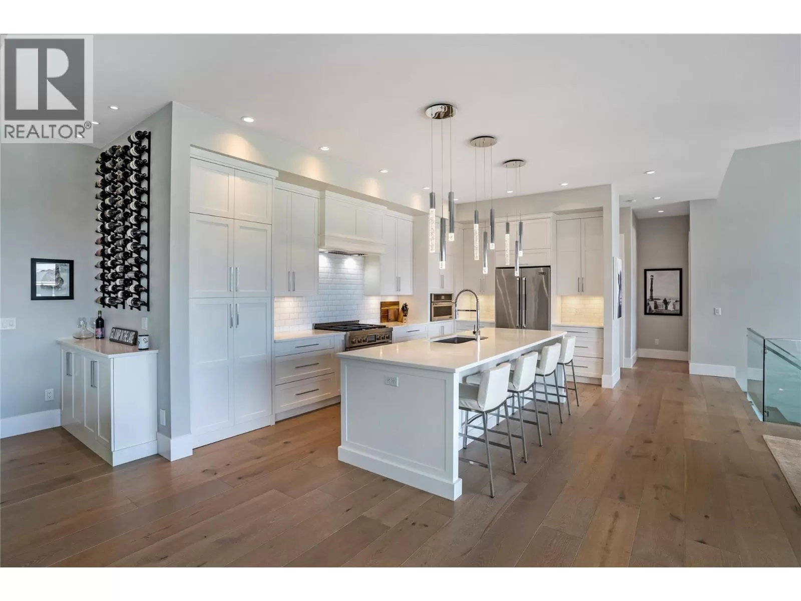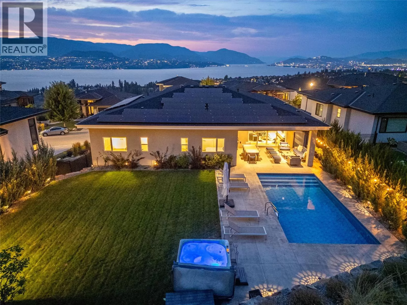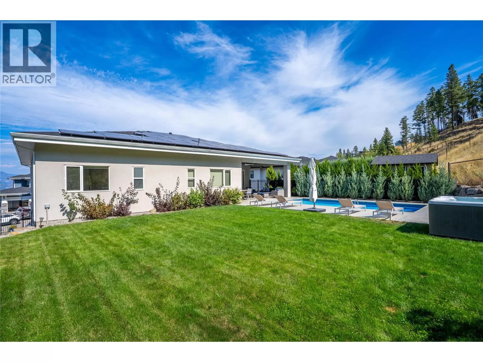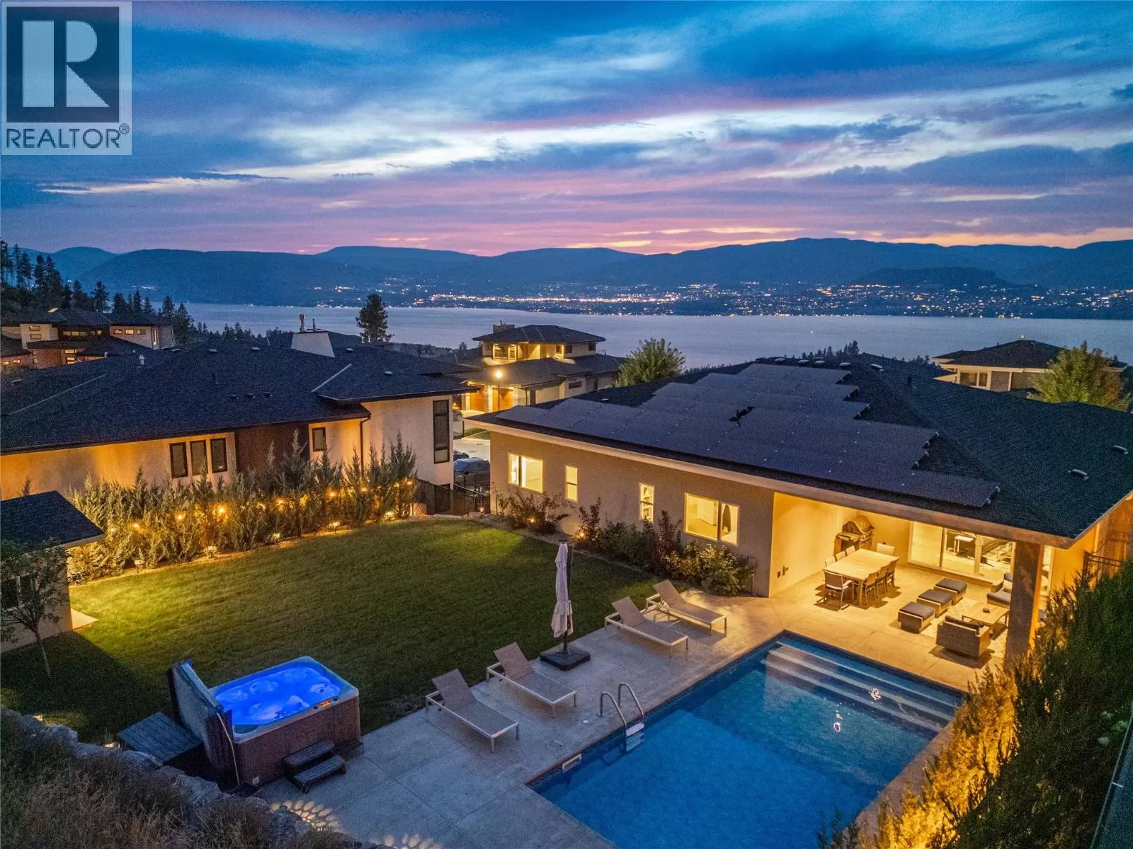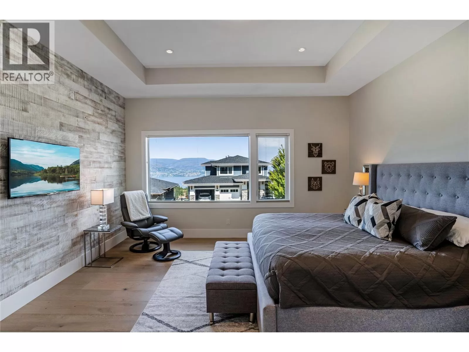 Discover custom-built luxury in this stunning 5-bedroom, 5-bath home featuring a bright, legal 1-bedroom ground-level suite. This high-efficiency smart home boasts soaring vaulted ceilings, a dramatic floating staircase, and rich wide plank wood floors. The open-concept main floor centers around a chefâs kitchen with quartz countertops, custom cabinetry, and a hidden walk-in butlerâs pantry. Flow effortlessly into the spacious dining and living areas warmed by a gas fireplace, then step out onto the front deck to enjoy Okanagan Lake and mountain views. The private backyard is an entertainerâs dream with a heated saltwater pool, hot tub, and ample space to relax or host gatherings. The main-level master suite offers a spa-like retreat with a soaker tub, glass-enclosed shower, and double floating vanity with undermount lighting. Two additional bedrooms share a stylish Jack & Jill bath, with one bedroom featuring a queen Murphy bedâideal for guests or a home office. A large laundry room with abundant counters and cabinetry enhances daily functionality. The lower level features a generous rec room with an electric fireplace, wet bar, guest bedroom, and full bath. The oversized three-car garage easily fits a boat, a car, and plenty of toys. Exceptional millwork, designer fixtures, and quality finishes elevate every room. Enjoy close proximity to top schools, parks, dining, and Okanaganâs renowned wineries. Luxury, comfort, and thoughtful design converge in this remarkable home. (id:27476)