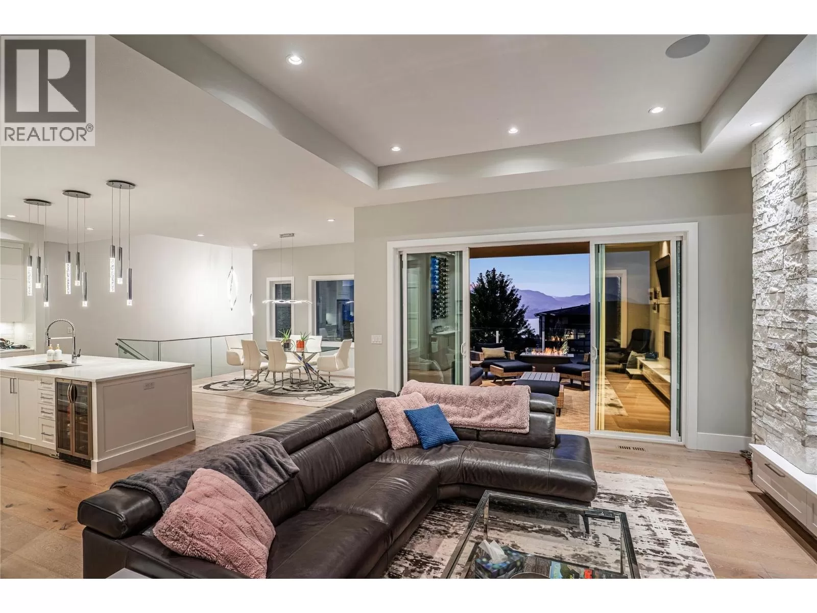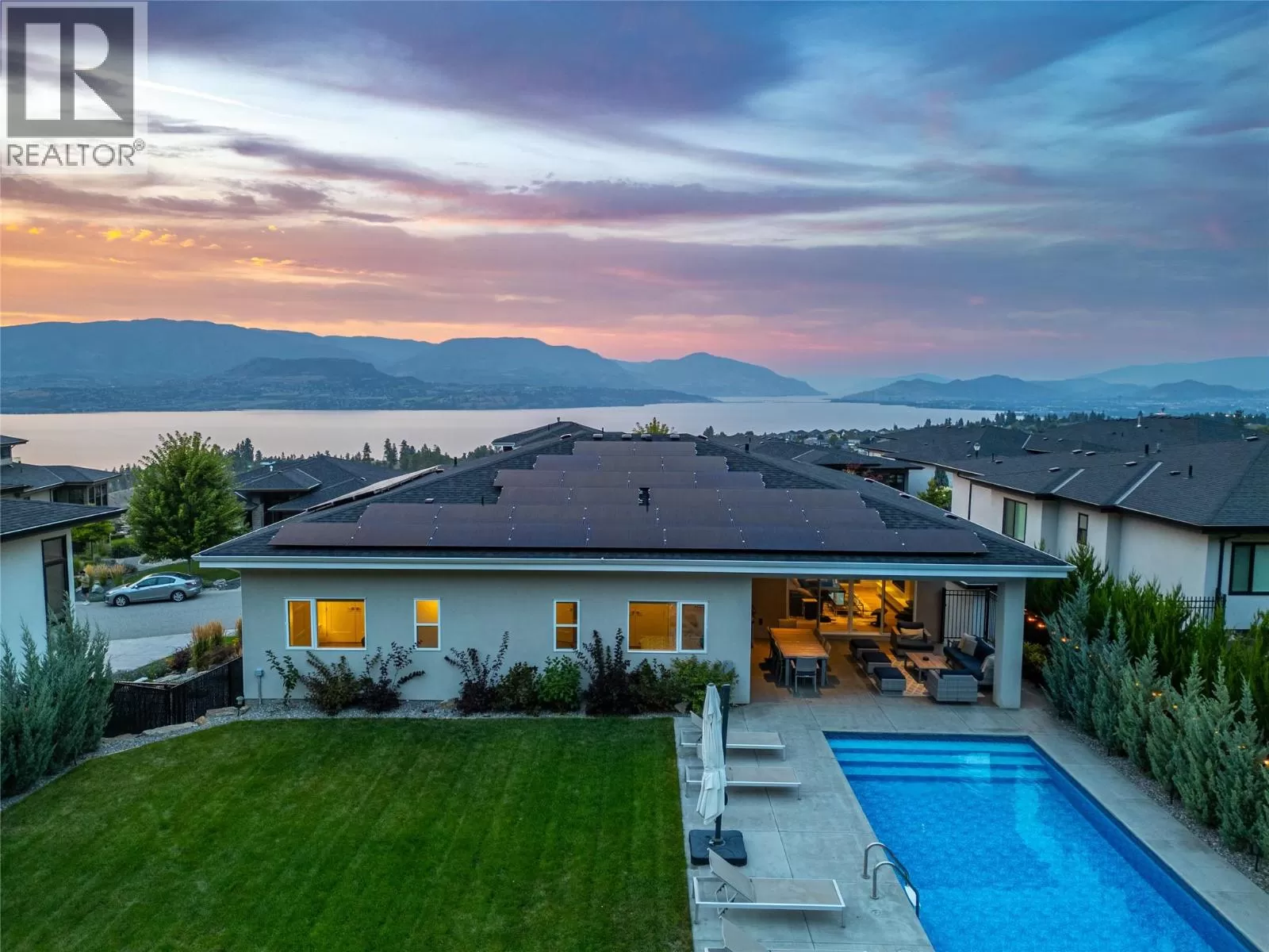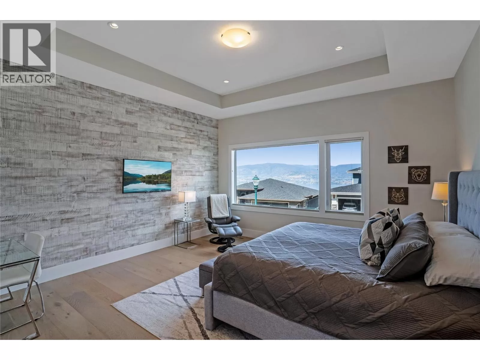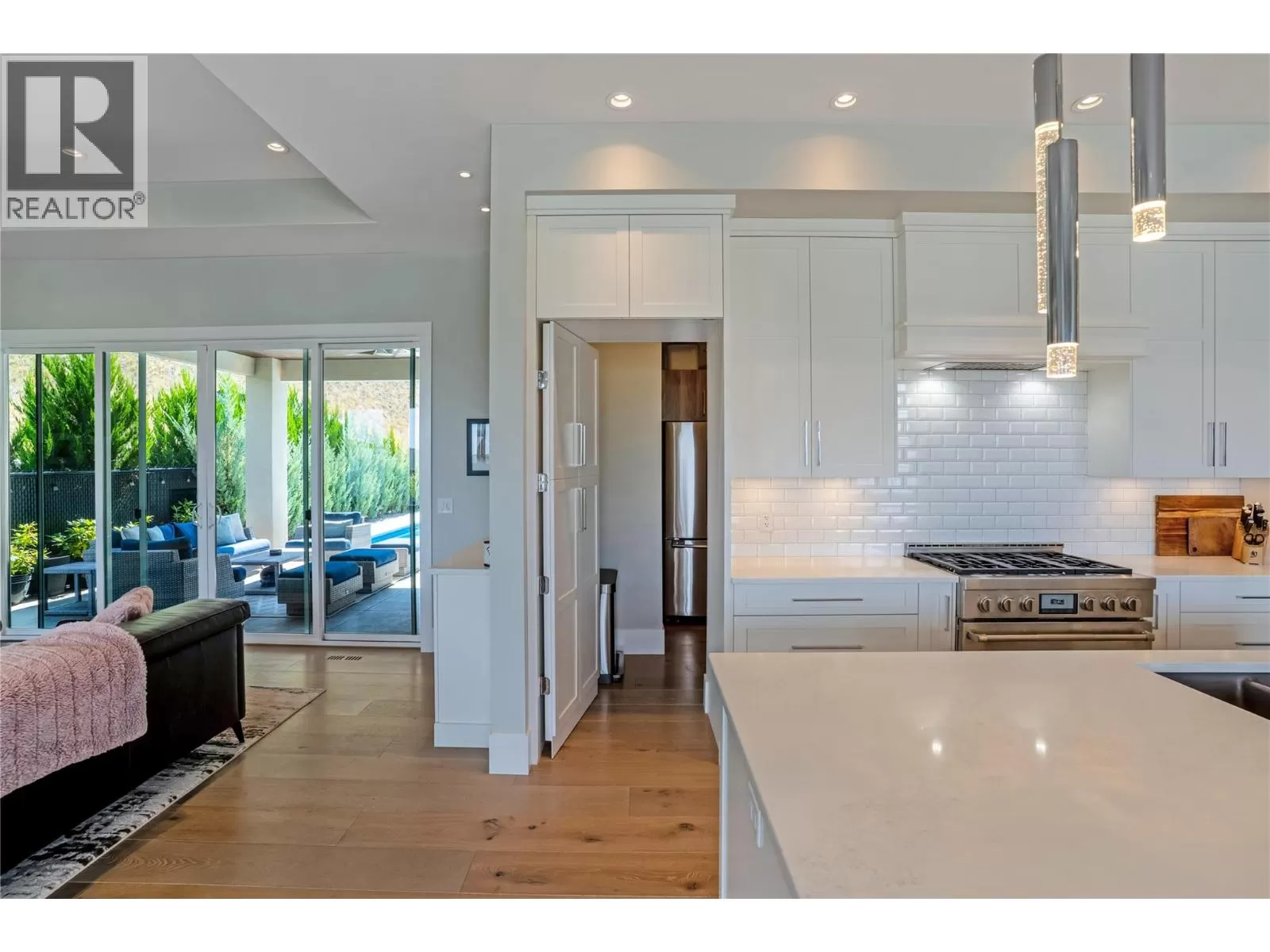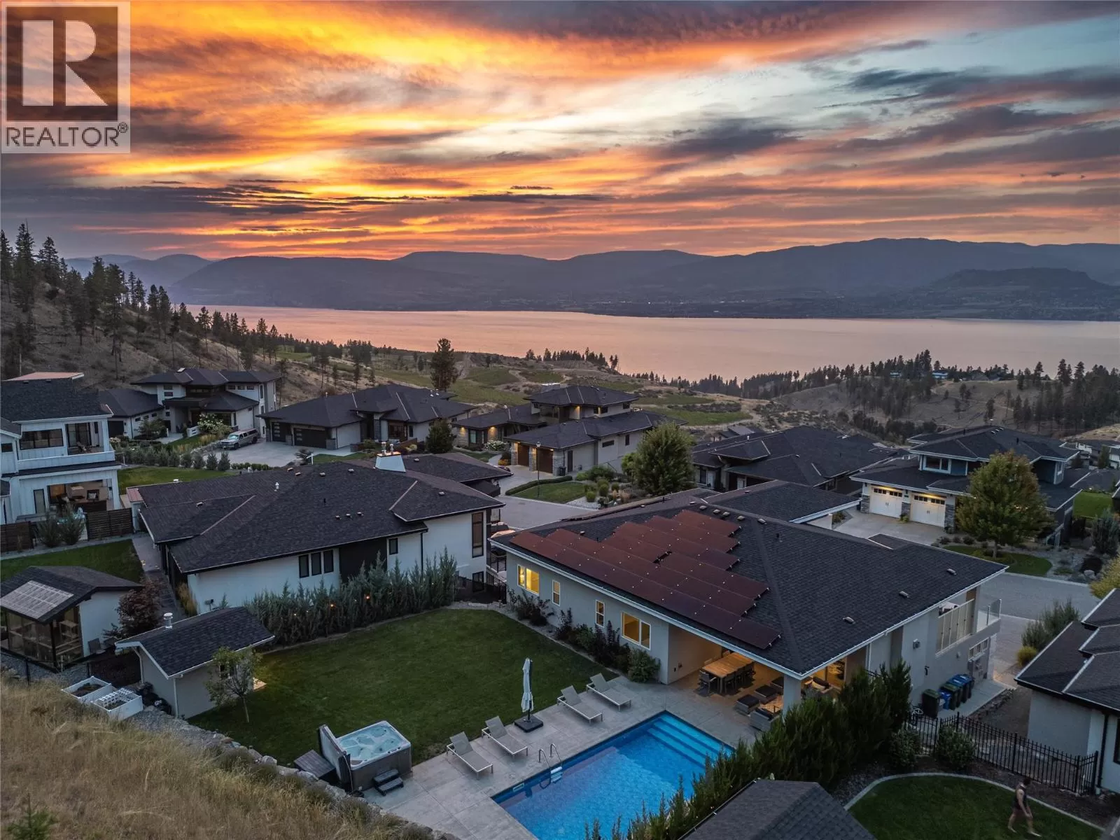 Discover custom-built luxury in this stunning 5-bedroom, 5-bath home featuring a bright, legal 1-bedroom ground-level suite. This high-efficiency smart home boasts soaring vaulted ceilings, a dramatic floating staircase, and rich wide plank wood floors. The open-concept main floor centers around a chefâs kitchen with quartz countertops, custom cabinetry, and a hidden walk-in butlerâs pantry. Flow effortlessly into the spacious dining and living areas warmed by a gas fireplace, then step out onto the front deck to enjoy Okanagan Lake and mountain views. The private backyard is an entertainerâs dream with a heated saltwater pool, hot tub, and ample space to relax or host gatherings. The main-level master suite offers a spa-like retreat with a soaker tub, glass-enclosed shower, and double floating vanity with undermount lighting. Two additional bedrooms share a stylish Jack & Jill bath, with one bedroom featuring a queen Murphy bedâideal for guests or a home office. A large laundry room with abundant counters and cabinetry enhances daily functionality. The lower level features a generous rec room with an electric fireplace, wet bar, guest bedroom, and full bath. The oversized three-car garage easily fits a boat, a car, and plenty of toys. Exceptional millwork, designer fixtures, and quality finishes elevate every room. Enjoy close proximity to top schools, parks, dining, and Okanaganâs renowned wineries. Luxury, comfort, and thoughtful design converge in this remarkable home. (id:27476)