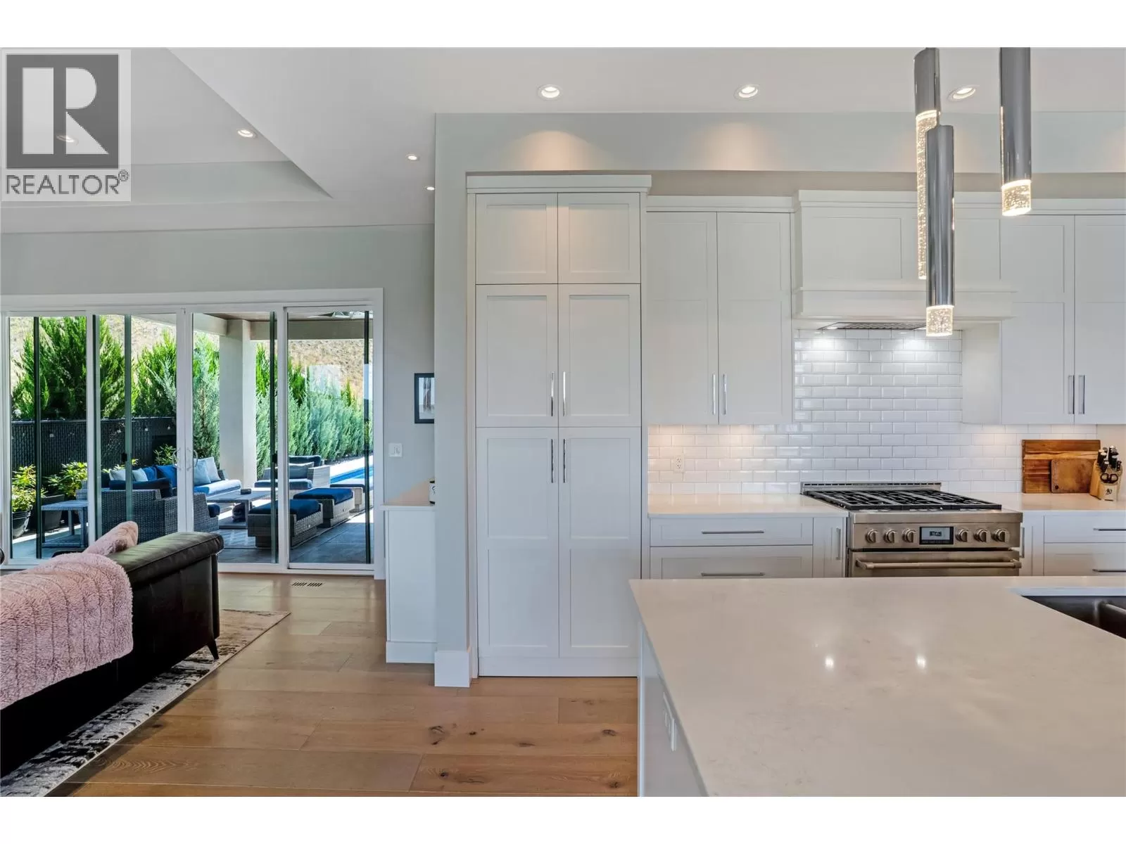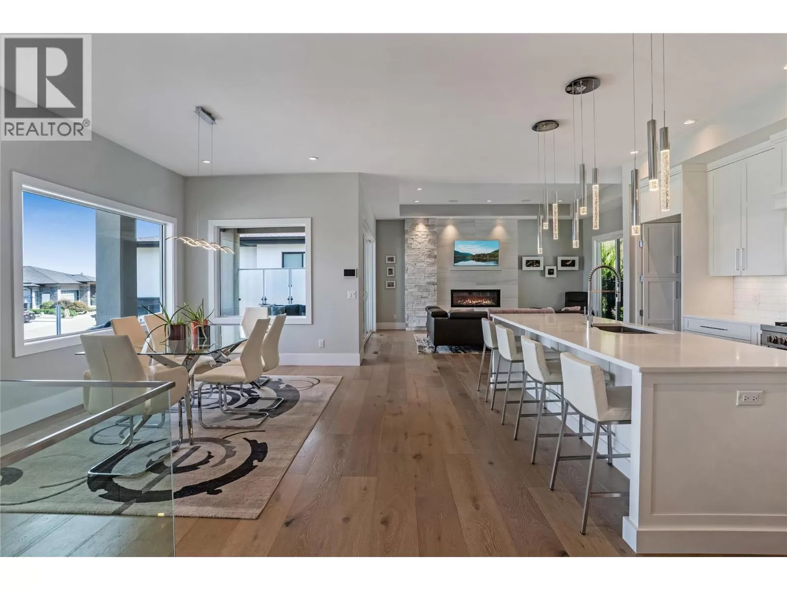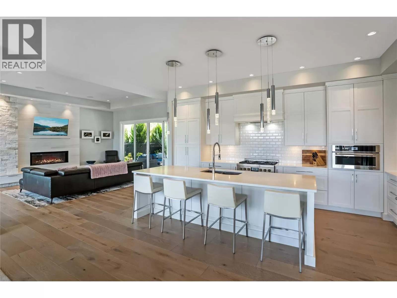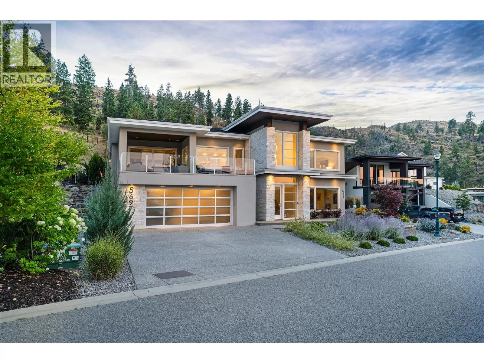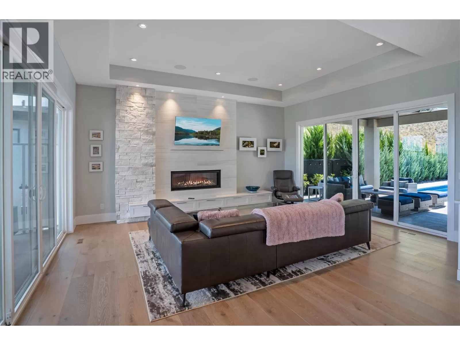 Discover custom-built luxury in this stunning 5-bedroom, 5-bath home featuring a bright, legal 1-bedroom ground-level suite. This high-efficiency smart home boasts soaring vaulted ceilings, a dramatic floating staircase, and rich wide plank wood floors. The open-concept main floor centers around a chefâs kitchen with quartz countertops, custom cabinetry, and a hidden walk-in butlerâs pantry. Flow effortlessly into the spacious dining and living areas warmed by a gas fireplace, then step out onto the front deck to enjoy Okanagan Lake and mountain views. The private backyard is an entertainerâs dream with a heated saltwater pool, hot tub, and ample space to relax or host gatherings. The main-level master suite offers a spa-like retreat with a soaker tub, glass-enclosed shower, and double floating vanity with undermount lighting. Two additional bedrooms share a stylish Jack & Jill bath, with one bedroom featuring a queen Murphy bedâideal for guests or a home office. A large laundry room with abundant counters and cabinetry enhances daily functionality. The lower level features a generous rec room with an electric fireplace, wet bar, guest bedroom, and full bath. The oversized three-car garage easily fits a boat, a car, and plenty of toys. Exceptional millwork, designer fixtures, and quality finishes elevate every room. Enjoy close proximity to top schools, parks, dining, and Okanaganâs renowned wineries. Luxury, comfort, and thoughtful design converge in this remarkable home. (id:27476)