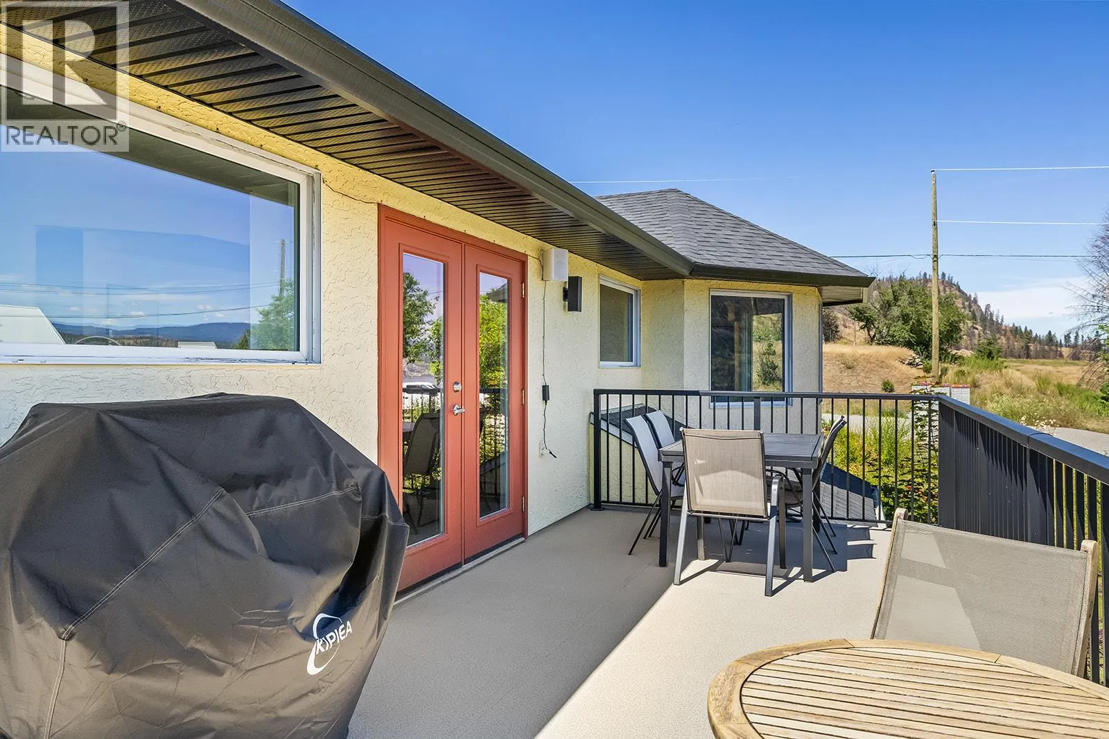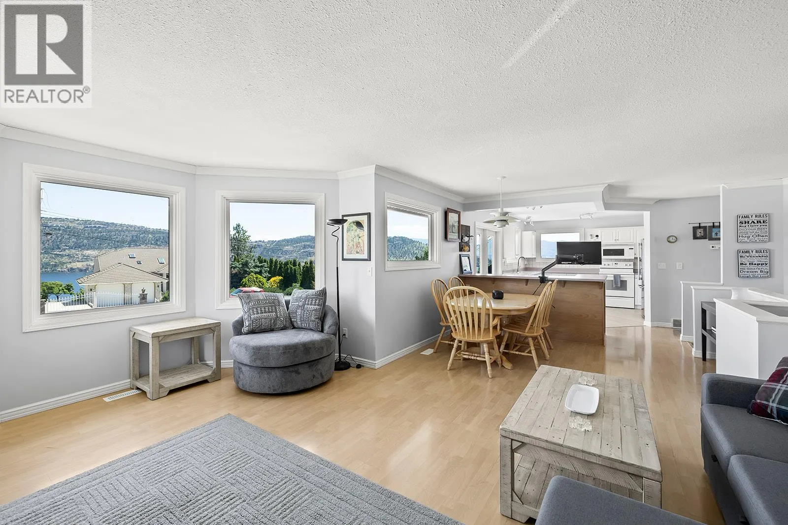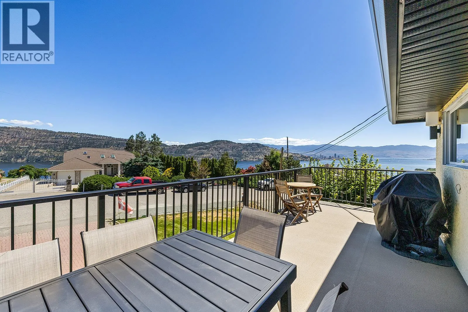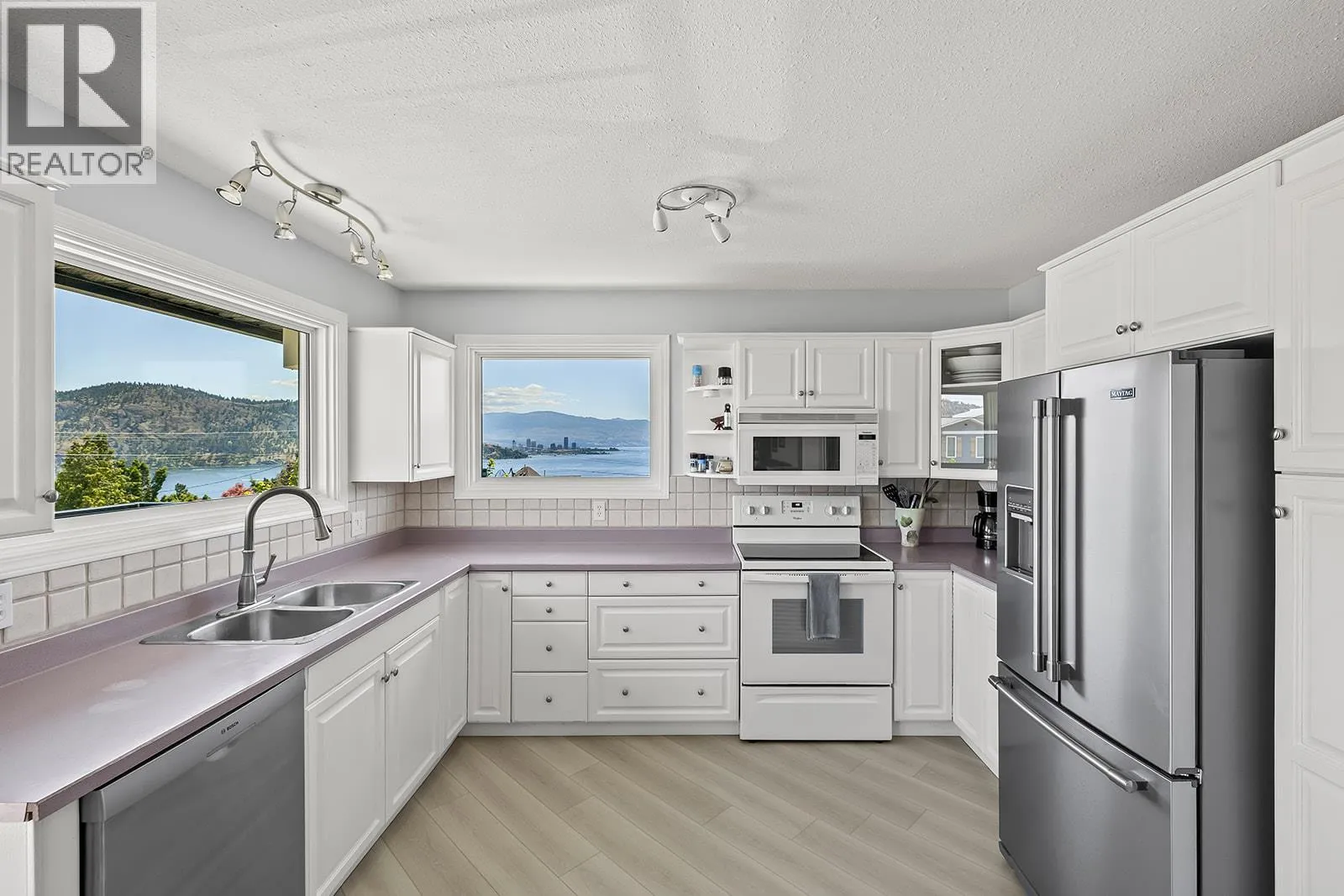 Massive lakeviews define this beautifully updated 4 bed, 3 bath, 2,260 sq. ft. home. The main level offers 3 bedrooms and 2 bathrooms, a bright living space with updated lighting, new kitchen flooring, a new fridge and dishwasher, plus a wraparound deck that showcases panoramic views stretching across Okanagan Lake. The primary bedroom includes a large closet and 4-pce ensuite. The lower level has been fully renovated with its own laundry, new floors, new kitchen, and fresh paint. Recent updates include full exterior paint, giving the home a fresh, modern look. Additional features: double garage, underground irrigation, fenced dog run, and a brand new cabin, with a sleeping loft and a WETT Certified wood burning stove. This move-in ready property combines income flexibility, updated living spaces, and some of the best lake views the Okanagan has to offer (id:27476)