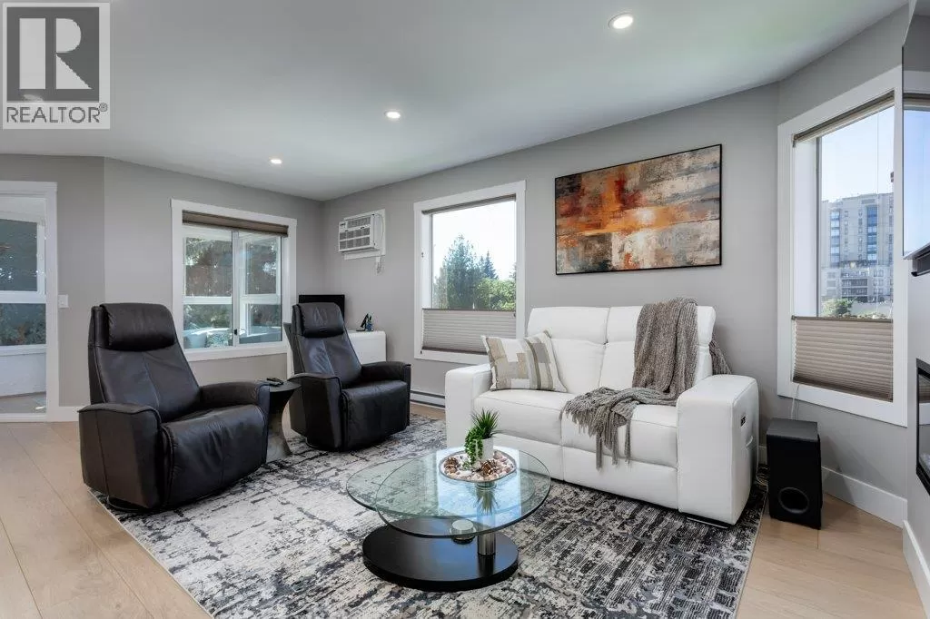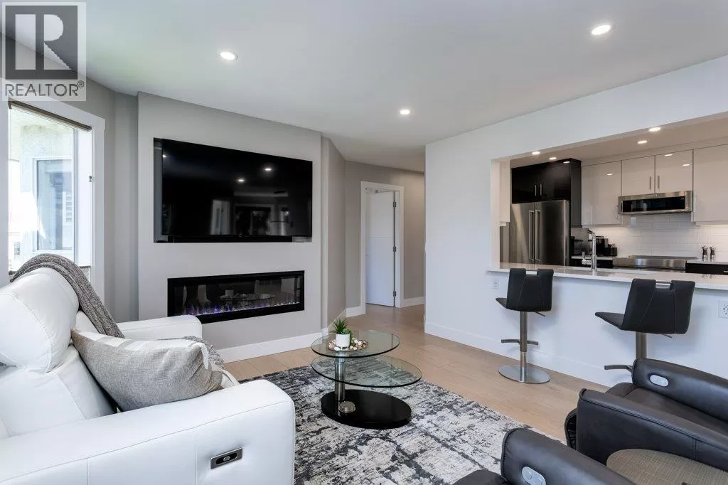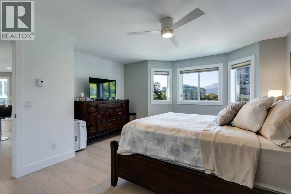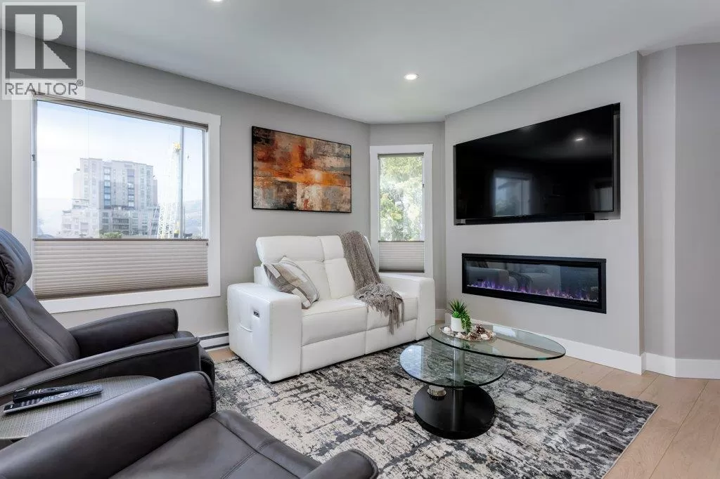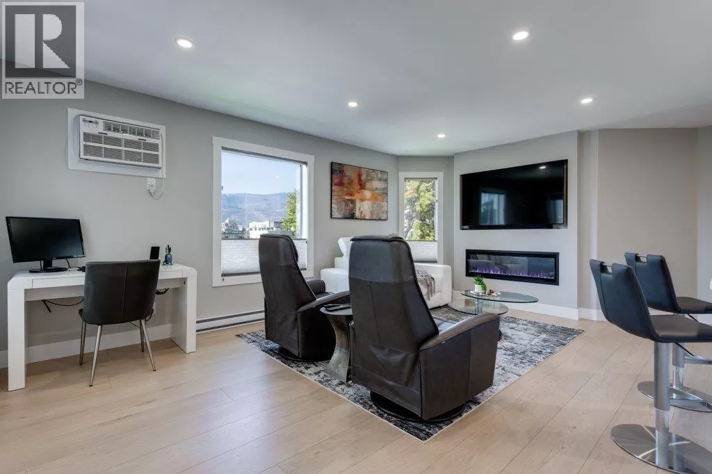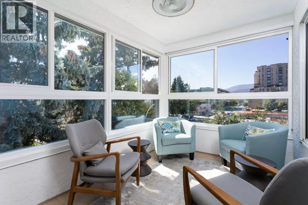 Top Floor, Corner, No expense spared in the total renovation of this larger than most 2 bedroom + 2 bath + Sunroom split plan condo in the heart of downtown Kelowna. The pictures tell the story. Nothing has been overlooked in the high-end renovation of this west-facing top-floor home. High-gloss, soft-close cabinets, all new stainless Kitchenaid appliances, including: induction range, wine fridge, quartz countertops, linear fireplace and wide-plank laminate flooring. Quiet corner unit with great light-filled rooms and added usable sq. footage with an enclosed sunroom. This condo is in an excellent location close to everything downtown has to offer and is move-in ready. Additional storage off the lobby (locker 309). Parking is conveniently located(#36) a second stall is available from strata ($30/month), plus on-site visitor parking and a car wash area. Social room is off the elevator on the 2nd floor, Gym off the elevator on the 3rd floor. BBQ area, and great sundeck off the back of the elevated first floor. Don't miss this opportunity to live in style downtown for a great price! This is a 55+ building and pets are not allowed. (id:27476)