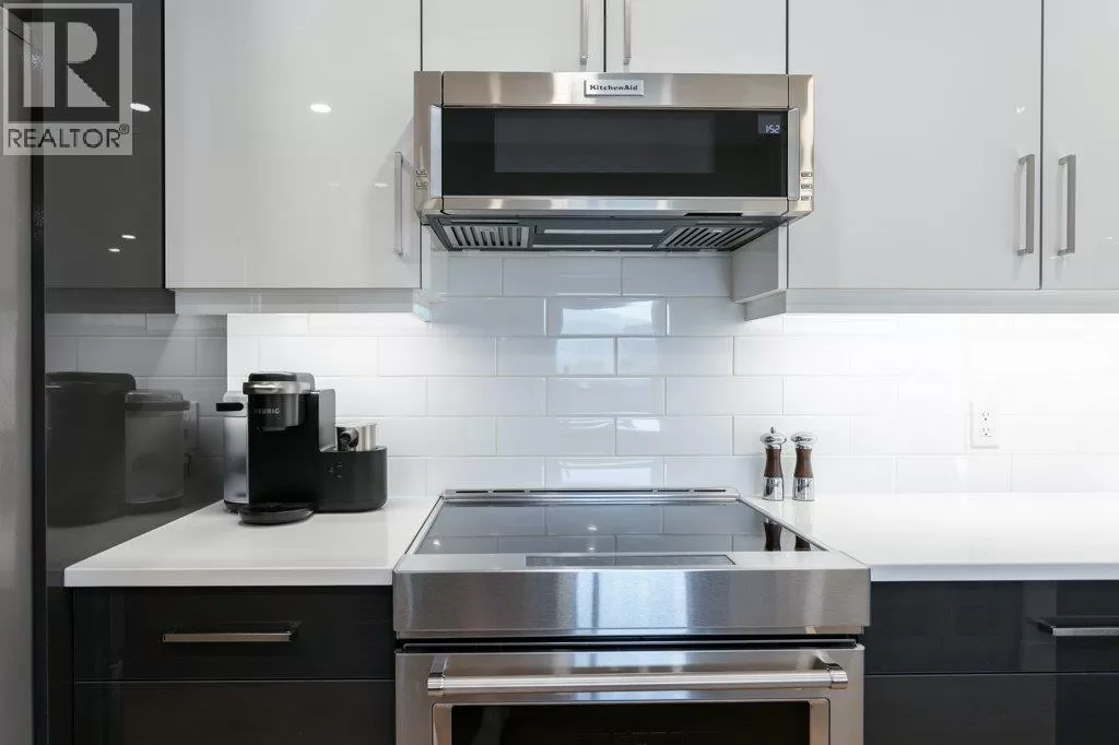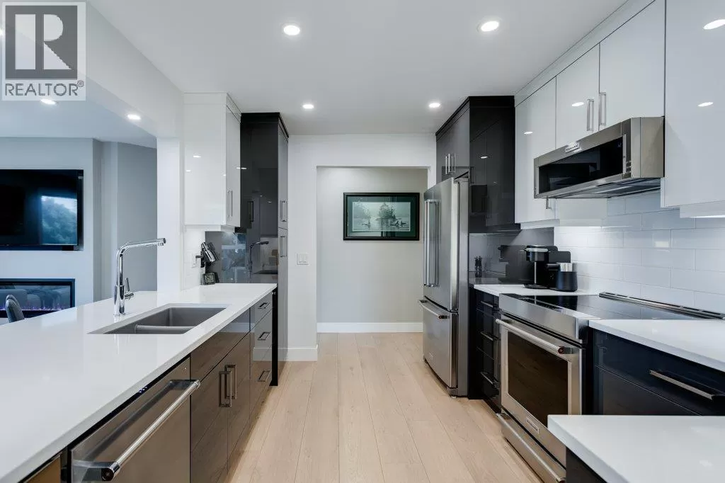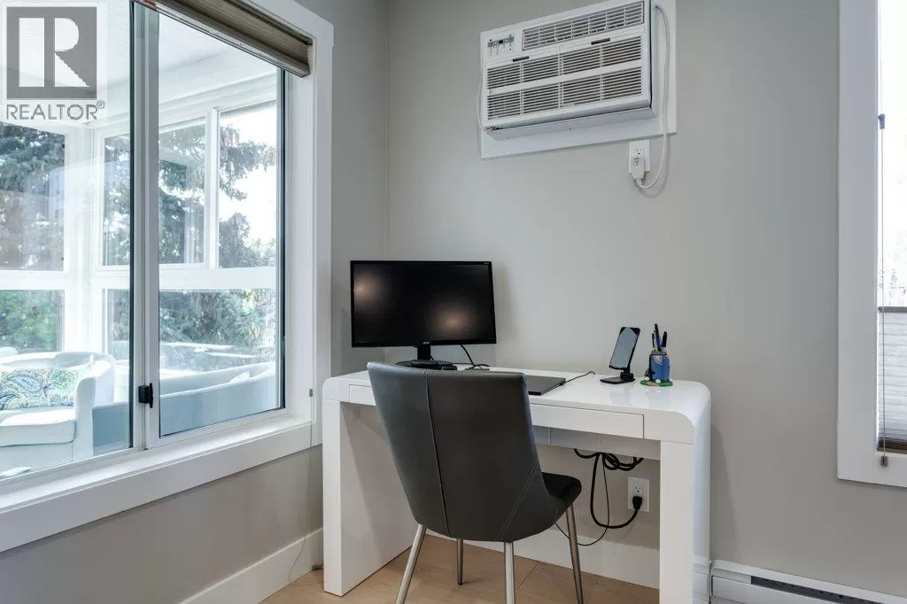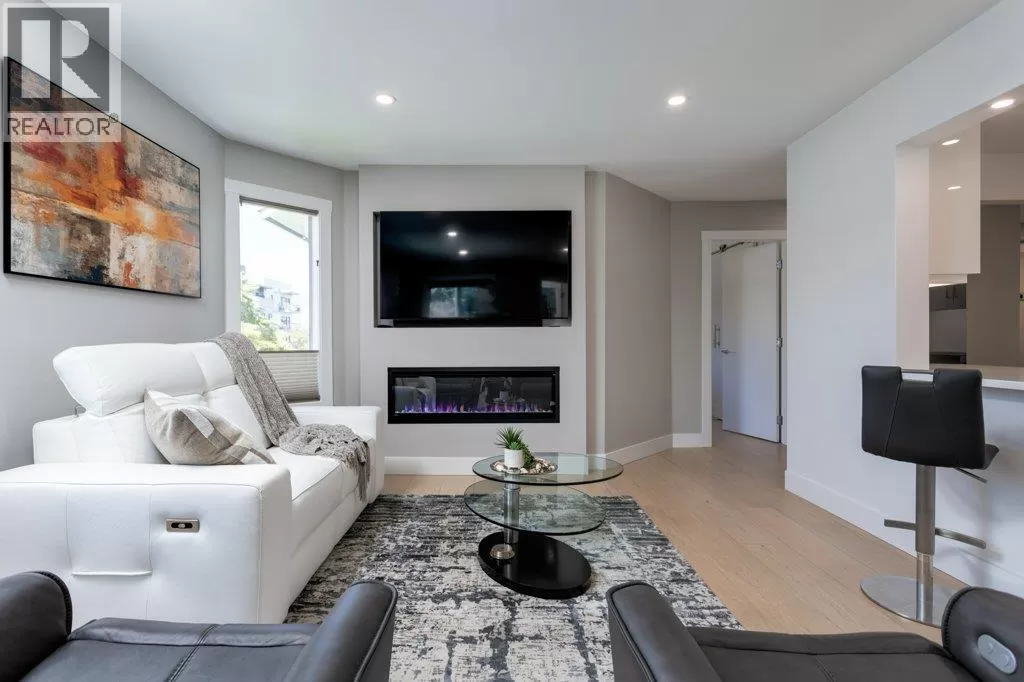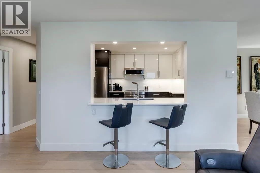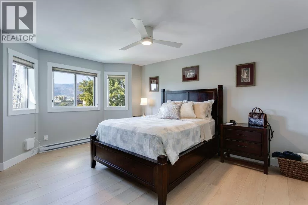 Top Floor, Corner, No expense spared in the total renovation of this larger than most 2 bedroom + 2 bath + Sunroom split plan condo in the heart of downtown Kelowna. The pictures tell the story. Nothing has been overlooked in the high-end renovation of this west-facing top-floor home. High-gloss, soft-close cabinets, all new stainless Kitchenaid appliances, including: induction range, wine fridge, quartz countertops, linear fireplace and wide-plank laminate flooring. Quiet corner unit with great light-filled rooms and added usable sq. footage with an enclosed sunroom. This condo is in an excellent location close to everything downtown has to offer and is move-in ready. Additional storage off the lobby (locker 309). Parking is conveniently located(#36) a second stall is available from strata ($30/month), plus on-site visitor parking and a car wash area. Social room is off the elevator on the 2nd floor, Gym off the elevator on the 3rd floor. BBQ area, and great sundeck off the back of the elevated first floor. Don't miss this opportunity to live in style downtown for a great price! This is a 55+ building and pets are not allowed. (id:27476)