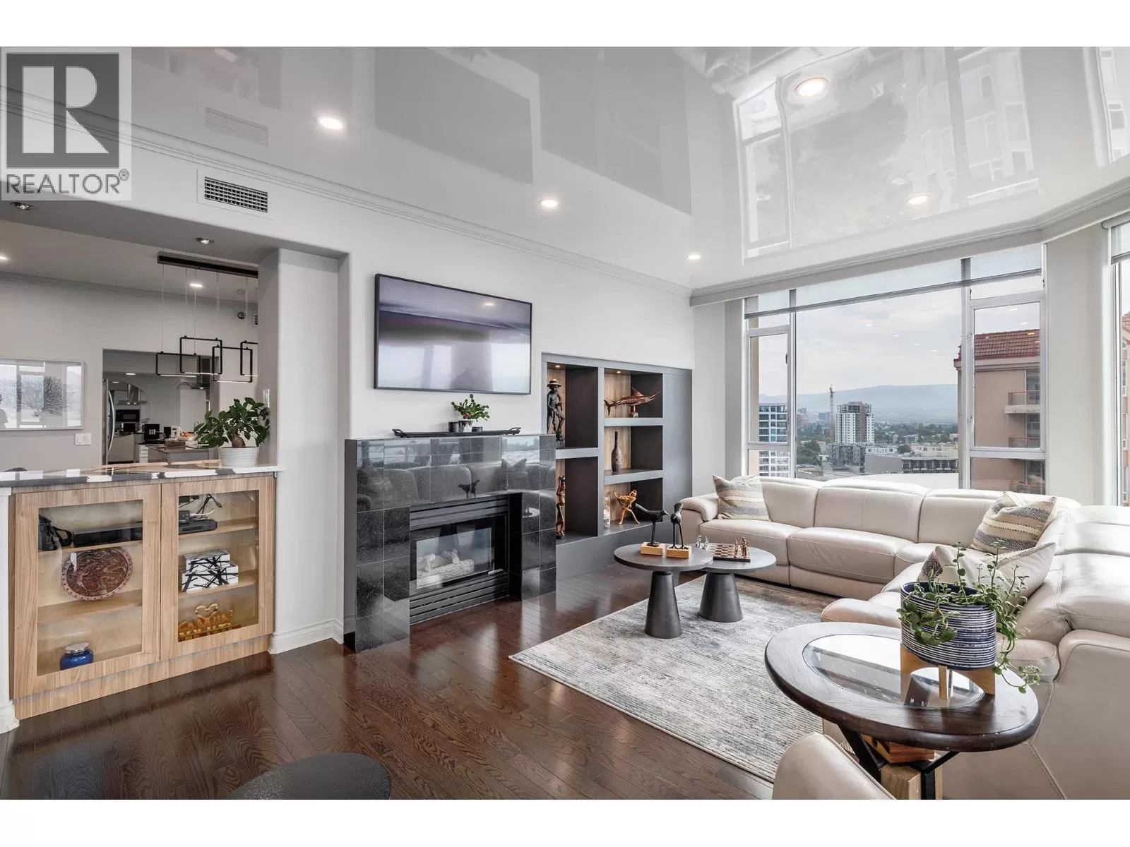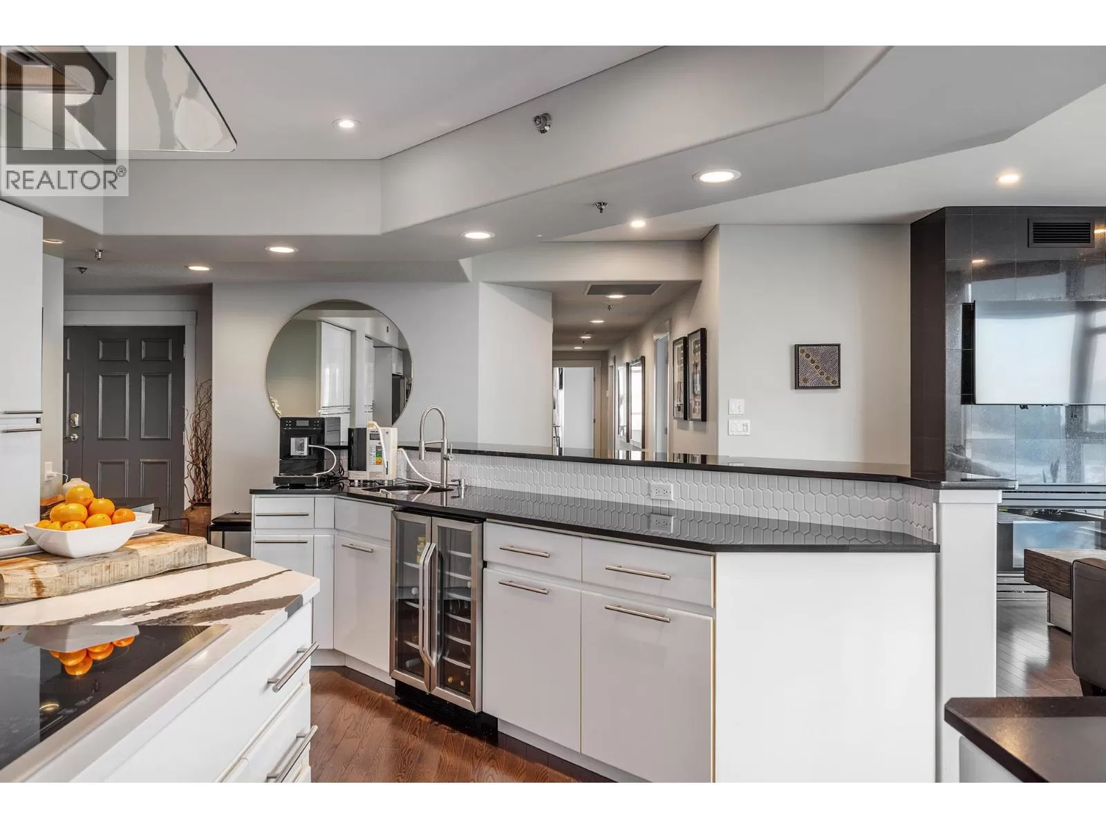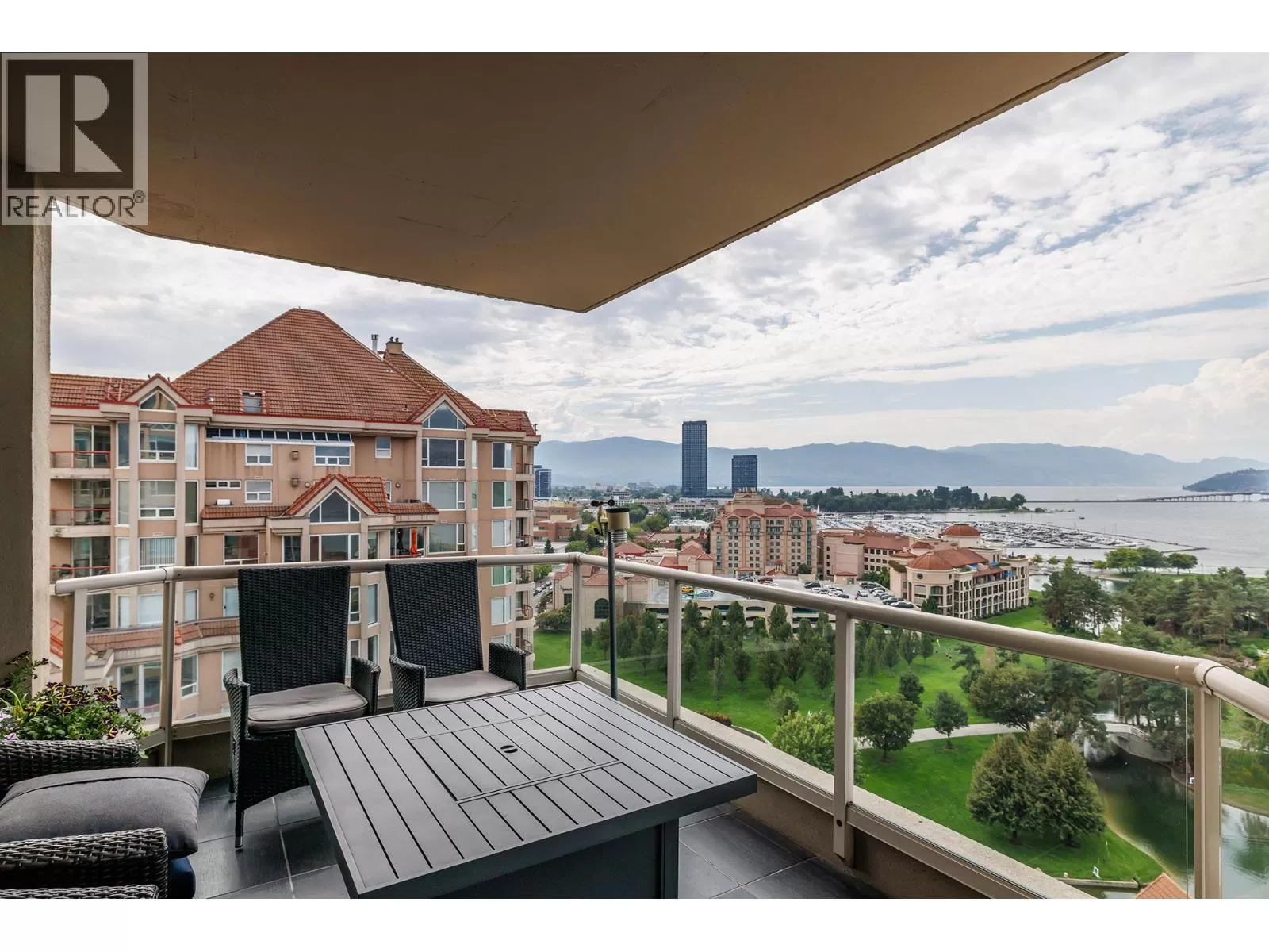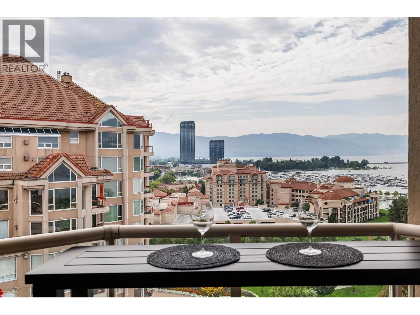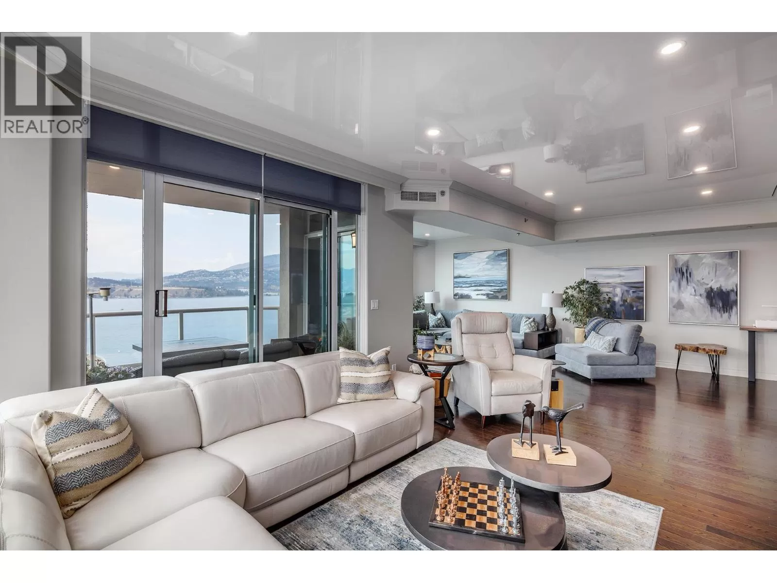 Sub-penthouse at The Lagoons. Waterfront living in downtown Kelowna. Set directly on the lake in the heart of downtown Kelowna, this 2,962 sq. ft. sub-penthouse at The Lagoons offers an unparalleled lifestyle with sweeping views of Okanagan Lake, the bridge, city lights, and surrounding mountains. Rarely available, this single-level residence combines expansive living space with 4 private decks for seamless indoor-outdoor enjoyment. The thoughtfully designed layout features 3 bedrooms, all with ensuites, plus a guest bath + den. The gourmet kitchen is equipped with two islands, granite and quartz counters, custom cabinetry and premium appliances by Miele, KitchenAid, and LG. A formal dining area with wet bar flows into the grand living room, framed by floor-to-ceiling windows and a statement fireplace. Multiple family spaces, including a lakeside sitting room, provide versatility for both entertaining and quiet retreat. The primary suite is a private sanctuary with bay windows, deck access, a generous walk-in closet, and a 5-piece spa-inspired ensuite w/soaker tub and tiled shower. Additional highlights include hardwood flooring, extensive built-ins, integrated media wiring by Beyond Audio and meticulous finishings throughout. Residents of The Lagoons enjoy resort-style amenities: indoor & outdoor pools, hot tub, sauna, gym, clubhouse, secure parking + access to boat moorage. This is the pinnacle of waterfront city livingâluxury, convenience and breathtaking views in one. (id:27476)