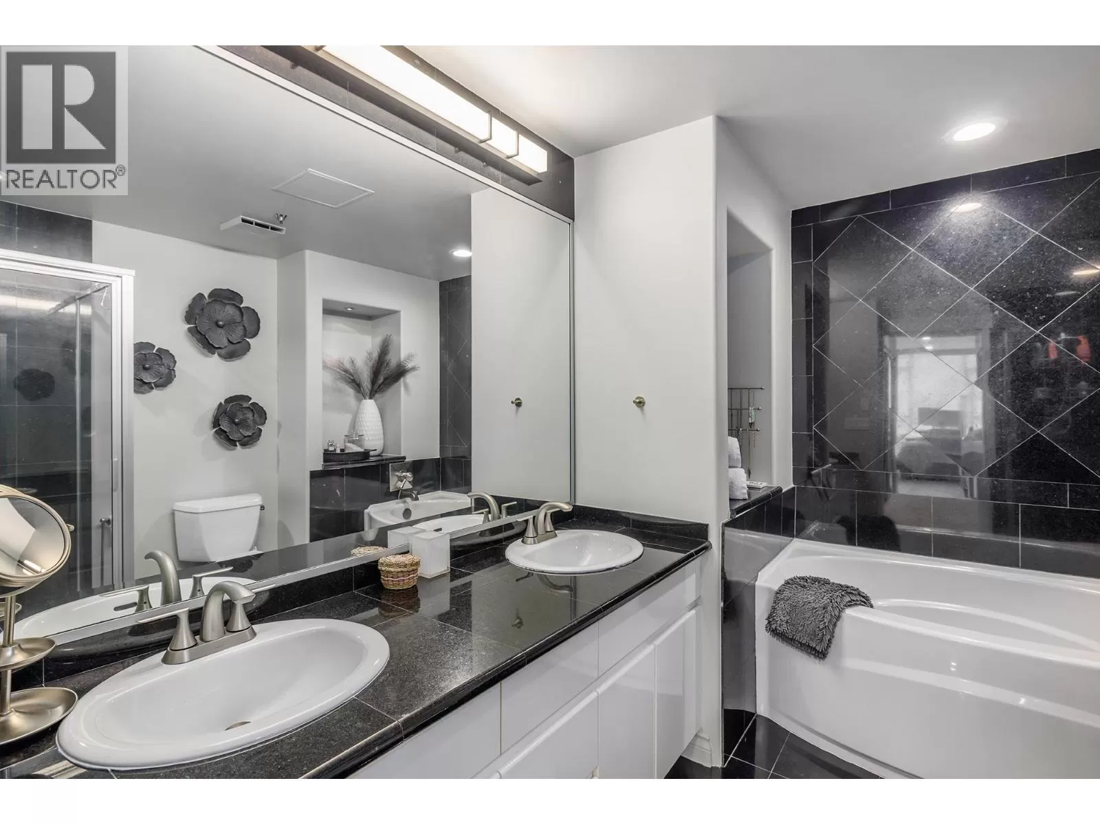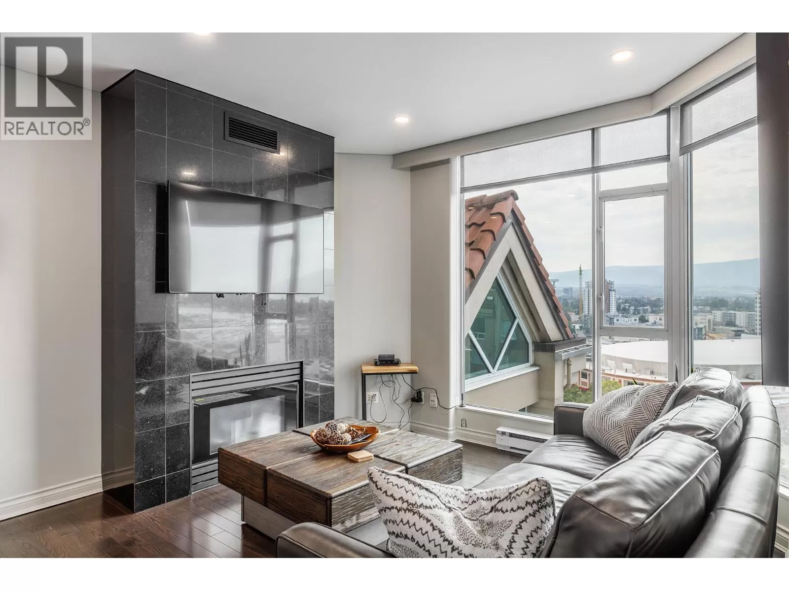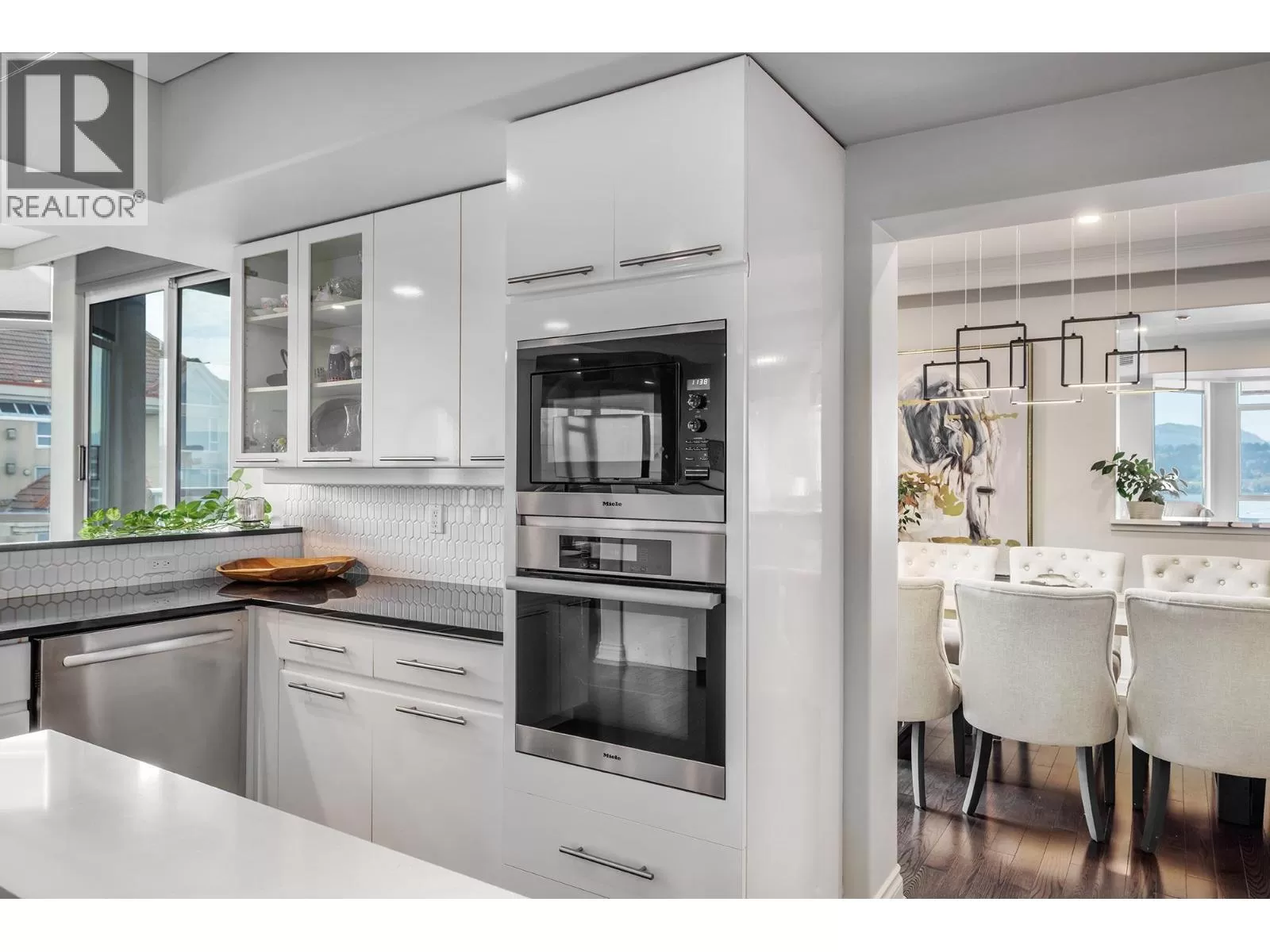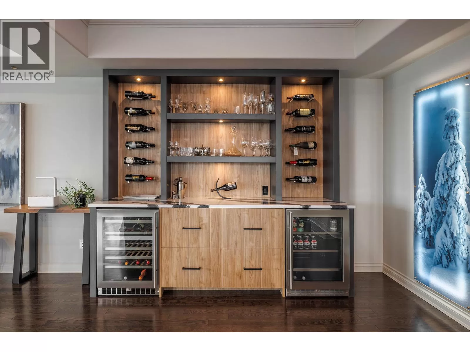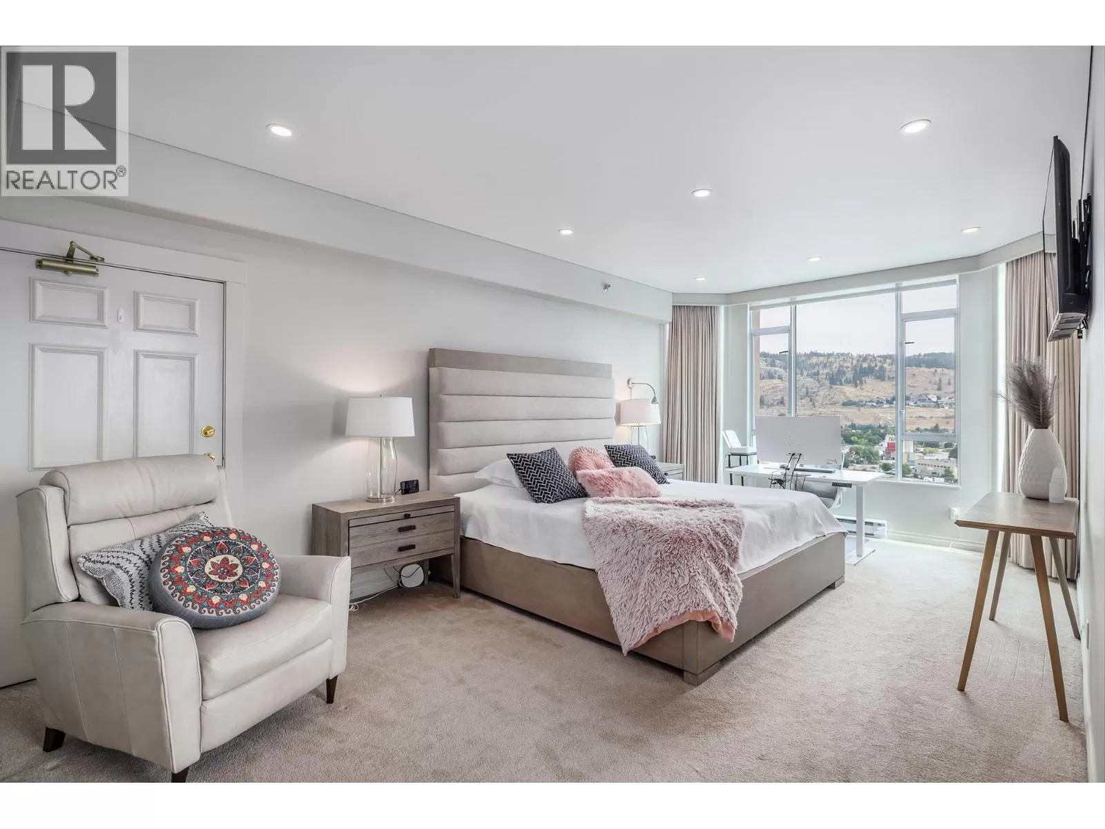 Sub-penthouse at The Lagoons. Waterfront living in downtown Kelowna. Set directly on the lake in the heart of downtown Kelowna, this 2,962 sq. ft. sub-penthouse at The Lagoons offers an unparalleled lifestyle with sweeping views of Okanagan Lake, the bridge, city lights, and surrounding mountains. Rarely available, this single-level residence combines expansive living space with 4 private decks for seamless indoor-outdoor enjoyment. The thoughtfully designed layout features 3 bedrooms, all with ensuites, plus a guest bath + den. The gourmet kitchen is equipped with two islands, granite and quartz counters, custom cabinetry and premium appliances by Miele, KitchenAid, and LG. A formal dining area with wet bar flows into the grand living room, framed by floor-to-ceiling windows and a statement fireplace. Multiple family spaces, including a lakeside sitting room, provide versatility for both entertaining and quiet retreat. The primary suite is a private sanctuary with bay windows, deck access, a generous walk-in closet, and a 5-piece spa-inspired ensuite w/soaker tub and tiled shower. Additional highlights include hardwood flooring, extensive built-ins, integrated media wiring by Beyond Audio and meticulous finishings throughout. Residents of The Lagoons enjoy resort-style amenities: indoor & outdoor pools, hot tub, sauna, gym, clubhouse, secure parking + access to boat moorage. This is the pinnacle of waterfront city livingâluxury, convenience and breathtaking views in one. (id:27476)