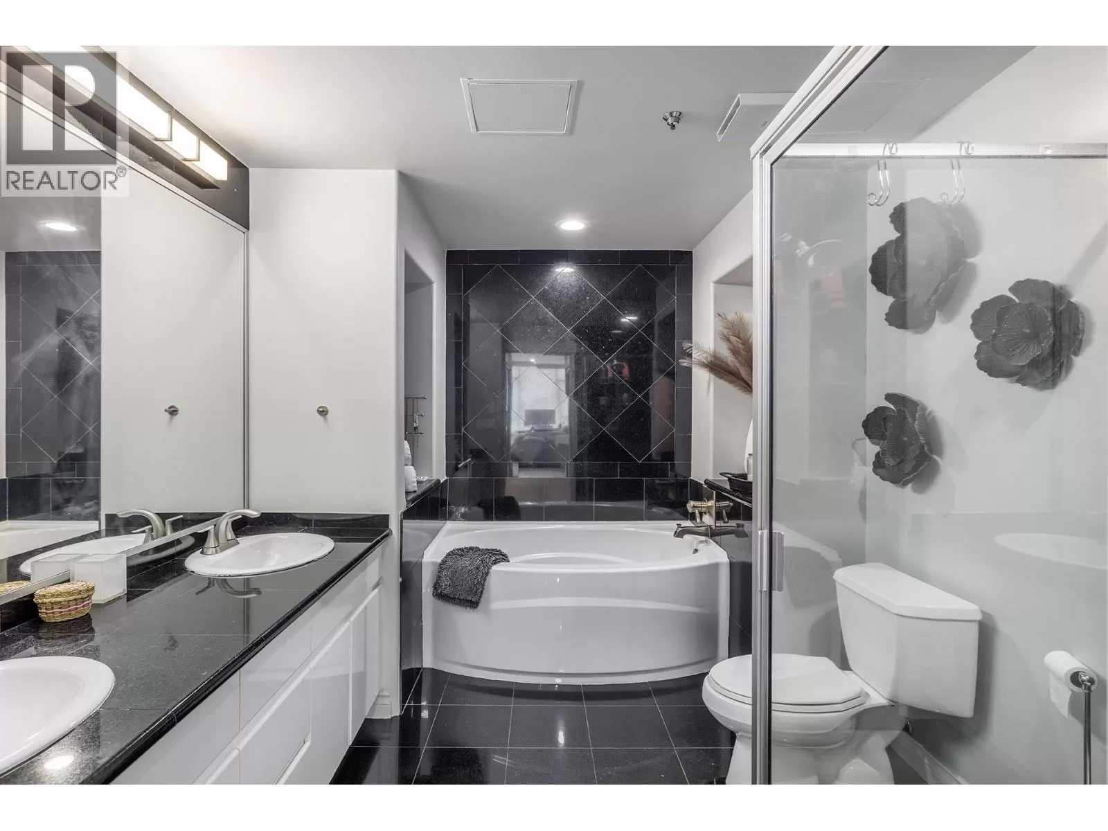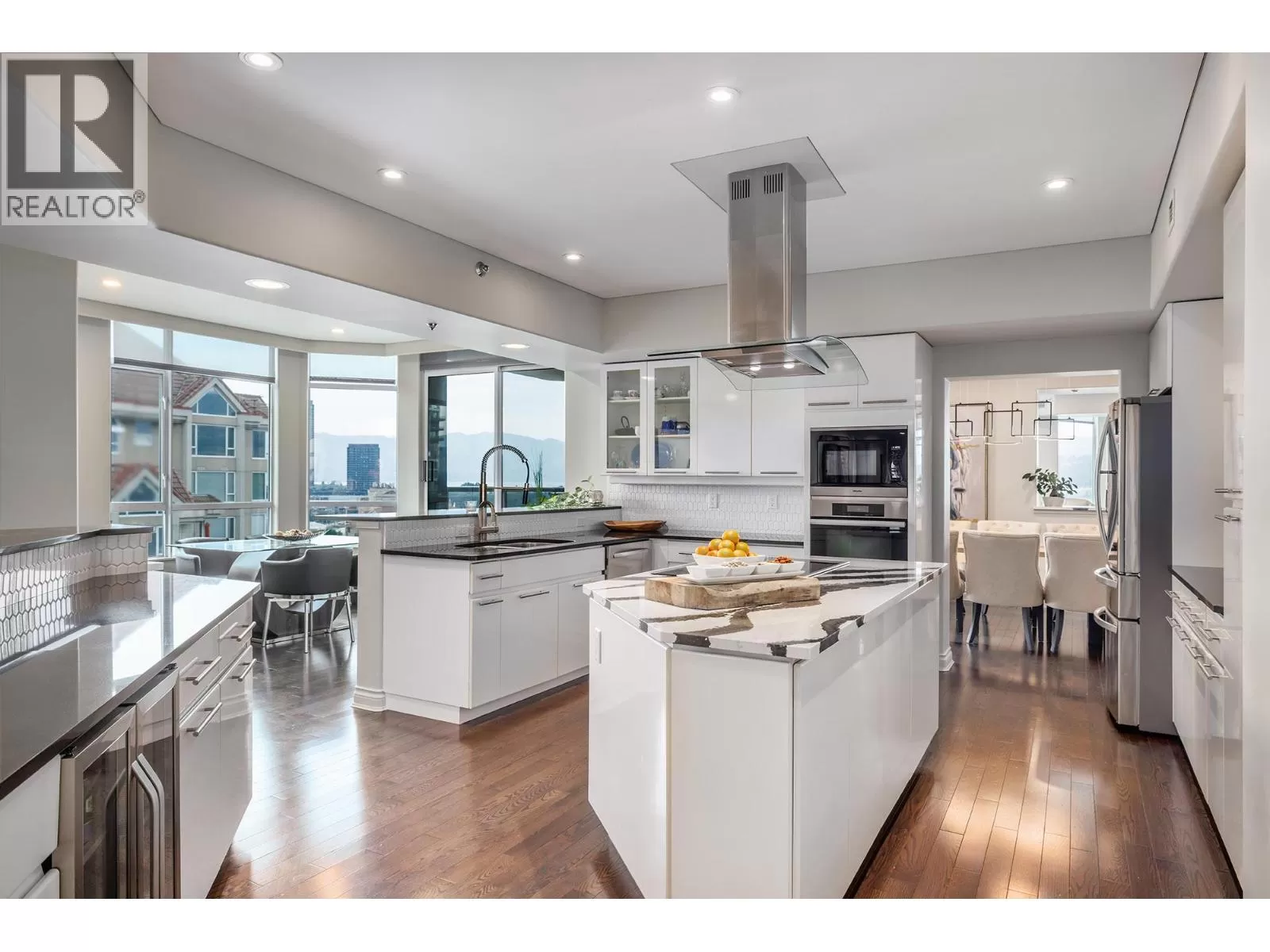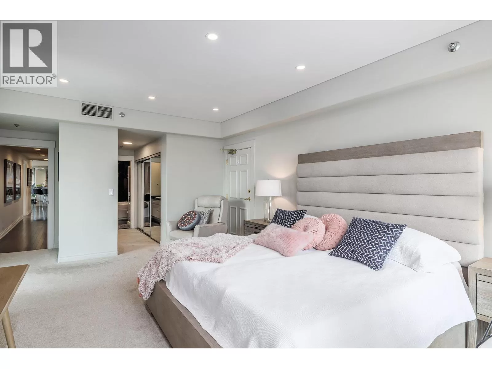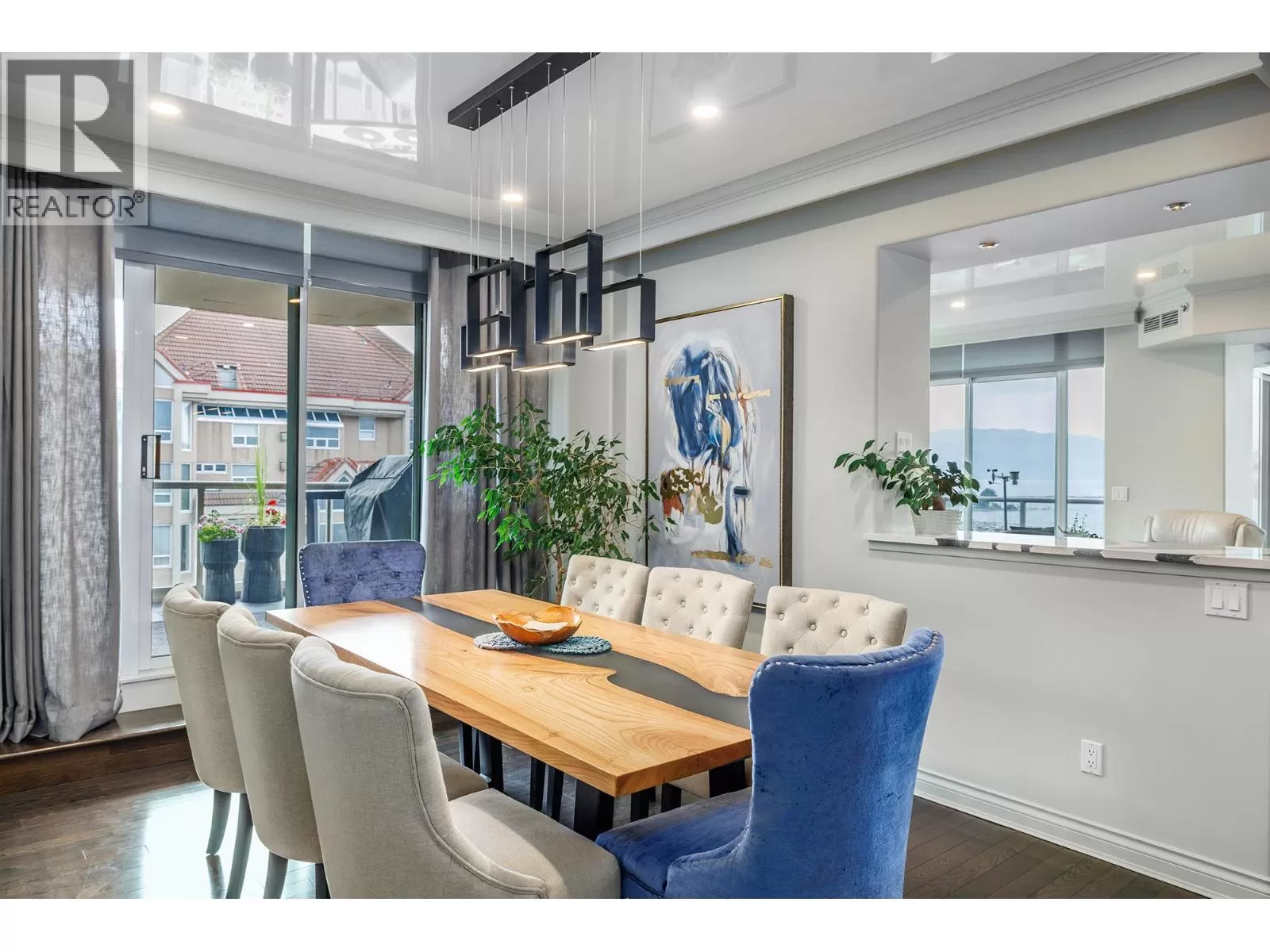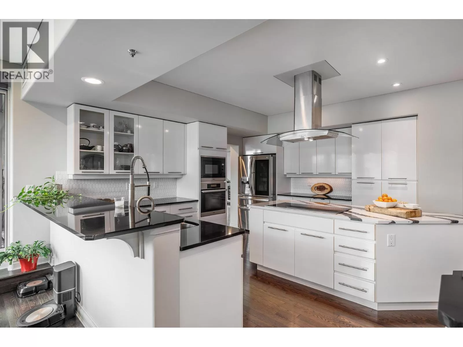 Sub-penthouse at The Lagoons. Waterfront living in downtown Kelowna. Set directly on the lake in the heart of downtown Kelowna, this 2,962 sq. ft. sub-penthouse at The Lagoons offers an unparalleled lifestyle with sweeping views of Okanagan Lake, the bridge, city lights, and surrounding mountains. Rarely available, this single-level residence combines expansive living space with 4 private decks for seamless indoor-outdoor enjoyment. The thoughtfully designed layout features 3 bedrooms, all with ensuites, plus a guest bath + den. The gourmet kitchen is equipped with two islands, granite and quartz counters, custom cabinetry and premium appliances by Miele, KitchenAid, and LG. A formal dining area with wet bar flows into the grand living room, framed by floor-to-ceiling windows and a statement fireplace. Multiple family spaces, including a lakeside sitting room, provide versatility for both entertaining and quiet retreat. The primary suite is a private sanctuary with bay windows, deck access, a generous walk-in closet, and a 5-piece spa-inspired ensuite w/soaker tub and tiled shower. Additional highlights include hardwood flooring, extensive built-ins, integrated media wiring by Beyond Audio and meticulous finishings throughout. Residents of The Lagoons enjoy resort-style amenities: indoor & outdoor pools, hot tub, sauna, gym, clubhouse, secure parking + access to boat moorage. This is the pinnacle of waterfront city livingâluxury, convenience and breathtaking views in one. (id:27476)