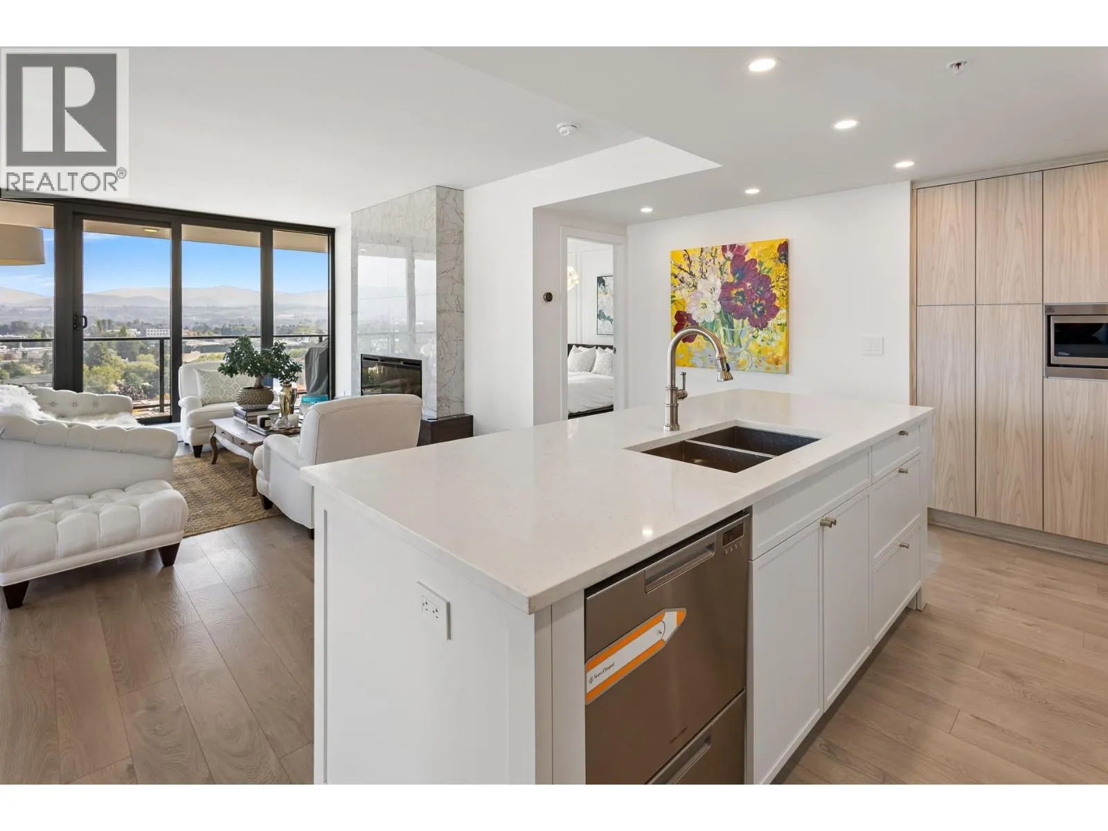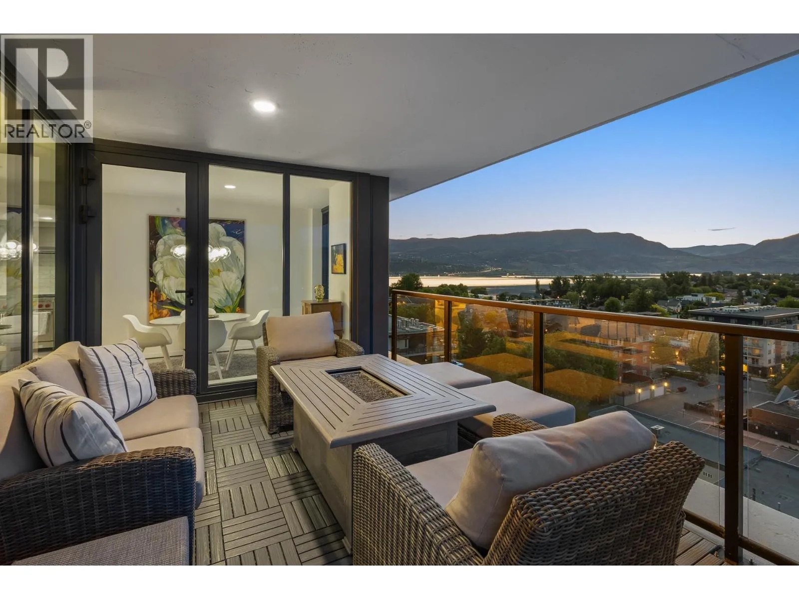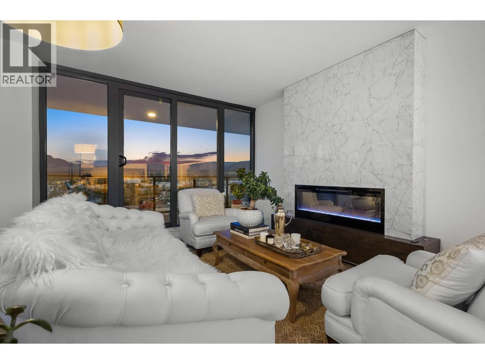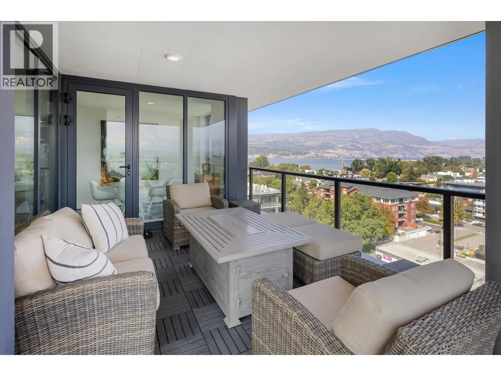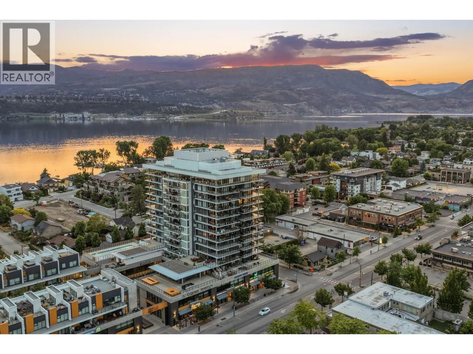 Beautiful luxury condo at Sopa Square in the vibrant South Pandosy community with $150+K in upgrades and just steps to Okanagan Lake. Bright and open 3 bedroom floor plan with a flex space that could be used as an office or a den. With floor to ceiling windows in the main living space, this home is flooded with an abundance of natural light. Enjoy the utmost in outdoor living on the covered wrap-around patio that overlooks the city and offers beautiful views of the lake. Attention to detail is evident at every turn. This home has been well finished throughout and offers stylish updates including designer lighting, feature walls, and custom wainscoting in the primary bedroom. The gourmet kitchen will delight any culinary enthusiast with a stainless-steel appliance package including a Wolf gas range. Entertain with ease at the large centre island. An electric fireplace in the living room creates a cozy ambiance. The primary bedroom boasts a 4-piece en suite and walk through closet. Two additional bedrooms share an adjacent bath. Residents of SOPA will enjoy the resort style amenities including a fitness centre, outdoor pool & hot tub, and sun-soaked terrace. A new waterfront city park is planned to open this summer. Stroll the Abbott St. Corridor or the Pandosy Village amidst boutique shopping, fine restaurants & trendy cafesâtruly a vibrant community within a city. (id:27476)