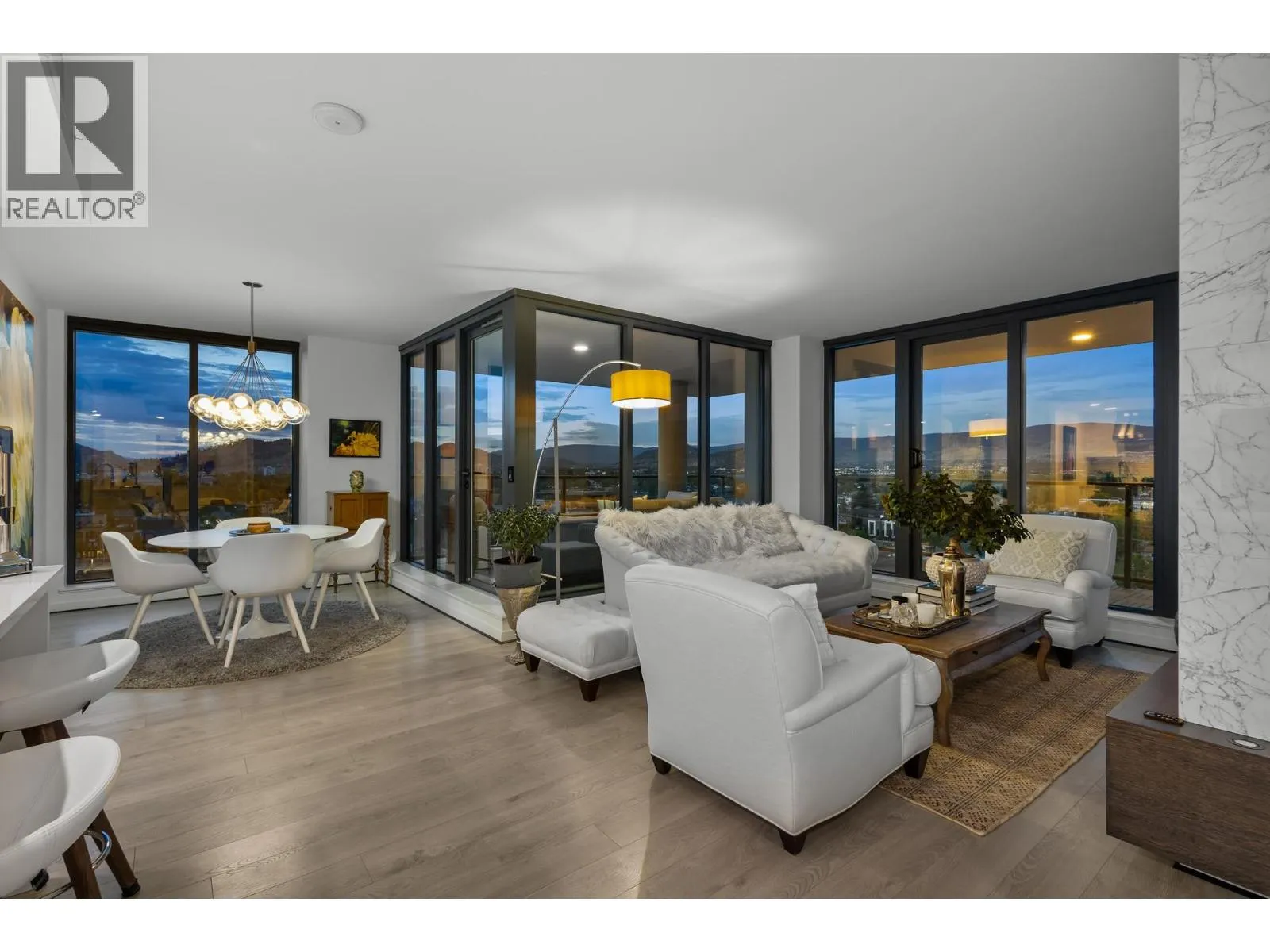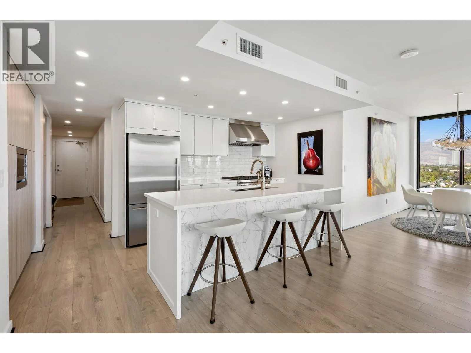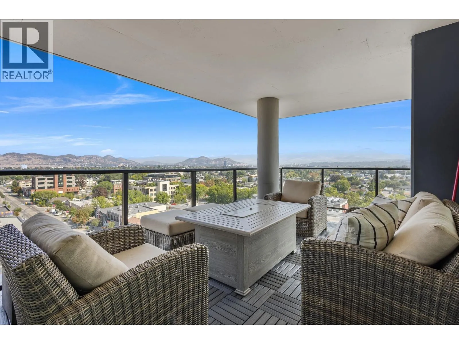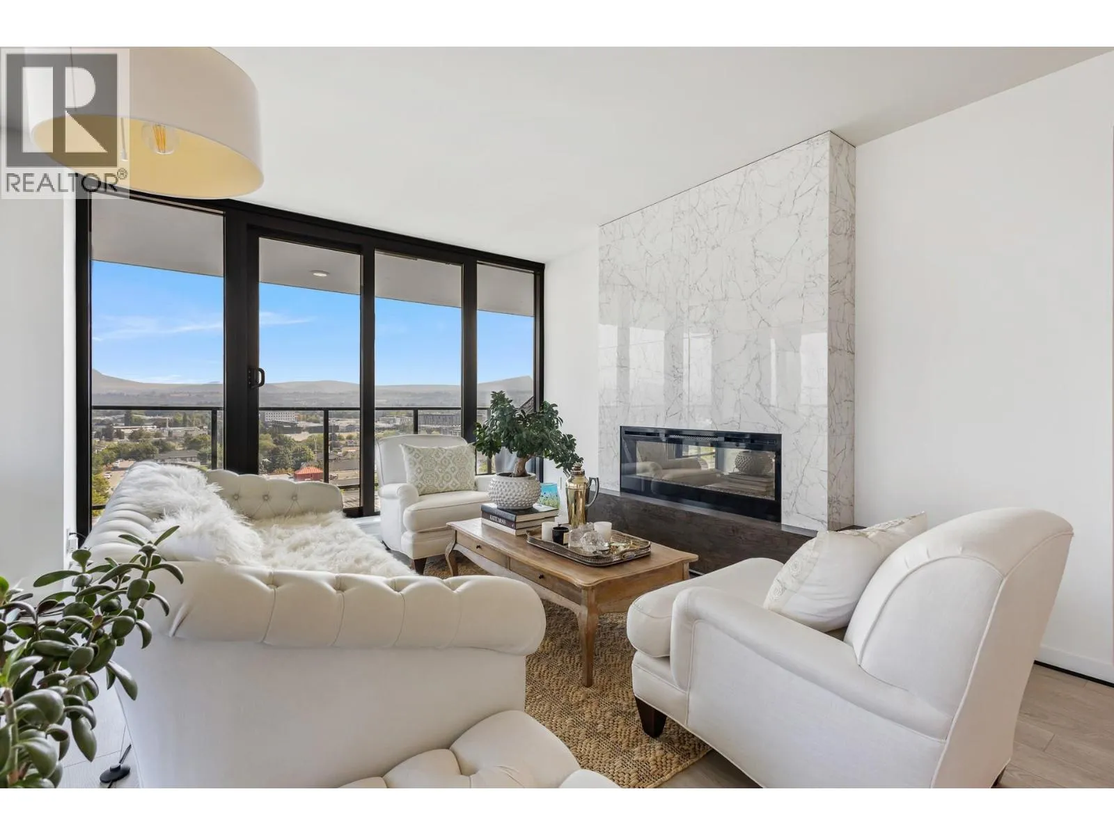 Beautiful luxury condo at Sopa Square in the vibrant South Pandosy community with $150+K in upgrades and just steps to Okanagan Lake. Bright and open 3 bedroom floor plan with a flex space that could be used as an office or a den. With floor to ceiling windows in the main living space, this home is flooded with an abundance of natural light. Enjoy the utmost in outdoor living on the covered wrap-around patio that overlooks the city and offers beautiful views of the lake. Attention to detail is evident at every turn. This home has been well finished throughout and offers stylish updates including designer lighting, feature walls, and custom wainscoting in the primary bedroom. The gourmet kitchen will delight any culinary enthusiast with a stainless-steel appliance package including a Wolf gas range. Entertain with ease at the large centre island. An electric fireplace in the living room creates a cozy ambiance. The primary bedroom boasts a 4-piece en suite and walk through closet. Two additional bedrooms share an adjacent bath. Residents of SOPA will enjoy the resort style amenities including a fitness centre, outdoor pool & hot tub, and sun-soaked terrace. A new waterfront city park is planned to open this summer. Stroll the Abbott St. Corridor or the Pandosy Village amidst boutique shopping, fine restaurants & trendy cafesâtruly a vibrant community within a city. (id:27476)