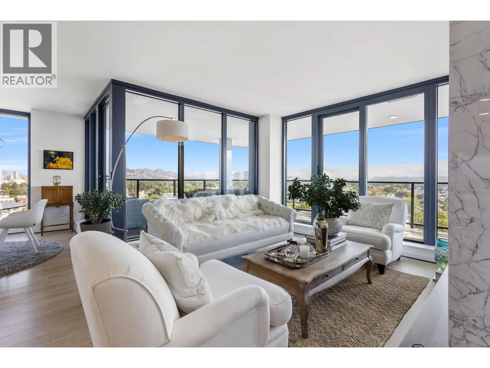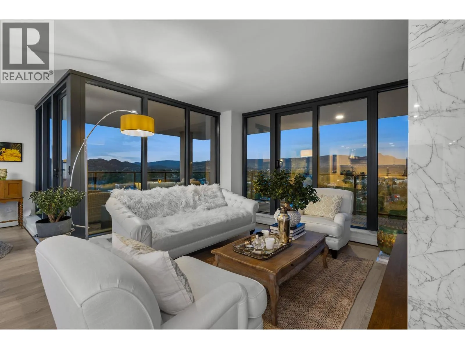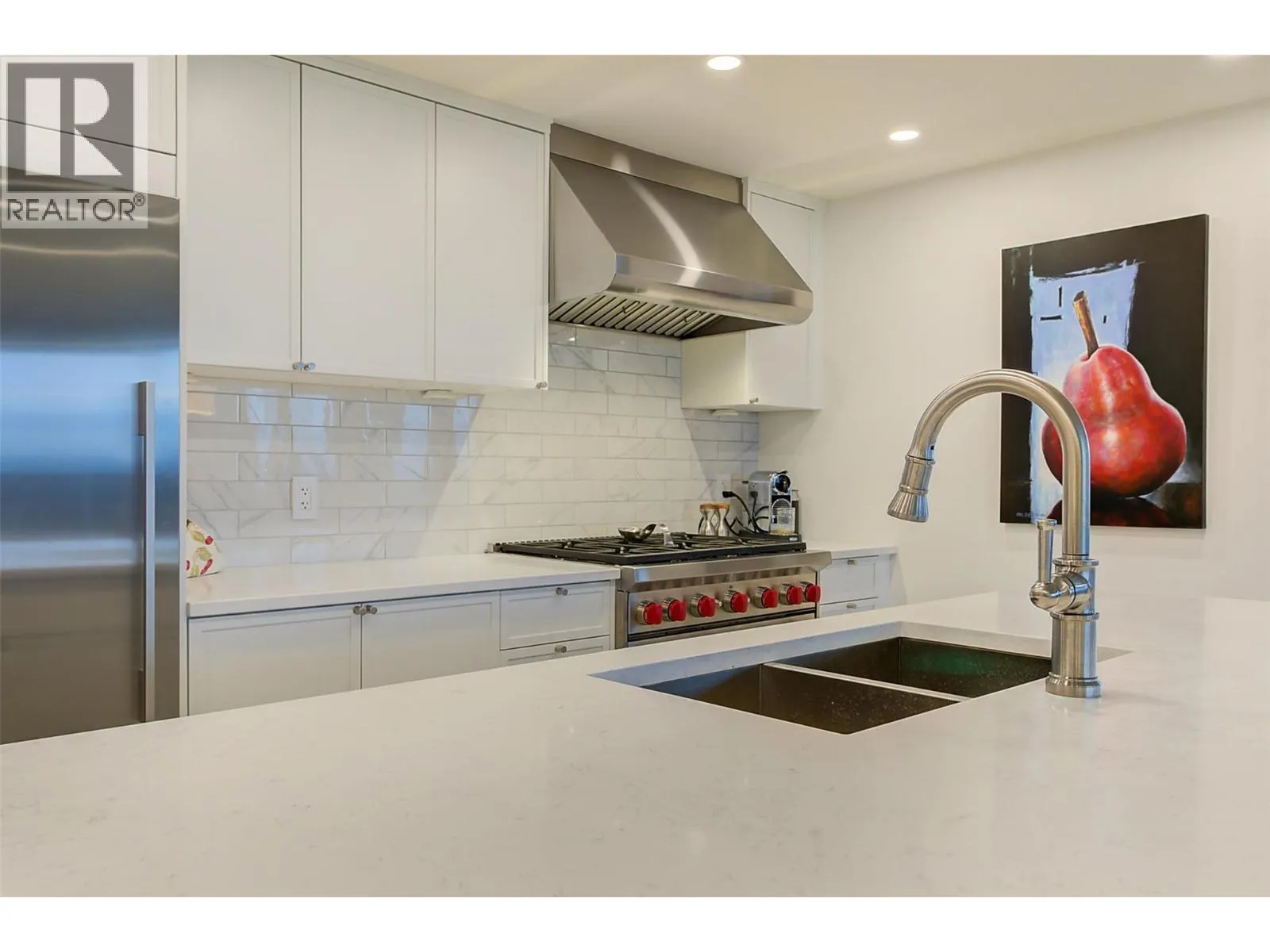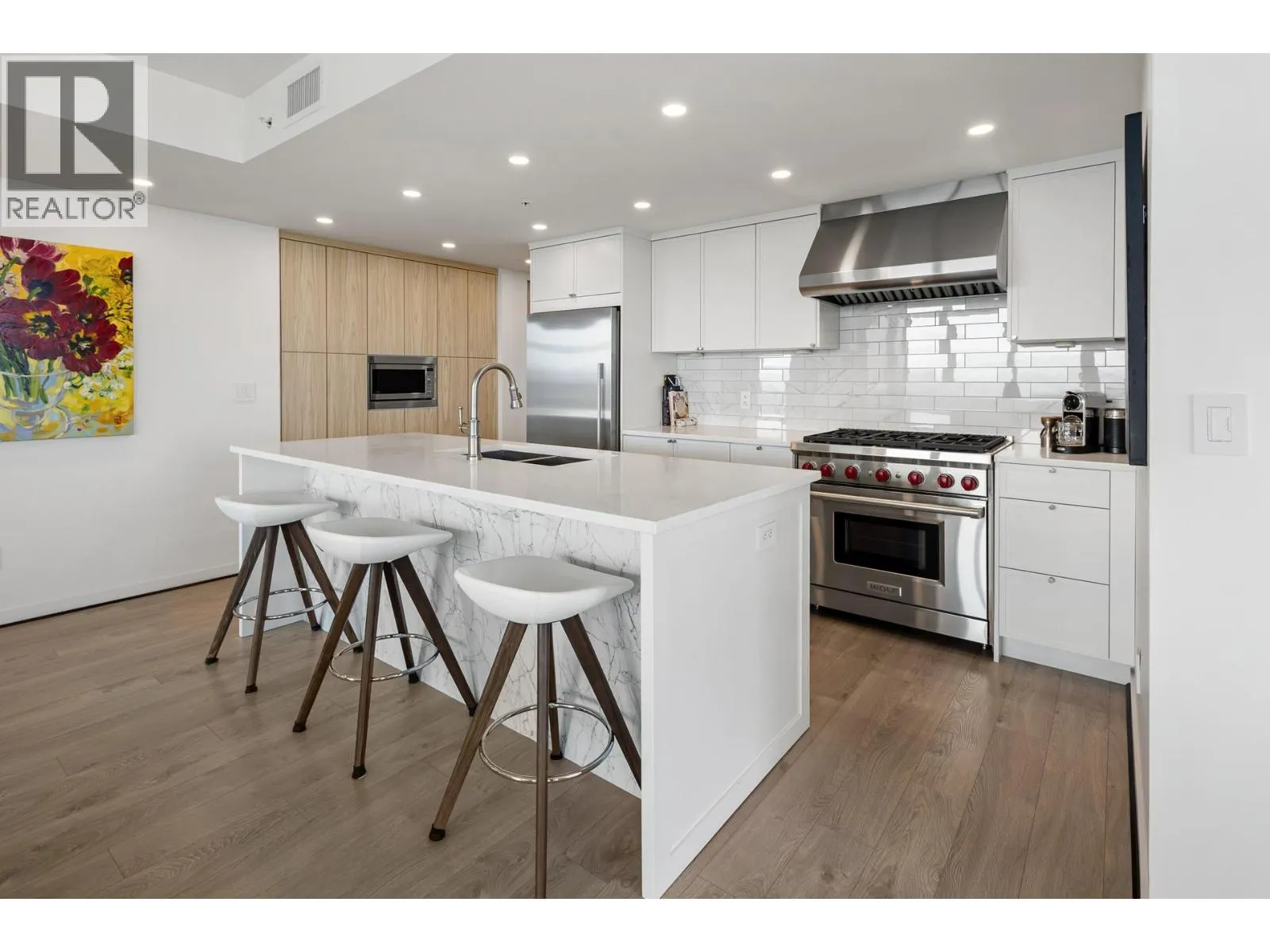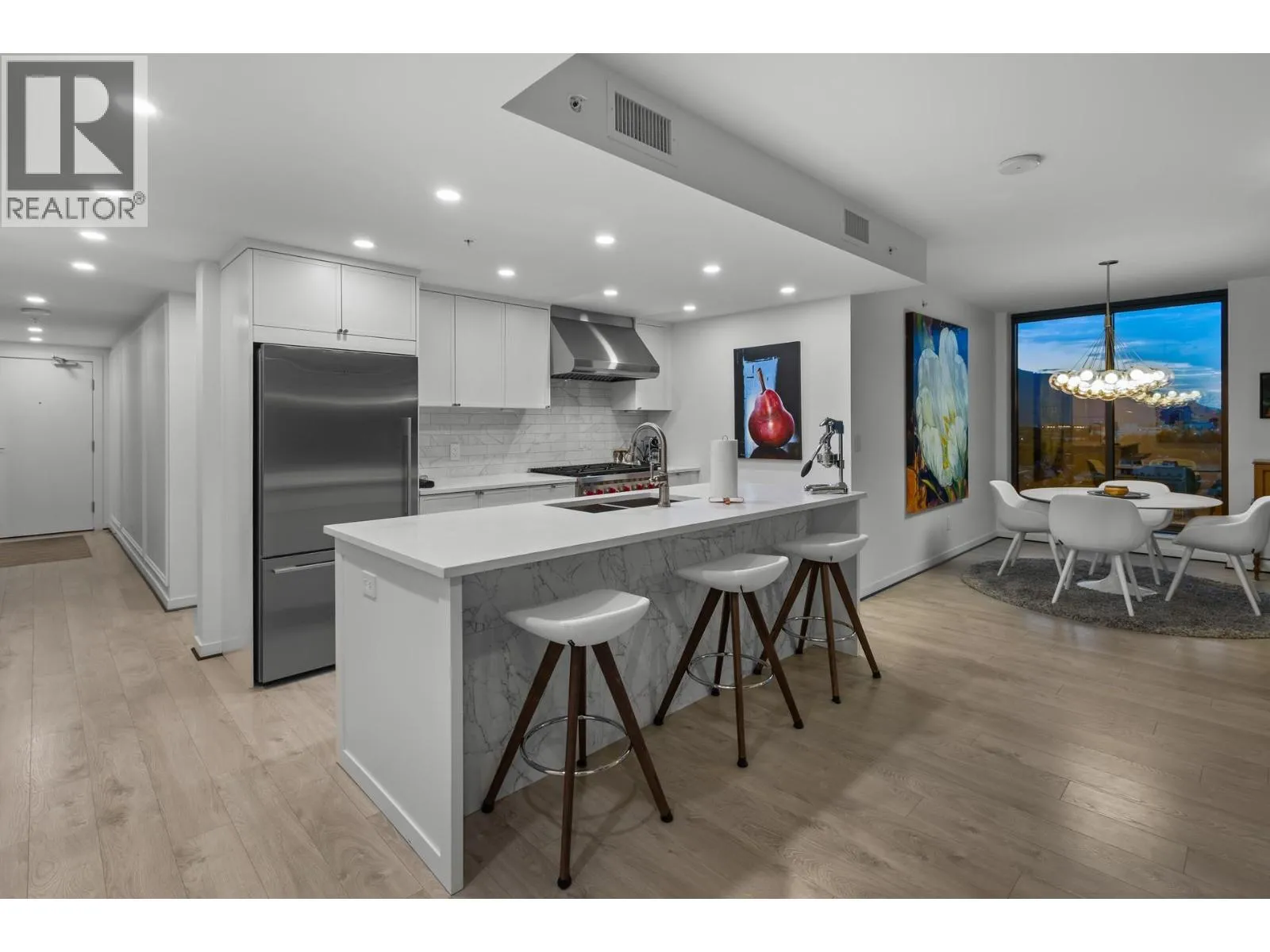 Beautiful luxury condo at Sopa Square in the vibrant South Pandosy community with $150+K in upgrades and just steps to Okanagan Lake. Bright and open 3 bedroom floor plan with a flex space that could be used as an office or a den. With floor to ceiling windows in the main living space, this home is flooded with an abundance of natural light. Enjoy the utmost in outdoor living on the covered wrap-around patio that overlooks the city and offers beautiful views of the lake. Attention to detail is evident at every turn. This home has been well finished throughout and offers stylish updates including designer lighting, feature walls, and custom wainscoting in the primary bedroom. The gourmet kitchen will delight any culinary enthusiast with a stainless-steel appliance package including a Wolf gas range. Entertain with ease at the large centre island. An electric fireplace in the living room creates a cozy ambiance. The primary bedroom boasts a 4-piece en suite and walk through closet. Two additional bedrooms share an adjacent bath. Residents of SOPA will enjoy the resort style amenities including a fitness centre, outdoor pool & hot tub, and sun-soaked terrace. A new waterfront city park is planned to open this summer. Stroll the Abbott St. Corridor or the Pandosy Village amidst boutique shopping, fine restaurants & trendy cafesâtruly a vibrant community within a city. (id:27476)