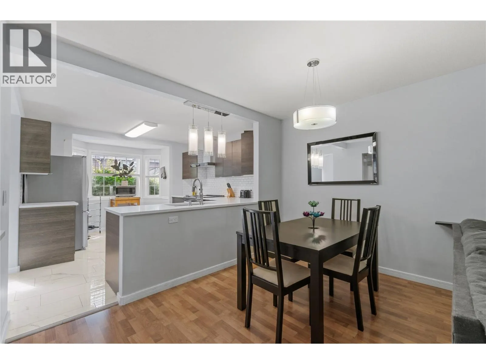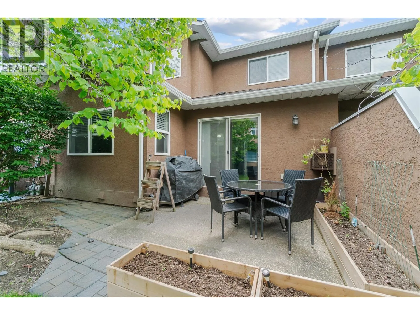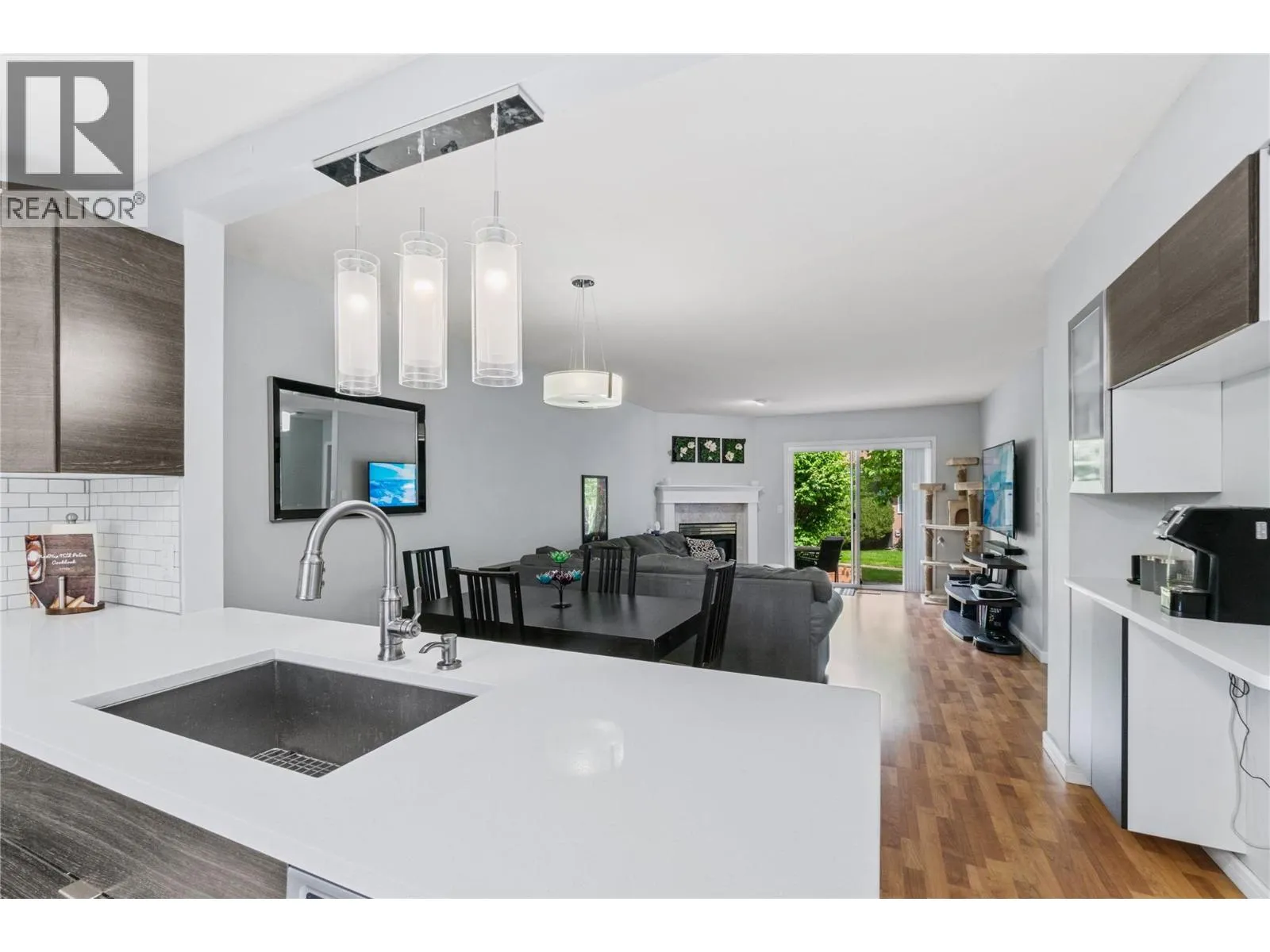 Bright and beautifully updated, this 3-bedroom, 2.5-bath home offers a modern design and a functional layout. The soaring foyer with a stunning staircase sets the tone for the open main level, featuring a sunlit kitchen with a large bay window, abundant cabinetry, sleek white countertops, and stainless steel appliances. Perfect for entertaining, the kitchen flows into the dining and living areas, complete with a cozy fireplace and sliding doors to a private patio surrounded by mature landscaping and built-in planters. The main-floor primary suite includes a walk-through closet and 3-piece ensuite, plus a powder room and laundry for convenience. Upstairs, a bright loft-style office overlooks the greenery, along with two bedrooms and a full bath. Enjoy an attached single garage and driveway parkingâall in a desirable Glenmore location, just minutes from UBCO, the airport, and walking distance to shops and cafe's. (id:27476)