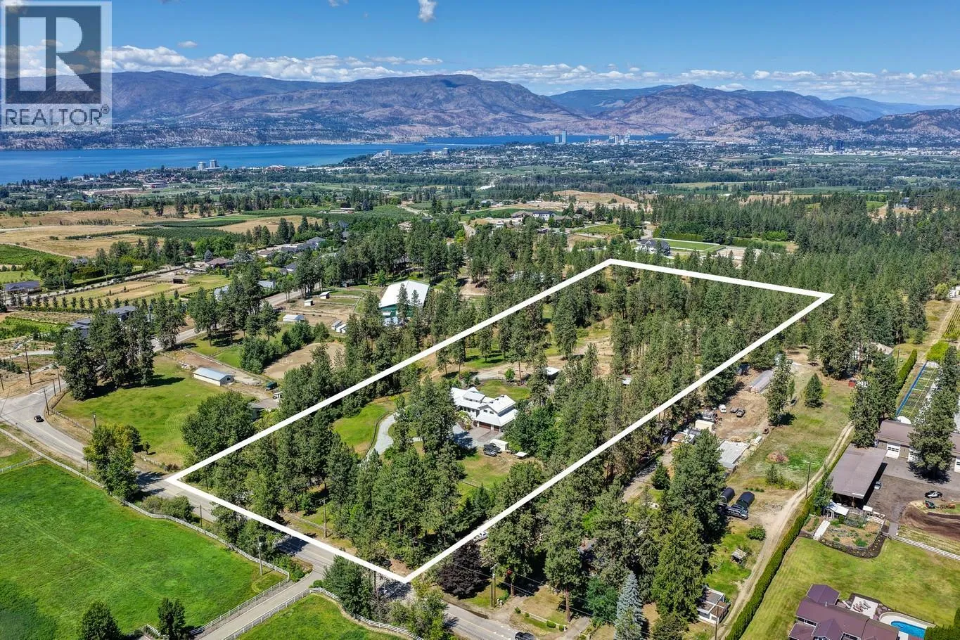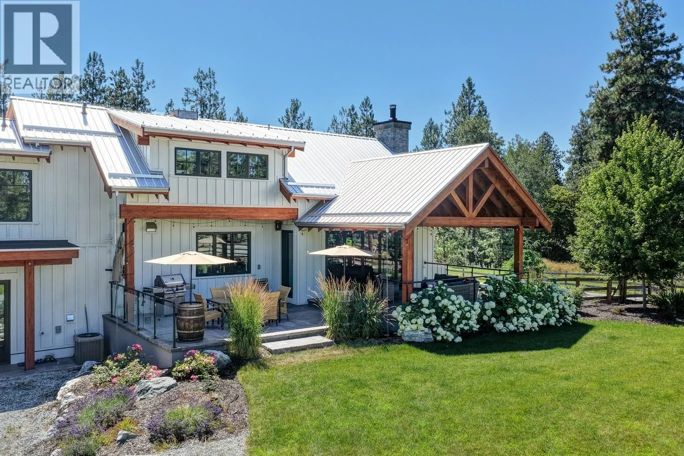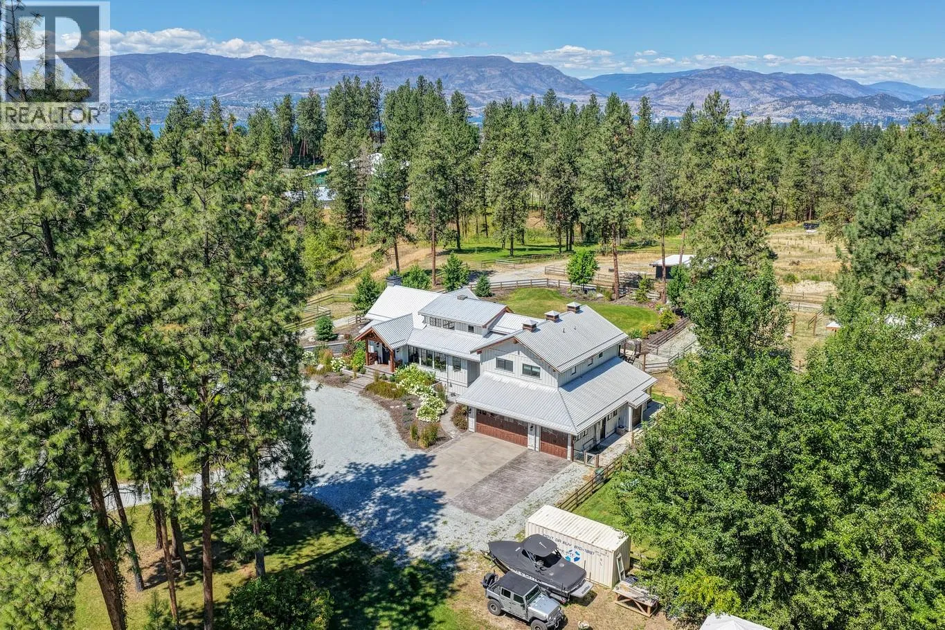 Gorgeous, modern farmhouse-style custom home set on nearly 8 acres in Southeast Kelowna. This equestrian haven is perfect for those seeking tranquility and privacy, just minutes from the amenities of the City of Kelowna. The property is fully fenced for horses, includes a tack room, a 60x180 ft riding pen, and a goat pen. Inside, discover a luxurious and spacious home designed for everyday living and entertaining, with wood accents throughout. The main level features open-concept living, including a wood-burning fireplace surrounded by custom rockwork extending to the ceiling. The gourmet kitchen is perfect for entertaining, with a large center island and a professional appliance package to delight any chef. Folding doors off the living room open to a stunning covered patio with a vaulted ceiling and custom chandelier. The patio overlooks the property, offering a peaceful space to unwind. The upper level boasts a large primary bedroom with a luxurious 5-piece ensuite, a walk-in closet, and direct access to a private patio. Two additional generously sized bedrooms and a 4-piece bathroom complete this level. The lower level offers another two bedrooms and a bathroom. For those who enjoy entertaining, the home features a home theater, a billiards room, a temperature-controlled wine cellar, and a recreation room with an adjoining kitchen. Additional highlights include an Arctic hot tub, a 3-cargarage, and a workshop with an additional 1-car garage. (id:27476)
