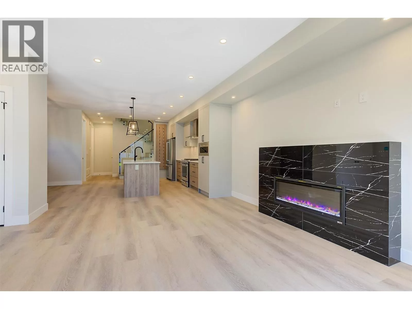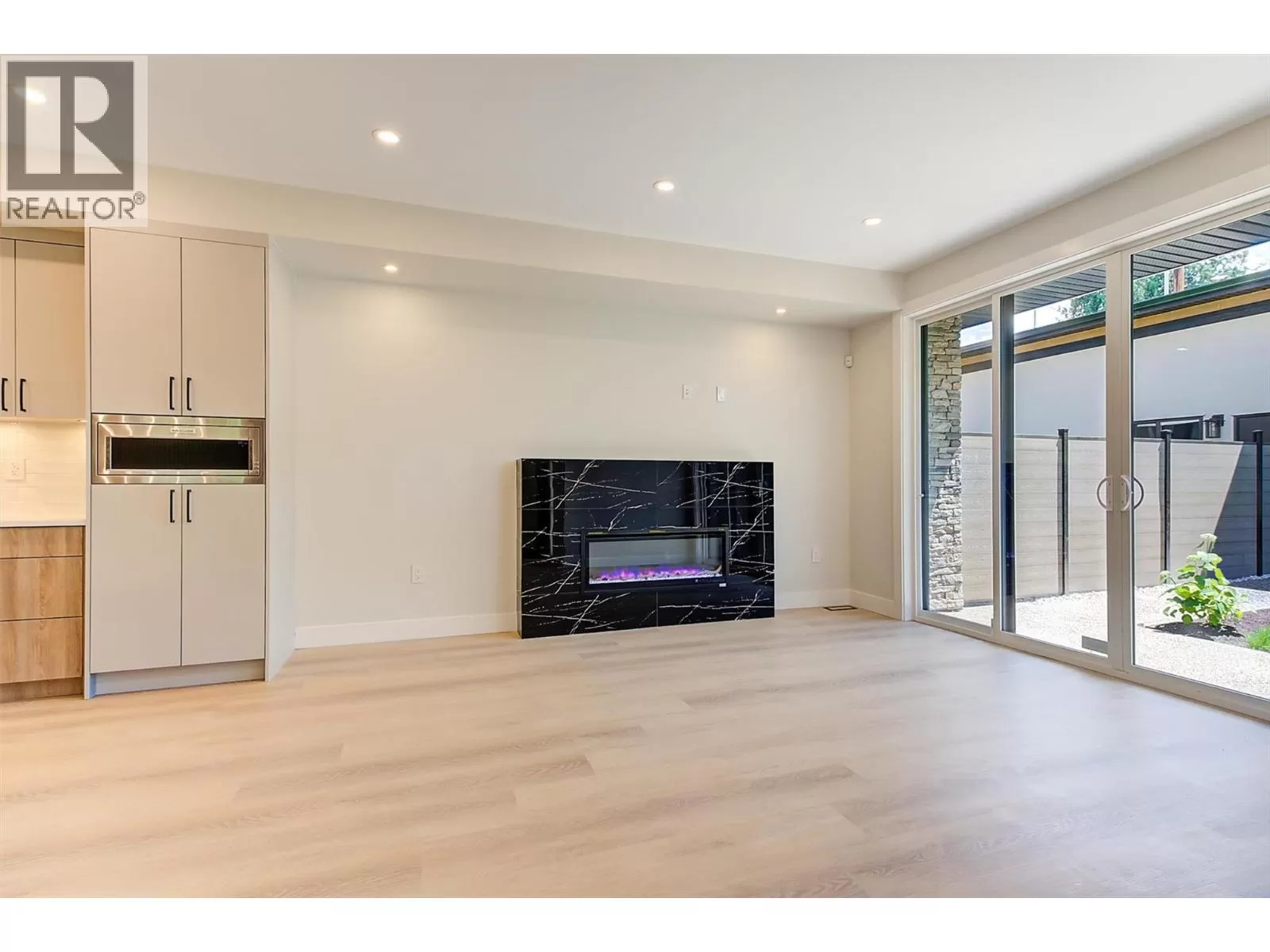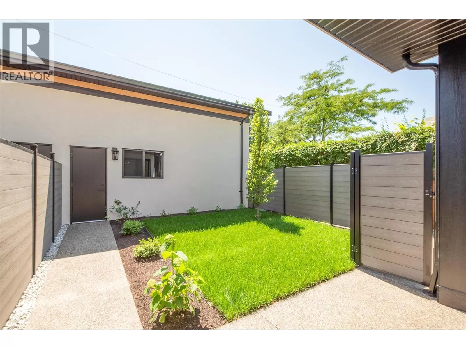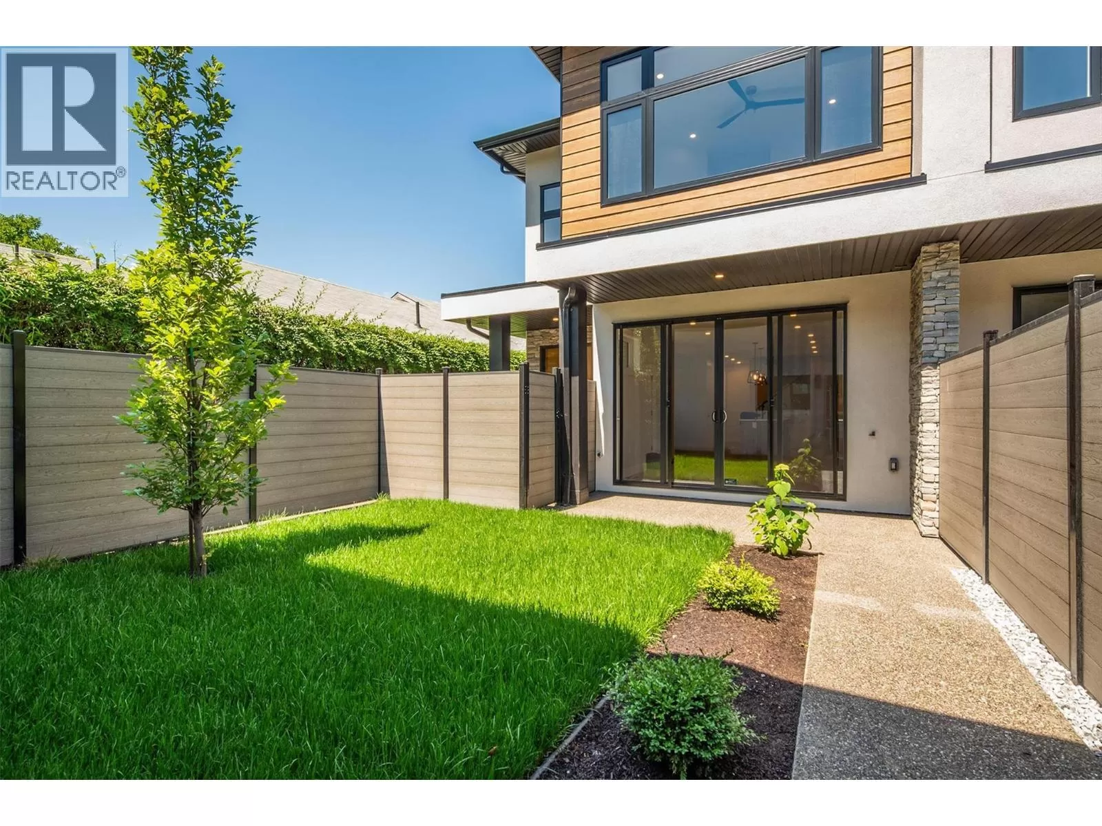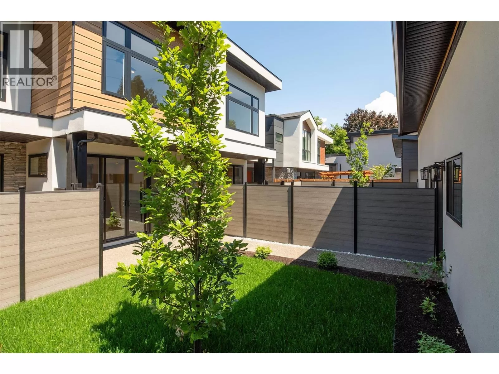 **Discover Luxury Downtown Living** Step into this custom-built, North-facing townhome, offering 3 bedrooms, 2.5 bathrooms, and two stories of exquisite design. Topped with a rooftop patio prepped for a hot tub, this home invites you to embrace the Okanaganâs signature outdoor lifestyle. Every detail has been carefully curated to exude sophistication. Expansive windows fill the space with natural light, complementing the modern exterior of concrete and wood finishes. Inside, the chef-inspired kitchen stands out with a large island, stainless steel appliances, quartz countertops, and a custom backsplash framing the gas stove and 28-inch hood range fan. Throughout the home, premium flooring, a built-in fireplace, and contemporary light fixtures enhance the luxurious ambiance. The primary suite features a spa-like ensuite with a double vanity and a sleek walk-in shower. A large crawl space on the main floor offers ample storage, while the private yard with a covered patio creates your personal oasis. Completing the home is a covered single-car garage with rough-in for an EV charging station, blending convenience with modern living. This townhome isnât just a residenceâitâs a statement of style, comfort, and urban sophistication. Make it yours and elevate your lifestyle today. (id:27476)