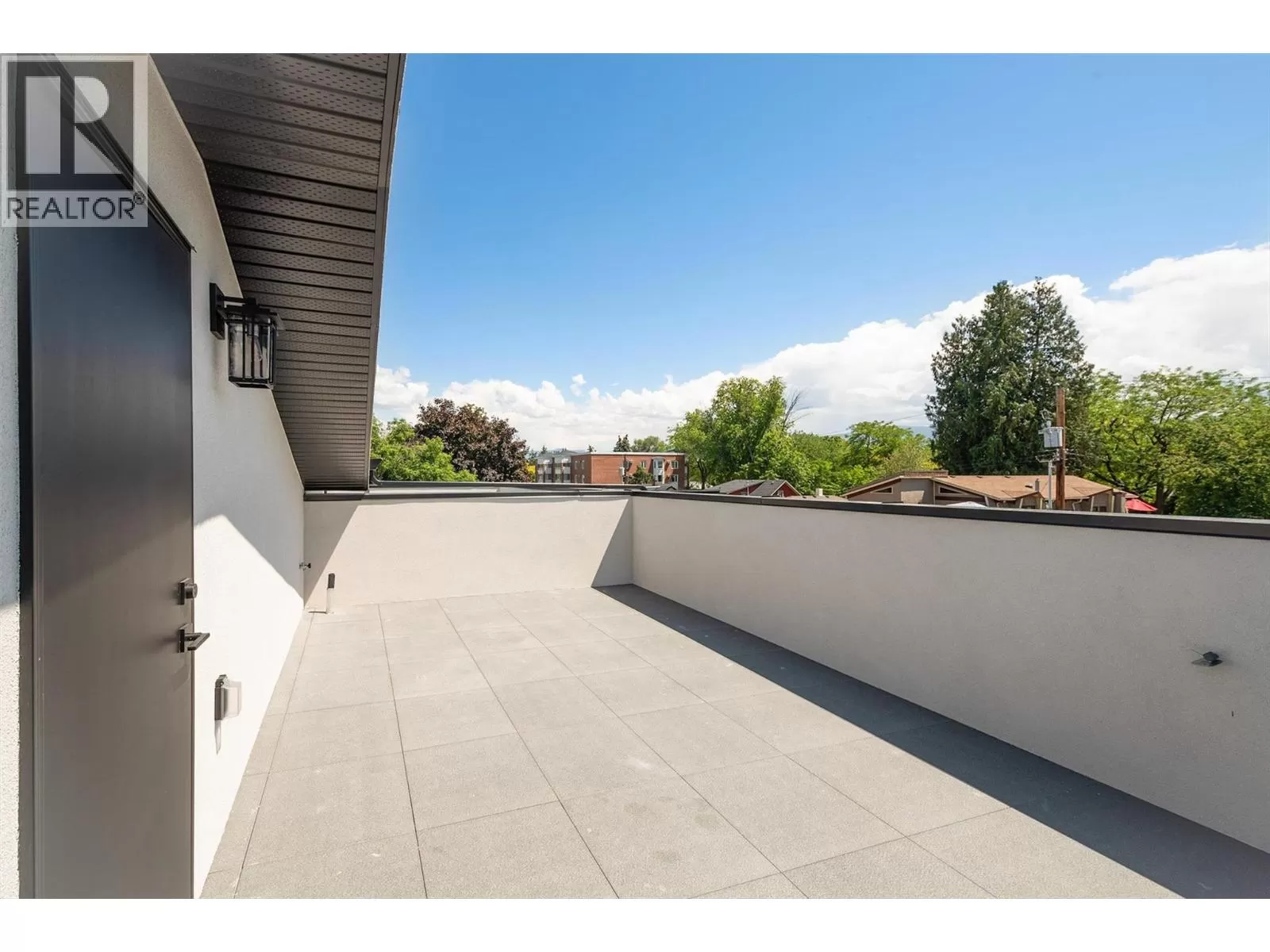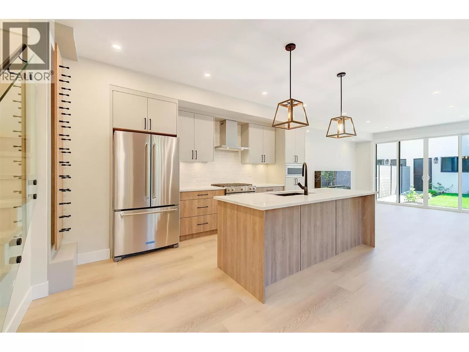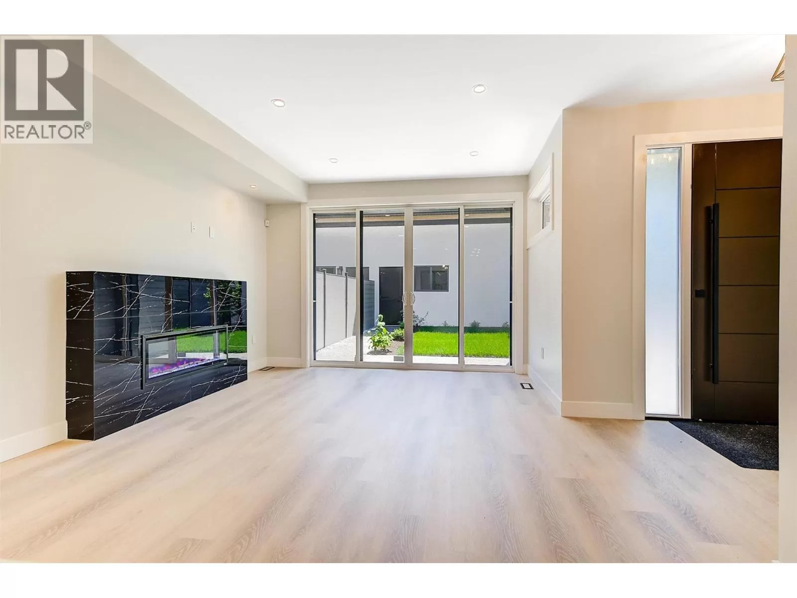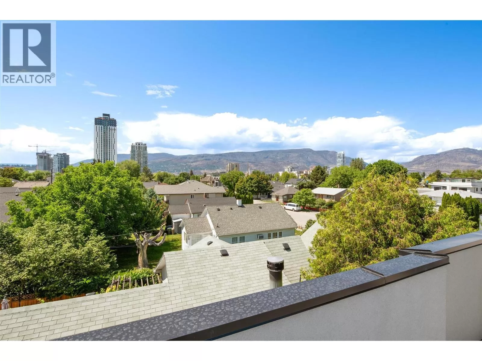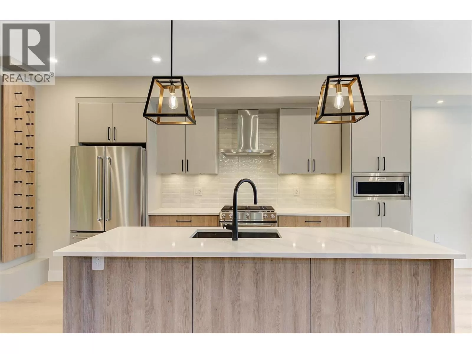 **Discover Luxury Downtown Living** Step into this custom-built, North-facing townhome, offering 3 bedrooms, 2.5 bathrooms, and two stories of exquisite design. Topped with a rooftop patio prepped for a hot tub, this home invites you to embrace the Okanaganâs signature outdoor lifestyle. Every detail has been carefully curated to exude sophistication. Expansive windows fill the space with natural light, complementing the modern exterior of concrete and wood finishes. Inside, the chef-inspired kitchen stands out with a large island, stainless steel appliances, quartz countertops, and a custom backsplash framing the gas stove and 28-inch hood range fan. Throughout the home, premium flooring, a built-in fireplace, and contemporary light fixtures enhance the luxurious ambiance. The primary suite features a spa-like ensuite with a double vanity and a sleek walk-in shower. A large crawl space on the main floor offers ample storage, while the private yard with a covered patio creates your personal oasis. Completing the home is a covered single-car garage with rough-in for an EV charging station, blending convenience with modern living. This townhome isnât just a residenceâitâs a statement of style, comfort, and urban sophistication. Make it yours and elevate your lifestyle today. (id:27476)