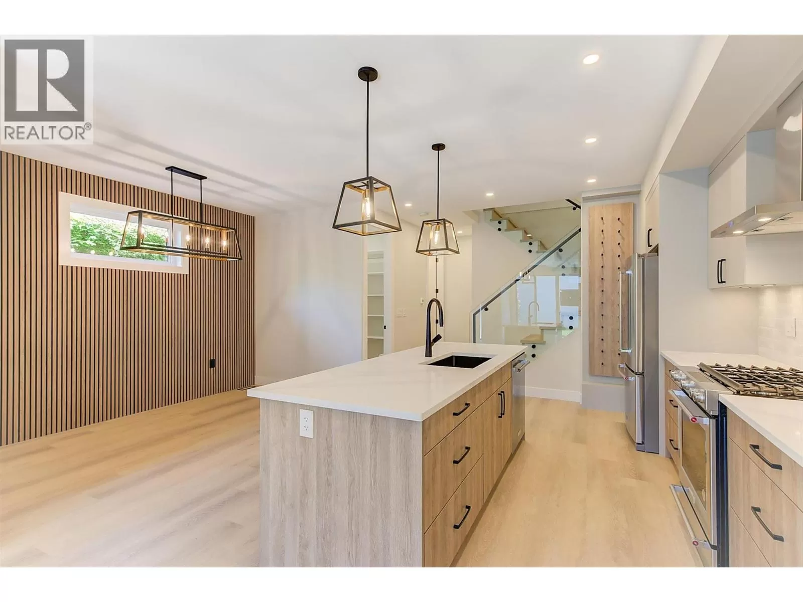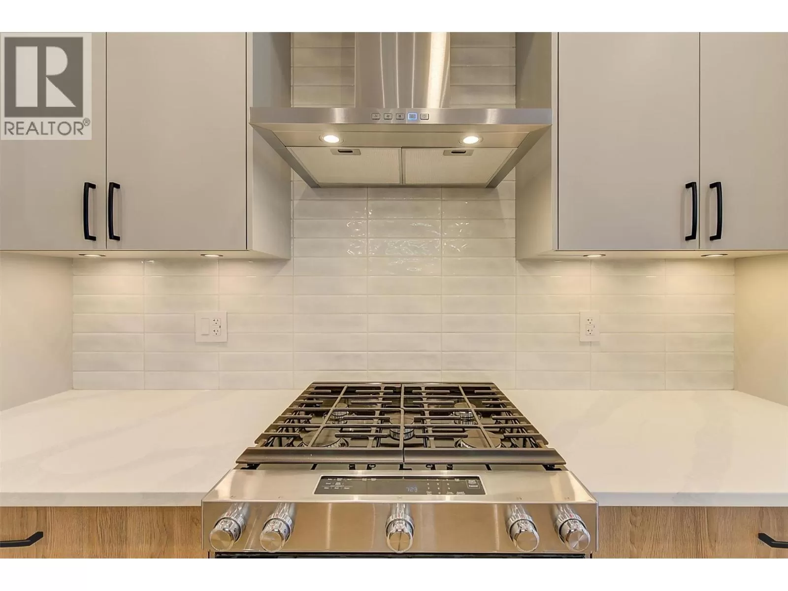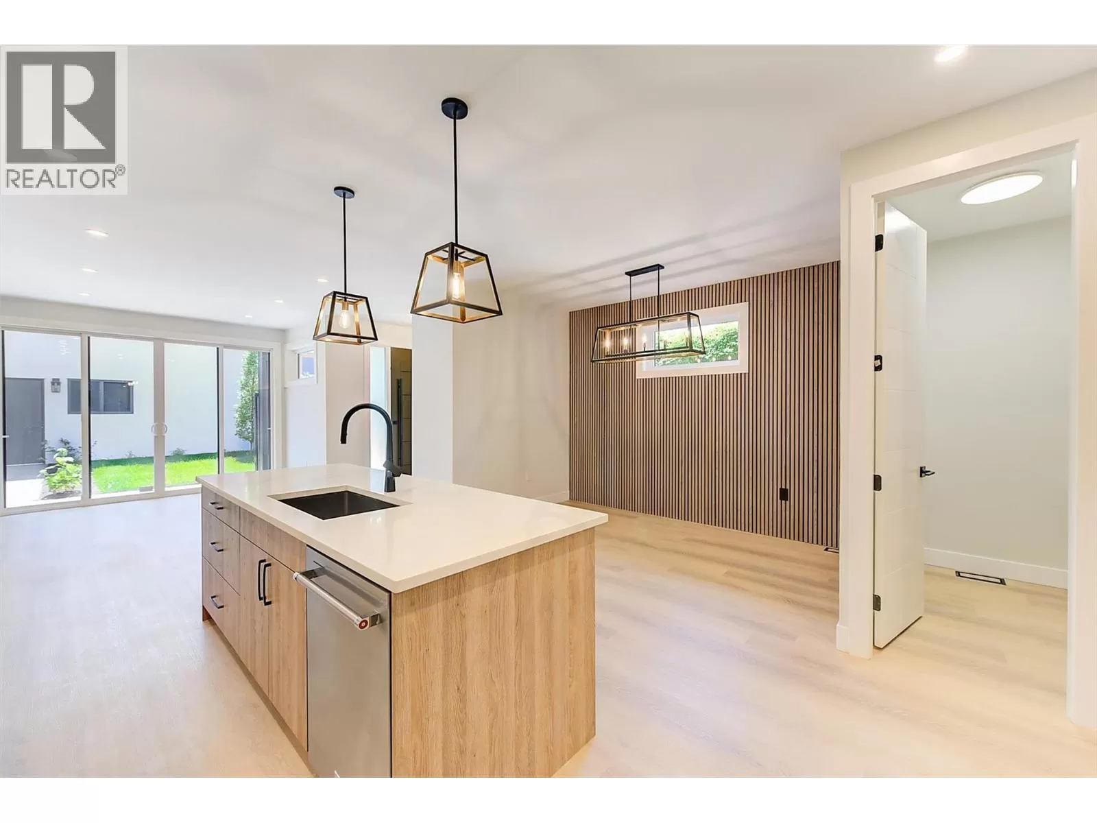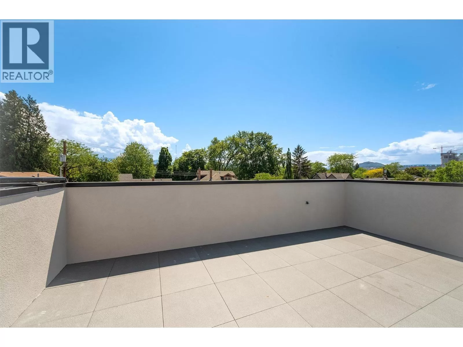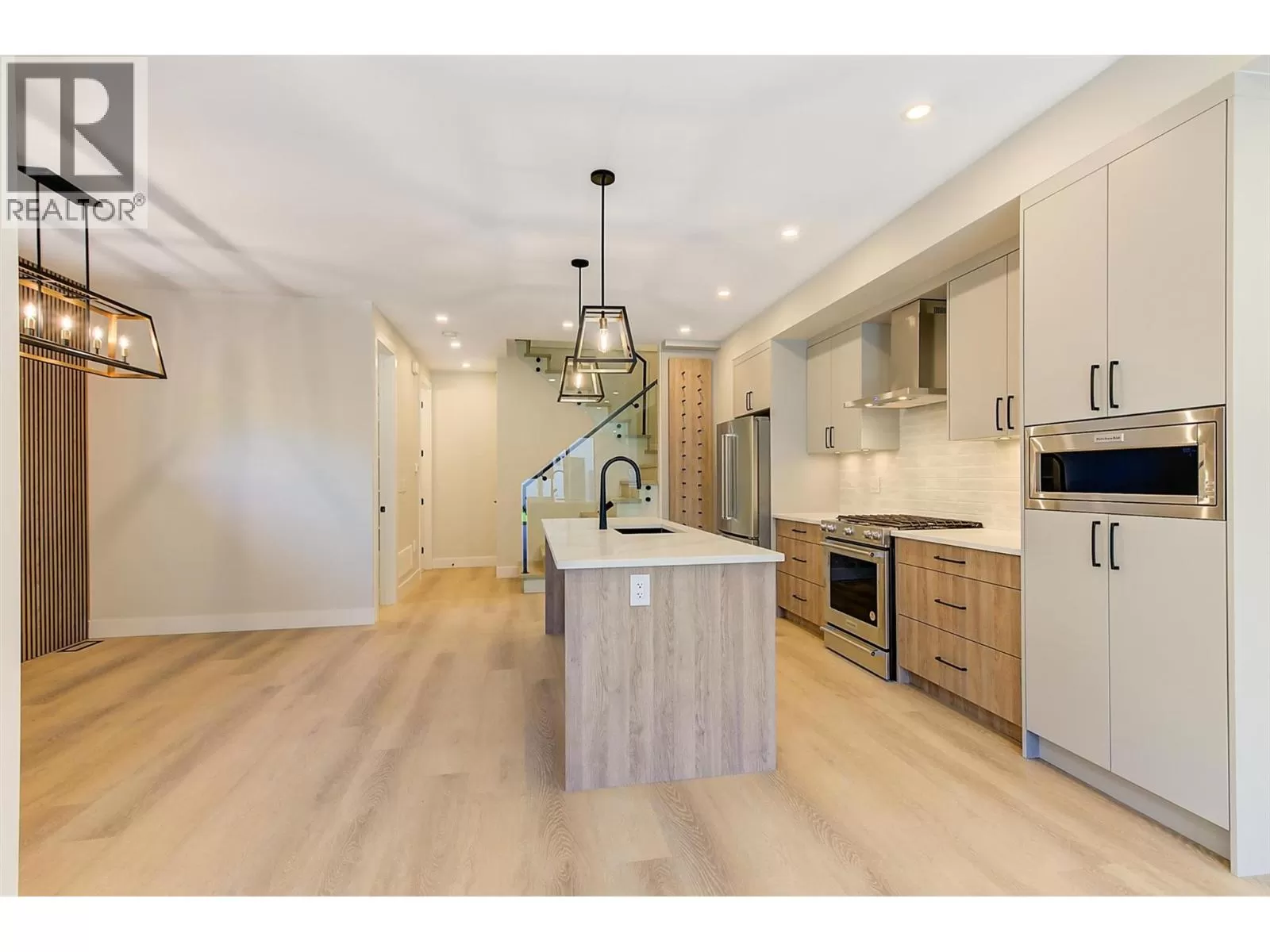 **Discover Luxury Downtown Living** Step into this custom-built, North-facing townhome, offering 3 bedrooms, 2.5 bathrooms, and two stories of exquisite design. Topped with a rooftop patio prepped for a hot tub, this home invites you to embrace the Okanaganâs signature outdoor lifestyle. Every detail has been carefully curated to exude sophistication. Expansive windows fill the space with natural light, complementing the modern exterior of concrete and wood finishes. Inside, the chef-inspired kitchen stands out with a large island, stainless steel appliances, quartz countertops, and a custom backsplash framing the gas stove and 28-inch hood range fan. Throughout the home, premium flooring, a built-in fireplace, and contemporary light fixtures enhance the luxurious ambiance. The primary suite features a spa-like ensuite with a double vanity and a sleek walk-in shower. A large crawl space on the main floor offers ample storage, while the private yard with a covered patio creates your personal oasis. Completing the home is a covered single-car garage with rough-in for an EV charging station, blending convenience with modern living. This townhome isnât just a residenceâitâs a statement of style, comfort, and urban sophistication. Make it yours and elevate your lifestyle today. (id:27476)