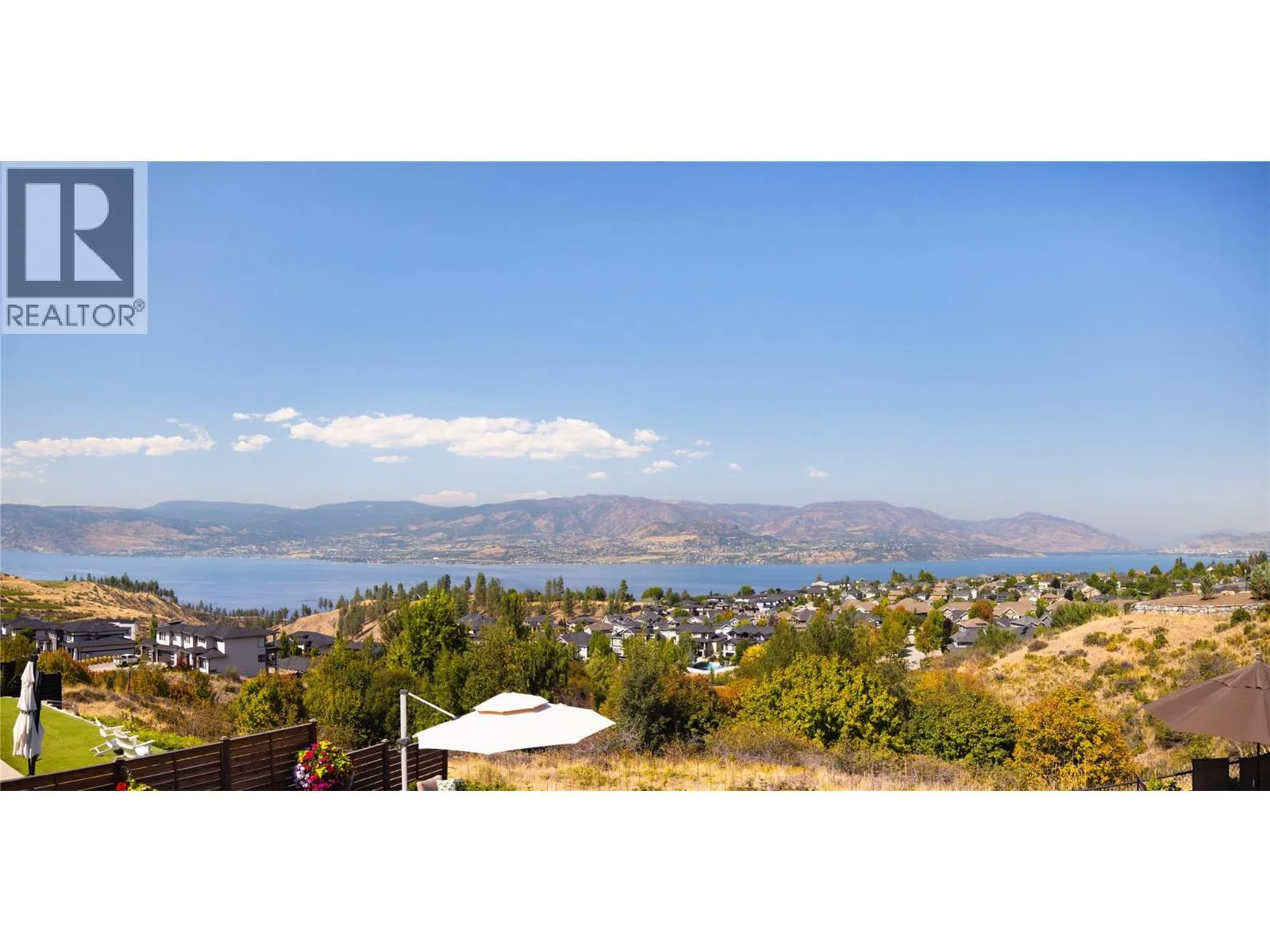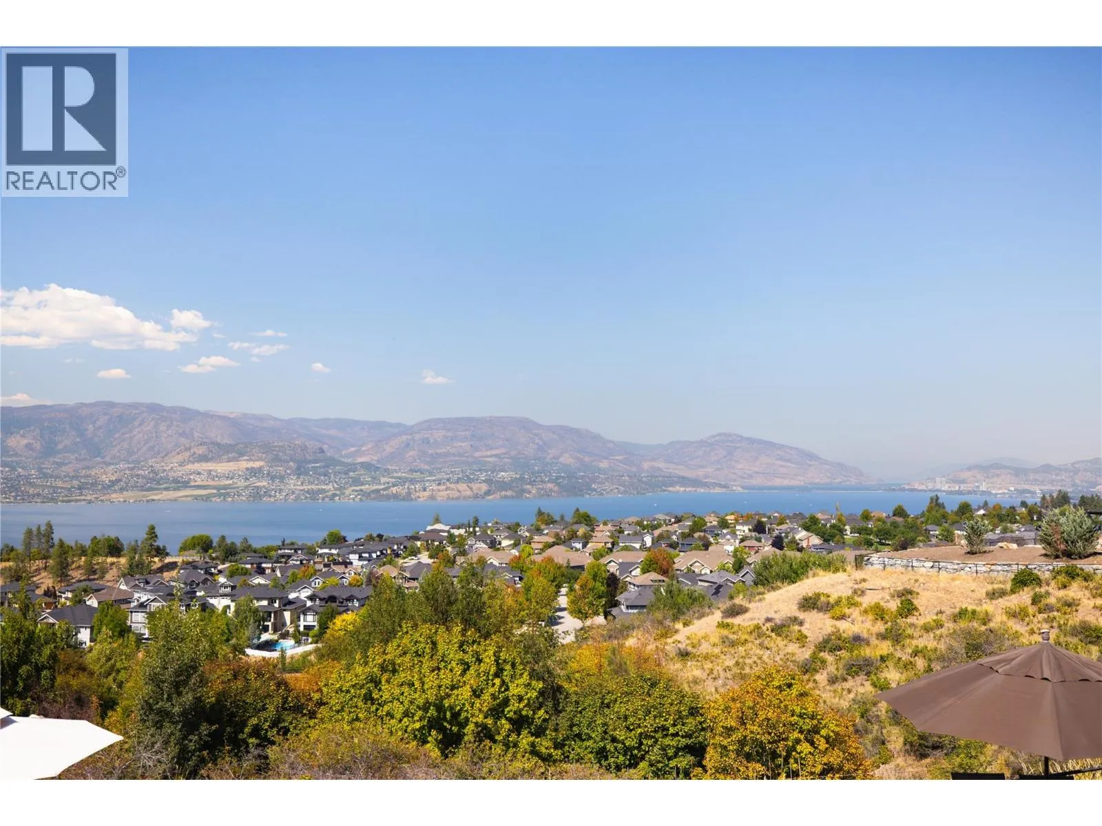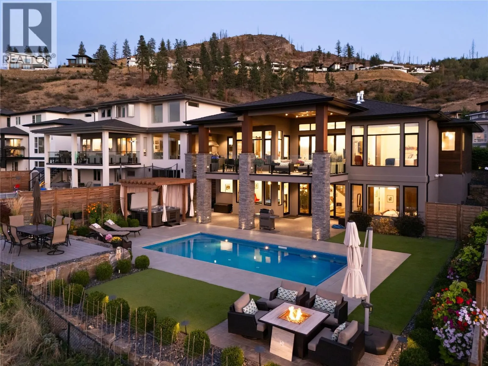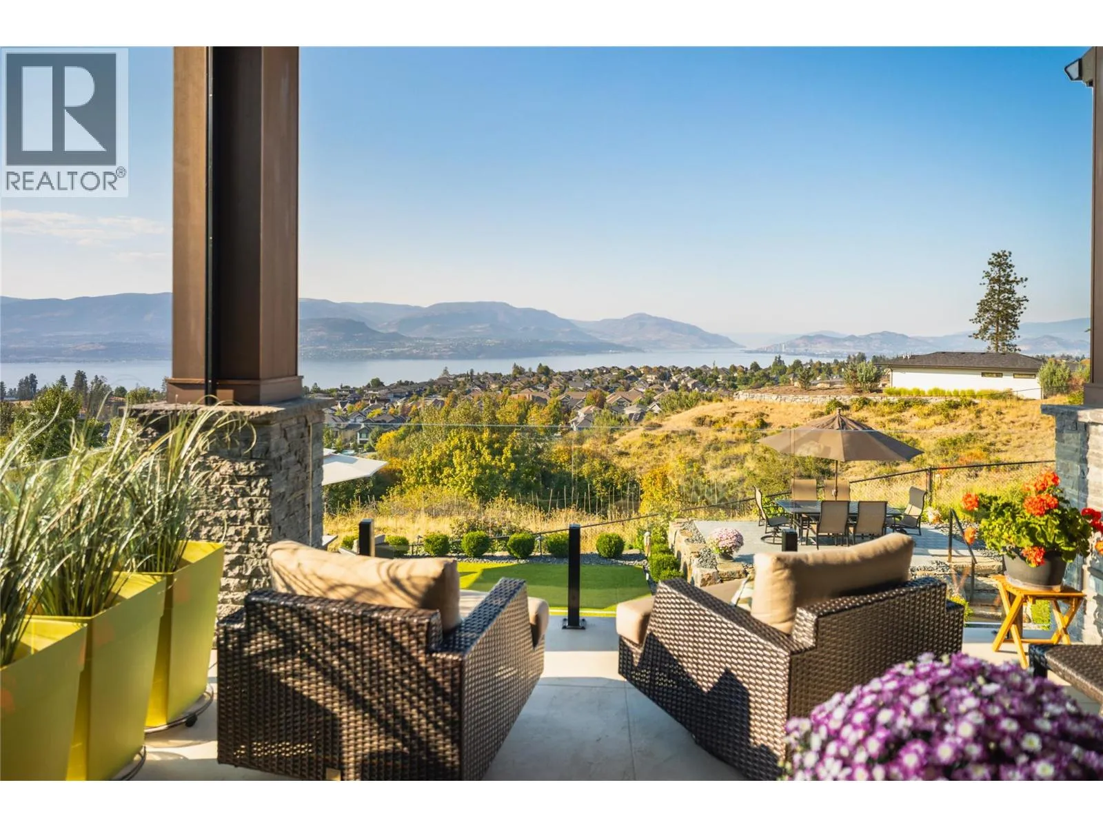 Stunning panoramic views of the lake down to Vernon, vineyards, the bridge and the city lights. Enjoy the natural green space behind the home that further enhances the views. Built by Bill Frame, this home showcases exceptional craftsmanship throughout with wide-plank wood floors, soaring ceilings, and walls of glass with the Okanagan landscape as the backdrop. The main level is a chefâs delight with Thermador appliances, functional oversized island, and butlerâs pantry. Open-concept living and dining areas flow seamlessly to the covered deck, complete with full outdoor kitchen, ceiling fan, built-in heaters, and automated blindsâperfect for year-round entertaining. Enjoy the main floor primary with serene lake views, spa-like ensuite with dual vanities, soaker tub, oversized shower, skylights, heated floors, and custom walk-in closet. An office and convenient laundry complete the main level. The lower floor is perfect for entertaining all your guests with a wet bar, temperature-controlled wine room, fitness space, and large rec and family rooms. Walls of glass open to the backyard oasis featuring a heated saltwater pool, pergola-covered hot tub, lounging areas, and fire pit. Additional highlights include Bolivian walnut doors, upgraded security, Culligan water softener, reverse-osmosis purifier, and a garage with epoxy floors, workshop, EV charger, and mezzanine. Landscaped grounds with a dining patio and water feature complete this Kettle Valley masterpiece with zero maintenance yard to enjoy the full Okanagan lifestyle (id:27476)