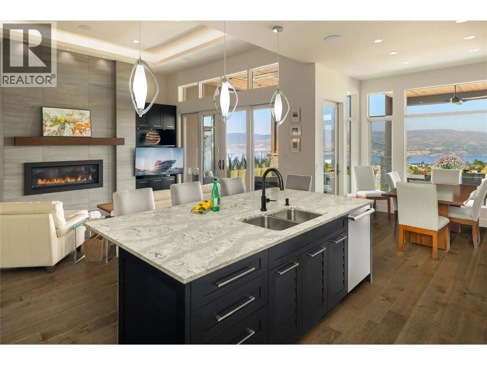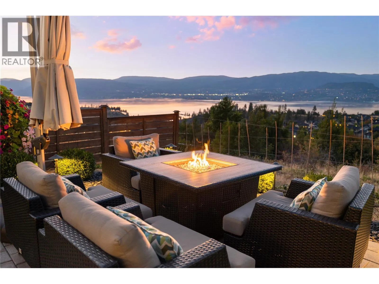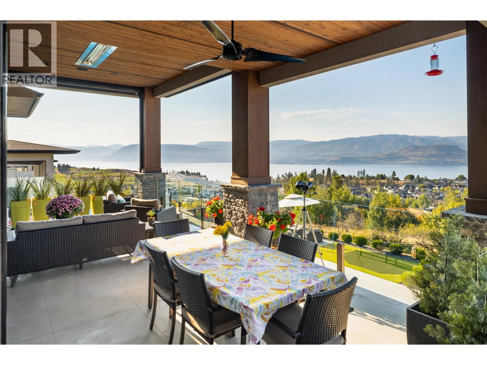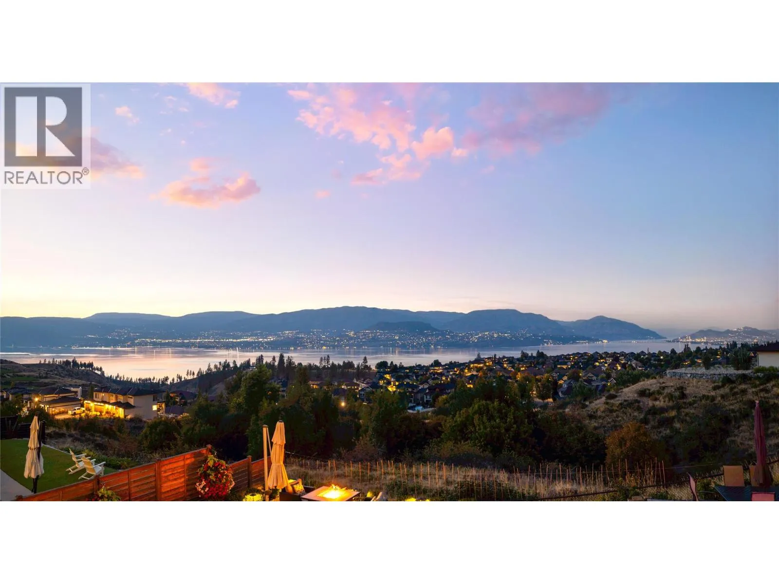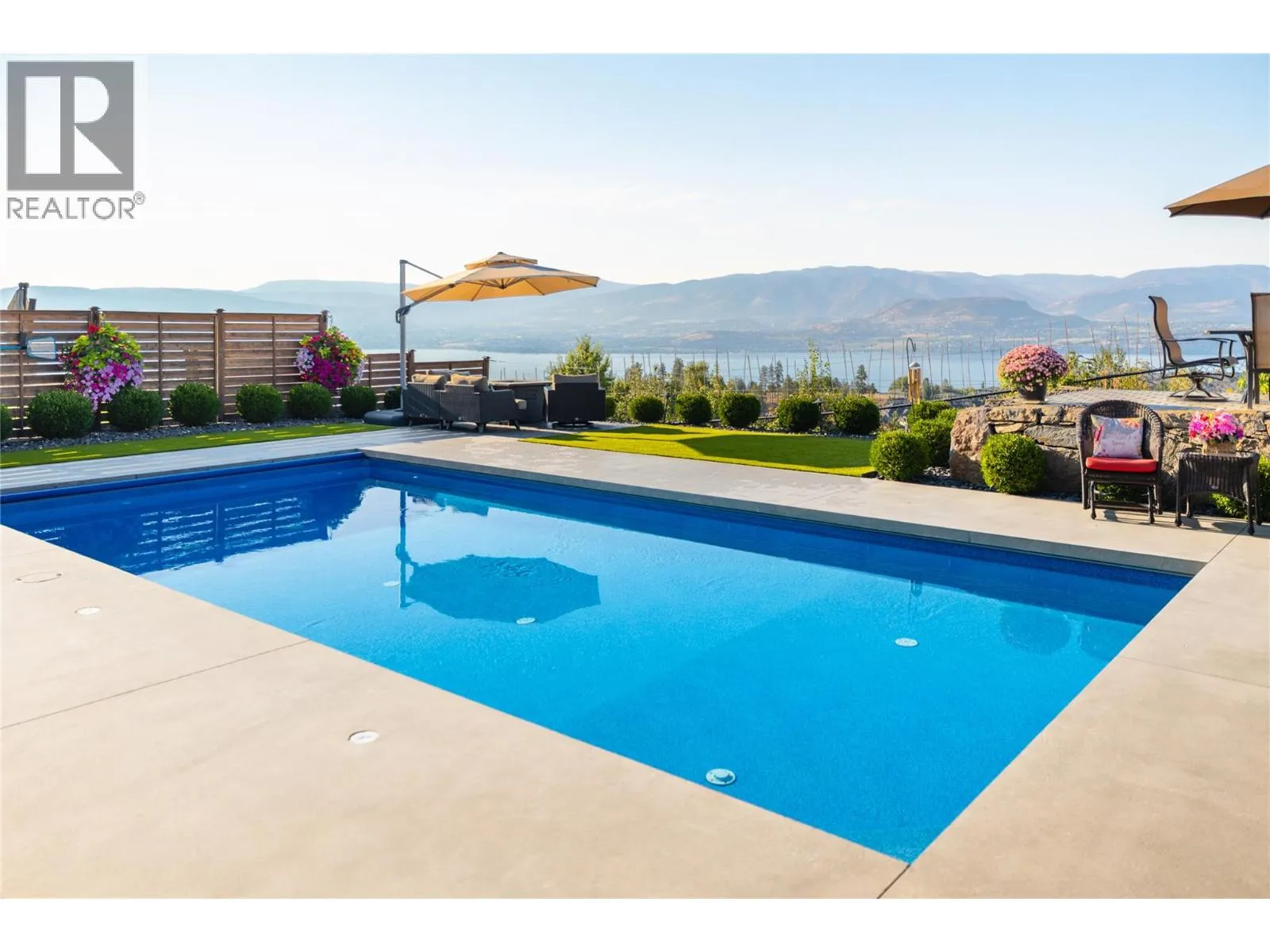 Stunning panoramic views of the lake down to Vernon, vineyards, the bridge and the city lights. Enjoy the natural green space behind the home that further enhances the views. Built by Bill Frame, this home showcases exceptional craftsmanship throughout with wide-plank wood floors, soaring ceilings, and walls of glass with the Okanagan landscape as the backdrop. The main level is a chefâs delight with Thermador appliances, functional oversized island, and butlerâs pantry. Open-concept living and dining areas flow seamlessly to the covered deck, complete with full outdoor kitchen, ceiling fan, built-in heaters, and automated blindsâperfect for year-round entertaining. Enjoy the main floor primary with serene lake views, spa-like ensuite with dual vanities, soaker tub, oversized shower, skylights, heated floors, and custom walk-in closet. An office and convenient laundry complete the main level. The lower floor is perfect for entertaining all your guests with a wet bar, temperature-controlled wine room, fitness space, and large rec and family rooms. Walls of glass open to the backyard oasis featuring a heated saltwater pool, pergola-covered hot tub, lounging areas, and fire pit. Additional highlights include Bolivian walnut doors, upgraded security, Culligan water softener, reverse-osmosis purifier, and a garage with epoxy floors, workshop, EV charger, and mezzanine. Landscaped grounds with a dining patio and water feature complete this Kettle Valley masterpiece with zero maintenance yard to enjoy the full Okanagan lifestyle (id:27476)