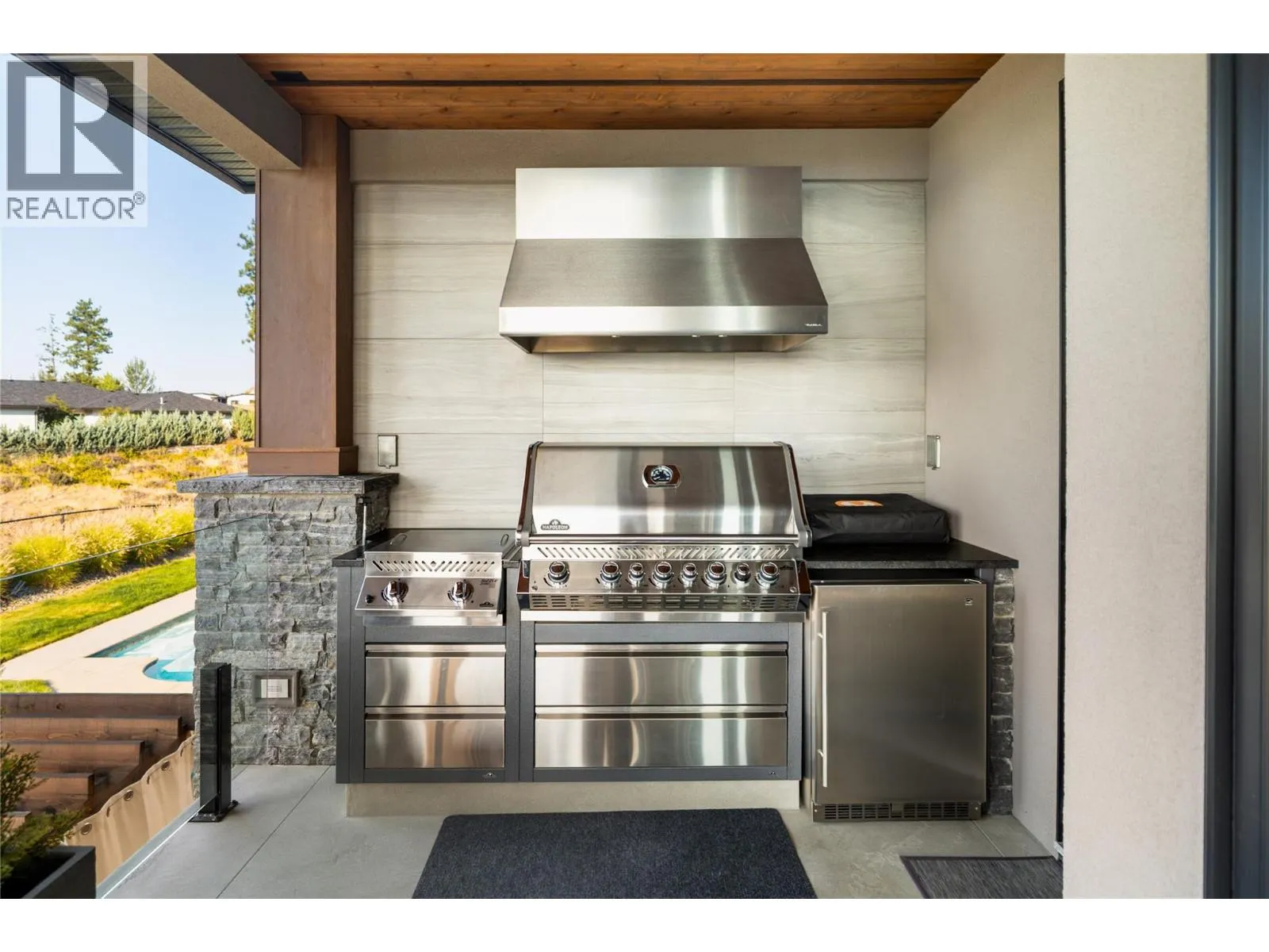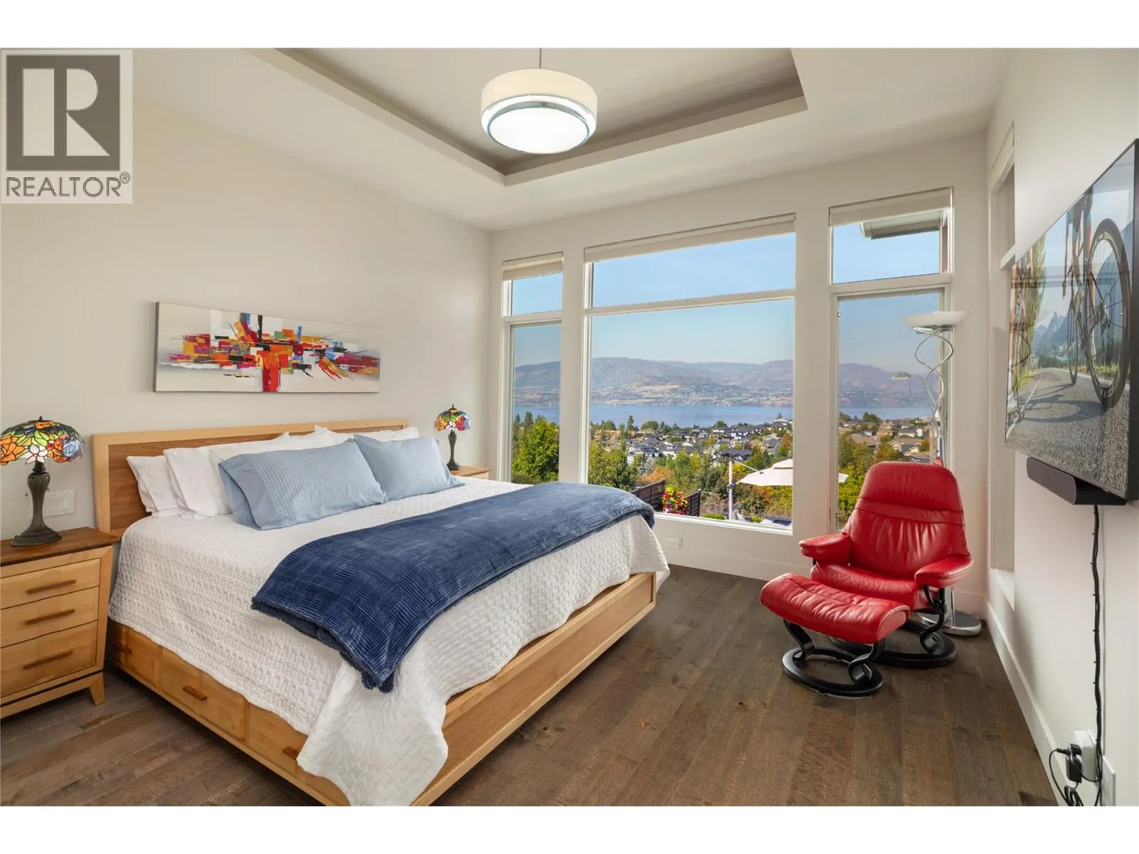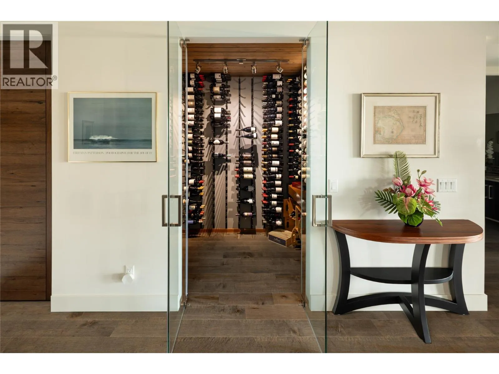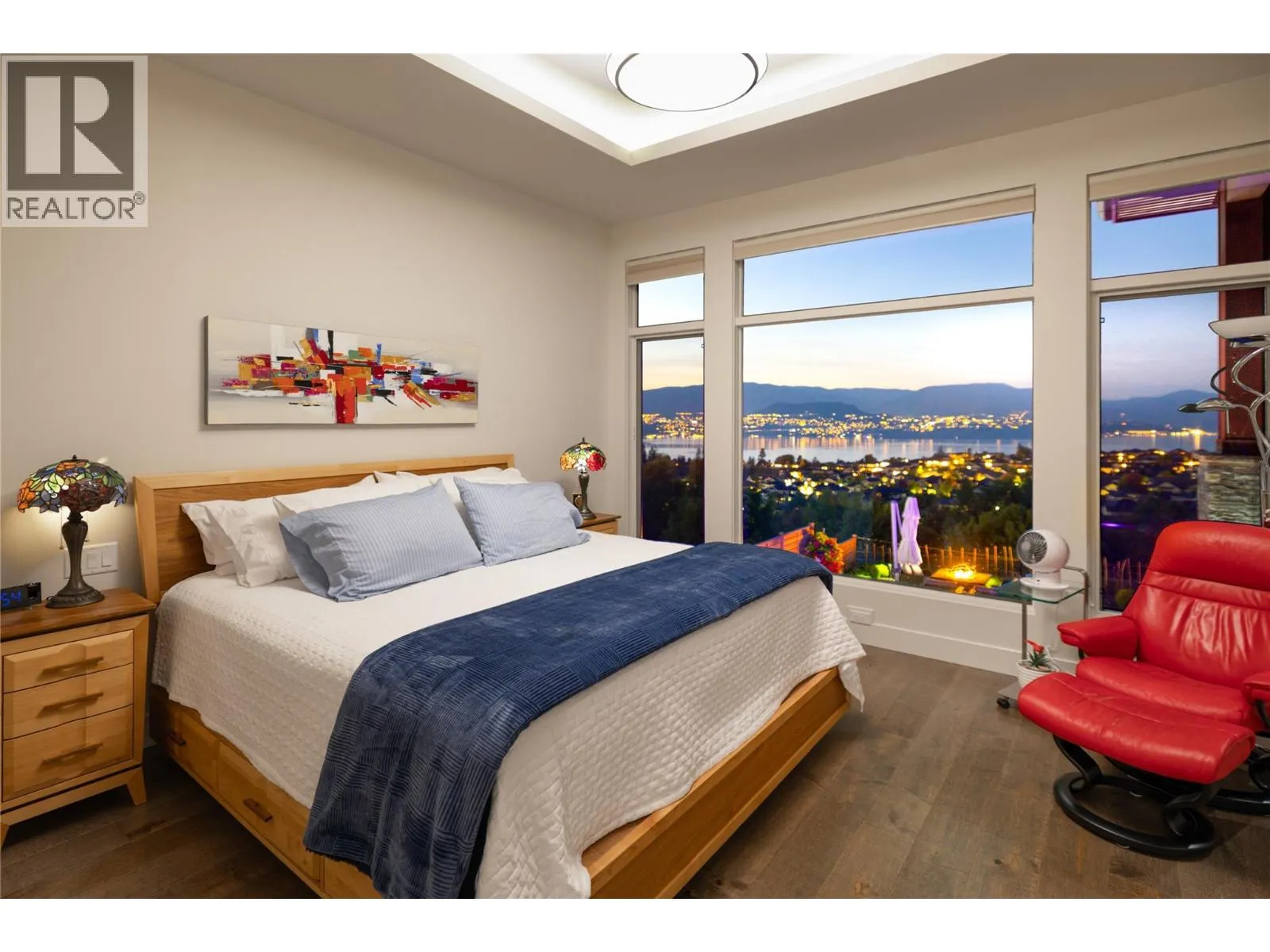 Stunning panoramic views of the lake down to Vernon, vineyards, the bridge and the city lights. Enjoy the natural green space behind the home that further enhances the views. Built by Bill Frame, this home showcases exceptional craftsmanship throughout with wide-plank wood floors, soaring ceilings, and walls of glass with the Okanagan landscape as the backdrop. The main level is a chefâs delight with Thermador appliances, functional oversized island, and butlerâs pantry. Open-concept living and dining areas flow seamlessly to the covered deck, complete with full outdoor kitchen, ceiling fan, built-in heaters, and automated blindsâperfect for year-round entertaining. Enjoy the main floor primary with serene lake views, spa-like ensuite with dual vanities, soaker tub, oversized shower, skylights, heated floors, and custom walk-in closet. An office and convenient laundry complete the main level. The lower floor is perfect for entertaining all your guests with a wet bar, temperature-controlled wine room, fitness space, and large rec and family rooms. Walls of glass open to the backyard oasis featuring a heated saltwater pool, pergola-covered hot tub, lounging areas, and fire pit. Additional highlights include Bolivian walnut doors, upgraded security, Culligan water softener, reverse-osmosis purifier, and a garage with epoxy floors, workshop, EV charger, and mezzanine. Landscaped grounds with a dining patio and water feature complete this Kettle Valley masterpiece with zero maintenance yard to enjoy the full Okanagan lifestyle (id:27476)
