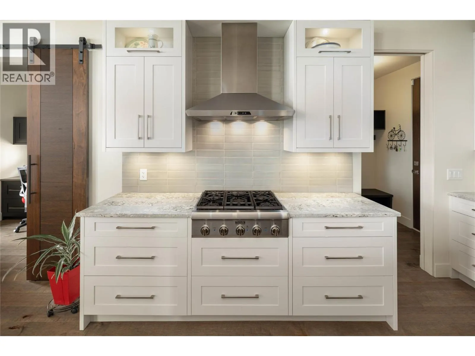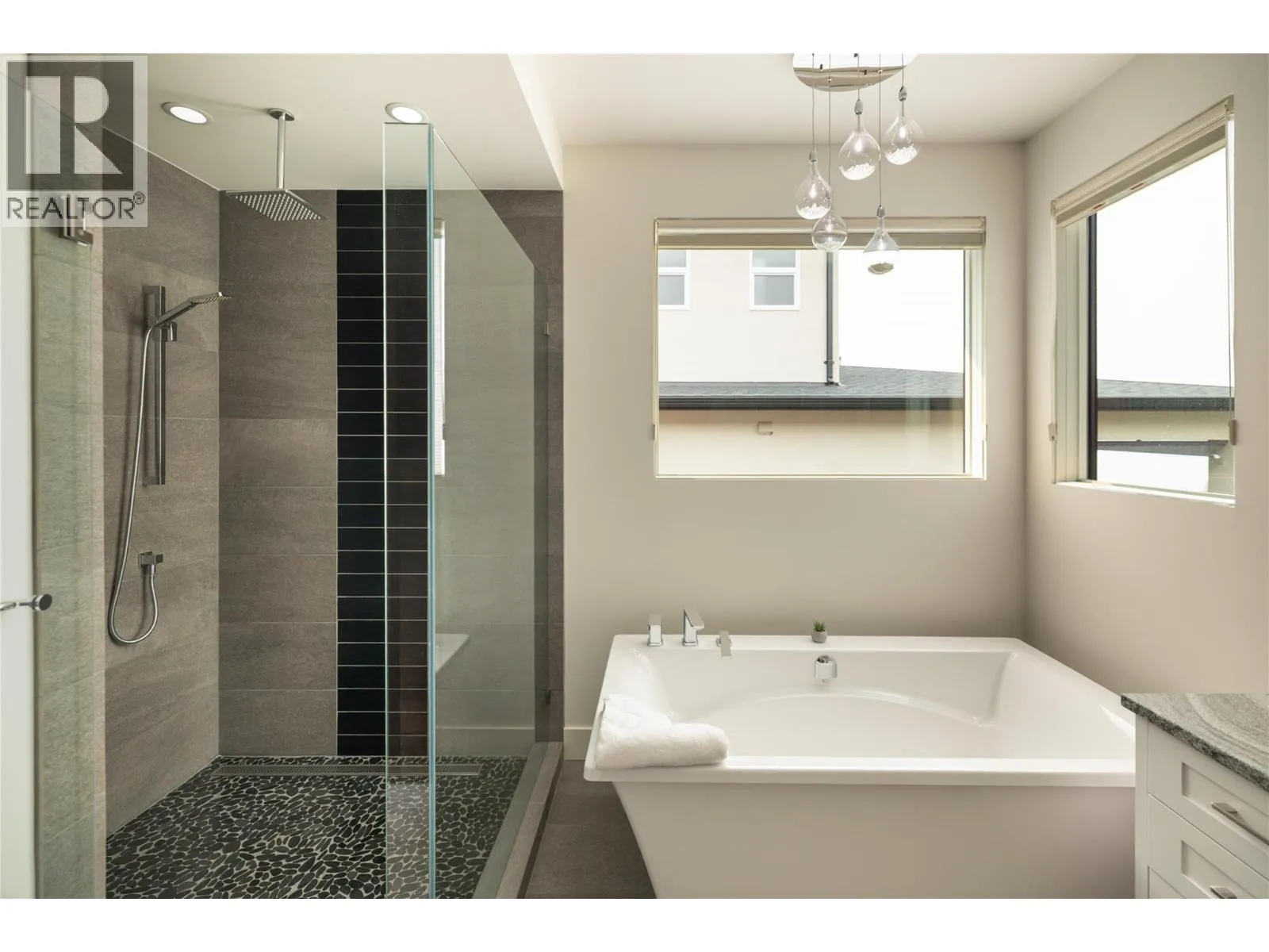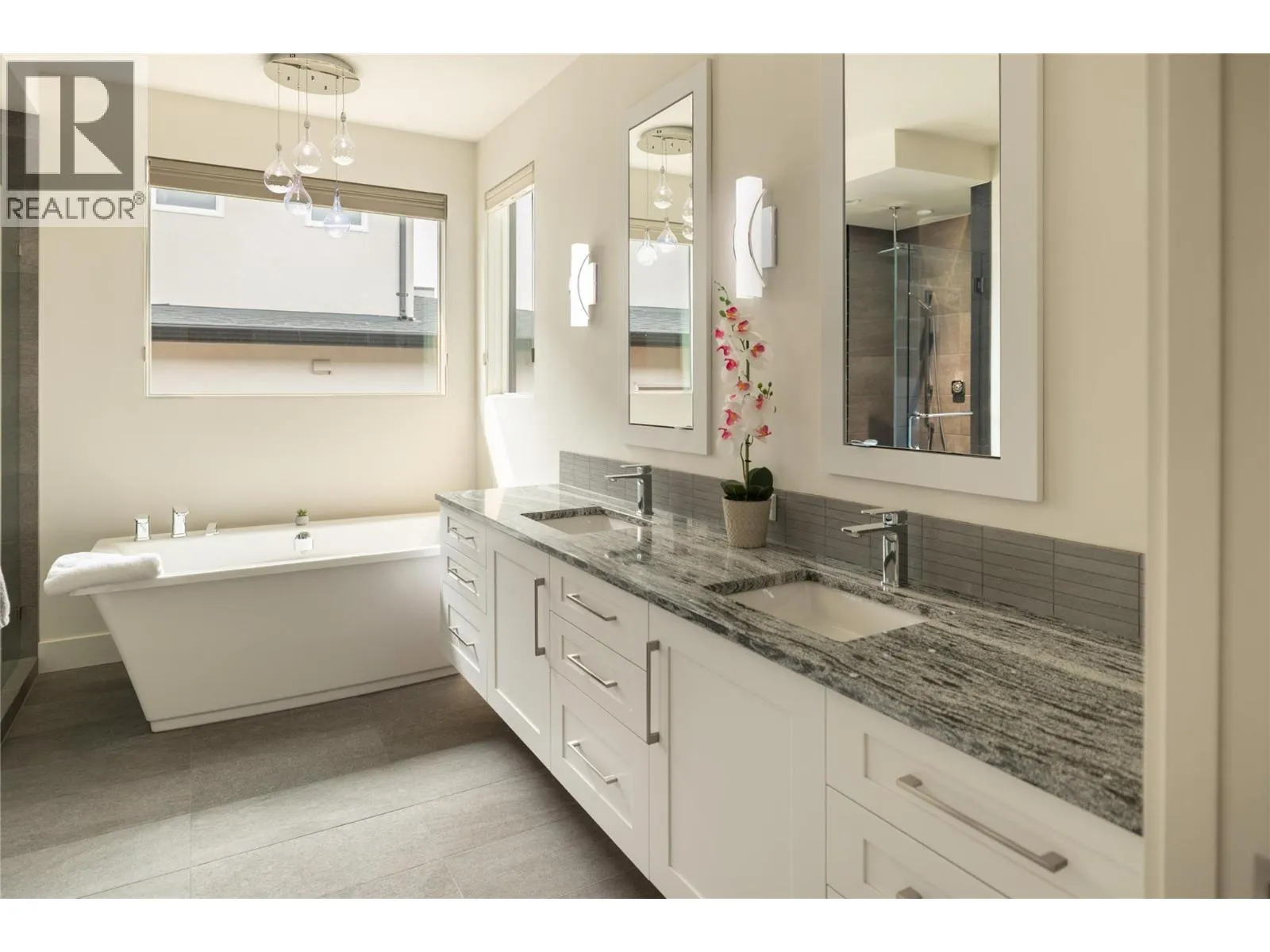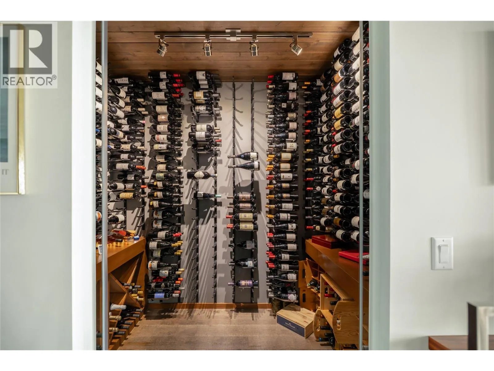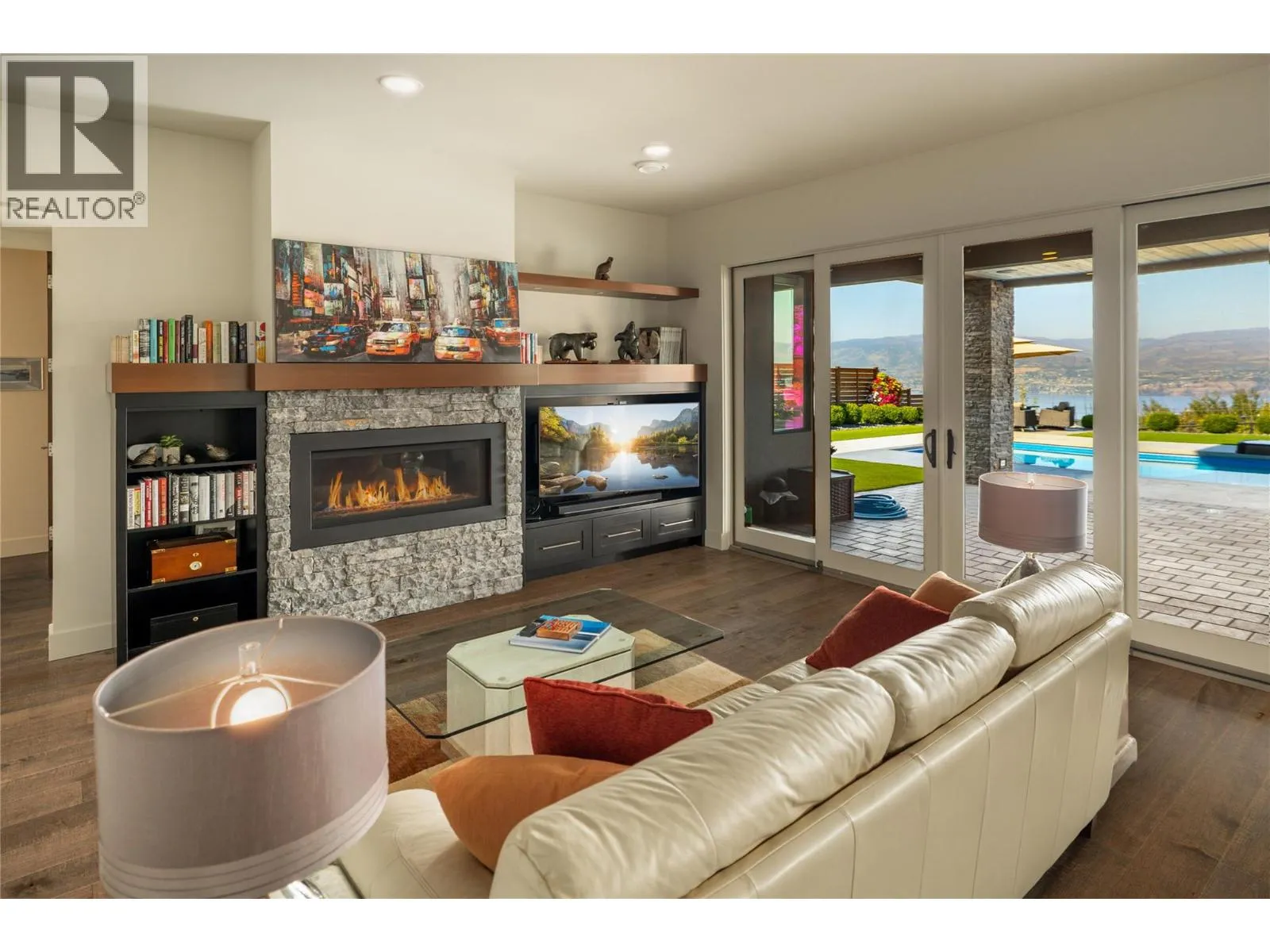 Stunning panoramic views of the lake down to Vernon, vineyards, the bridge and the city lights. Enjoy the natural green space behind the home that further enhances the views. Built by Bill Frame, this home showcases exceptional craftsmanship throughout with wide-plank wood floors, soaring ceilings, and walls of glass with the Okanagan landscape as the backdrop. The main level is a chefâs delight with Thermador appliances, functional oversized island, and butlerâs pantry. Open-concept living and dining areas flow seamlessly to the covered deck, complete with full outdoor kitchen, ceiling fan, built-in heaters, and automated blindsâperfect for year-round entertaining. Enjoy the main floor primary with serene lake views, spa-like ensuite with dual vanities, soaker tub, oversized shower, skylights, heated floors, and custom walk-in closet. An office and convenient laundry complete the main level. The lower floor is perfect for entertaining all your guests with a wet bar, temperature-controlled wine room, fitness space, and large rec and family rooms. Walls of glass open to the backyard oasis featuring a heated saltwater pool, pergola-covered hot tub, lounging areas, and fire pit. Additional highlights include Bolivian walnut doors, upgraded security, Culligan water softener, reverse-osmosis purifier, and a garage with epoxy floors, workshop, EV charger, and mezzanine. Landscaped grounds with a dining patio and water feature complete this Kettle Valley masterpiece with zero maintenance yard to enjoy the full Okanagan lifestyle (id:27476)