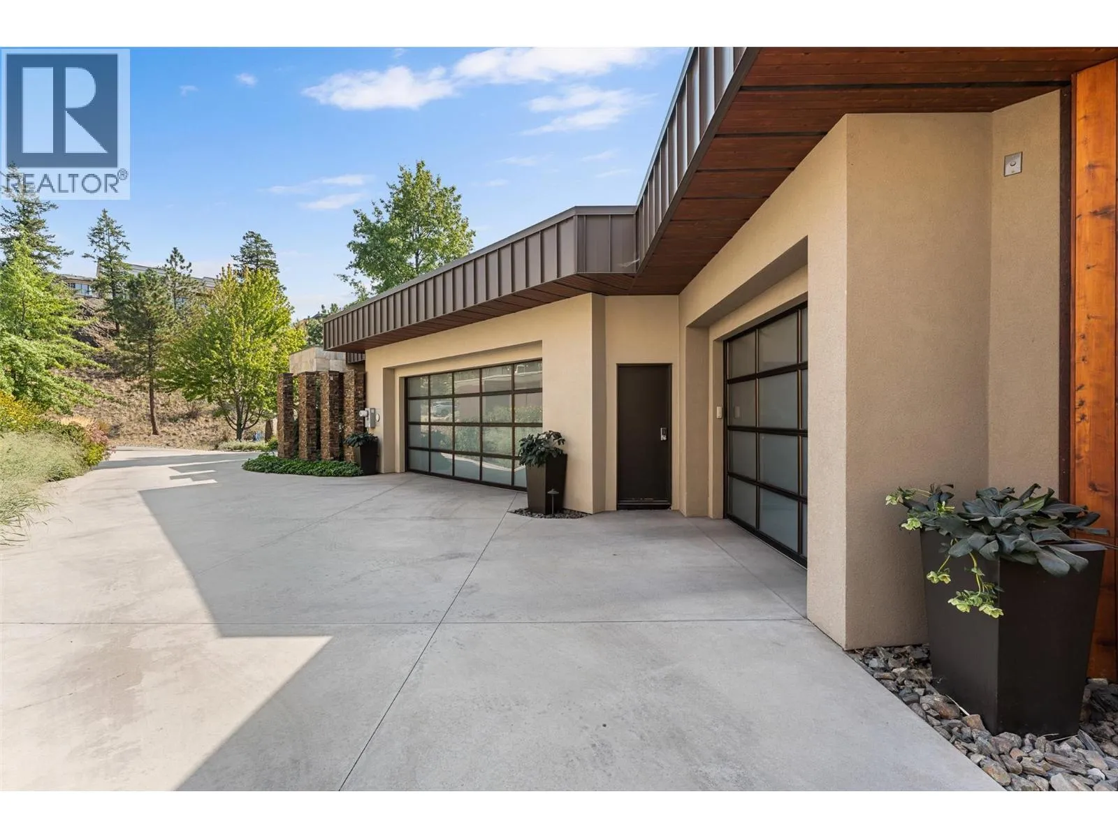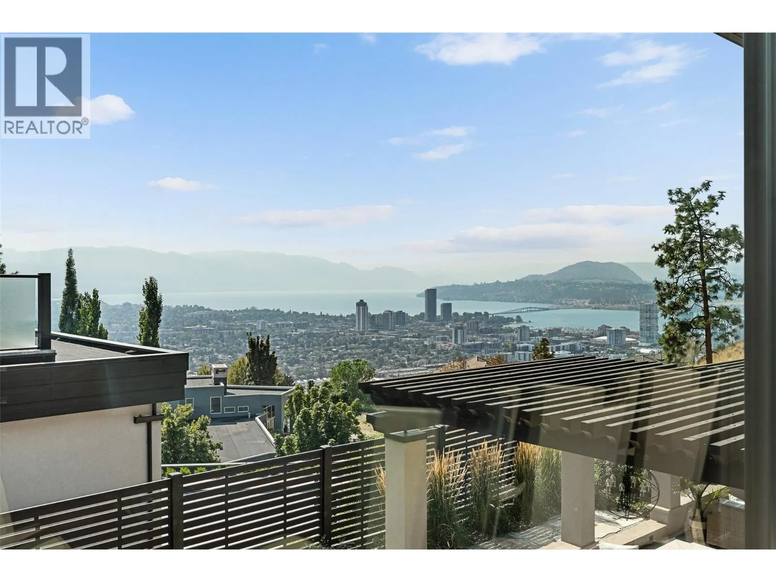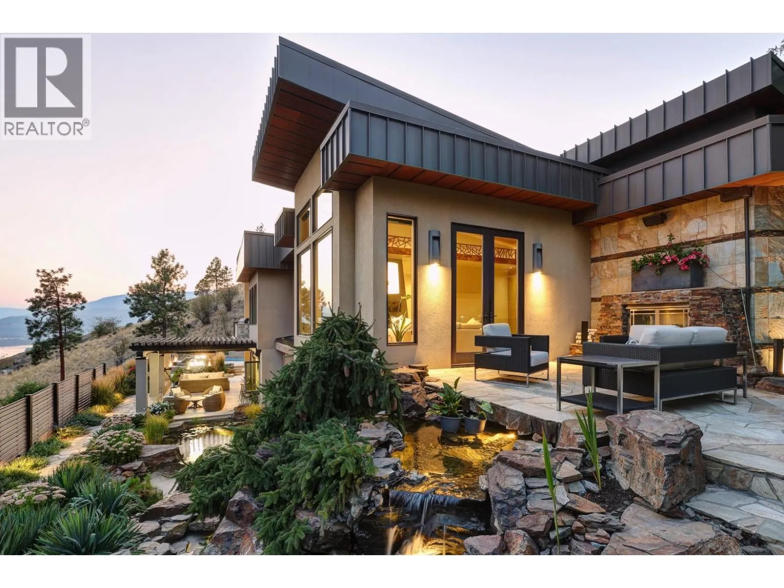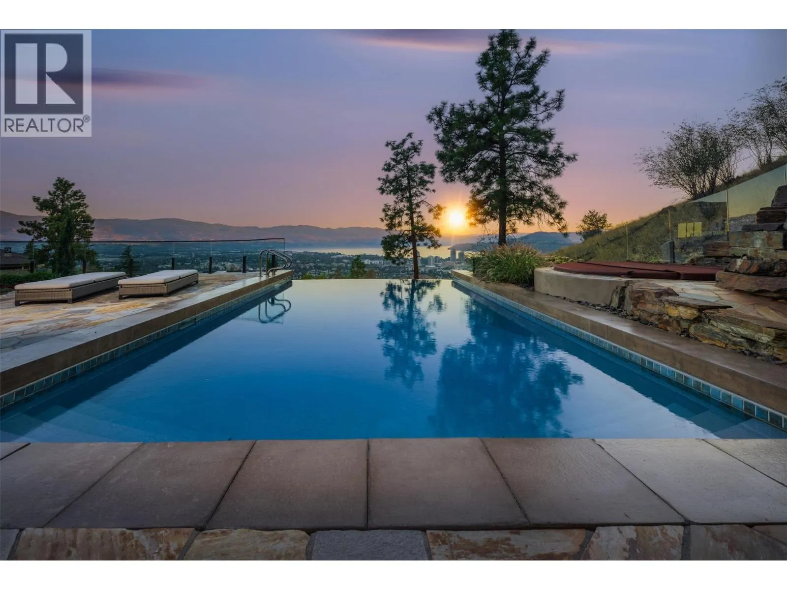 An architectural masterpiece set in one of Kelownaâs most coveted enclaves, this residence offers award-winning landscaping, sweeping lake and city views, and an effortless indoor/outdoor flow tailored for both entertaining and aging-in-place. The entry sets the tone with stone flooring that transitions seamlessly indoors, granite accents, and soaring ceilings. A chefâs kitchen with Viking, Sub-Zero, and Miele appliances complements the open-concept dining and living areas, anchored by a dramatic two-way stone fireplace. The main-level primary suite is a serene retreat with vaulted ceilings, power blinds, a spa-inspired ensuite with steam shower, freestanding tub, and custom dressing room. The walkout level is a destination of its own featuring a soundproof theatre, gym, full bar, and recreation space with walls of retractable glass connecting to the outdoors. Designed for year-round enjoyment, the exterior boasts multiple patios, fire features, a koi pond, misters, heaters, and an outdoor kitchen. An infinity pool with hot tub and cabana overlooks the lake and city lights, creating an entertainerâs dream setting. With a triple heated garage, ample storage, and direct access to parkland trails, all just minutes to downtown, this estate offers unmatched lifestyle and luxury in the heart of the Okanagan. (id:27476)