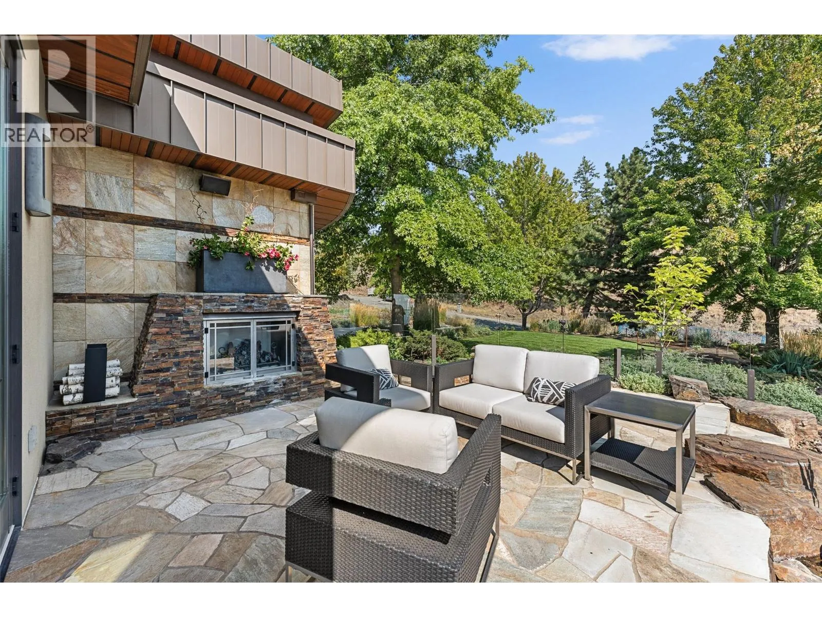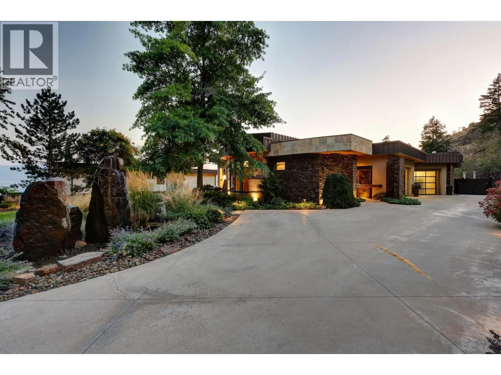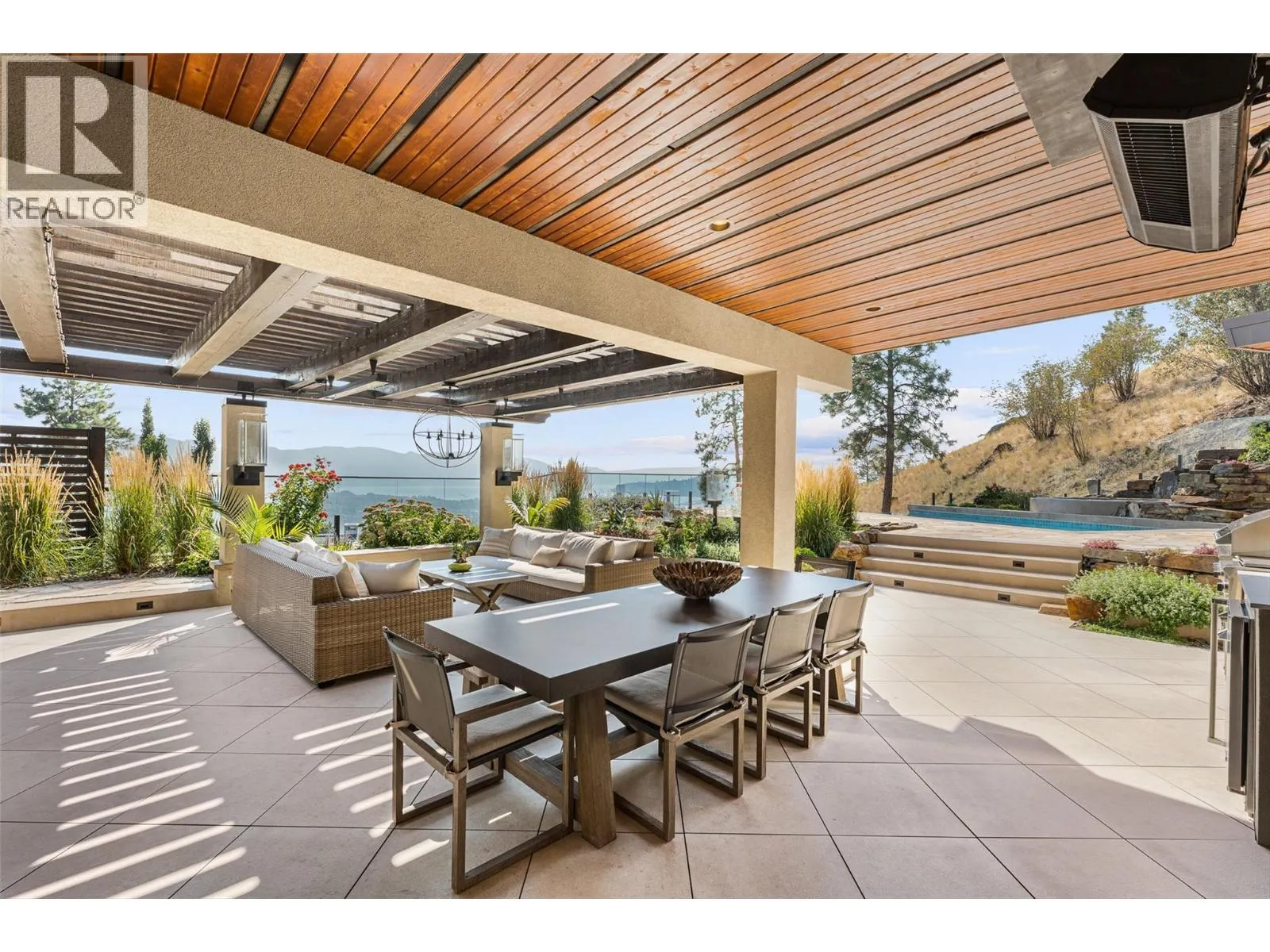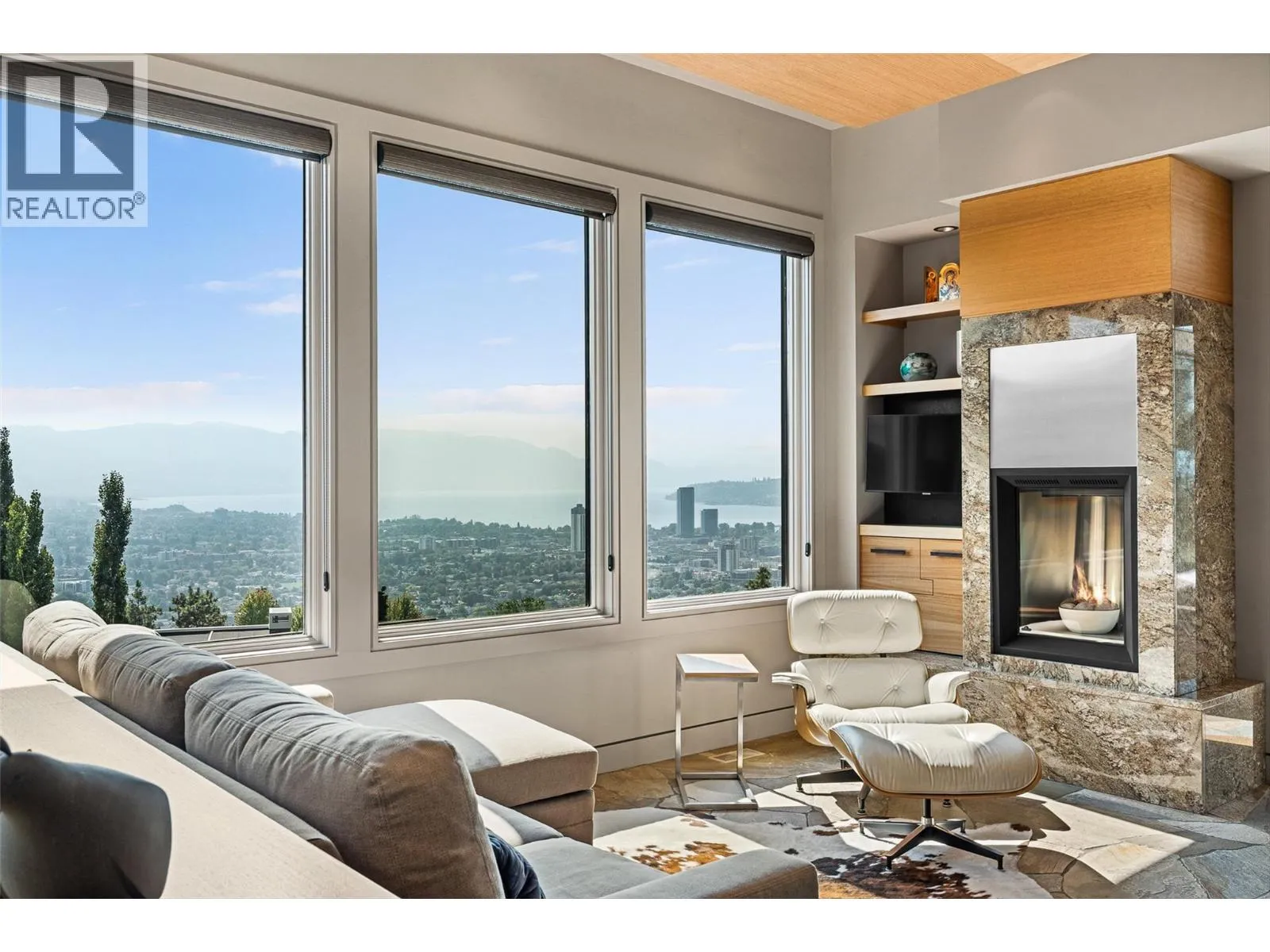 An architectural masterpiece set in one of Kelownaâs most coveted enclaves, this residence offers award-winning landscaping, sweeping lake and city views, and an effortless indoor/outdoor flow tailored for both entertaining and aging-in-place. The entry sets the tone with stone flooring that transitions seamlessly indoors, granite accents, and soaring ceilings. A chefâs kitchen with Viking, Sub-Zero, and Miele appliances complements the open-concept dining and living areas, anchored by a dramatic two-way stone fireplace. The main-level primary suite is a serene retreat with vaulted ceilings, power blinds, a spa-inspired ensuite with steam shower, freestanding tub, and custom dressing room. The walkout level is a destination of its own featuring a soundproof theatre, gym, full bar, and recreation space with walls of retractable glass connecting to the outdoors. Designed for year-round enjoyment, the exterior boasts multiple patios, fire features, a koi pond, misters, heaters, and an outdoor kitchen. An infinity pool with hot tub and cabana overlooks the lake and city lights, creating an entertainerâs dream setting. With a triple heated garage, ample storage, and direct access to parkland trails, all just minutes to downtown, this estate offers unmatched lifestyle and luxury in the heart of the Okanagan. (id:27476)