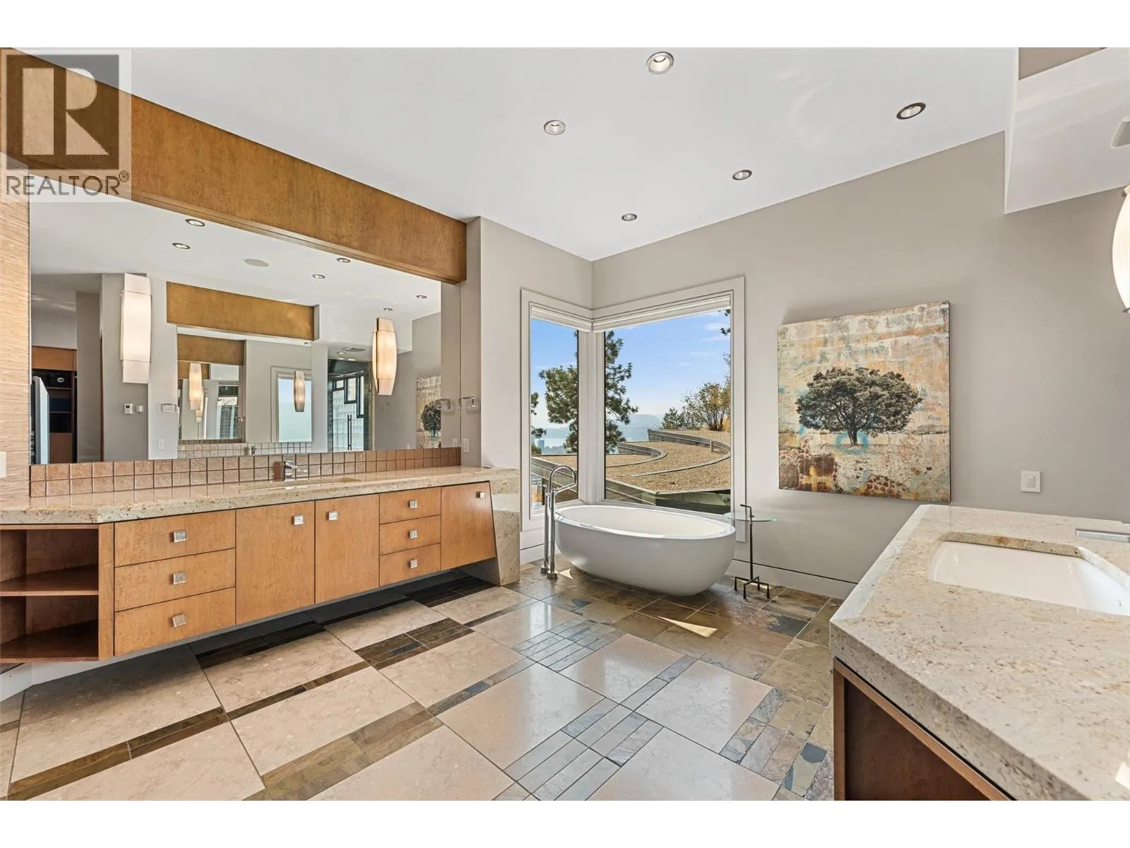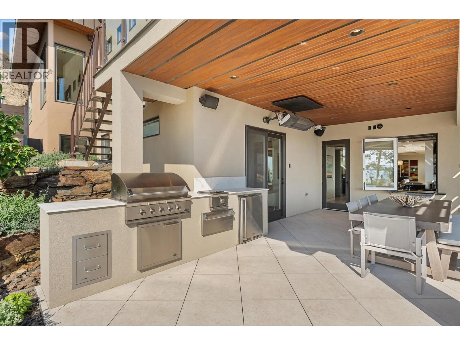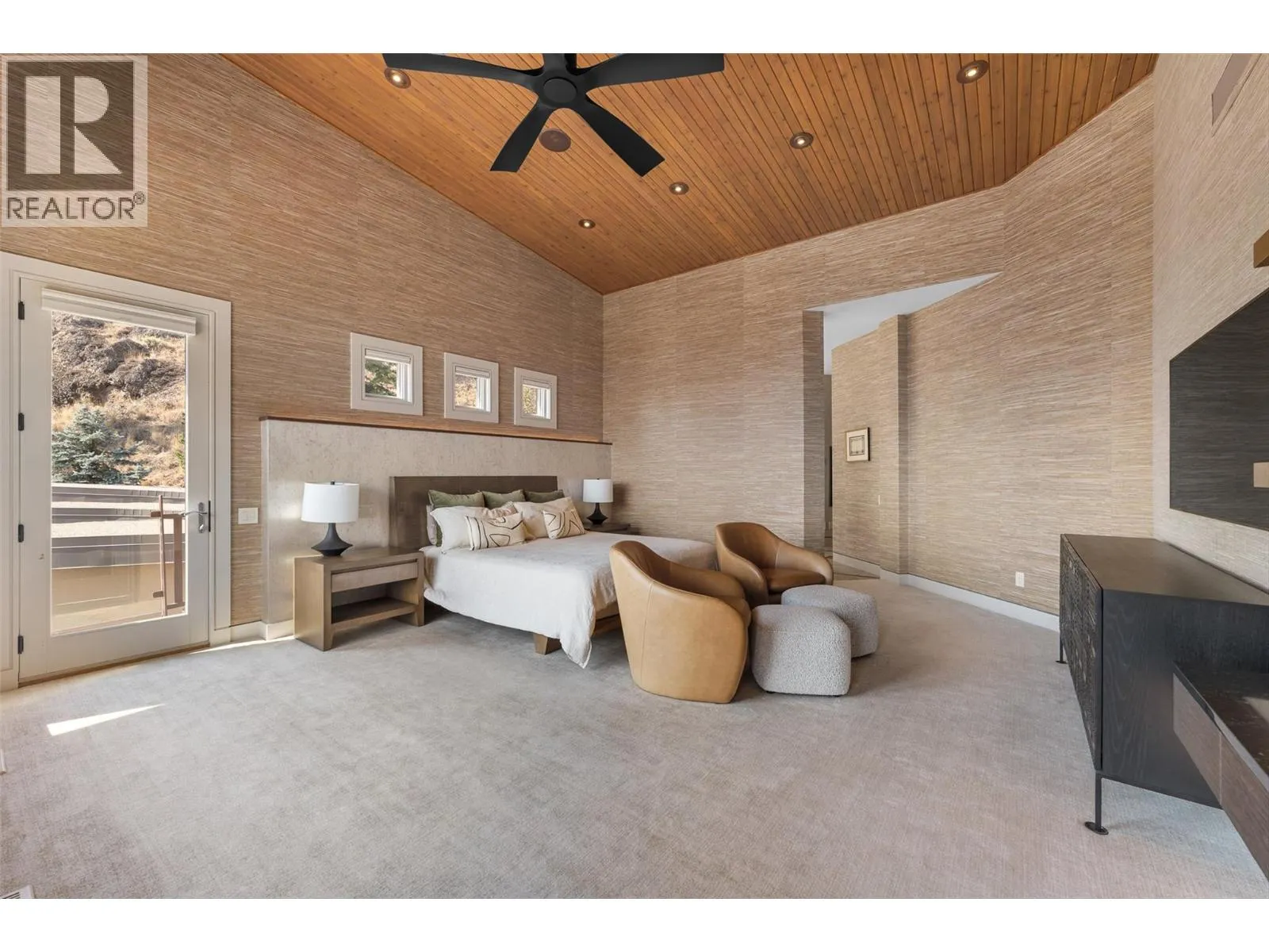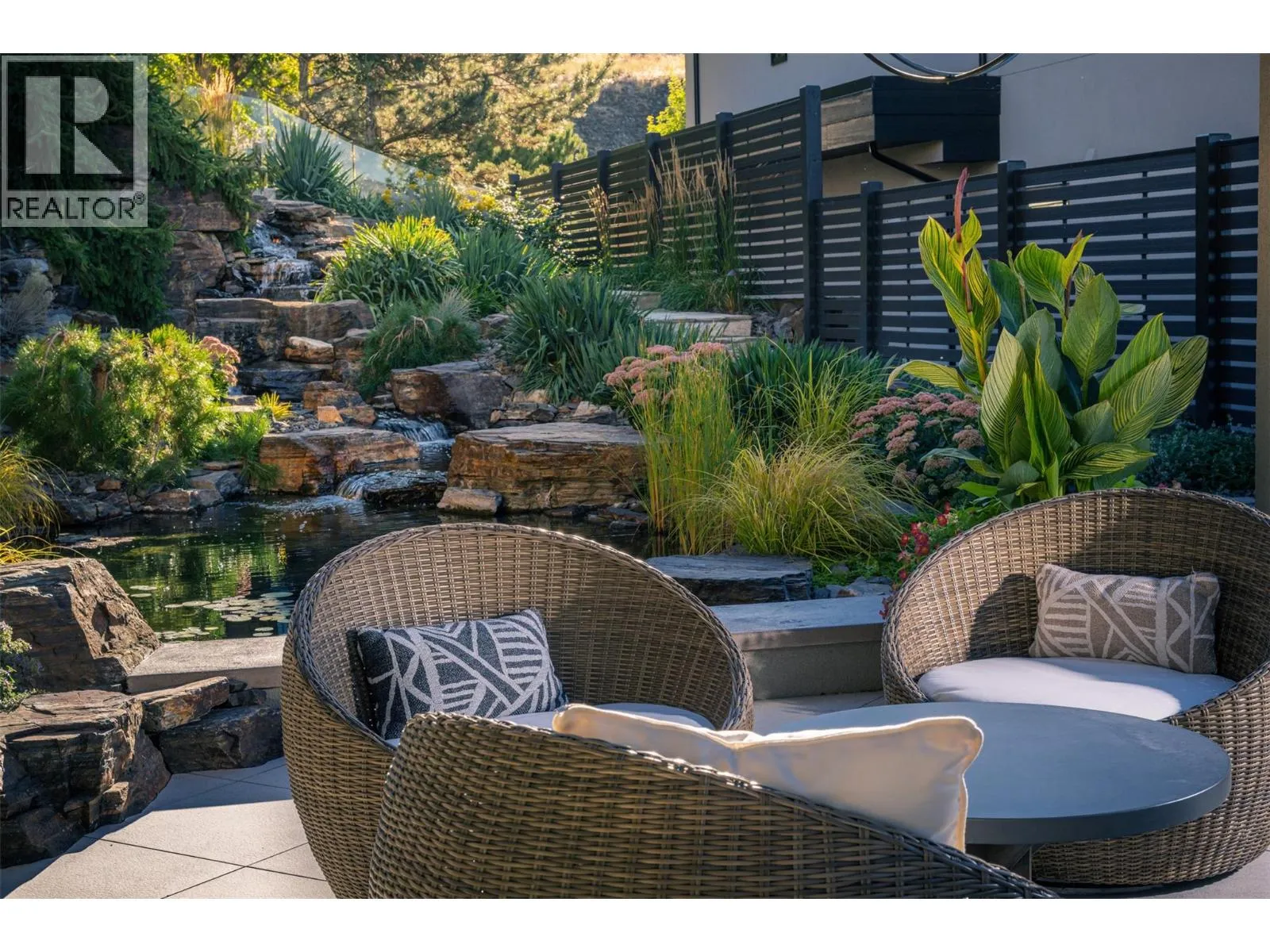 An architectural masterpiece set in one of Kelownaâs most coveted enclaves, this residence offers award-winning landscaping, sweeping lake and city views, and an effortless indoor/outdoor flow tailored for both entertaining and aging-in-place. The entry sets the tone with stone flooring that transitions seamlessly indoors, granite accents, and soaring ceilings. A chefâs kitchen with Viking, Sub-Zero, and Miele appliances complements the open-concept dining and living areas, anchored by a dramatic two-way stone fireplace. The main-level primary suite is a serene retreat with vaulted ceilings, power blinds, a spa-inspired ensuite with steam shower, freestanding tub, and custom dressing room. The walkout level is a destination of its own featuring a soundproof theatre, gym, full bar, and recreation space with walls of retractable glass connecting to the outdoors. Designed for year-round enjoyment, the exterior boasts multiple patios, fire features, a koi pond, misters, heaters, and an outdoor kitchen. An infinity pool with hot tub and cabana overlooks the lake and city lights, creating an entertainerâs dream setting. With a triple heated garage, ample storage, and direct access to parkland trails, all just minutes to downtown, this estate offers unmatched lifestyle and luxury in the heart of the Okanagan. (id:27476)