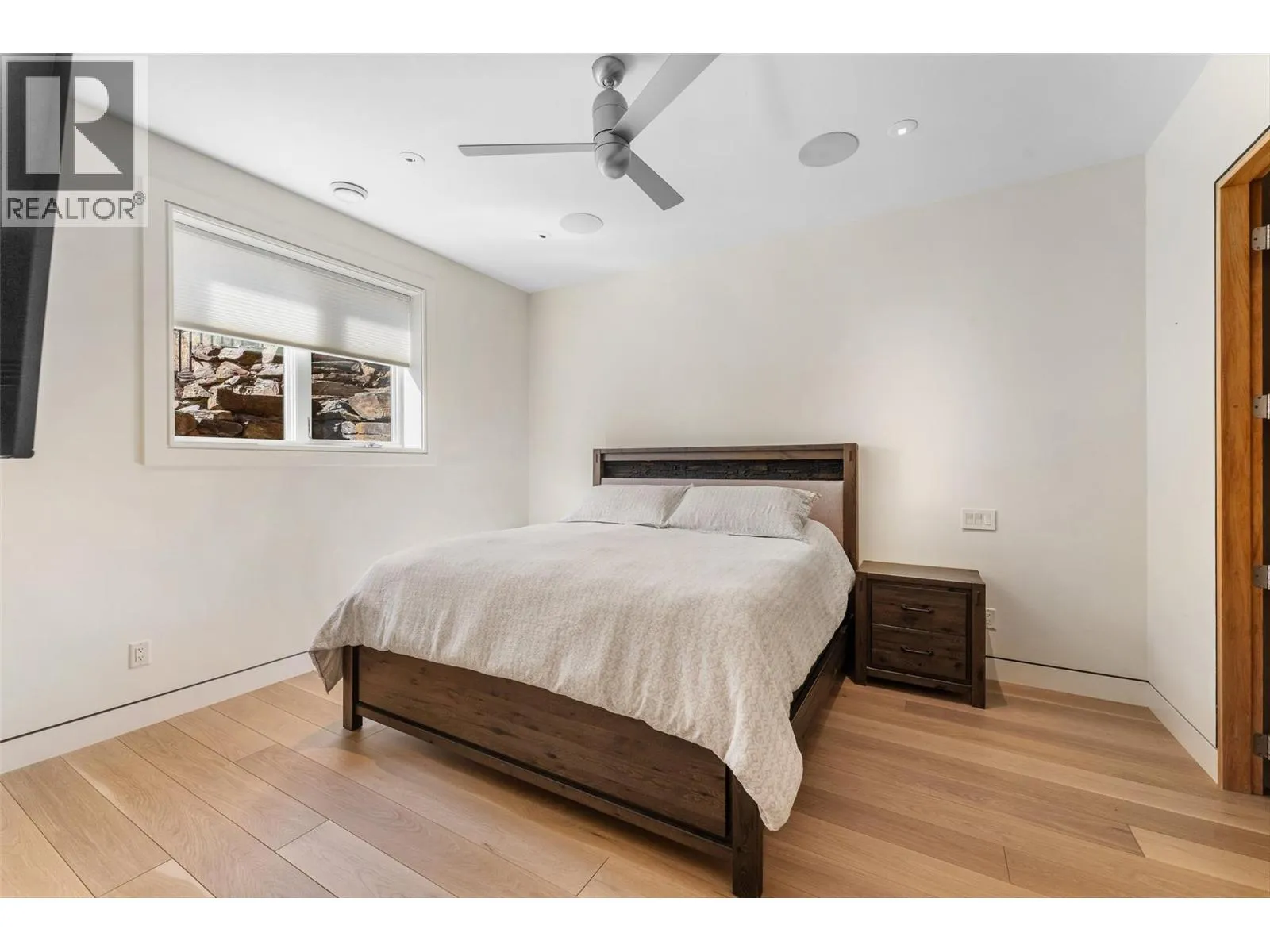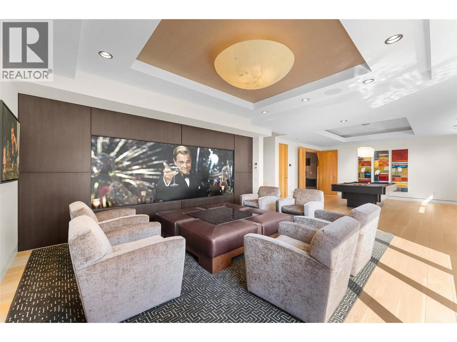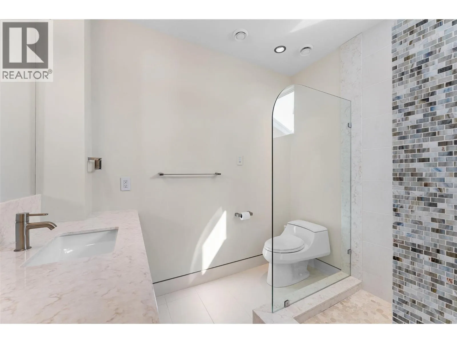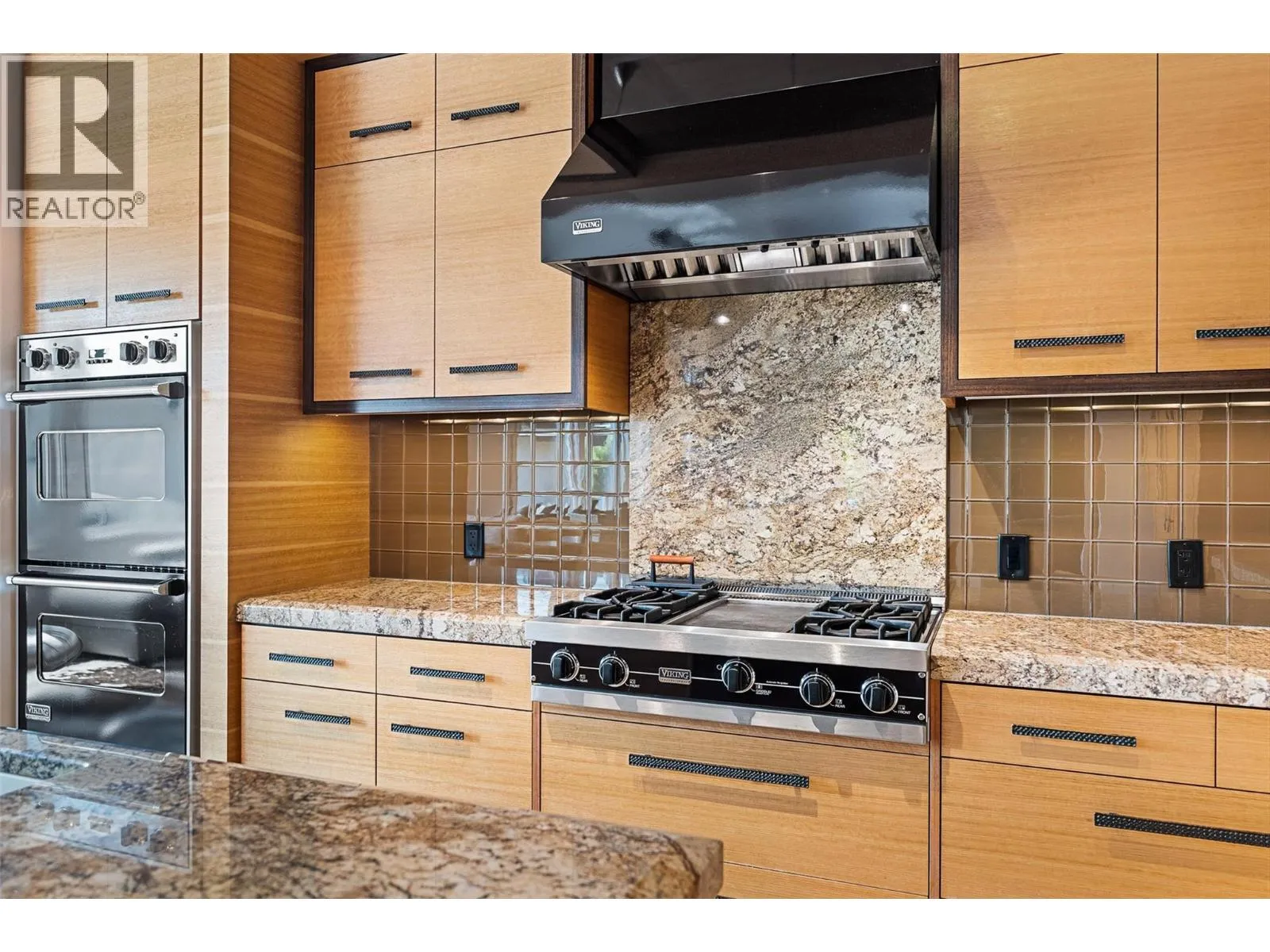 An architectural masterpiece set in one of Kelownaâs most coveted enclaves, this residence offers award-winning landscaping, sweeping lake and city views, and an effortless indoor/outdoor flow tailored for both entertaining and aging-in-place. The entry sets the tone with stone flooring that transitions seamlessly indoors, granite accents, and soaring ceilings. A chefâs kitchen with Viking, Sub-Zero, and Miele appliances complements the open-concept dining and living areas, anchored by a dramatic two-way stone fireplace. The main-level primary suite is a serene retreat with vaulted ceilings, power blinds, a spa-inspired ensuite with steam shower, freestanding tub, and custom dressing room. The walkout level is a destination of its own featuring a soundproof theatre, gym, full bar, and recreation space with walls of retractable glass connecting to the outdoors. Designed for year-round enjoyment, the exterior boasts multiple patios, fire features, a koi pond, misters, heaters, and an outdoor kitchen. An infinity pool with hot tub and cabana overlooks the lake and city lights, creating an entertainerâs dream setting. With a triple heated garage, ample storage, and direct access to parkland trails, all just minutes to downtown, this estate offers unmatched lifestyle and luxury in the heart of the Okanagan. (id:27476)