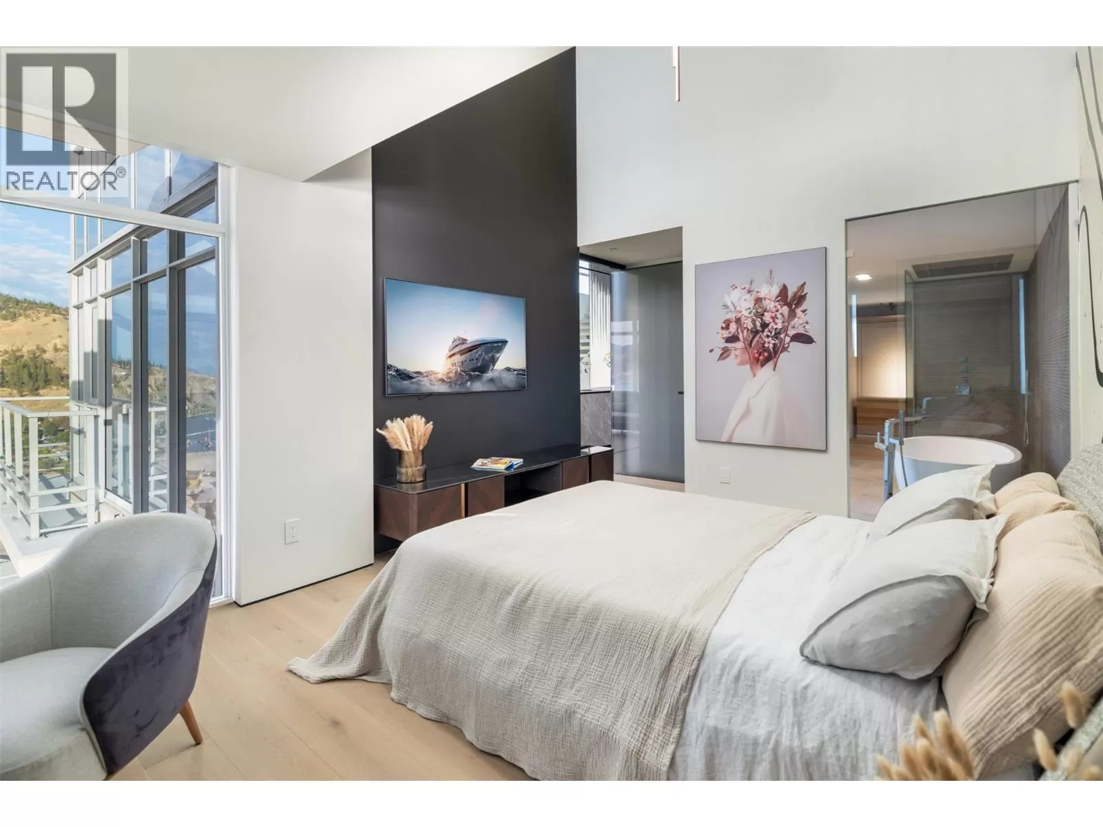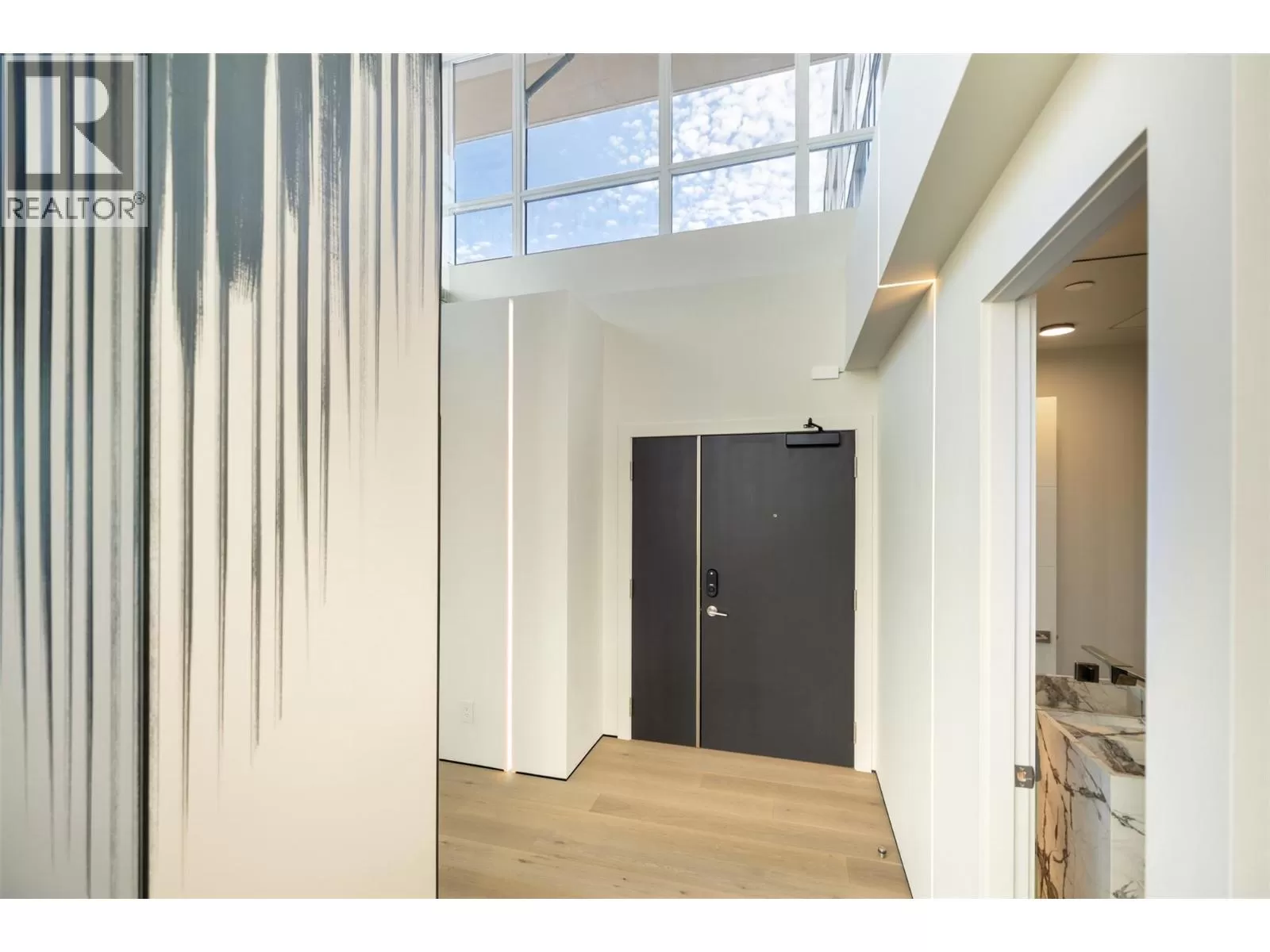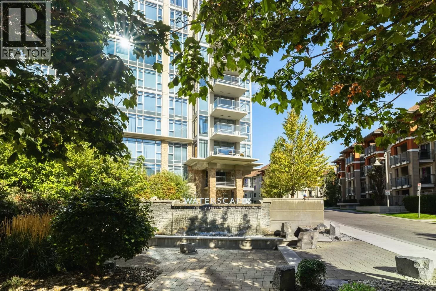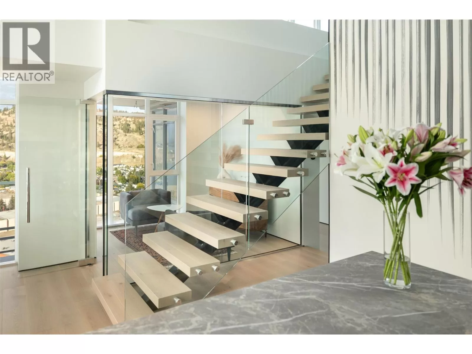 Welcome to Penthouse 1 at Waterscapes, an exceptional residence offering panoramic views of downtown Kelowna, Okanagan Lake, & the surrounding mountains. This fully renovated and redesigned penthouse is stunning & boasts a modern, sophisticated living space & an additional 1,400 sq ft rooftop terrace for outdoor living. The interior was designed with high-end finishes: hydronic in-floor heating throughout, engineered hardwood floors, porcelain countertops, Magnetic track lighting w/ moveable light components, & Integrated LED strips throughout. The open-concept layout features 17-foot ceilings, expansive windows, & a floating LED-lit staircase with glass railings leading to the rooftop patio. The Poliform kitchen is a culinary masterpiece with Gaggenau appliances (a gas cooktop, soft-touch fridge). Enjoy sensational lake views from the primary retreat. The spa-inspired en suite features Dornbracht fixtures and a spacious rain shower with a fully customized Poliform walk-in closet. One addâl bed w/ an en suite and a glass-enclosed office complete the space. SMART home technology: Ecobee thermostat, motorized solar shades, Lutron lighting. The private rooftop terrace features 3 gas lines, power outlets, a waterline, and plans for an outdoor kitchen, pergola, and fire pit. W 2 prime underground parking stalls, 3 storage lockers, and access to Waterscapesâ Cascade Lounge amenities, including a pool, gym, and sauna, this penthouse combines luxury, comfort, and community living. (id:27476)