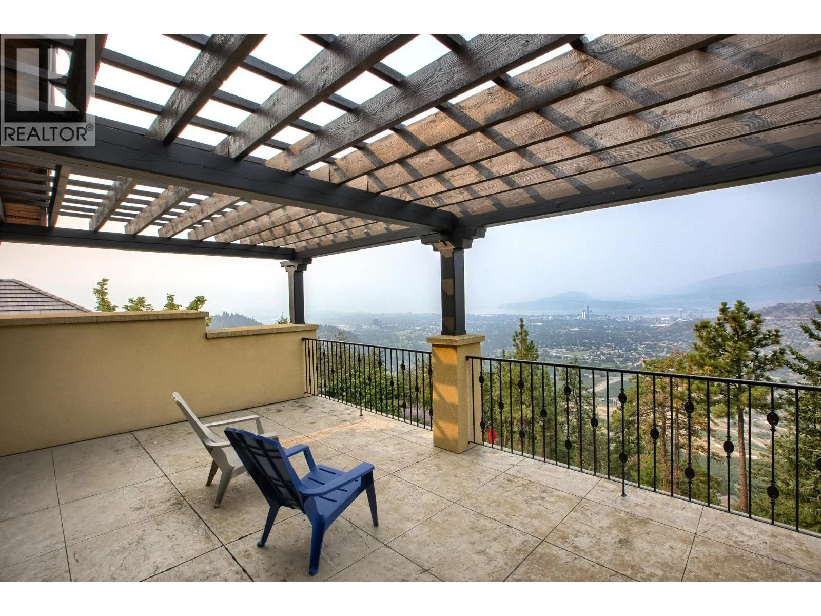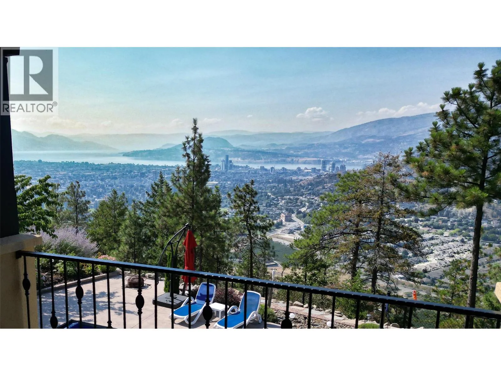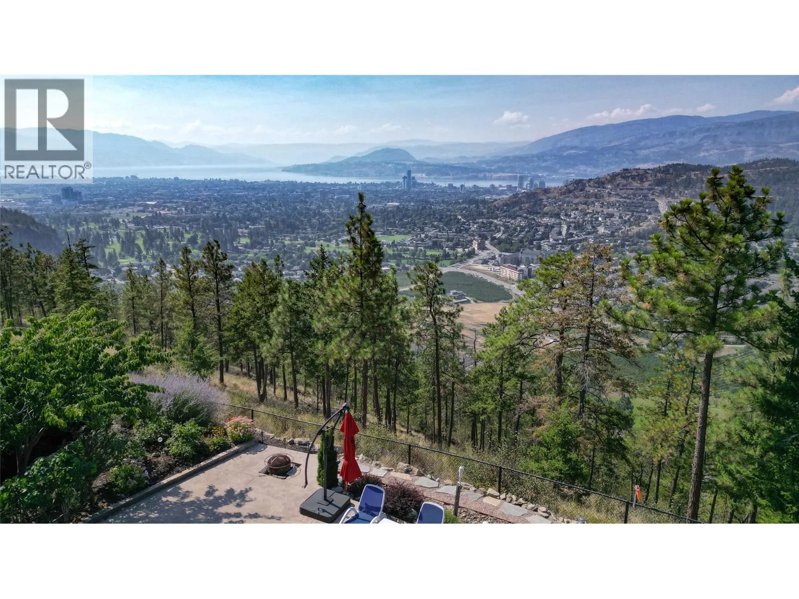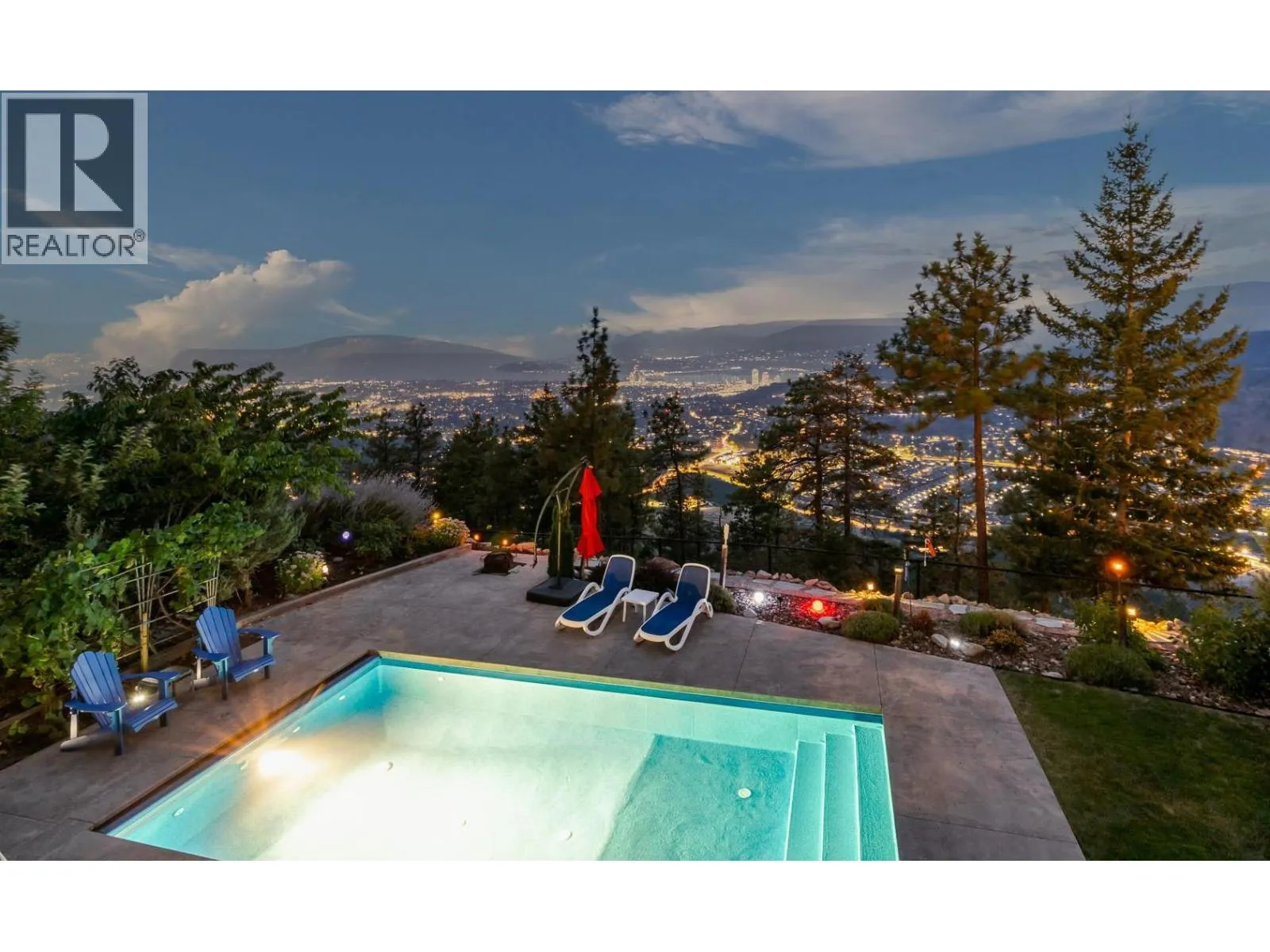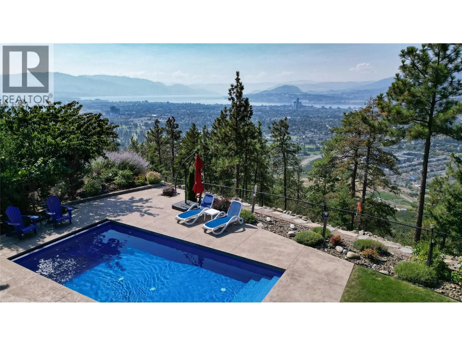 This extraordinary home on Dilworth Mountain is perfectly positioned to capture breathtaking panoramic lake, city, and mountain views. Arrive through the gated, private courtyard, where a tranquil water fountain sets the tone for the elegance within. Designed for both entertaining and everyday comfort, the home seamlessly blends indoor-outdoor living with soaring vaulted ceilings, expansive nano glass doors leading to a large deck, bringing the outdoors in. The gourmet kitchen is appointed with top-of-the-line appliances, granite counters, alder cabinetry, travertine finishes, and a pantry providing additional storage. The great room exudes warmth and relaxation with its floor-to-ceiling fireplace, exposed beams, and rich hardwood floors. Upstairs, the lavish primary suite is a sanctuary unto itself, featuring a lounge area with fireplace and French doors to a deck showing off the spectacular city and lake views. The fully equipped ensuite offers a double shower and stand-alone tub, complemented by an oversized walk-in closet, dressing room, and private laundry. A flex room off the ensuite provides space for an office/nursery and has its own private and shaded deck. The lower level boasts three bedrooms and two bathrooms, along with a cozy living room that flows directly to the pool deck. This level also includes a wet bar, fireplace, and secondary laundry. Outdoors, soak in the stunning views from any of the 5 decks/sitting areas, the sparkling pool, or by the stone fireplace. The yard is framed by lush landscaping and fruit trees, creating a private and peaceful retreat. Completing this exceptional property is a spacious double garage, offering ample room for vehicles and storage. (id:27476)