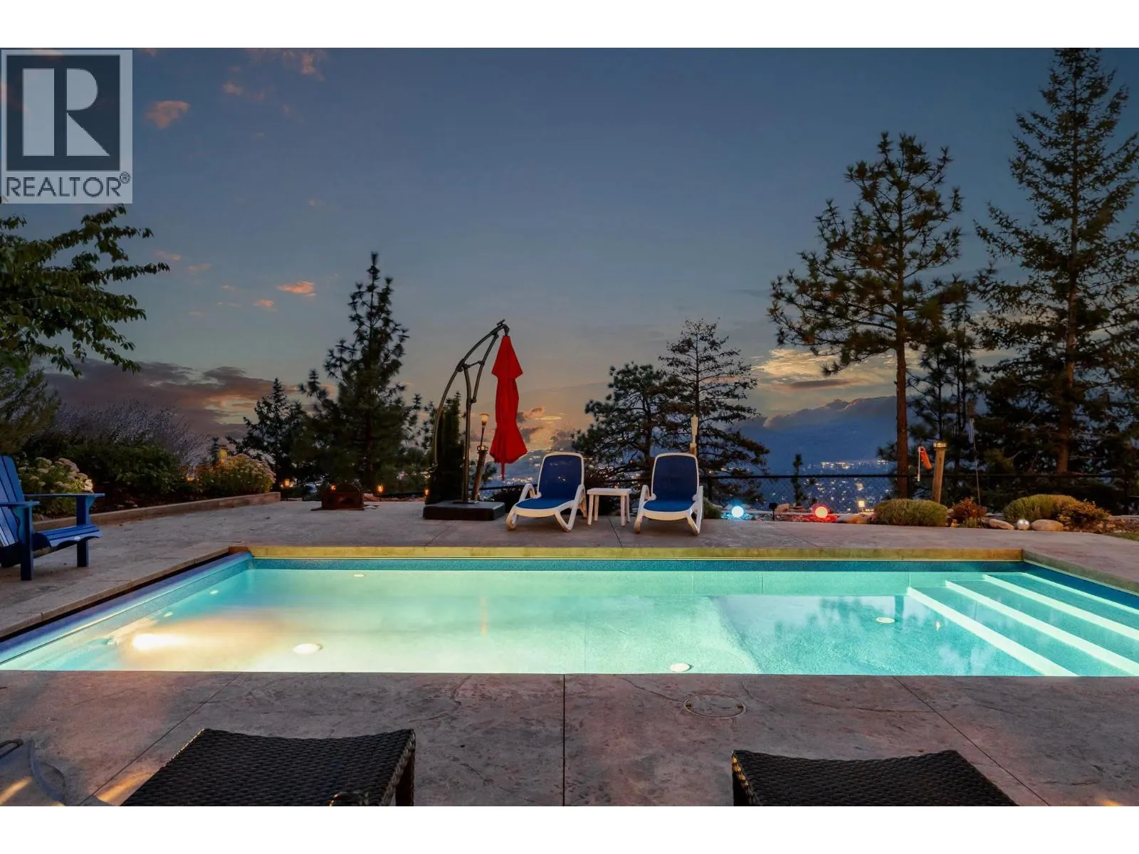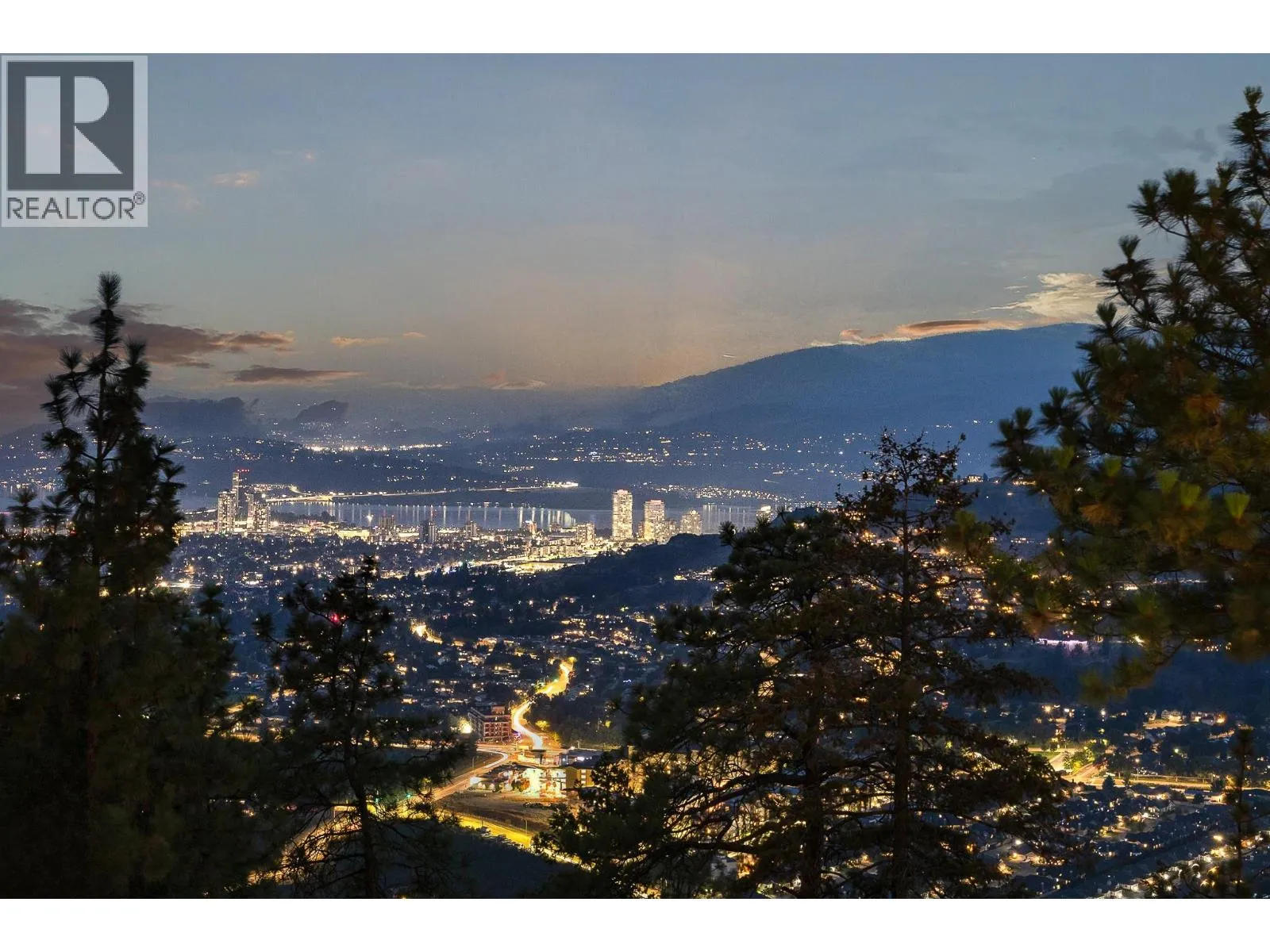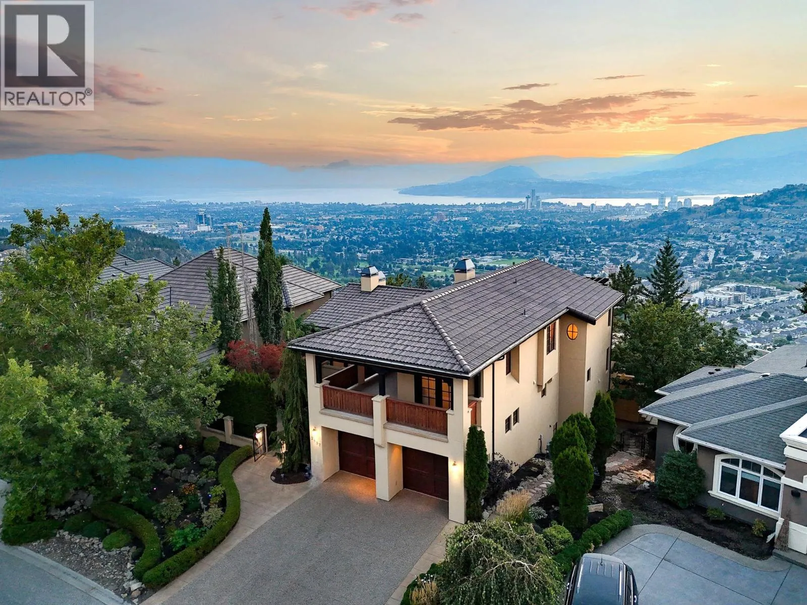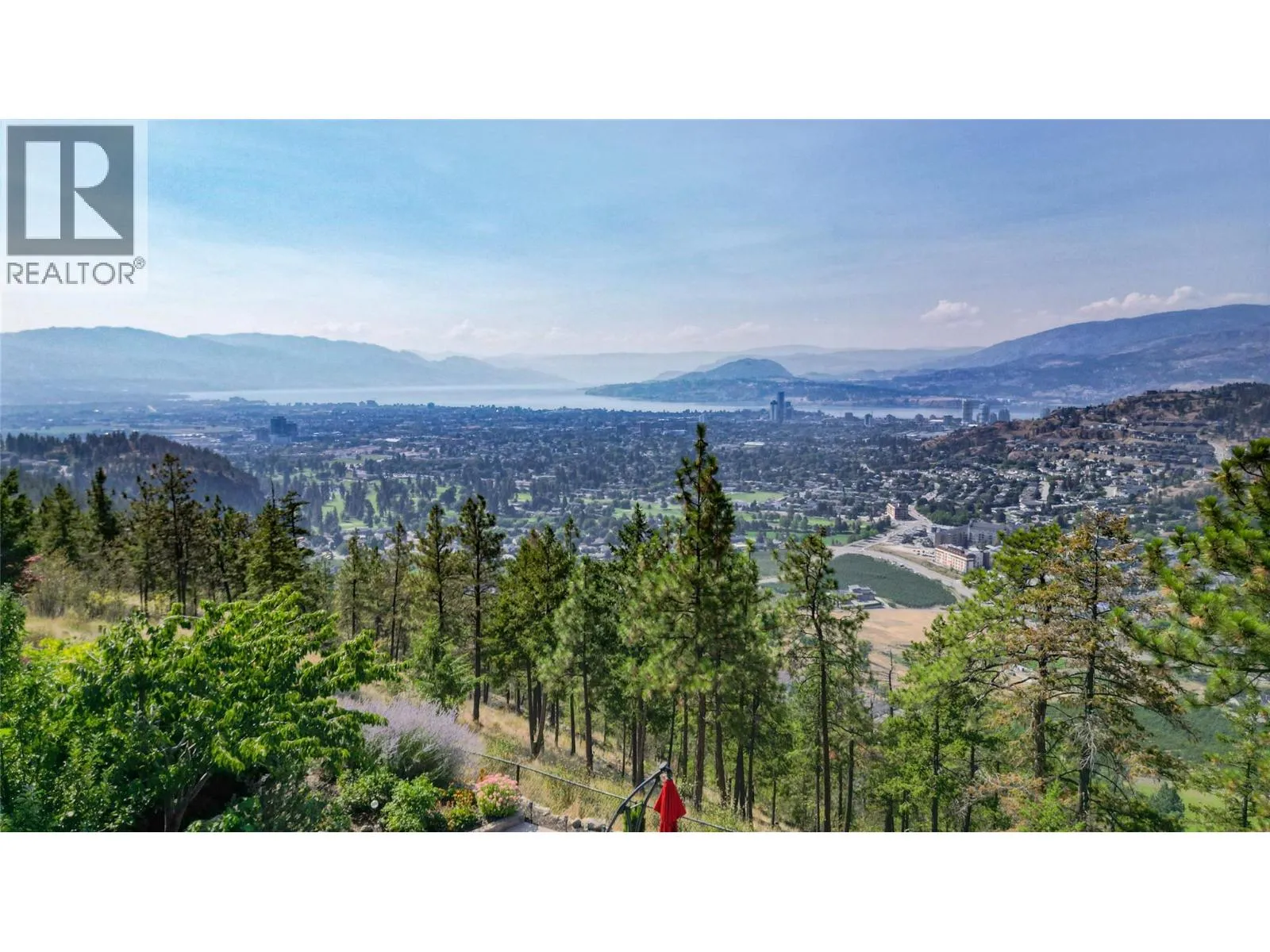 This extraordinary home on Dilworth Mountain is perfectly positioned to capture breathtaking panoramic lake, city, and mountain views. Arrive through the gated, private courtyard, where a tranquil water fountain sets the tone for the elegance within. Designed for both entertaining and everyday comfort, the home seamlessly blends indoor-outdoor living with soaring vaulted ceilings, expansive nano glass doors leading to a large deck, bringing the outdoors in. The gourmet kitchen is appointed with top-of-the-line appliances, granite counters, alder cabinetry, travertine finishes, and a pantry providing additional storage. The great room exudes warmth and relaxation with its floor-to-ceiling fireplace, exposed beams, and rich hardwood floors. Upstairs, the lavish primary suite is a sanctuary unto itself, featuring a lounge area with fireplace and French doors to a deck showing off the spectacular city and lake views. The fully equipped ensuite offers a double shower and stand-alone tub, complemented by an oversized walk-in closet, dressing room, and private laundry. A flex room off the ensuite provides space for an office/nursery and has its own private and shaded deck. The lower level boasts three bedrooms and two bathrooms, along with a cozy living room that flows directly to the pool deck. This level also includes a wet bar, fireplace, and secondary laundry. Outdoors, soak in the stunning views from any of the 5 decks/sitting areas, the sparkling pool, or by the stone fireplace. The yard is framed by lush landscaping and fruit trees, creating a private and peaceful retreat. Completing this exceptional property is a spacious double garage, offering ample room for vehicles and storage. (id:27476)