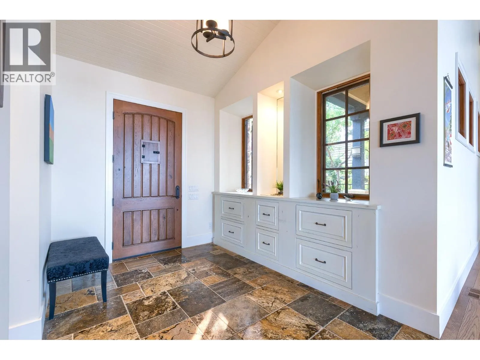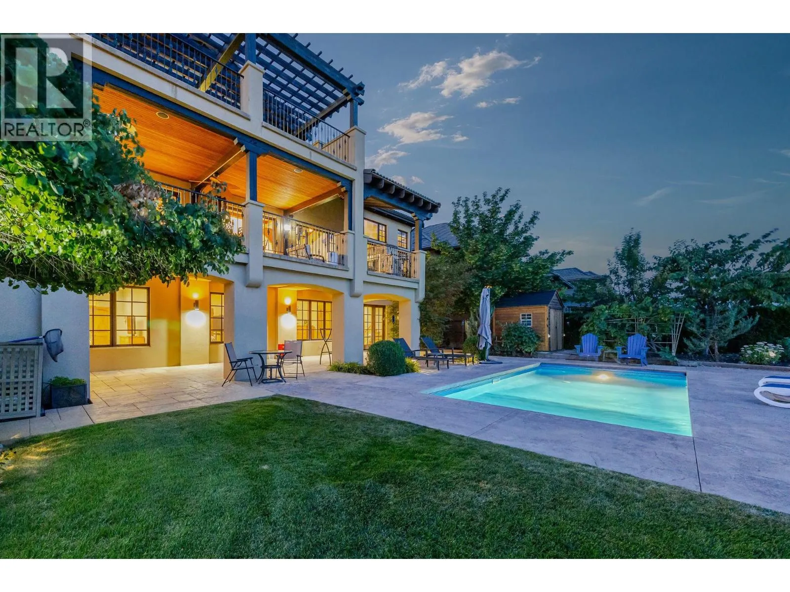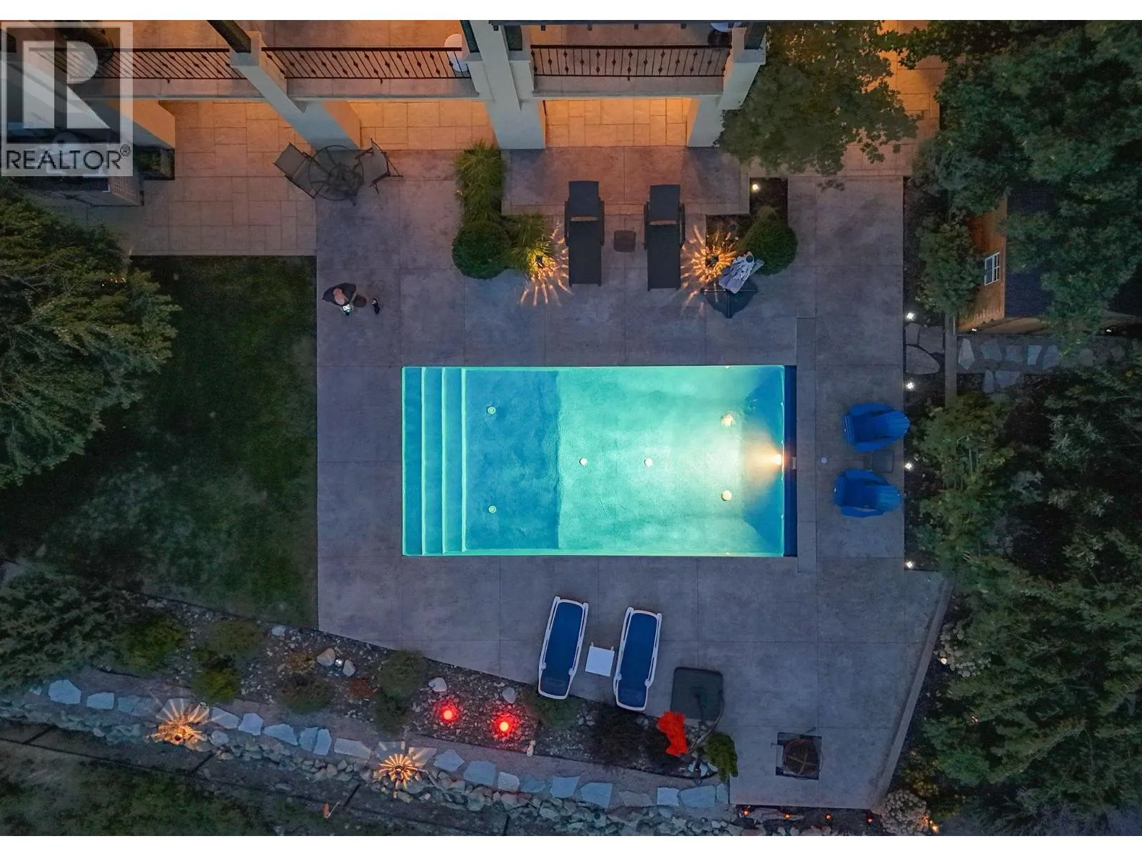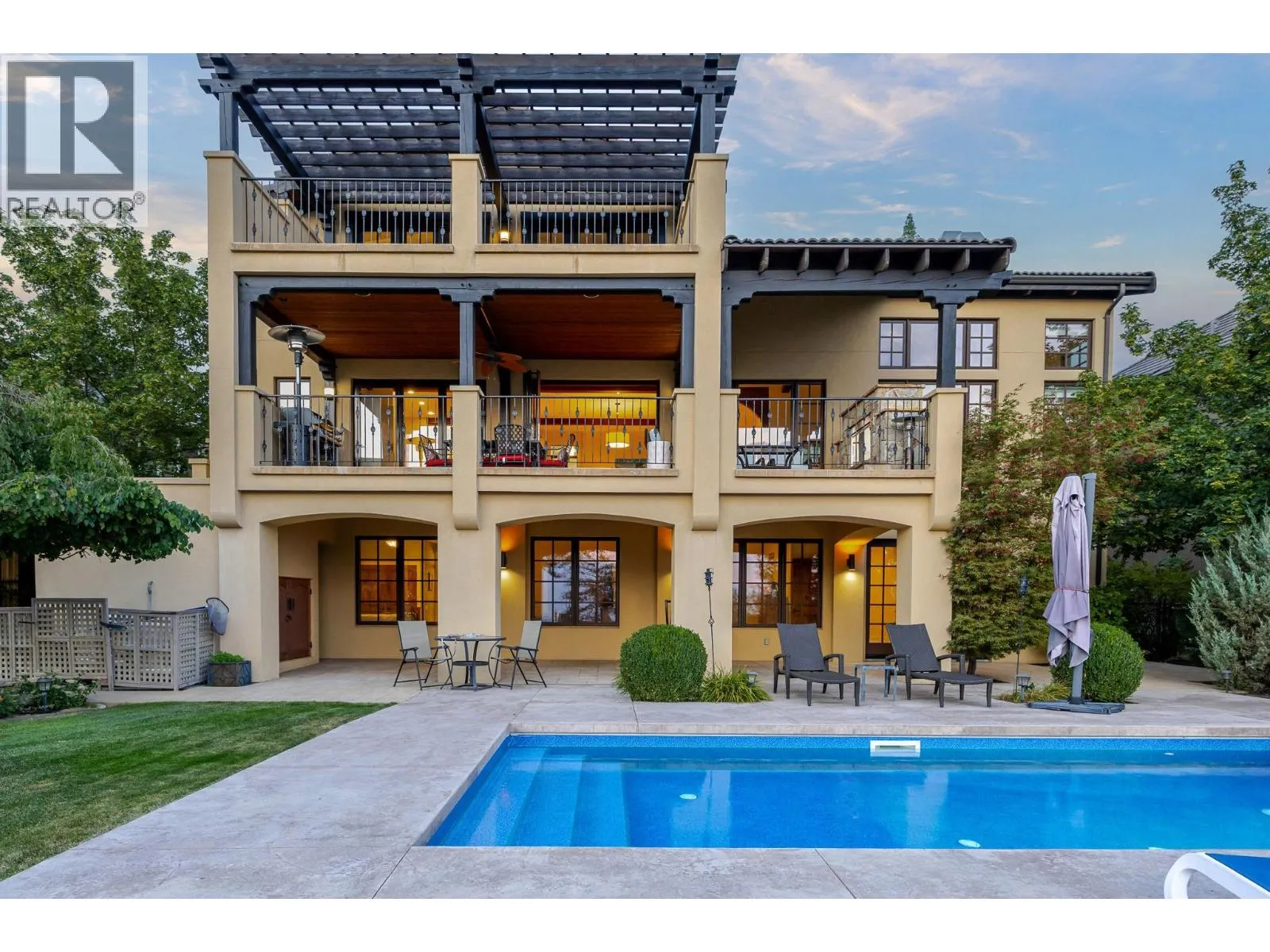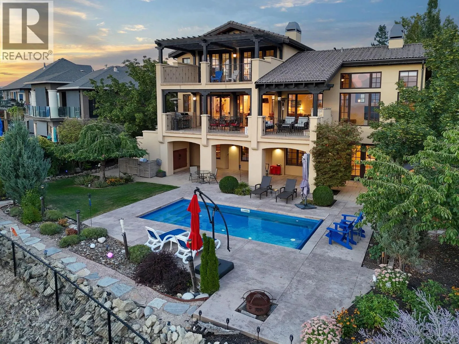 This extraordinary home on Dilworth Mountain is perfectly positioned to capture breathtaking panoramic lake, city, and mountain views. Arrive through the gated, private courtyard, where a tranquil water fountain sets the tone for the elegance within. Designed for both entertaining and everyday comfort, the home seamlessly blends indoor-outdoor living with soaring vaulted ceilings, expansive nano glass doors leading to a large deck, bringing the outdoors in. The gourmet kitchen is appointed with top-of-the-line appliances, granite counters, alder cabinetry, travertine finishes, and a pantry providing additional storage. The great room exudes warmth and relaxation with its floor-to-ceiling fireplace, exposed beams, and rich hardwood floors. Upstairs, the lavish primary suite is a sanctuary unto itself, featuring a lounge area with fireplace and French doors to a deck showing off the spectacular city and lake views. The fully equipped ensuite offers a double shower and stand-alone tub, complemented by an oversized walk-in closet, dressing room, and private laundry. A flex room off the ensuite provides space for an office/nursery and has its own private and shaded deck. The lower level boasts three bedrooms and two bathrooms, along with a cozy living room that flows directly to the pool deck. This level also includes a wet bar, fireplace, and secondary laundry. Outdoors, soak in the stunning views from any of the 5 decks/sitting areas, the sparkling pool, or by the stone fireplace. The yard is framed by lush landscaping and fruit trees, creating a private and peaceful retreat. Completing this exceptional property is a spacious double garage, offering ample room for vehicles and storage. (id:27476)