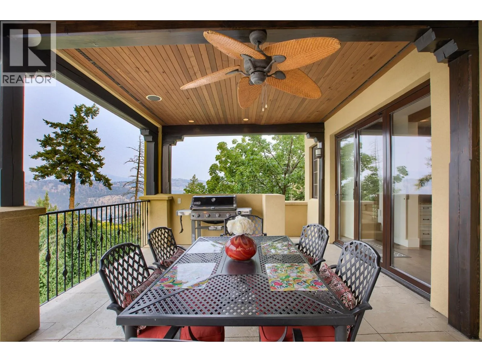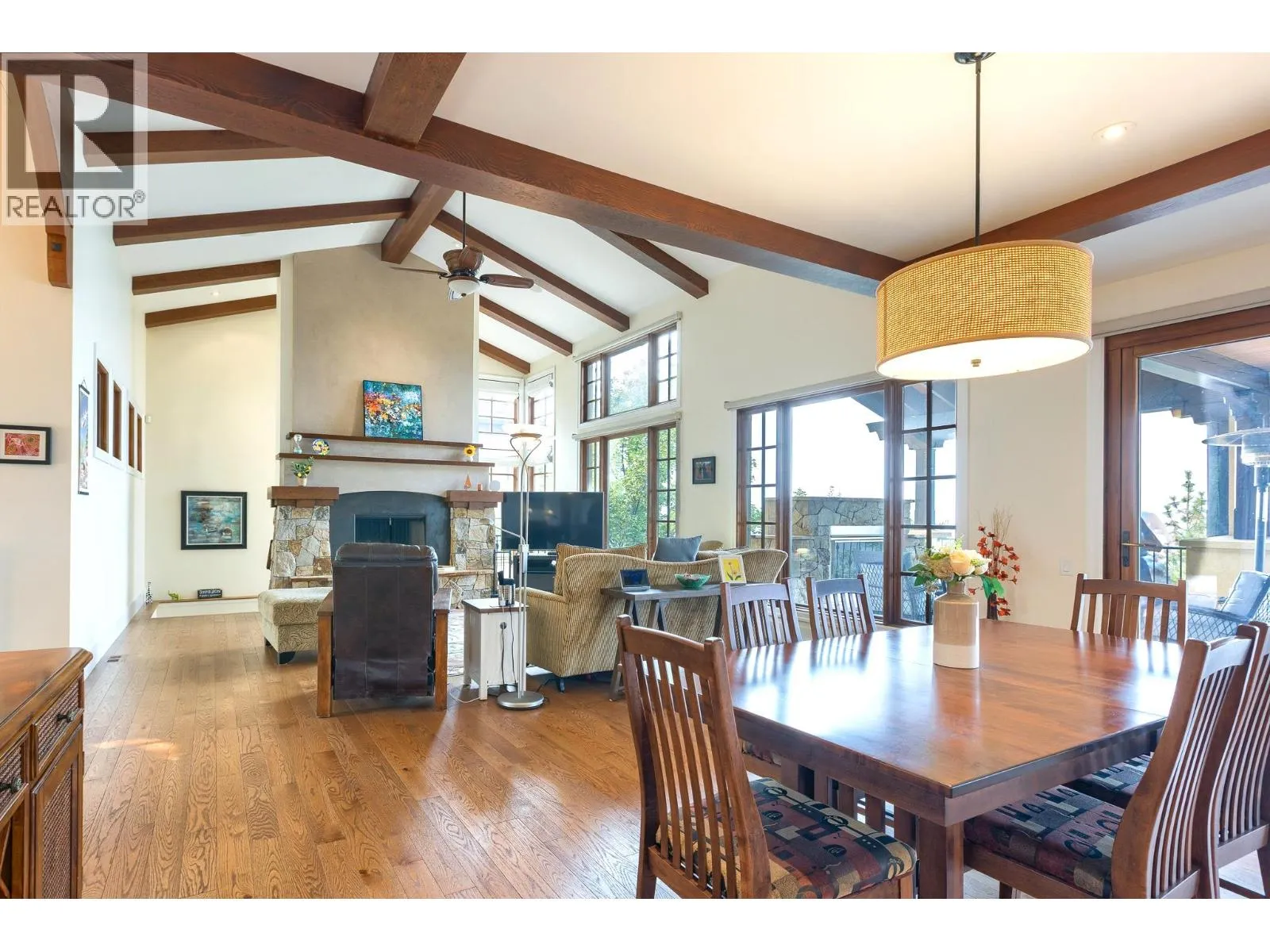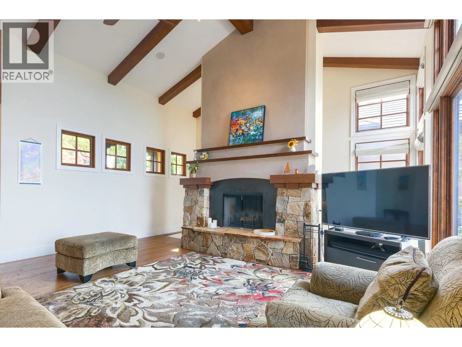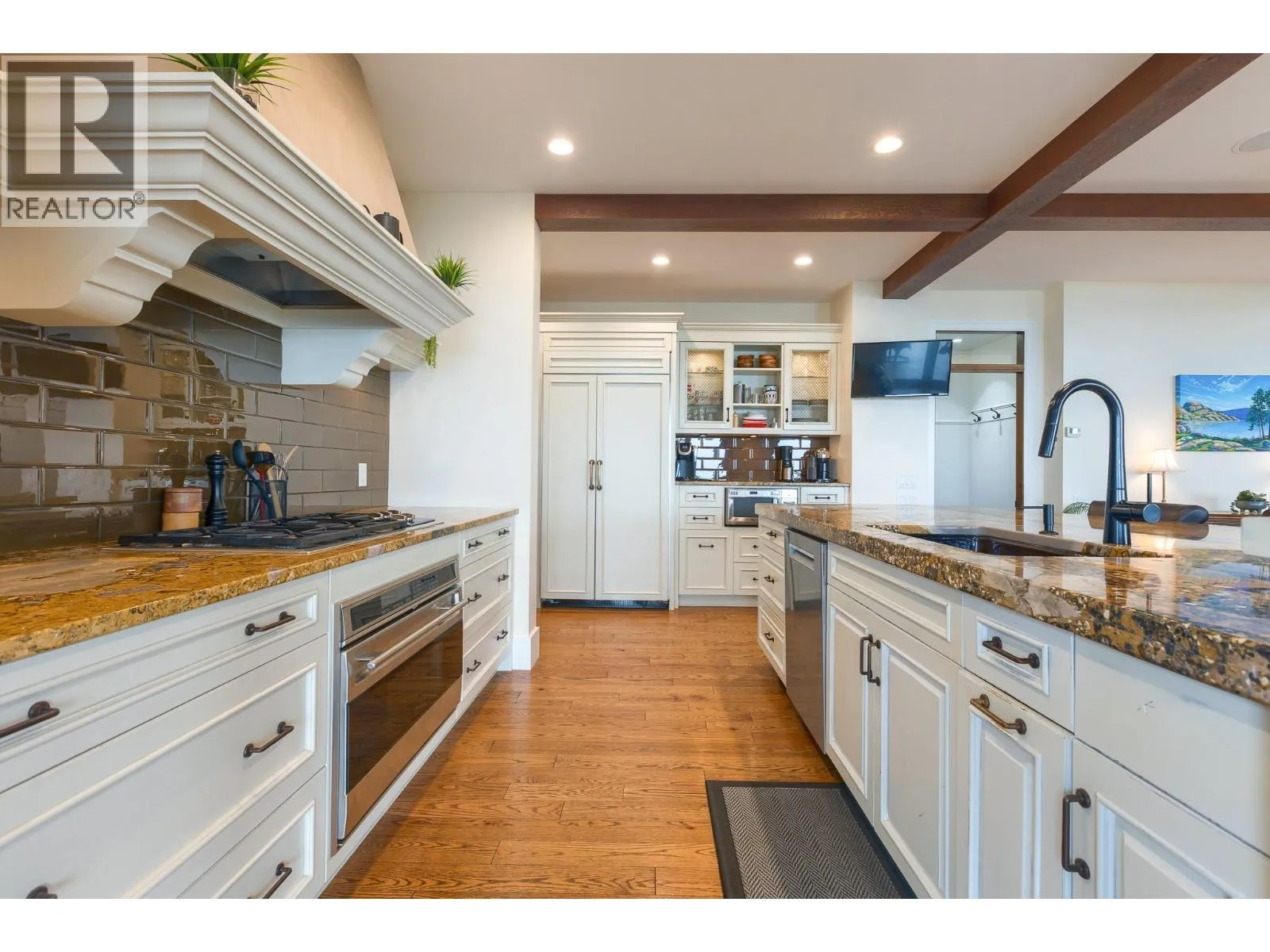 This extraordinary home on Dilworth Mountain is perfectly positioned to capture breathtaking panoramic lake, city, and mountain views. Arrive through the gated, private courtyard, where a tranquil water fountain sets the tone for the elegance within. Designed for both entertaining and everyday comfort, the home seamlessly blends indoor-outdoor living with soaring vaulted ceilings, expansive nano glass doors leading to a large deck, bringing the outdoors in. The gourmet kitchen is appointed with top-of-the-line appliances, granite counters, alder cabinetry, travertine finishes, and a pantry providing additional storage. The great room exudes warmth and relaxation with its floor-to-ceiling fireplace, exposed beams, and rich hardwood floors. Upstairs, the lavish primary suite is a sanctuary unto itself, featuring a lounge area with fireplace and French doors to a deck showing off the spectacular city and lake views. The fully equipped ensuite offers a double shower and stand-alone tub, complemented by an oversized walk-in closet, dressing room, and private laundry. A flex room off the ensuite provides space for an office/nursery and has its own private and shaded deck. The lower level boasts three bedrooms and two bathrooms, along with a cozy living room that flows directly to the pool deck. This level also includes a wet bar, fireplace, and secondary laundry. Outdoors, soak in the stunning views from any of the 5 decks/sitting areas, the sparkling pool, or by the stone fireplace. The yard is framed by lush landscaping and fruit trees, creating a private and peaceful retreat. Completing this exceptional property is a spacious double garage, offering ample room for vehicles and storage. (id:27476)