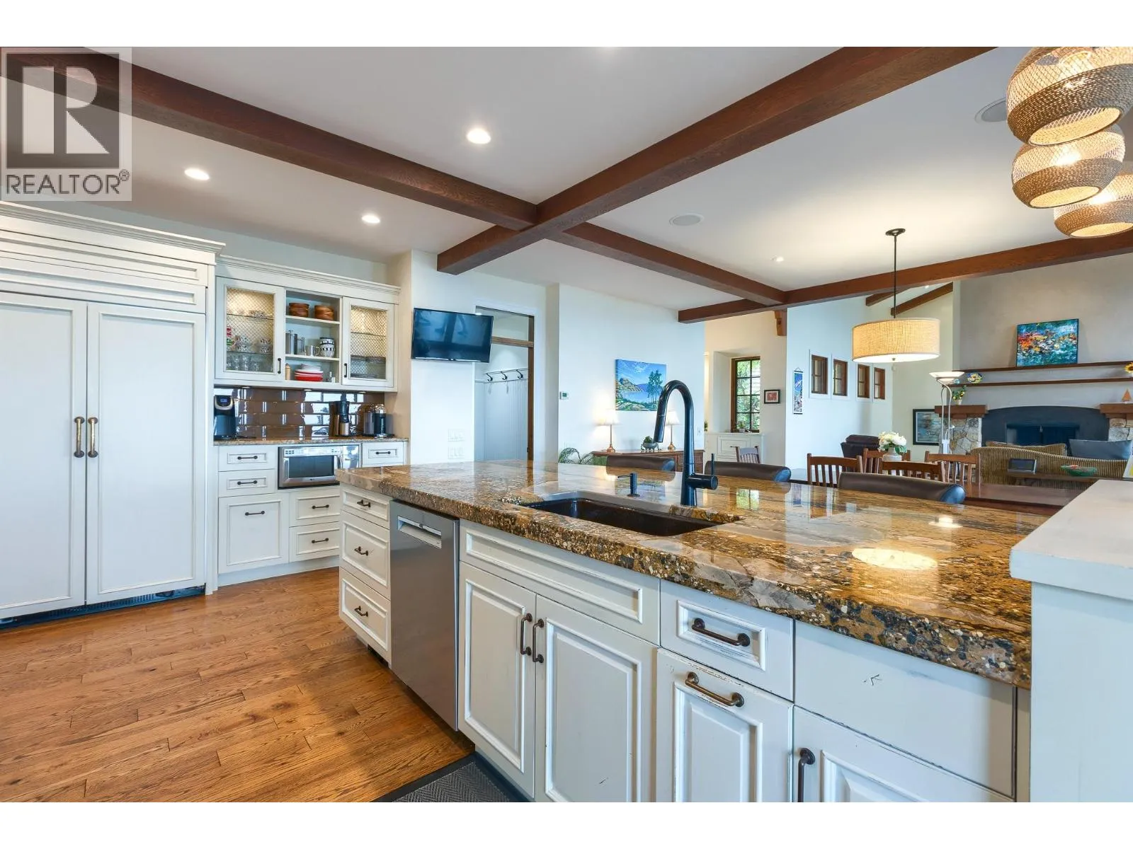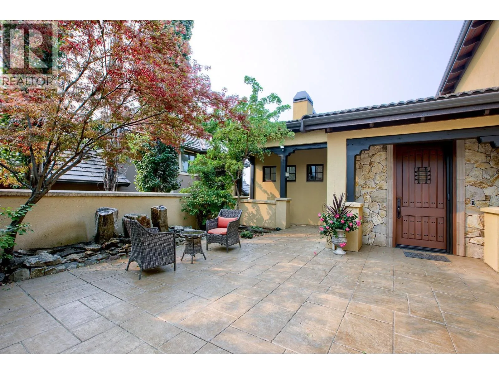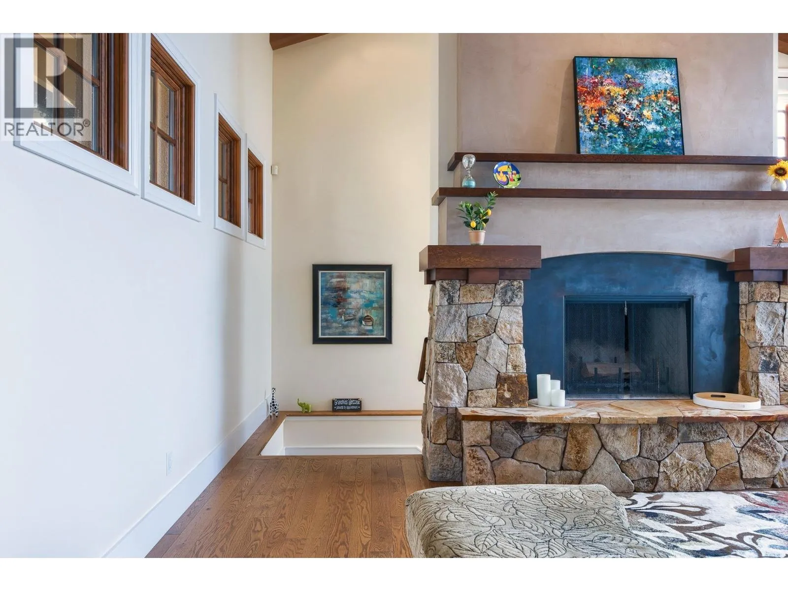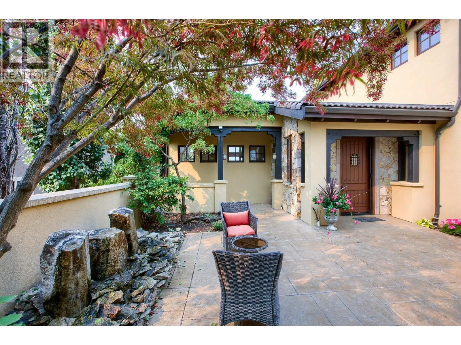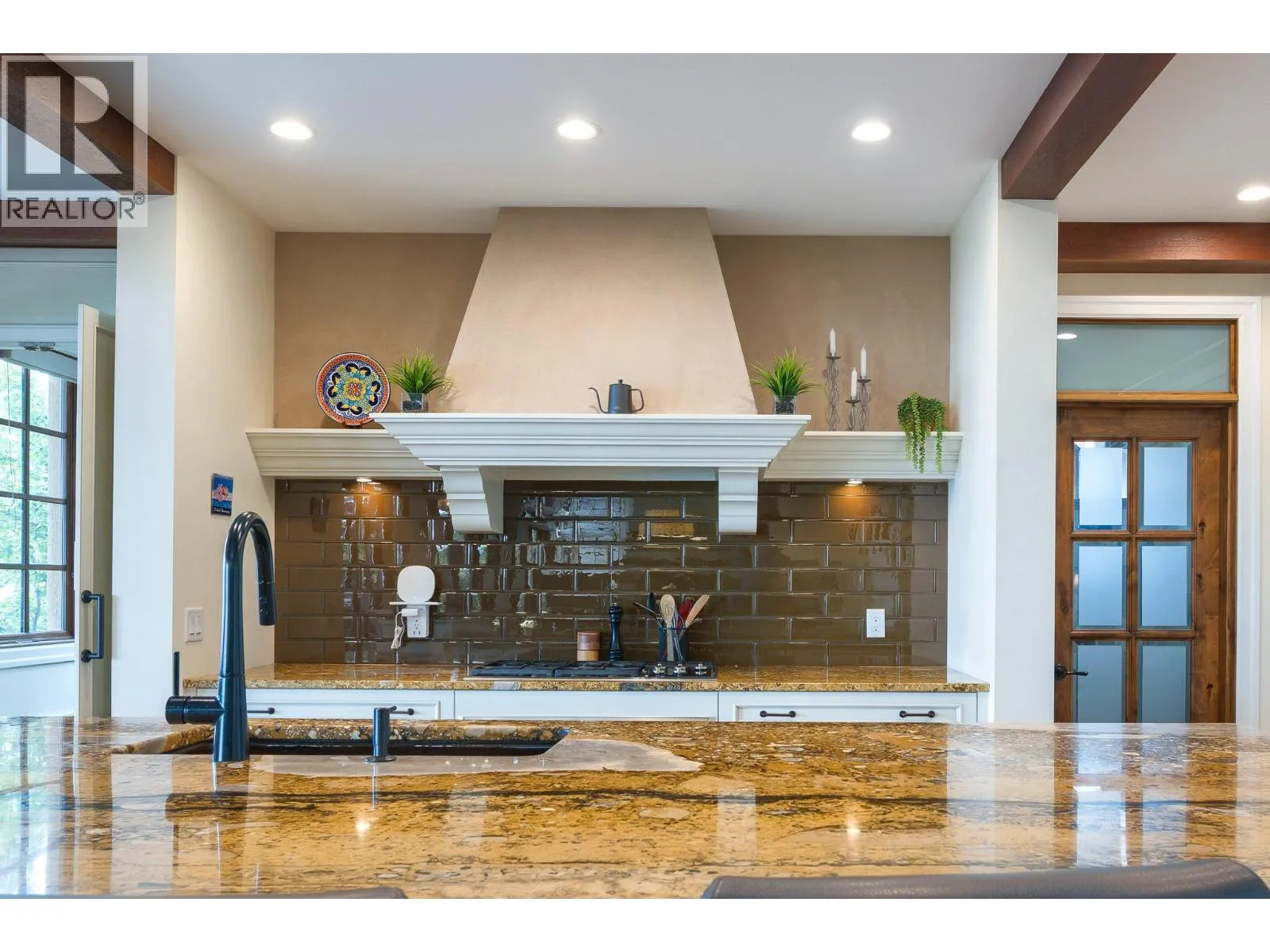 This extraordinary home on Dilworth Mountain is perfectly positioned to capture breathtaking panoramic lake, city, and mountain views. Arrive through the gated, private courtyard, where a tranquil water fountain sets the tone for the elegance within. Designed for both entertaining and everyday comfort, the home seamlessly blends indoor-outdoor living with soaring vaulted ceilings, expansive nano glass doors leading to a large deck, bringing the outdoors in. The gourmet kitchen is appointed with top-of-the-line appliances, granite counters, alder cabinetry, travertine finishes, and a pantry providing additional storage. The great room exudes warmth and relaxation with its floor-to-ceiling fireplace, exposed beams, and rich hardwood floors. Upstairs, the lavish primary suite is a sanctuary unto itself, featuring a lounge area with fireplace and French doors to a deck showing off the spectacular city and lake views. The fully equipped ensuite offers a double shower and stand-alone tub, complemented by an oversized walk-in closet, dressing room, and private laundry. A flex room off the ensuite provides space for an office/nursery and has its own private and shaded deck. The lower level boasts three bedrooms and two bathrooms, along with a cozy living room that flows directly to the pool deck. This level also includes a wet bar, fireplace, and secondary laundry. Outdoors, soak in the stunning views from any of the 5 decks/sitting areas, the sparkling pool, or by the stone fireplace. The yard is framed by lush landscaping and fruit trees, creating a private and peaceful retreat. Completing this exceptional property is a spacious double garage, offering ample room for vehicles and storage. (id:27476)