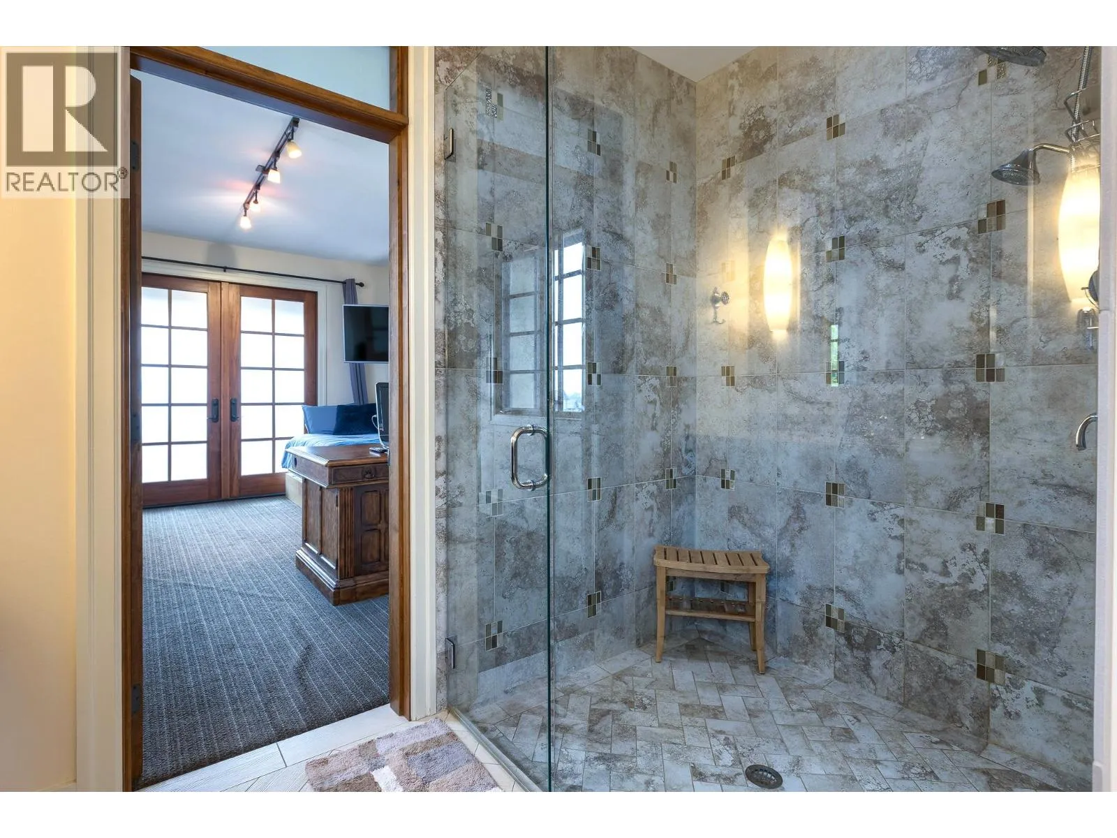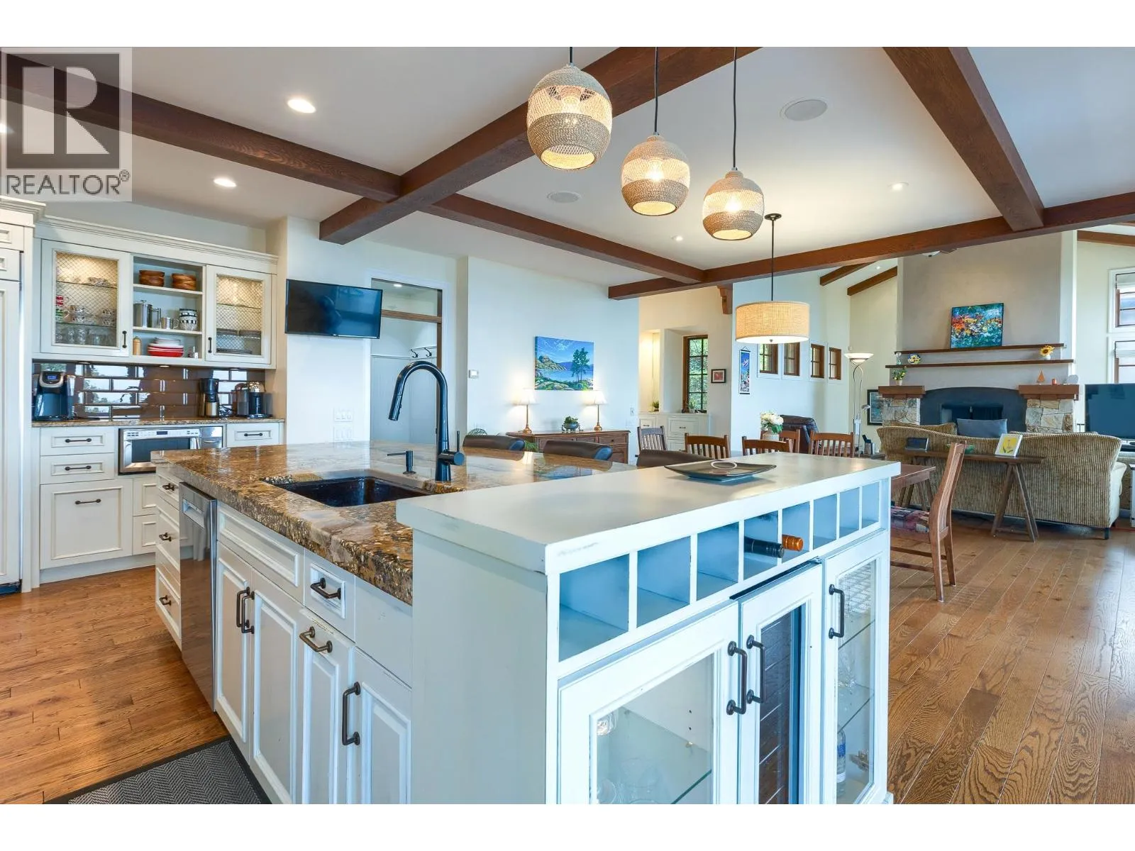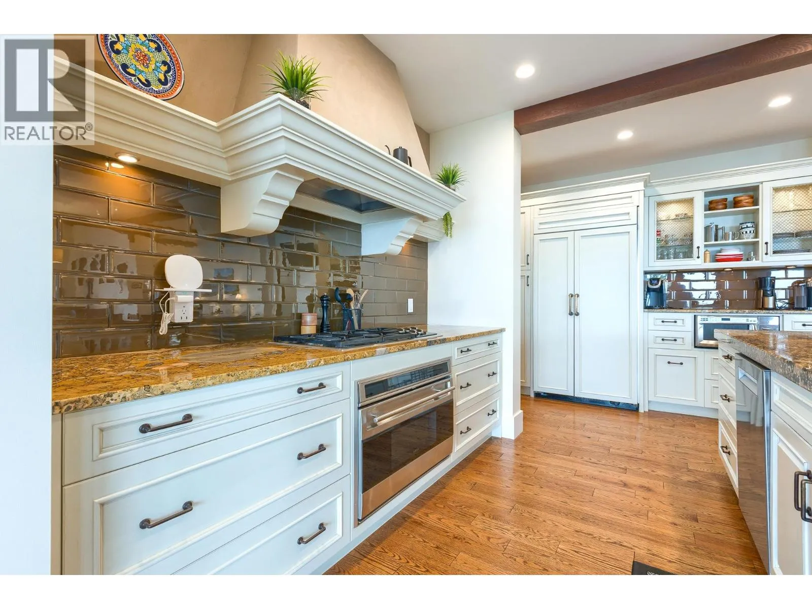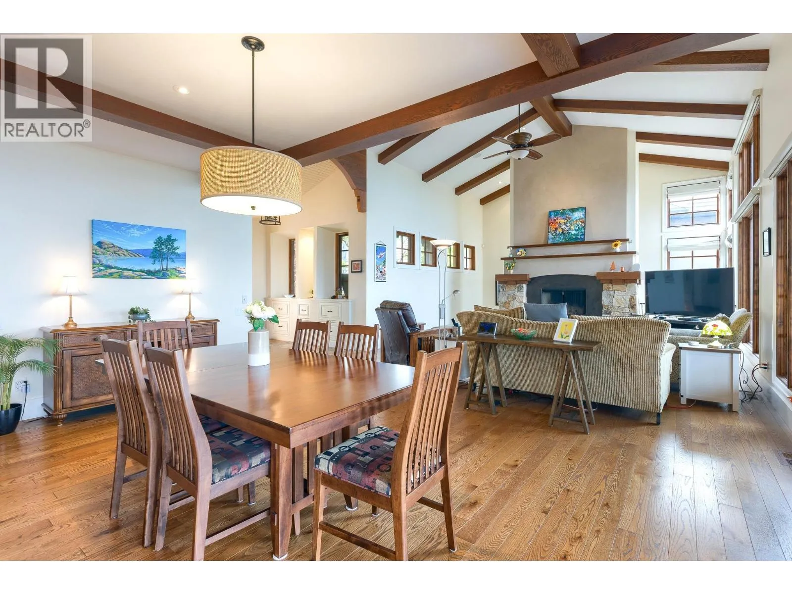 This extraordinary home on Dilworth Mountain is perfectly positioned to capture breathtaking panoramic lake, city, and mountain views. Arrive through the gated, private courtyard, where a tranquil water fountain sets the tone for the elegance within. Designed for both entertaining and everyday comfort, the home seamlessly blends indoor-outdoor living with soaring vaulted ceilings, expansive nano glass doors leading to a large deck, bringing the outdoors in. The gourmet kitchen is appointed with top-of-the-line appliances, granite counters, alder cabinetry, travertine finishes, and a pantry providing additional storage. The great room exudes warmth and relaxation with its floor-to-ceiling fireplace, exposed beams, and rich hardwood floors. Upstairs, the lavish primary suite is a sanctuary unto itself, featuring a lounge area with fireplace and French doors to a deck showing off the spectacular city and lake views. The fully equipped ensuite offers a double shower and stand-alone tub, complemented by an oversized walk-in closet, dressing room, and private laundry. A flex room off the ensuite provides space for an office/nursery and has its own private and shaded deck. The lower level boasts three bedrooms and two bathrooms, along with a cozy living room that flows directly to the pool deck. This level also includes a wet bar, fireplace, and secondary laundry. Outdoors, soak in the stunning views from any of the 5 decks/sitting areas, the sparkling pool, or by the stone fireplace. The yard is framed by lush landscaping and fruit trees, creating a private and peaceful retreat. Completing this exceptional property is a spacious double garage, offering ample room for vehicles and storage. (id:27476)