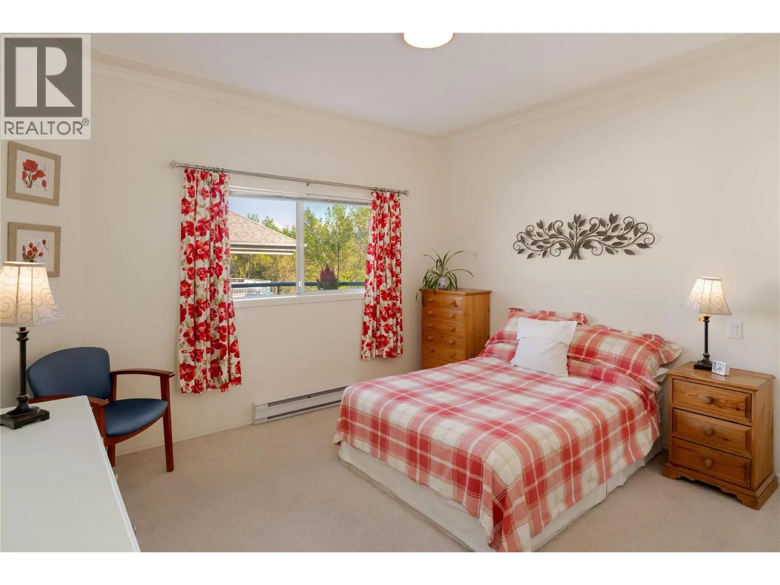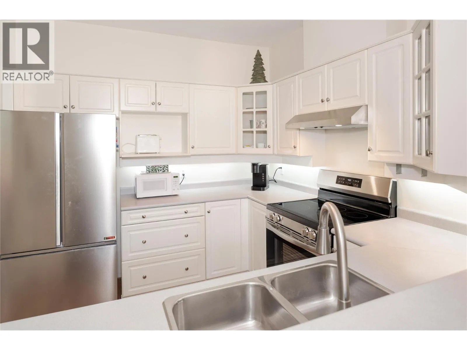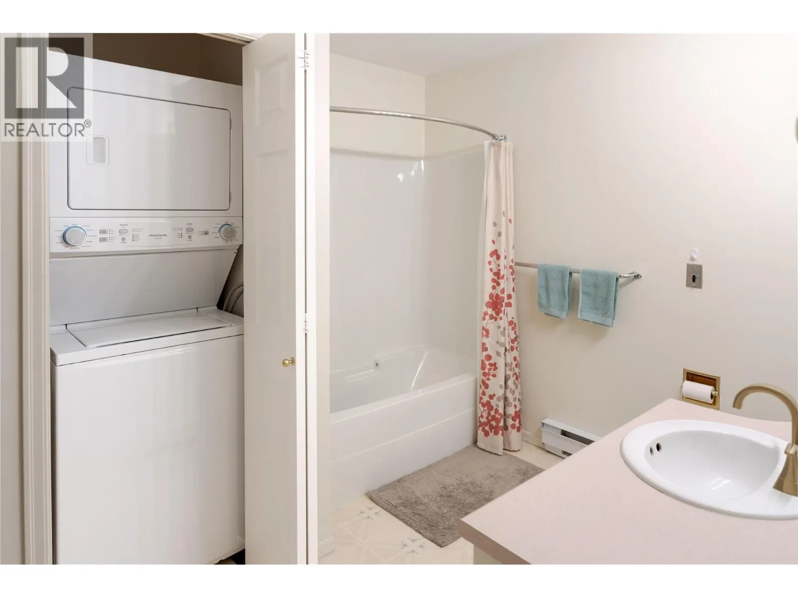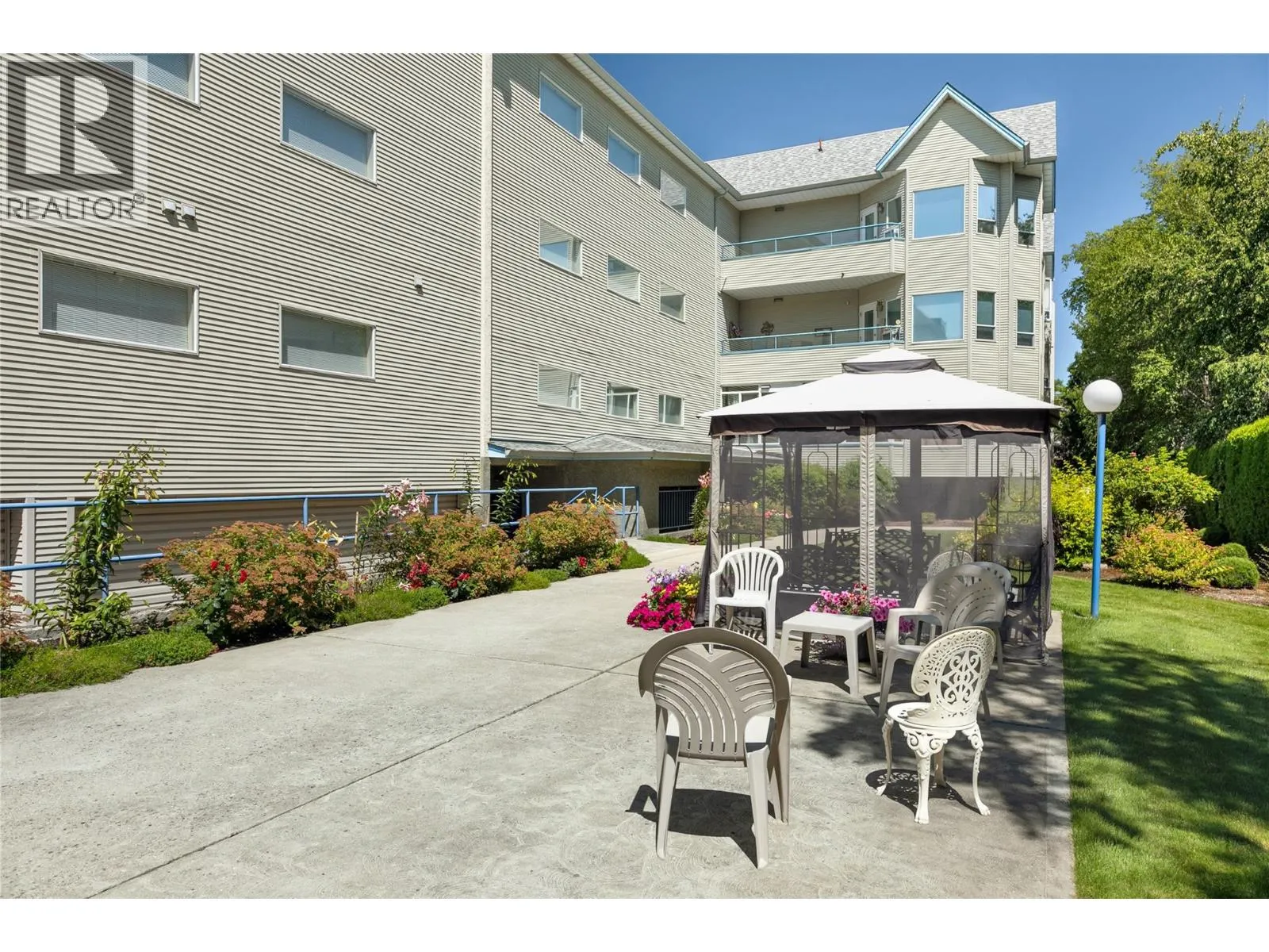 Bright, updated & privateâthis top-floor 1-bedroom residence is one of the Best in Hawthorne Park. With vaulted ceilings and desirable northeast exposure, the home is filled with morning sun while remaining cool and quiet throughout the day. The interior has been refreshed with newer laminate flooring, fresh paint, a stacker washer/dryer, and a brand-new stainless steel appliance package. The kitchen opens seamlessly to the dining & living spaces, where oversized windows and natural light enhance the inviting atmosphere. Step outside to a private patio with new Duradek finishingâideal for morning coffee or relaxing in peace without road noise. This friendly community offers an exceptional lifestyle with a library, lounge, games room, outdoor garden patios & walking paths, all while being just a 5-minute walk to groceries, banks, doctors & shops. A rare opportunity to enjoy comfort, convenience & connection in one of Kelownaâs most walkable neighbourhoods. (id:27476)