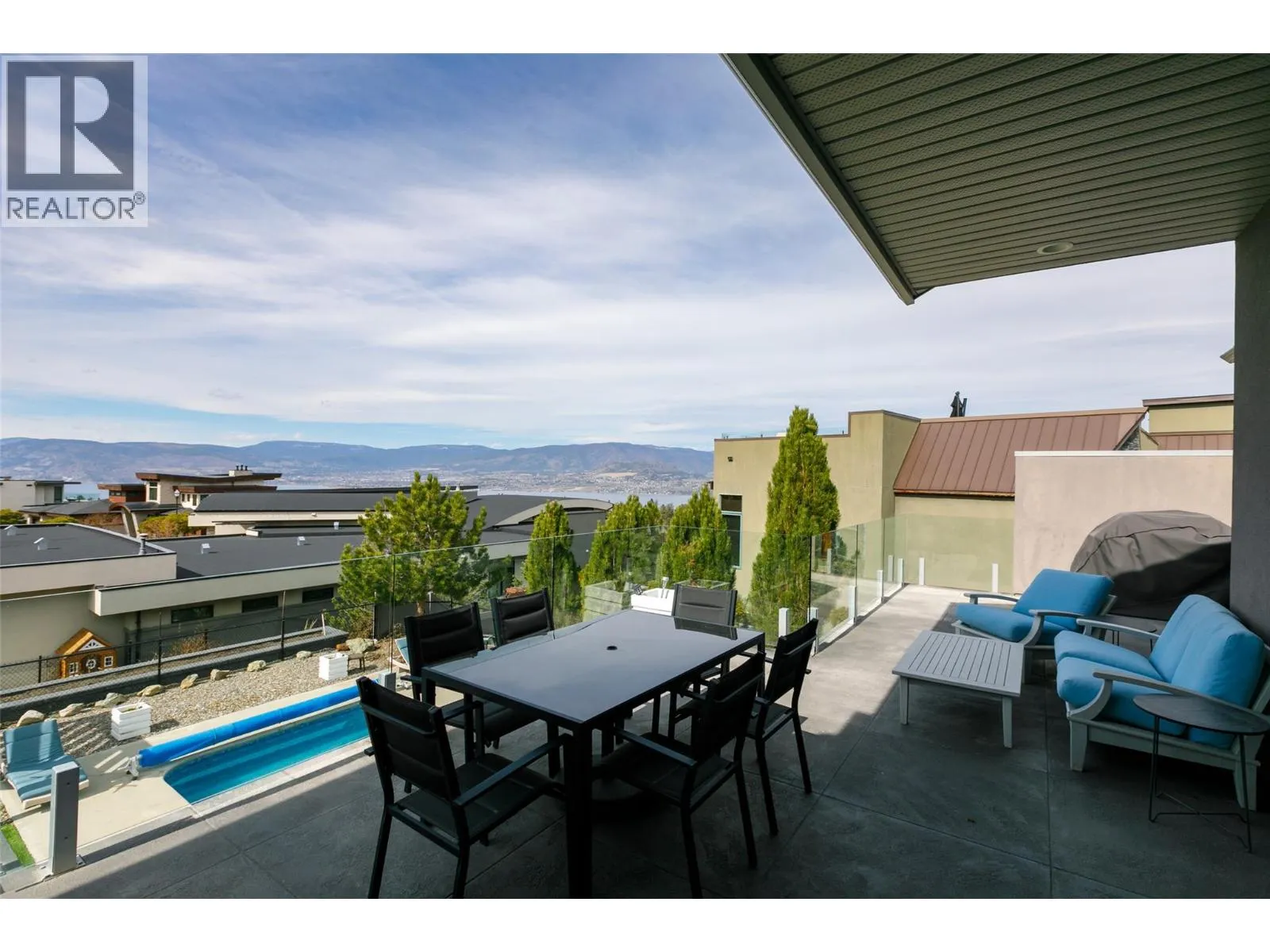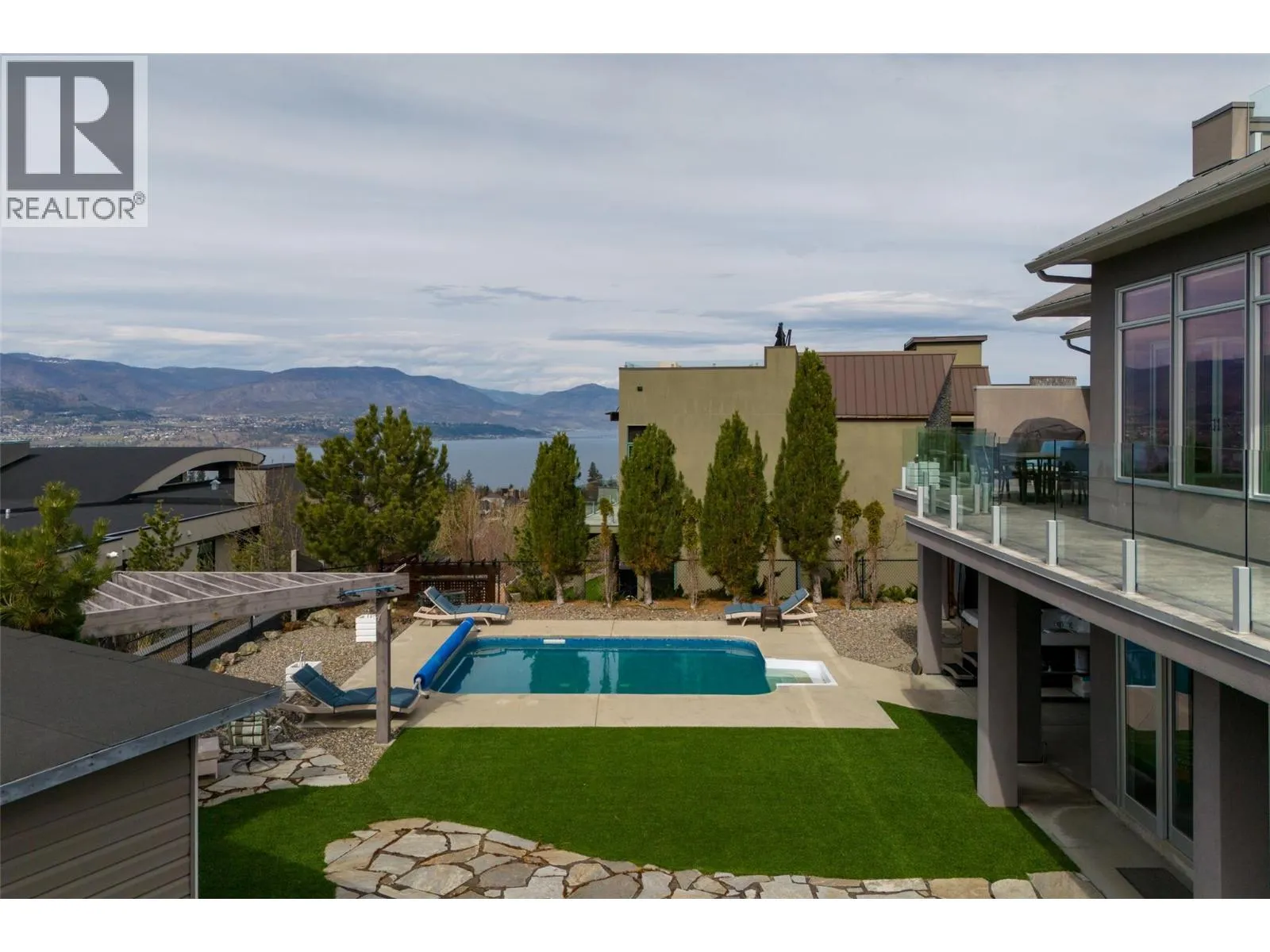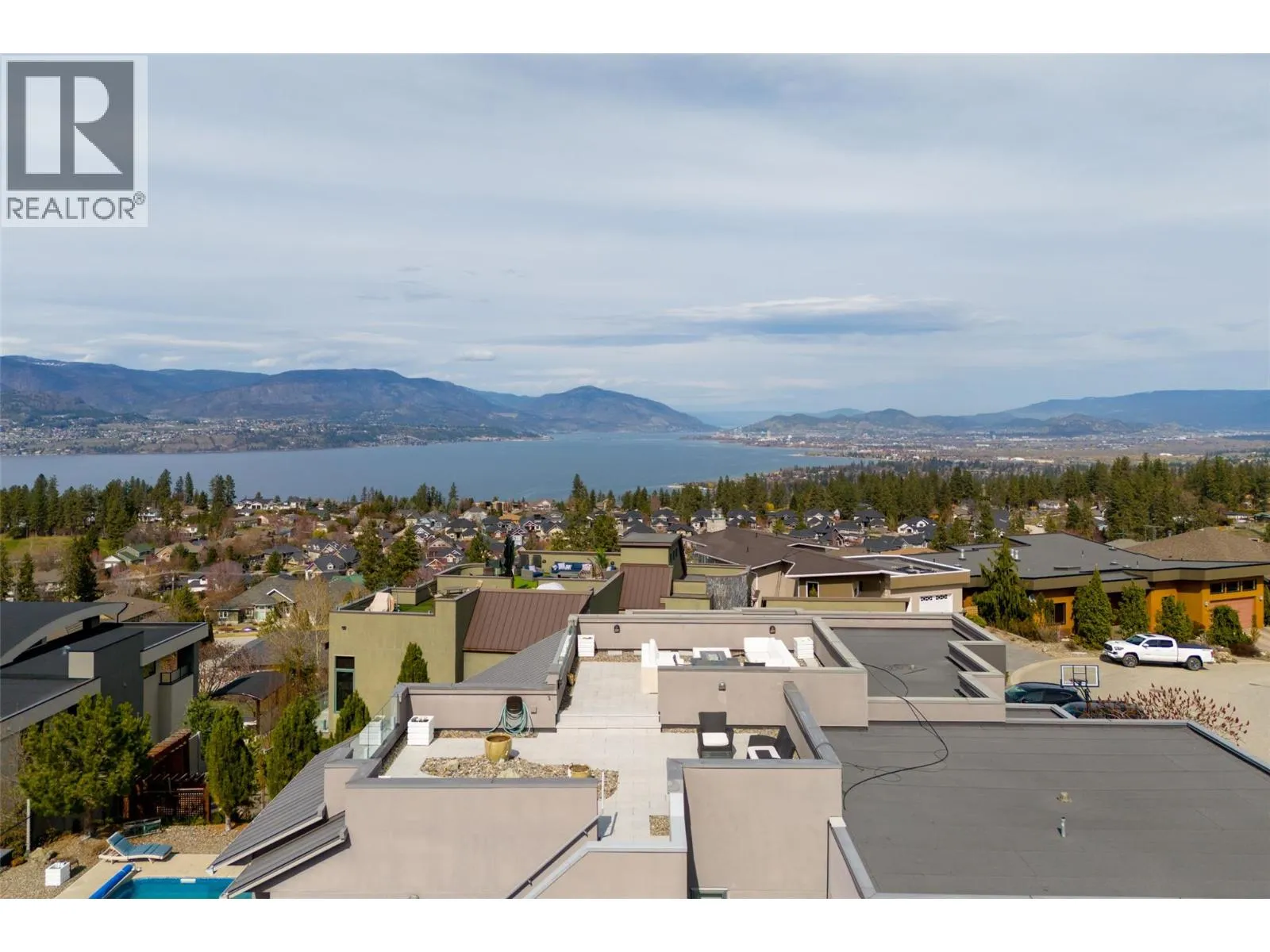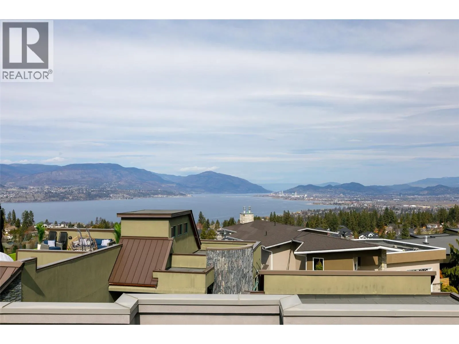 Stunning lake & mountain views, walls of windows, and crisp modern architecture come together in this exceptional Upper Mission walkout with rooftop patio overlooking your pool, the lake and city beyond! Impeccable finishings, open-concept living, and a quiet, upscale location make this home ideal for both entertaining and relaxing. The gourmet island kitchen flows seamlessly to a wraparound sundeck with panoramic southerly views overlooking the pool and lake. The main floor features a front office and a luxurious principal suite with spa-inspired ensuite. Downstairs offers spacious bedrooms, a large games/family room, media room, wine room, and steam shower bathâall with direct access to the sun-drenched pool & hot tub area and has suite potential. A detached backyard garden cottage shed provides potential for a summer guesthouse experience or utilize as you see fit! Additional features include: epoxied heated garage with 14â ceilings & built-in storage (boat-ready), 10â & 11â ceilings, granite & glass finishes throughout, xeriscaped landscaping, walk-through pantry, and a rare 1,000 sq ft rooftop patio with breathtaking lake & mountain viewsâperfect for Okanagan evenings. Located in the prestigious Kettle Valley neighborhood, close to parks, schools, and the new Ponds shopping district. Move-in ready to enjoy the best of the Okanagan lifestyle. (id:27476)