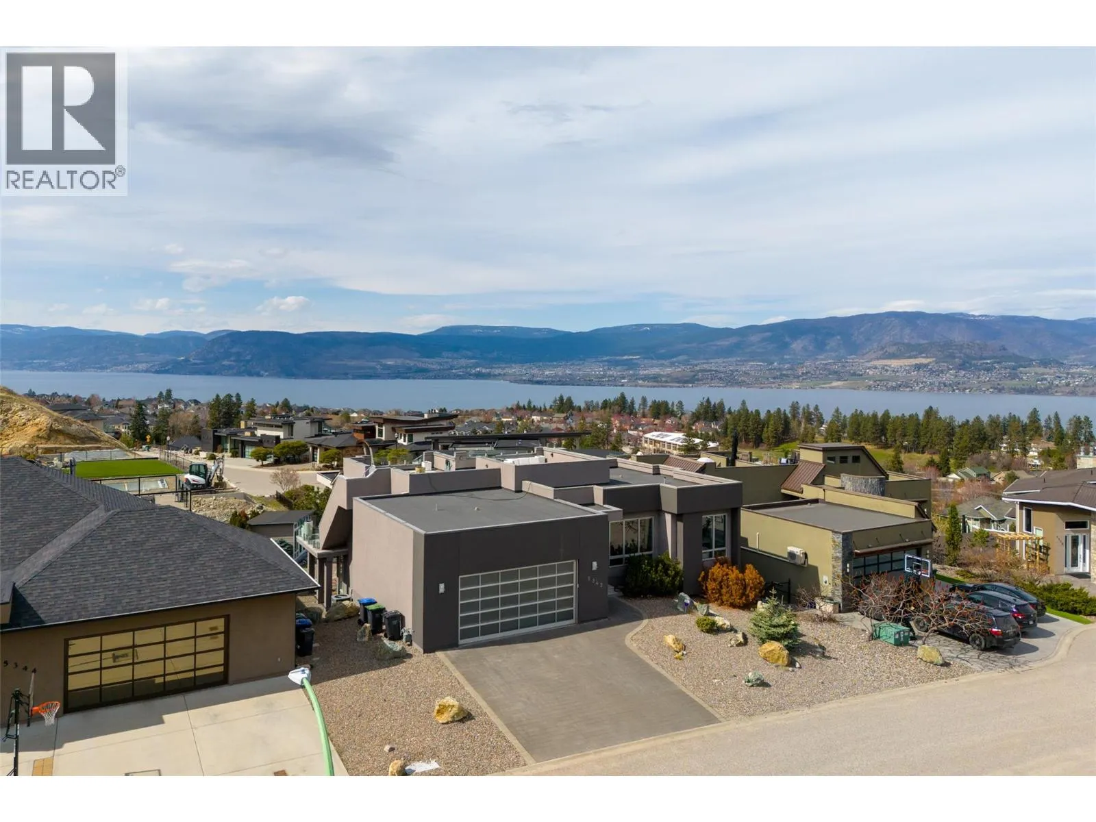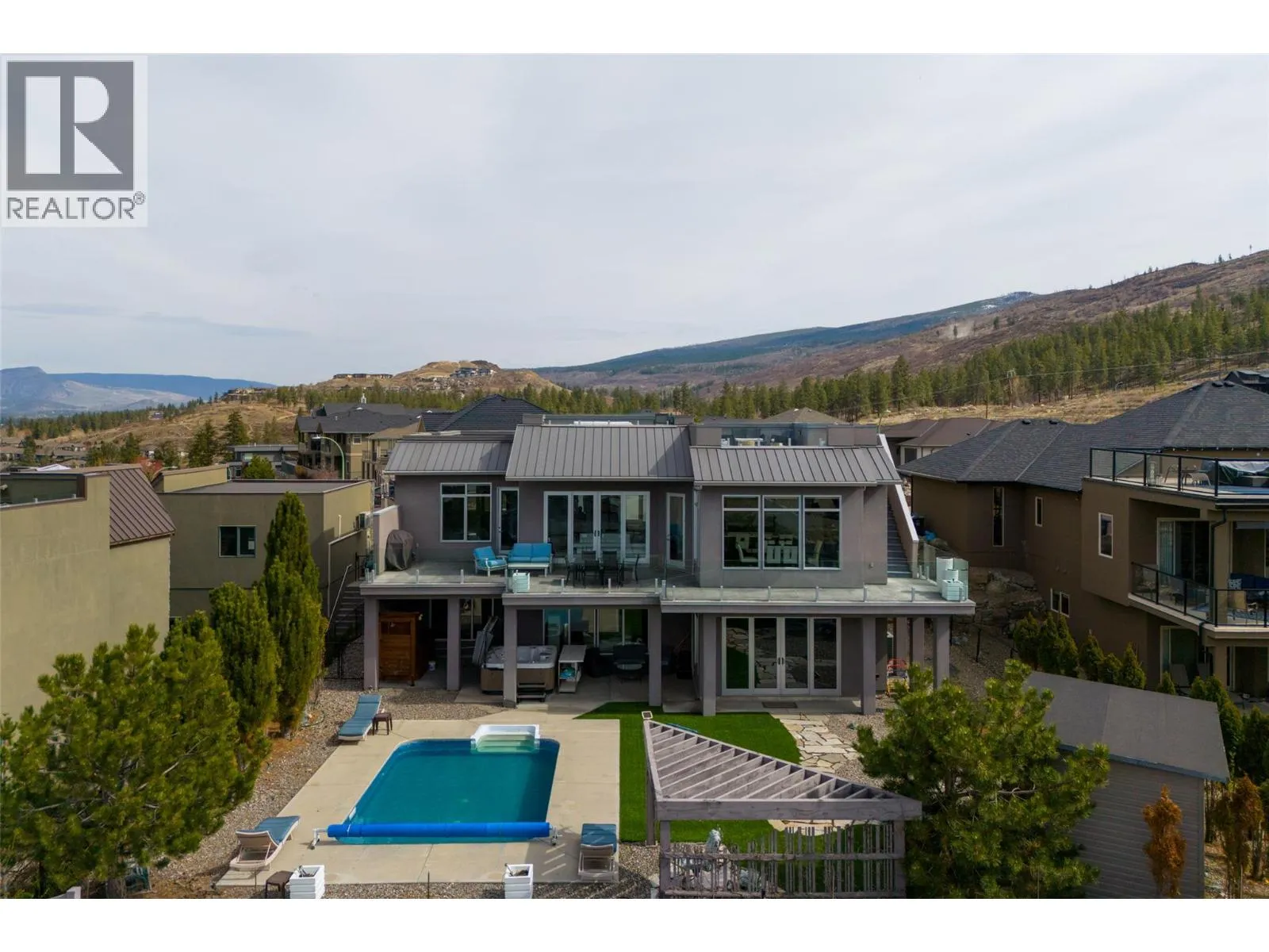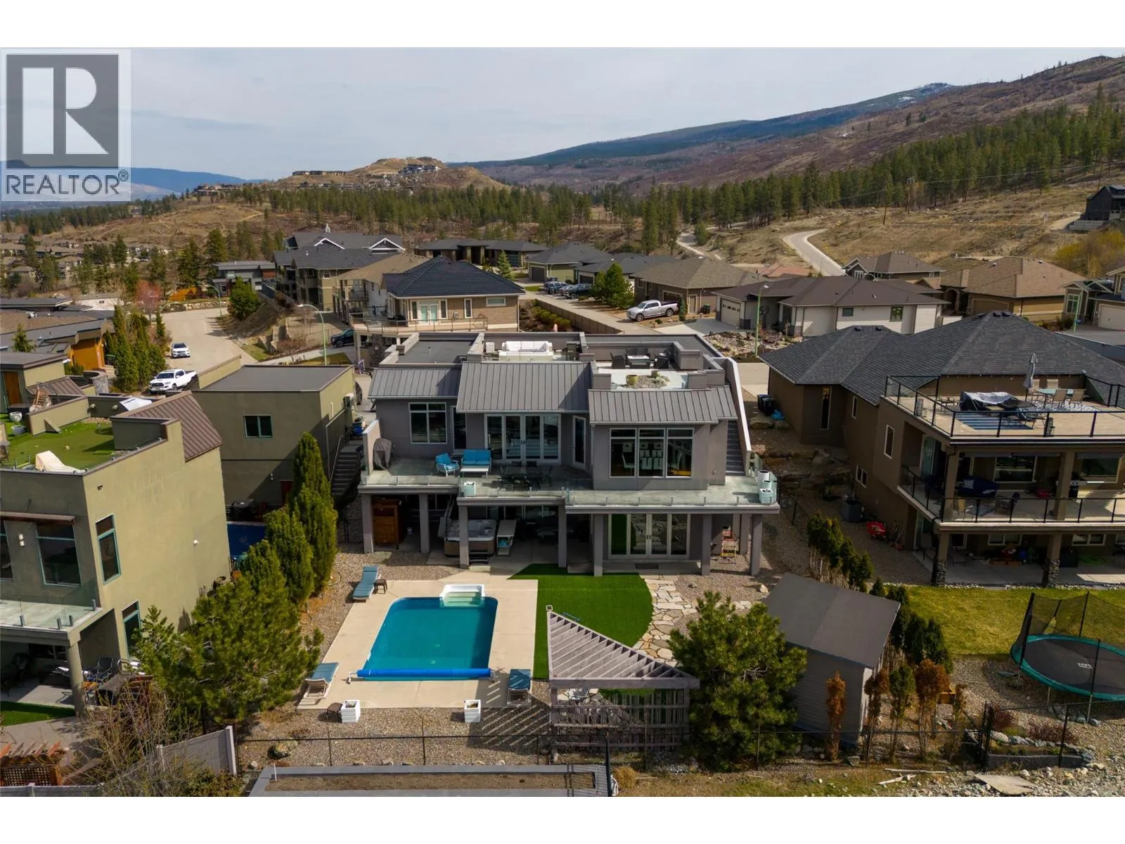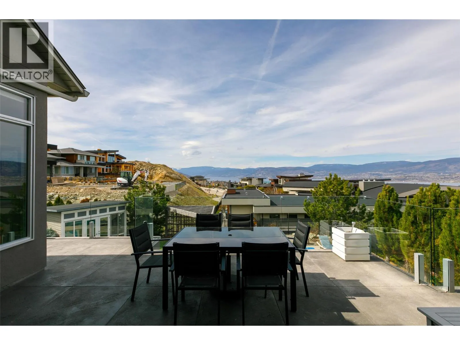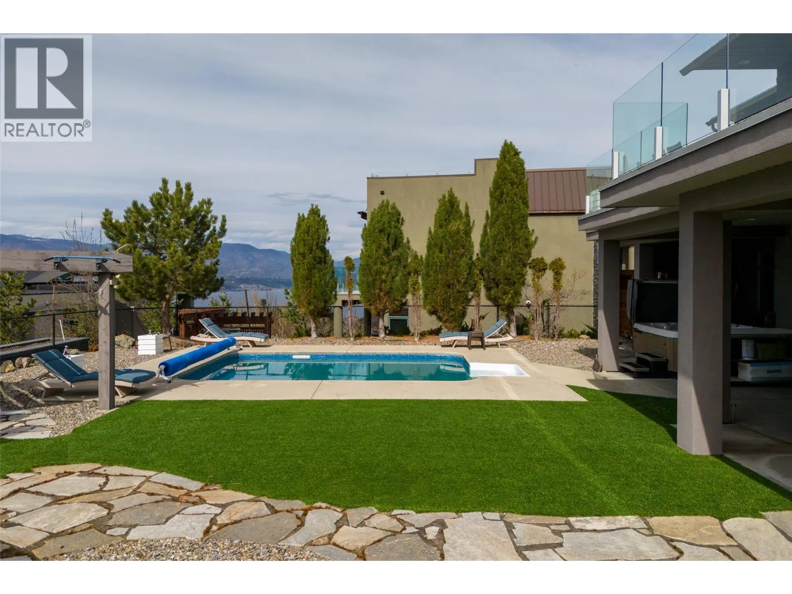 Stunning lake & mountain views, walls of windows, and crisp modern architecture come together in this exceptional Upper Mission walkout with rooftop patio overlooking your pool, the lake and city beyond! Impeccable finishings, open-concept living, and a quiet, upscale location make this home ideal for both entertaining and relaxing. The gourmet island kitchen flows seamlessly to a wraparound sundeck with panoramic southerly views overlooking the pool and lake. The main floor features a front office and a luxurious principal suite with spa-inspired ensuite. Downstairs offers spacious bedrooms, a large games/family room, media room, wine room, and steam shower bathâall with direct access to the sun-drenched pool & hot tub area and has suite potential. A detached backyard garden cottage shed provides potential for a summer guesthouse experience or utilize as you see fit! Additional features include: epoxied heated garage with 14â ceilings & built-in storage (boat-ready), 10â & 11â ceilings, granite & glass finishes throughout, xeriscaped landscaping, walk-through pantry, and a rare 1,000 sq ft rooftop patio with breathtaking lake & mountain viewsâperfect for Okanagan evenings. Located in the prestigious Kettle Valley neighborhood, close to parks, schools, and the new Ponds shopping district. Move-in ready to enjoy the best of the Okanagan lifestyle. (id:27476)