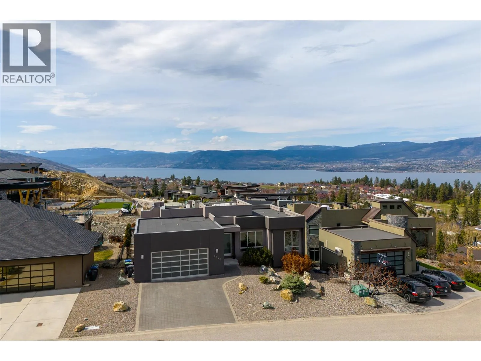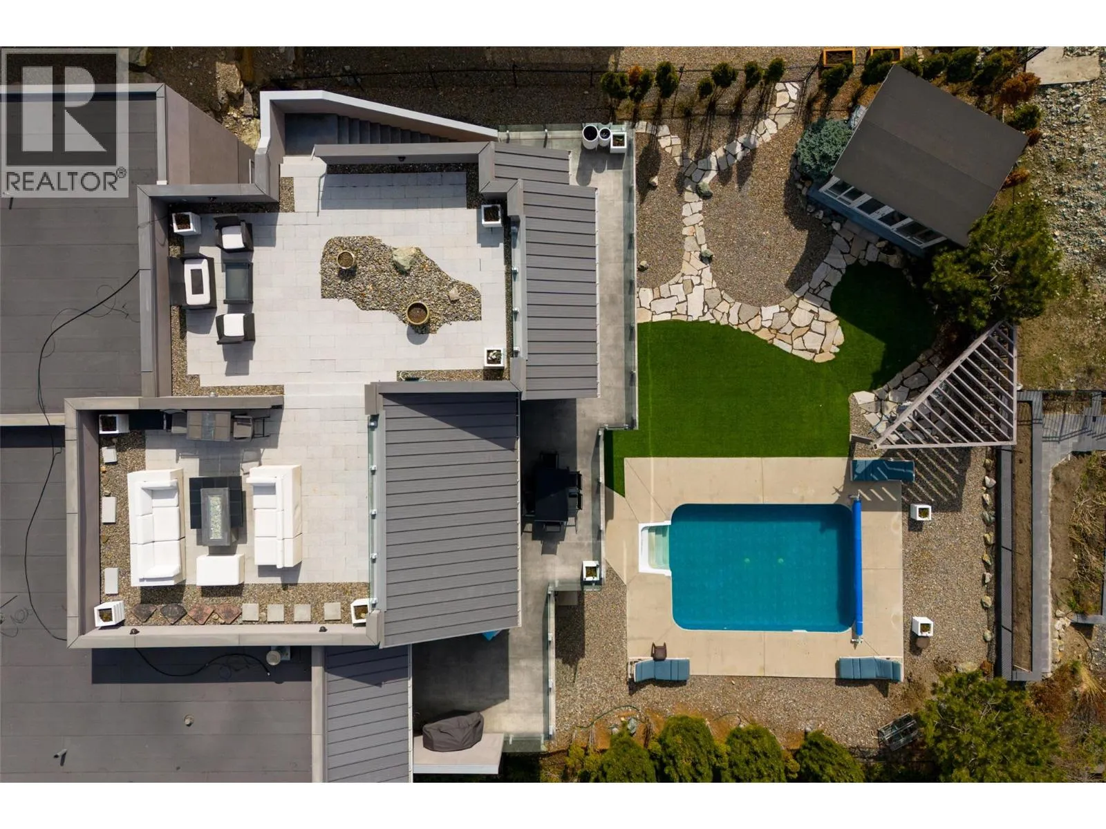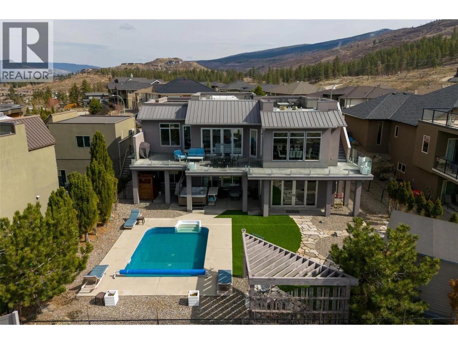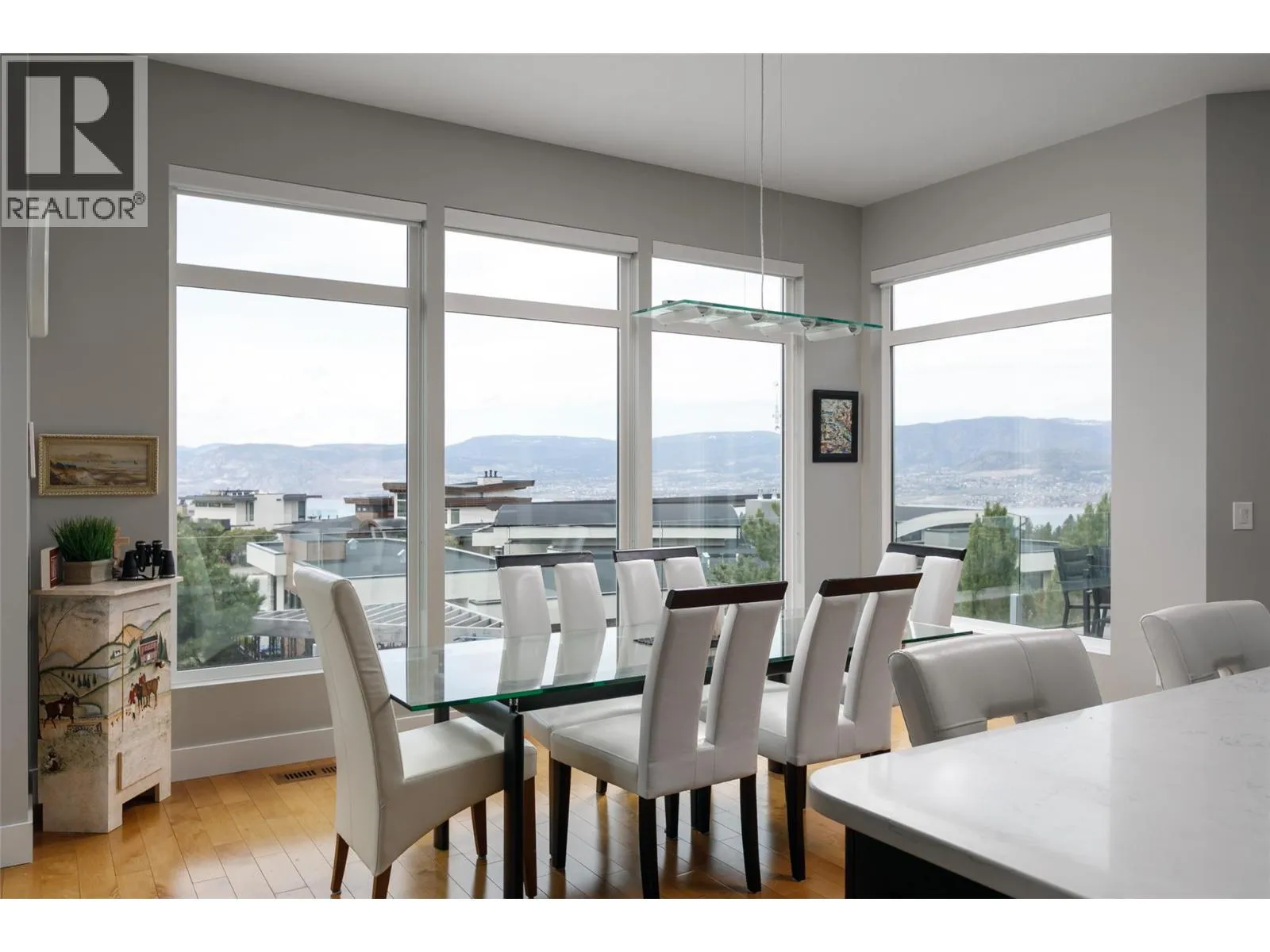 Stunning lake & mountain views, walls of windows, and crisp modern architecture come together in this exceptional Upper Mission walkout with rooftop patio overlooking your pool, the lake and city beyond! Impeccable finishings, open-concept living, and a quiet, upscale location make this home ideal for both entertaining and relaxing. The gourmet island kitchen flows seamlessly to a wraparound sundeck with panoramic southerly views overlooking the pool and lake. The main floor features a front office and a luxurious principal suite with spa-inspired ensuite. Downstairs offers spacious bedrooms, a large games/family room, media room, wine room, and steam shower bathâall with direct access to the sun-drenched pool & hot tub area and has suite potential. A detached backyard garden cottage shed provides potential for a summer guesthouse experience or utilize as you see fit! Additional features include: epoxied heated garage with 14â ceilings & built-in storage (boat-ready), 10â & 11â ceilings, granite & glass finishes throughout, xeriscaped landscaping, walk-through pantry, and a rare 1,000 sq ft rooftop patio with breathtaking lake & mountain viewsâperfect for Okanagan evenings. Located in the prestigious Kettle Valley neighborhood, close to parks, schools, and the new Ponds shopping district. Move-in ready to enjoy the best of the Okanagan lifestyle. (id:27476)