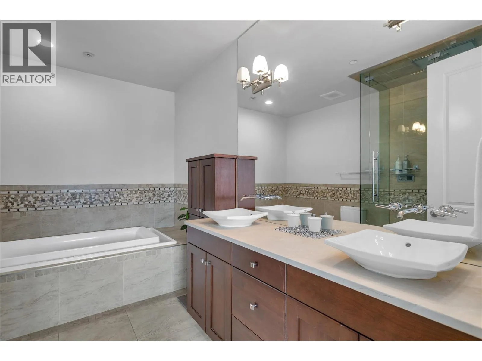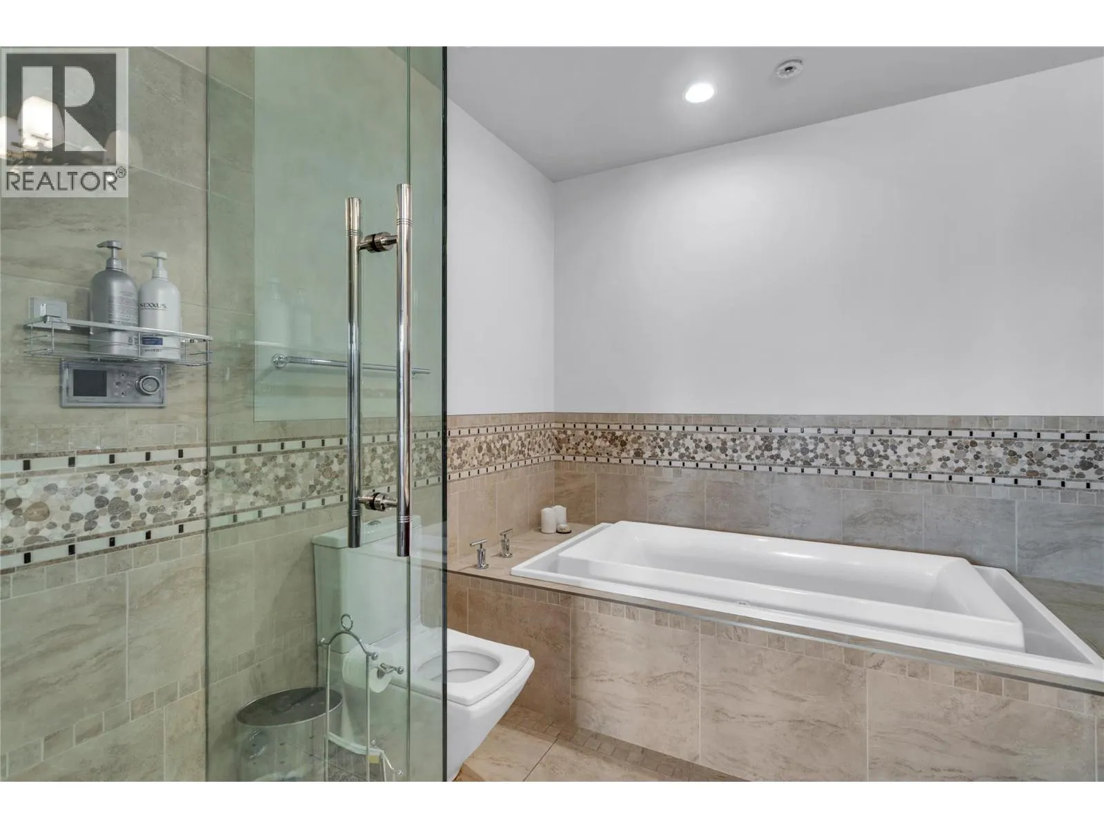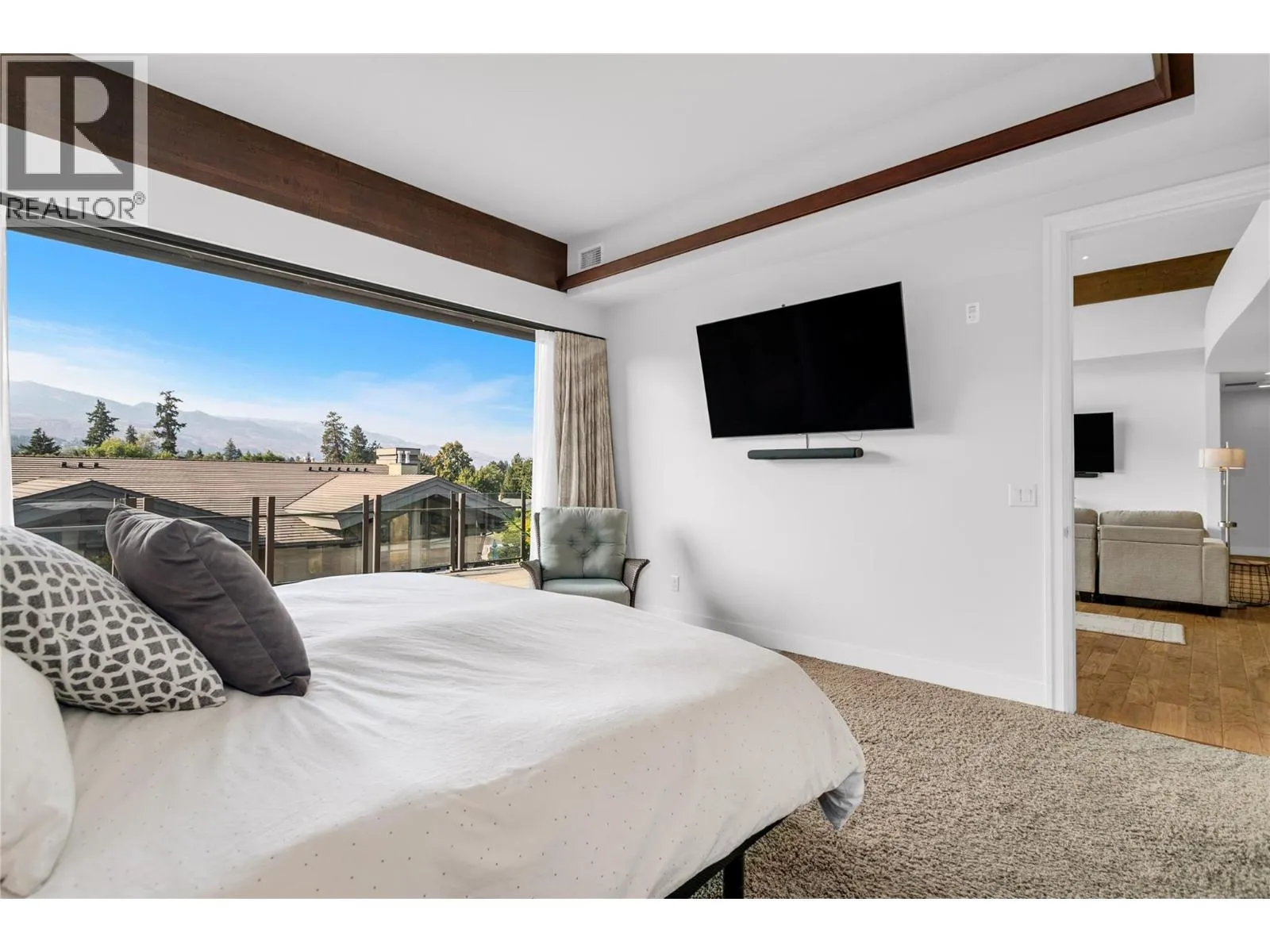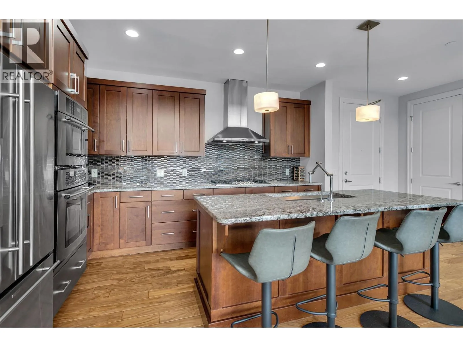 Discover refined living in the heart of Kelownaâs sought-after Lower Mission. This top floor unit is 1,536 sq. ft. 2-bedroom, 2-bathroom penthouse Boasting 18-foot vaulted ceilings and an impressive 25-foot Nano Wall, the open-concept living space seamlessly expands onto a stunning 500 sq. ft. balcony. Surrounded by mountain views and peaceful greenery, itâs the perfect place to entertain or unwind. Inside, tasteful design is evident throughout with granite countertops, Jenn Air appliances, and abundant natural light creating a bright, spacious atmosphere. The primary suite is a true retreat with its own Nano Wall opening to the patio, a spa-inspired ensuite featuring a steam shower, and a generous walk-in closet. Two secure indoor parking stalls and a storage locker add convenience, while the well-groomed Southward at Sarsons community offers manicured gardens and a tranquil setting. Located within walking distance to Sarsons Beach, scenic parks, and boutique shopping, this home blends upscale comfort with everyday practicality. A rare opportunity to own an elegant, light-filled penthouse in a premier Kelowna neighbourhood. (id:27476)