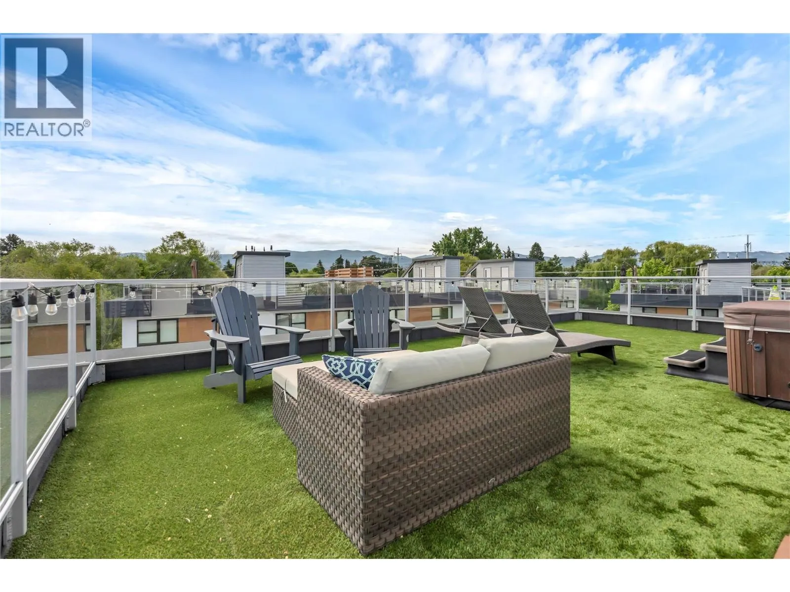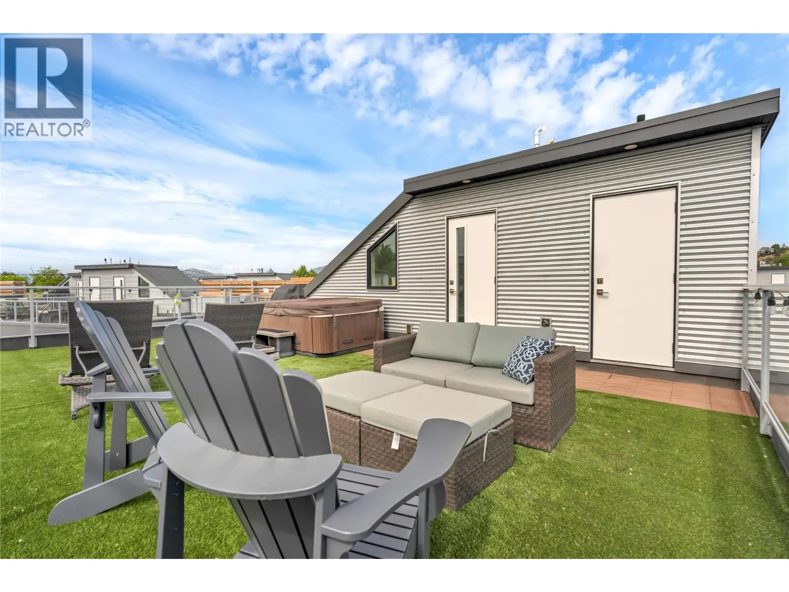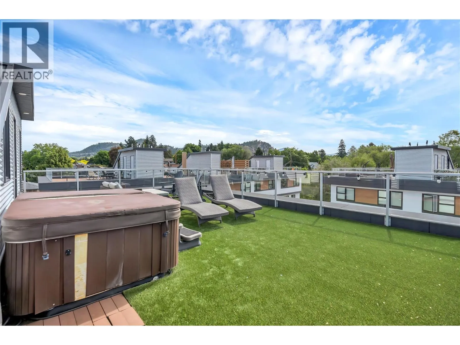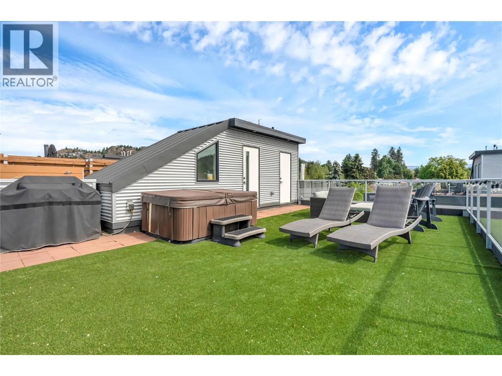 Welcome to Skyview Terraces, where form and function blend perfectly with upscale design and finishings, away from the hustle and bustle of downtown, but conveniently located within a short bike ride to all that downtown Kelowna has to offer. This end unit is located within a quiet location in the complex, near to visitor parking, and has an array of extra windows for added natural light. From the front door you are welcomed to a warm and inviting foyer, with access to the ground level bedroom/office and double car garage. Up from here you will find the inside entertainment level, with designer two tone kitchen including gas stove, cabinet space galore, light and bright living space, and the guest bath/laundry room, complete with newer Samsung washer and dryer. On the next floor are three well sized bedrooms, including the primary with 4 piece ensuite including heated floors and heated towel rack. The upper most level is the real focal point of this entire property, with the roof top deck, including synthetic lawn, a hot tub, and natural gas bib for your bbq; this is the space to soak in the sun and entertain your friends and family on a golden Kelowna summer night. The strata allows 1 dog or 1 cat and a minimum 3 month rental. Heating and cooling is through Geothermal, and there is newly installed hot water on demand unit. (id:27476)