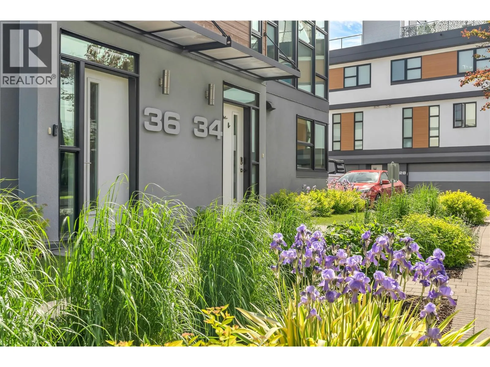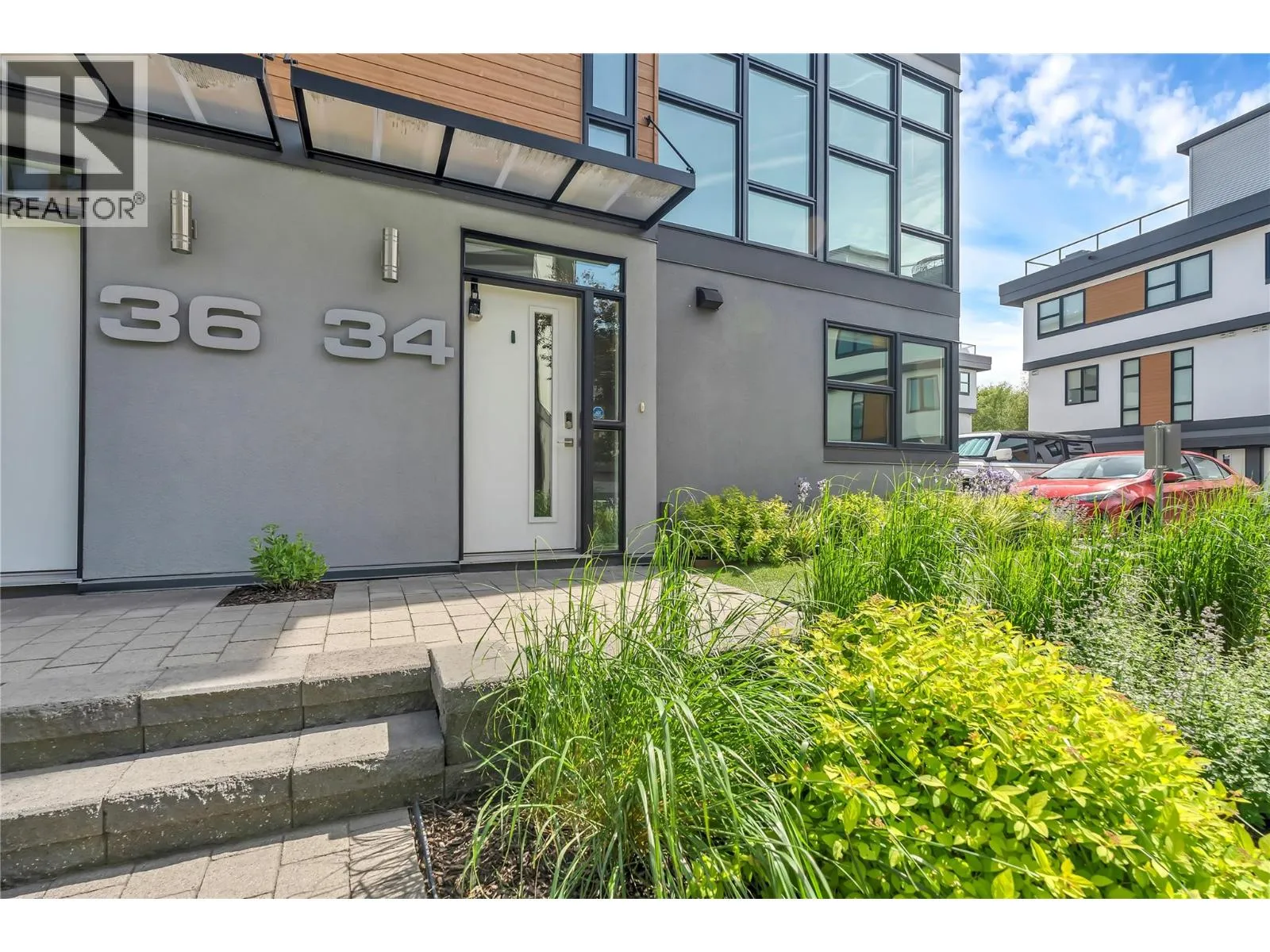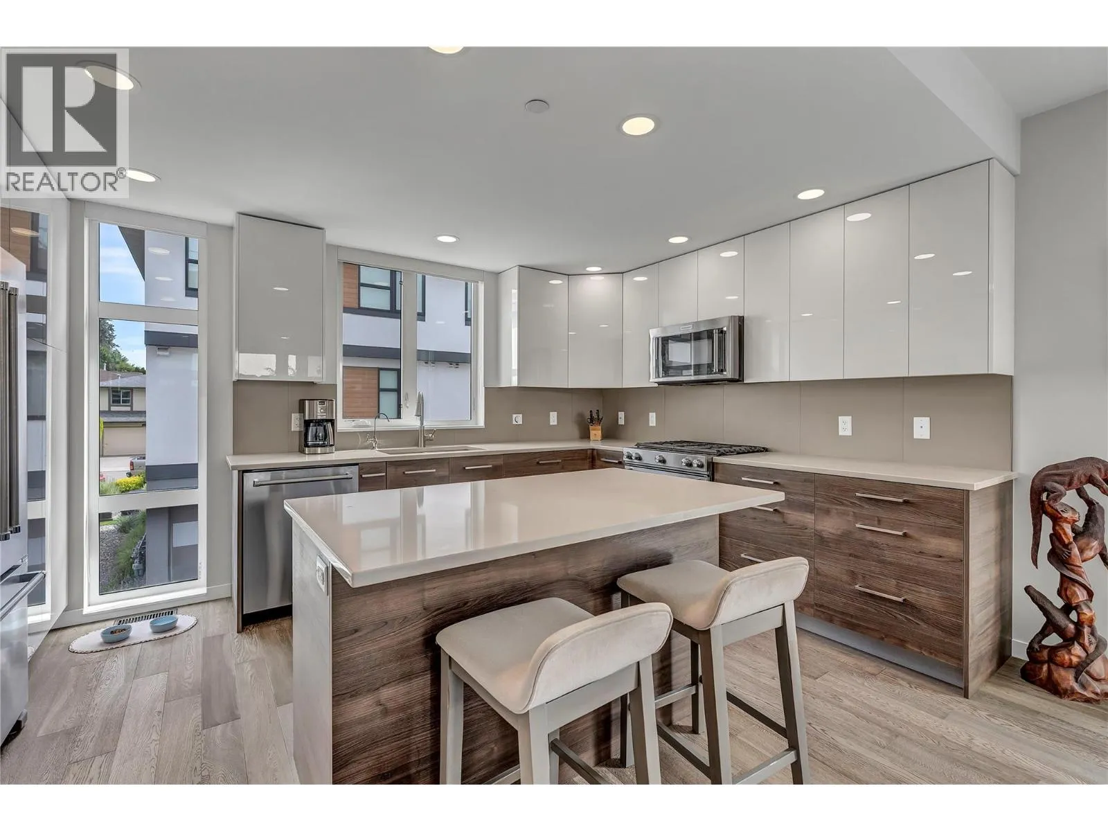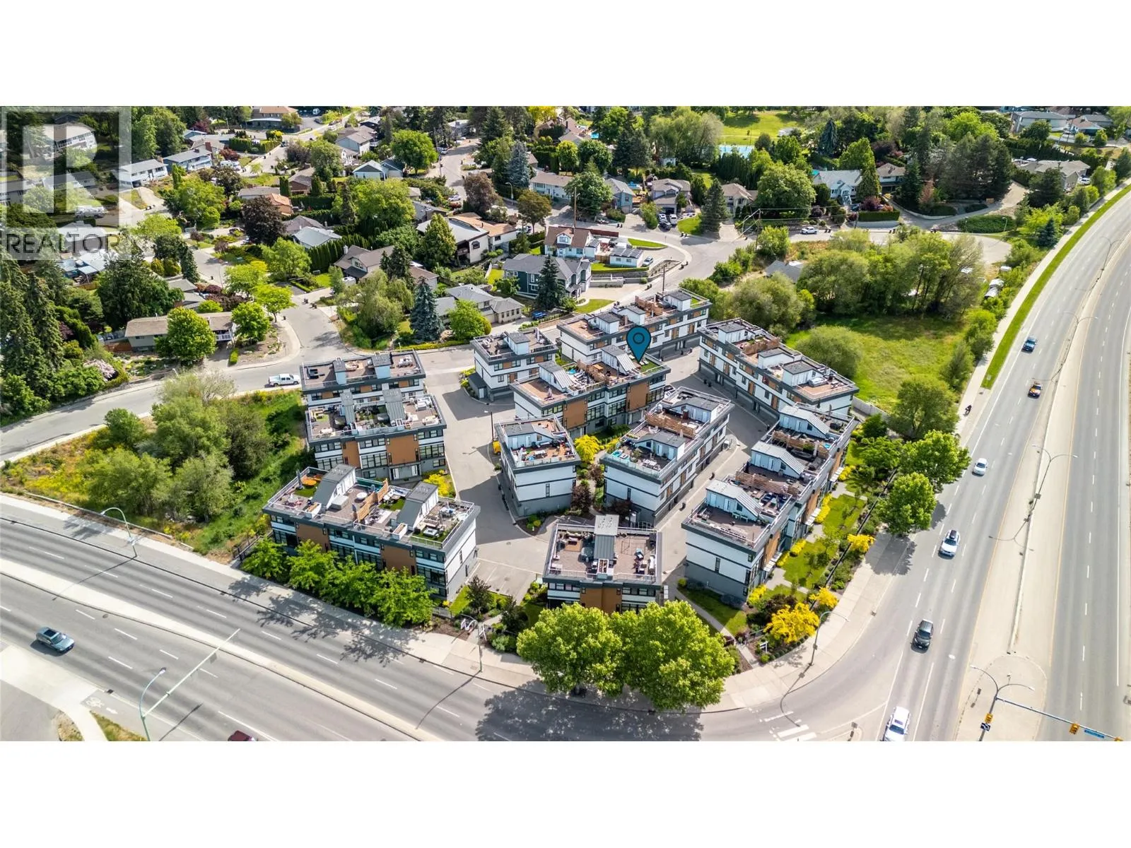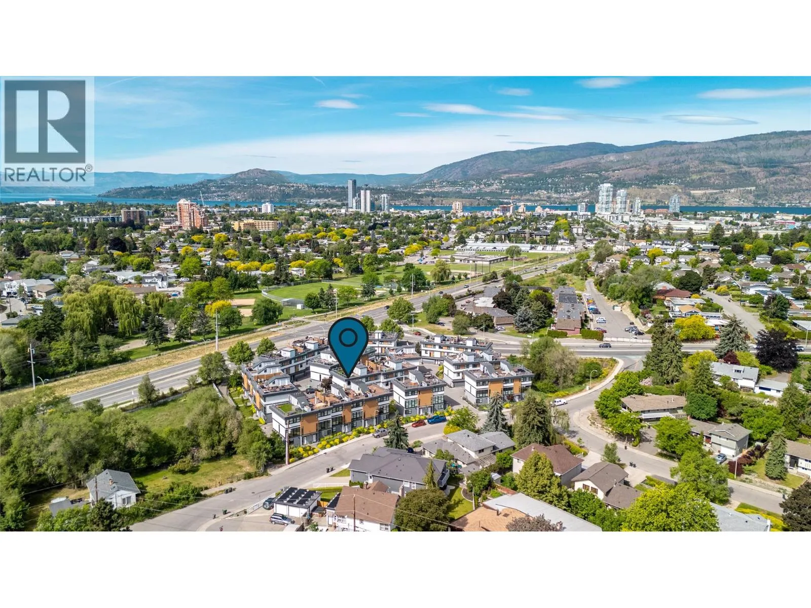 Welcome to Skyview Terraces, where form and function blend perfectly with upscale design and finishings, away from the hustle and bustle of downtown, but conveniently located within a short bike ride to all that downtown Kelowna has to offer. This end unit is located within a quiet location in the complex, near to visitor parking, and has an array of extra windows for added natural light. From the front door you are welcomed to a warm and inviting foyer, with access to the ground level bedroom/office and double car garage. Up from here you will find the inside entertainment level, with designer two tone kitchen including gas stove, cabinet space galore, light and bright living space, and the guest bath/laundry room, complete with newer Samsung washer and dryer. On the next floor are three well sized bedrooms, including the primary with 4 piece ensuite including heated floors and heated towel rack. The upper most level is the real focal point of this entire property, with the roof top deck, including synthetic lawn, a hot tub, and natural gas bib for your bbq; this is the space to soak in the sun and entertain your friends and family on a golden Kelowna summer night. The strata allows 1 dog or 1 cat and a minimum 3 month rental. Heating and cooling is through Geothermal, and there is newly installed hot water on demand unit. (id:27476)