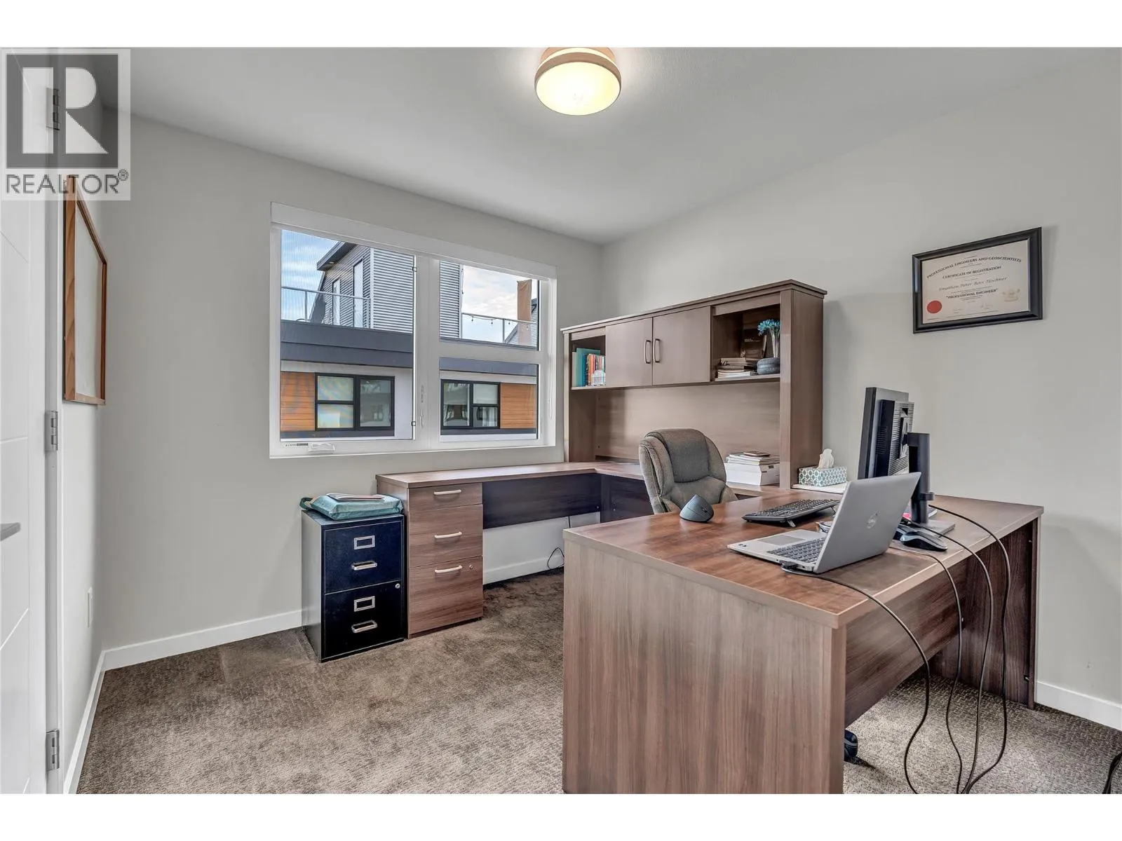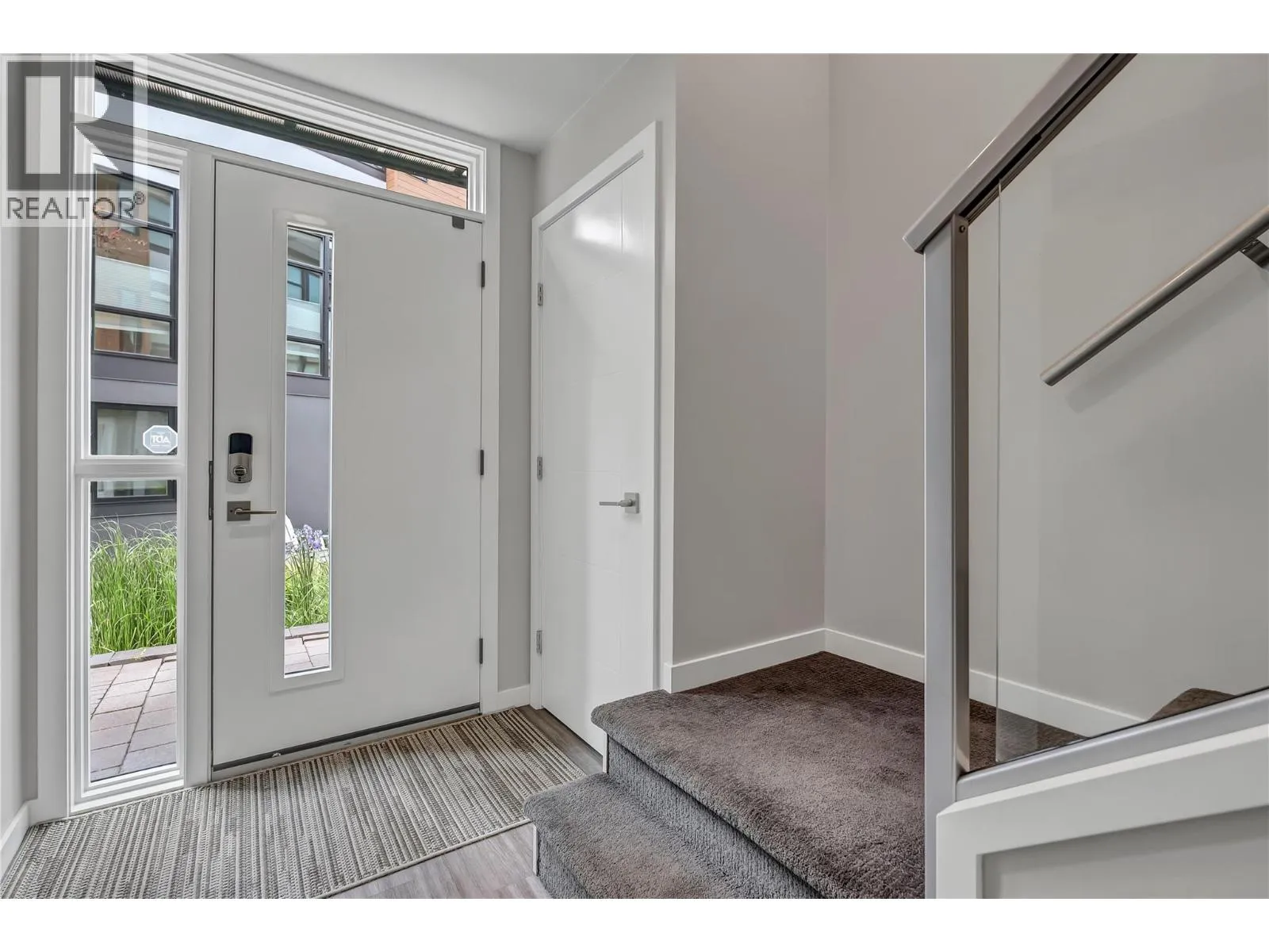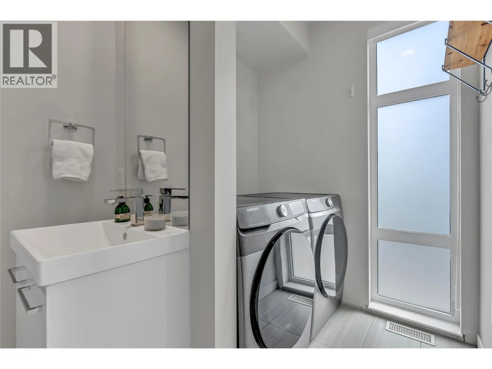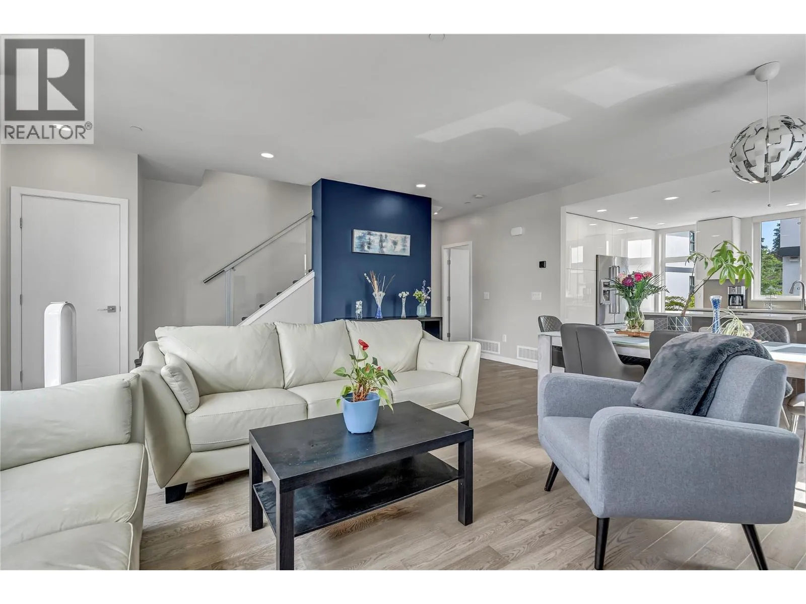 Welcome to Skyview Terraces, where form and function blend perfectly with upscale design and finishings, away from the hustle and bustle of downtown, but conveniently located within a short bike ride to all that downtown Kelowna has to offer. This end unit is located within a quiet location in the complex, near to visitor parking, and has an array of extra windows for added natural light. From the front door you are welcomed to a warm and inviting foyer, with access to the ground level bedroom/office and double car garage. Up from here you will find the inside entertainment level, with designer two tone kitchen including gas stove, cabinet space galore, light and bright living space, and the guest bath/laundry room, complete with newer Samsung washer and dryer. On the next floor are three well sized bedrooms, including the primary with 4 piece ensuite including heated floors and heated towel rack. The upper most level is the real focal point of this entire property, with the roof top deck, including synthetic lawn, a hot tub, and natural gas bib for your bbq; this is the space to soak in the sun and entertain your friends and family on a golden Kelowna summer night. The strata allows 1 dog or 1 cat and a minimum 3 month rental. Heating and cooling is through Geothermal, and there is newly installed hot water on demand unit. (id:27476)