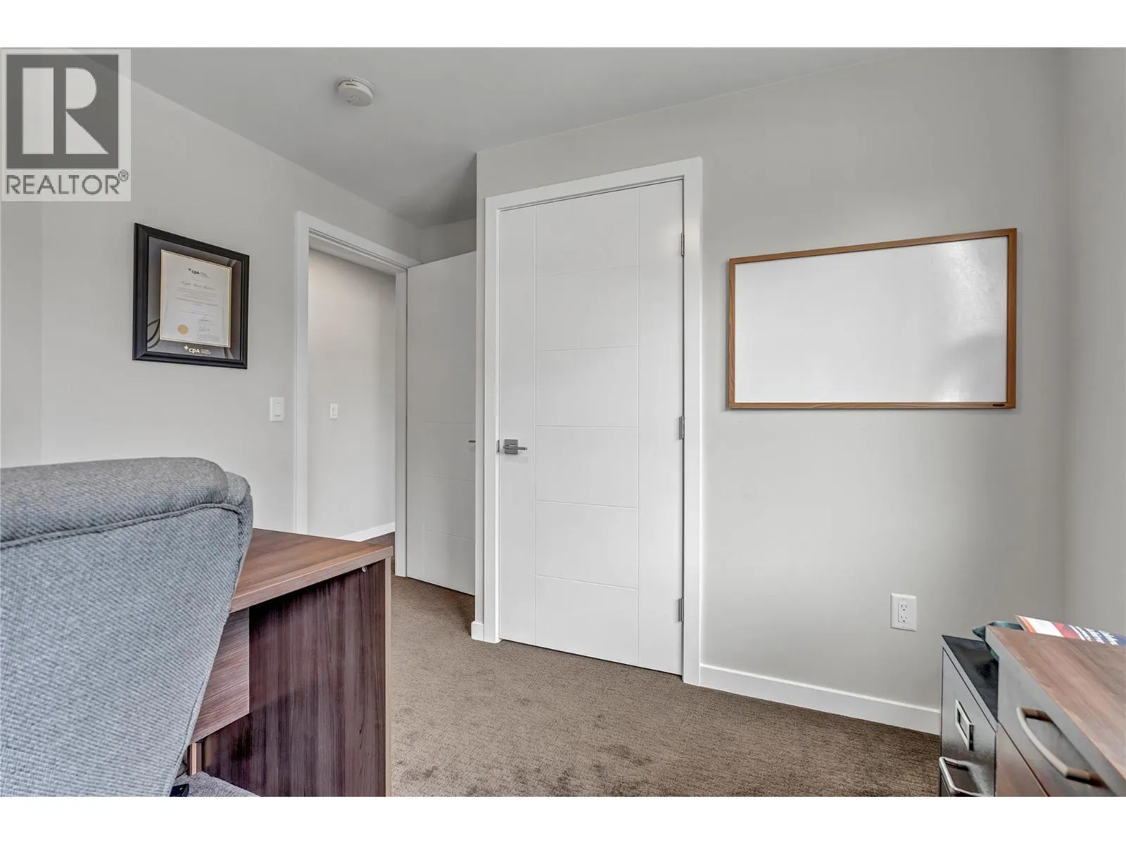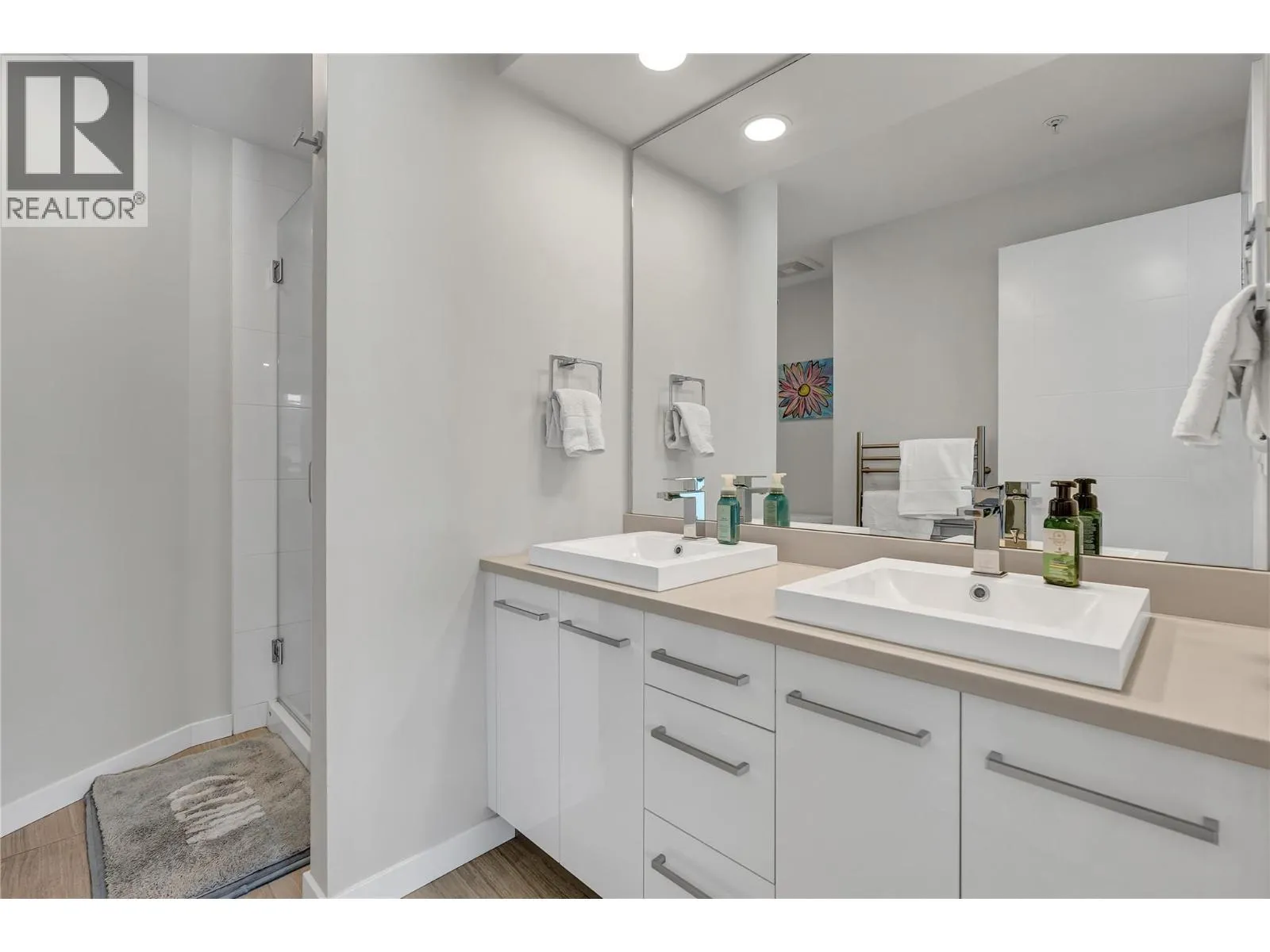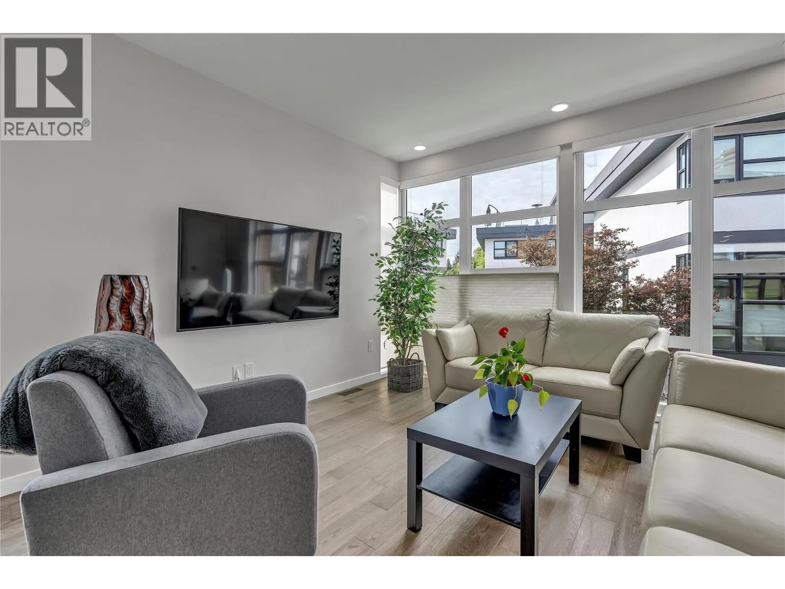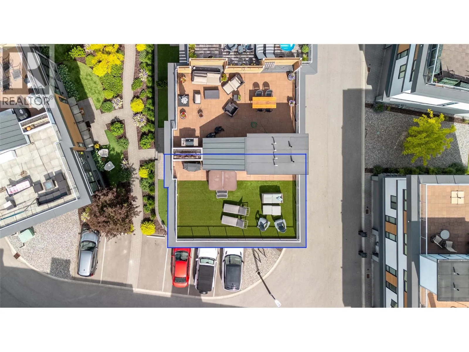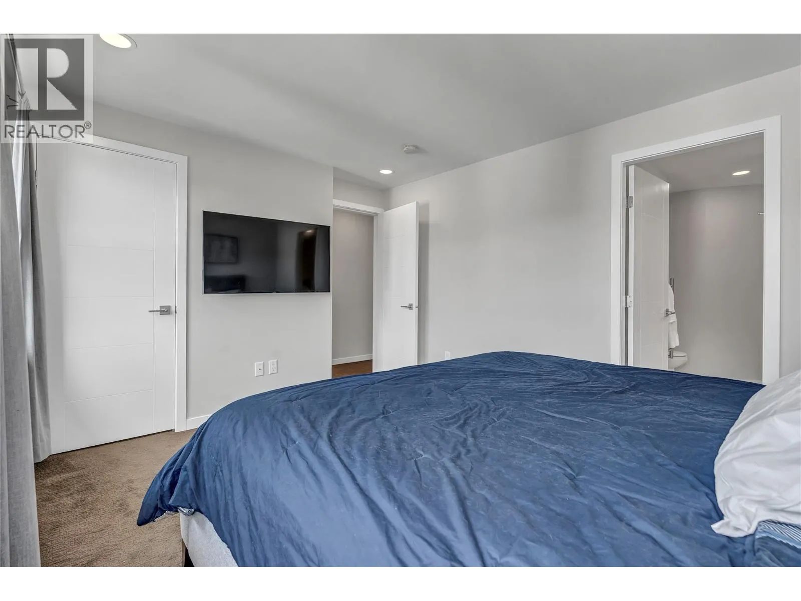Welcome to Skyview Terraces, where form and function blend perfectly with upscale design and finishings, away from the hustle and bustle of downtown, but conveniently located within a short bike ride to all that downtown Kelowna has to offer. This end unit is located within a quiet location in the complex, near to visitor parking, and has an array of extra windows for added natural light. From the front door you are welcomed to a warm and inviting foyer, with access to the ground level bedroom/office and double car garage. Up from here you will find the inside entertainment level, with designer two tone kitchen including gas stove, cabinet space galore, light and bright living space, and the guest bath/laundry room, complete with newer Samsung washer and dryer. On the next floor are three well sized bedrooms, including the primary with 4 piece ensuite including heated floors and heated towel rack. The upper most level is the real focal point of this entire property, with the roof top deck, including synthetic lawn, a hot tub, and natural gas bib for your bbq; this is the space to soak in the sun and entertain your friends and family on a golden Kelowna summer night. The strata allows 1 dog or 1 cat and a minimum 3 month rental. Heating and cooling is through Geothermal, and there is newly installed hot water on demand unit. (id:27476)
