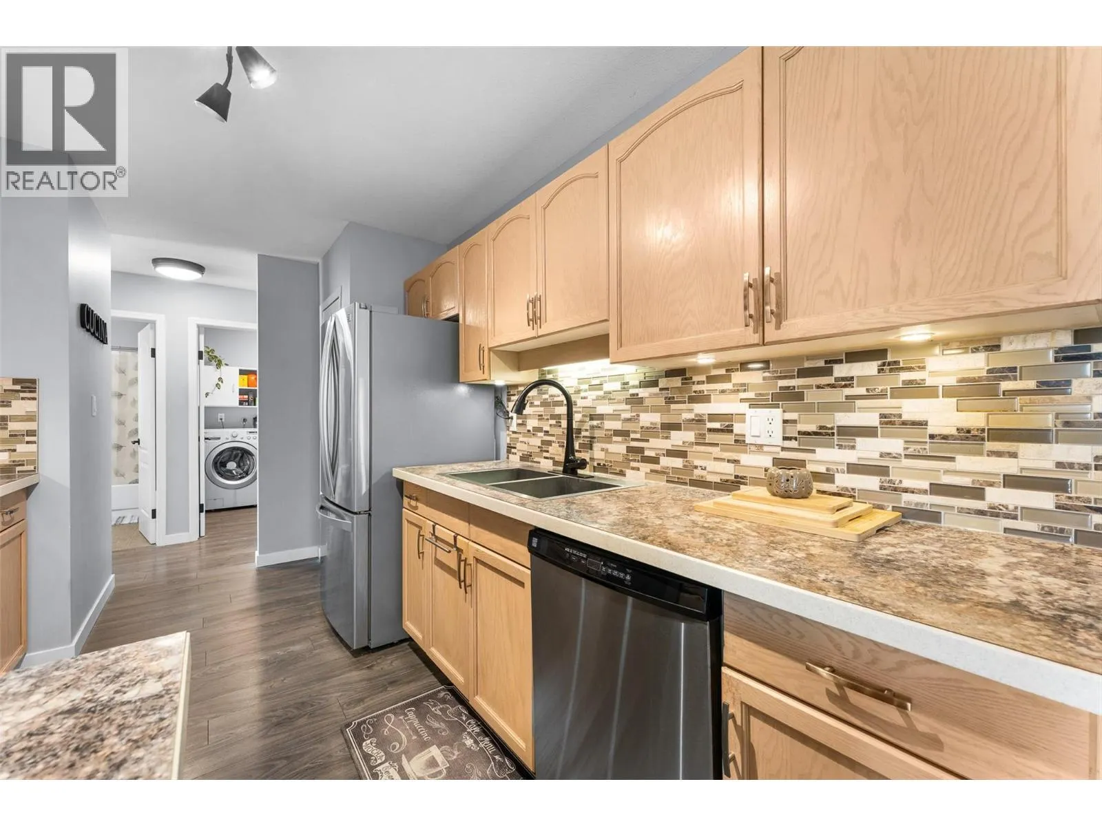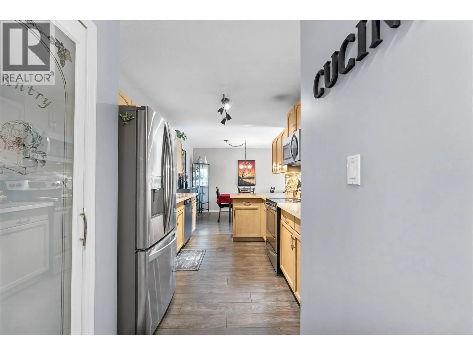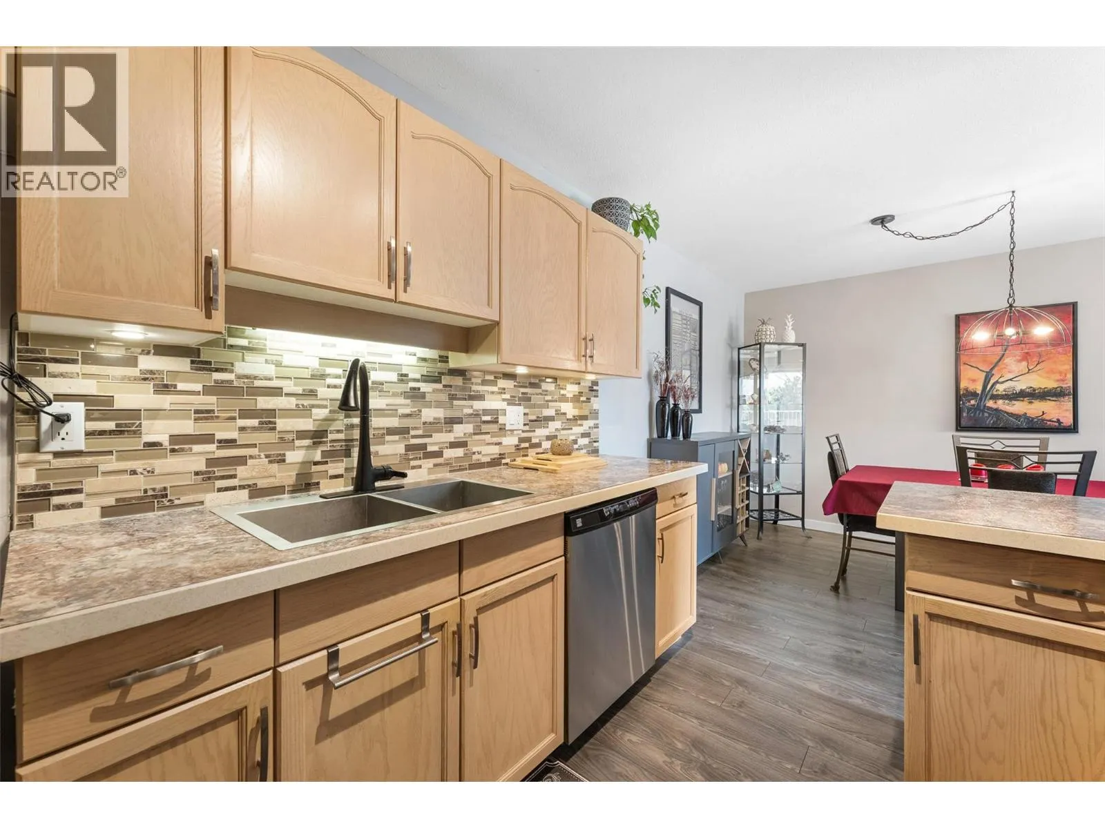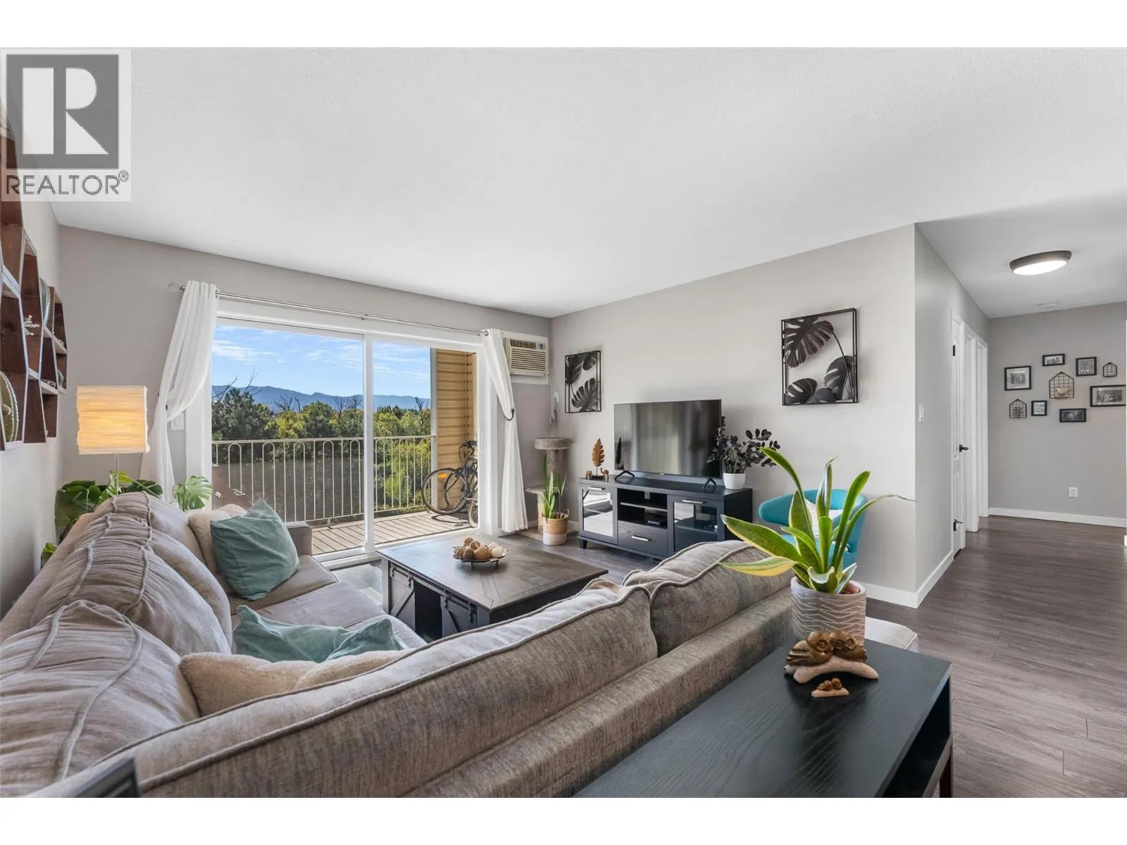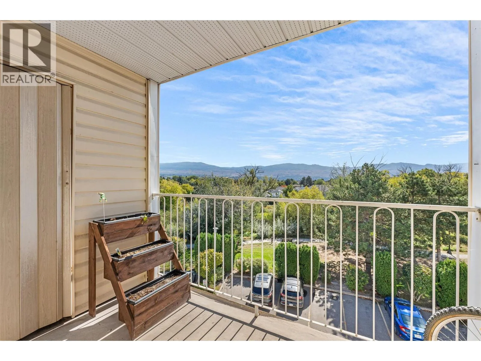 Welcome to Creekside Villas, perfectly positioned in the heart of Kelownaâs Lower Mission. This top-floor end unit, set on the quiet side of the building, offers 2 bedrooms and 2 bathrooms, thoughtfully updated interiors, and peaceful creek viewsâa seamless blend of comfort, style, and convenience. Inside has fresh paint, wide-plank laminate floors, and new lighting (all 2019â2020) creating a bright, inviting atmosphere. The kitchen is designed for both style and efficiency with abundant cabinetry, a pantry, tiled backsplash, and stainless appliances. The open-concept dining and living area flows effortlessly to a covered balcony with creek and park viewsâperfect for morning coffee or evening relaxation. The primary suite features two windows framing natural greenery, a double closet, and a renovated ensuite bathroom. A second bedroom and renovated 4-piece bathroom provide flexibility for family or guests. Additional highlights include in-suite laundry with storage, updated windows and patio doors (2024), and thoughtful finishes throughout. Residents of Creekside Villas enjoy exceptional amenities: a pool, hot tub, sauna, fitness centre and secure RV/Boat parking. With just one common wall, this home ensures privacy while offering the benefits of community living. One assigned parking stall and two open parking permits included. Ideally located minutes from shopping, restaurants, beaches, and Okanagan College, this home offers the perfect balance of lifestyle and value. (id:27476)