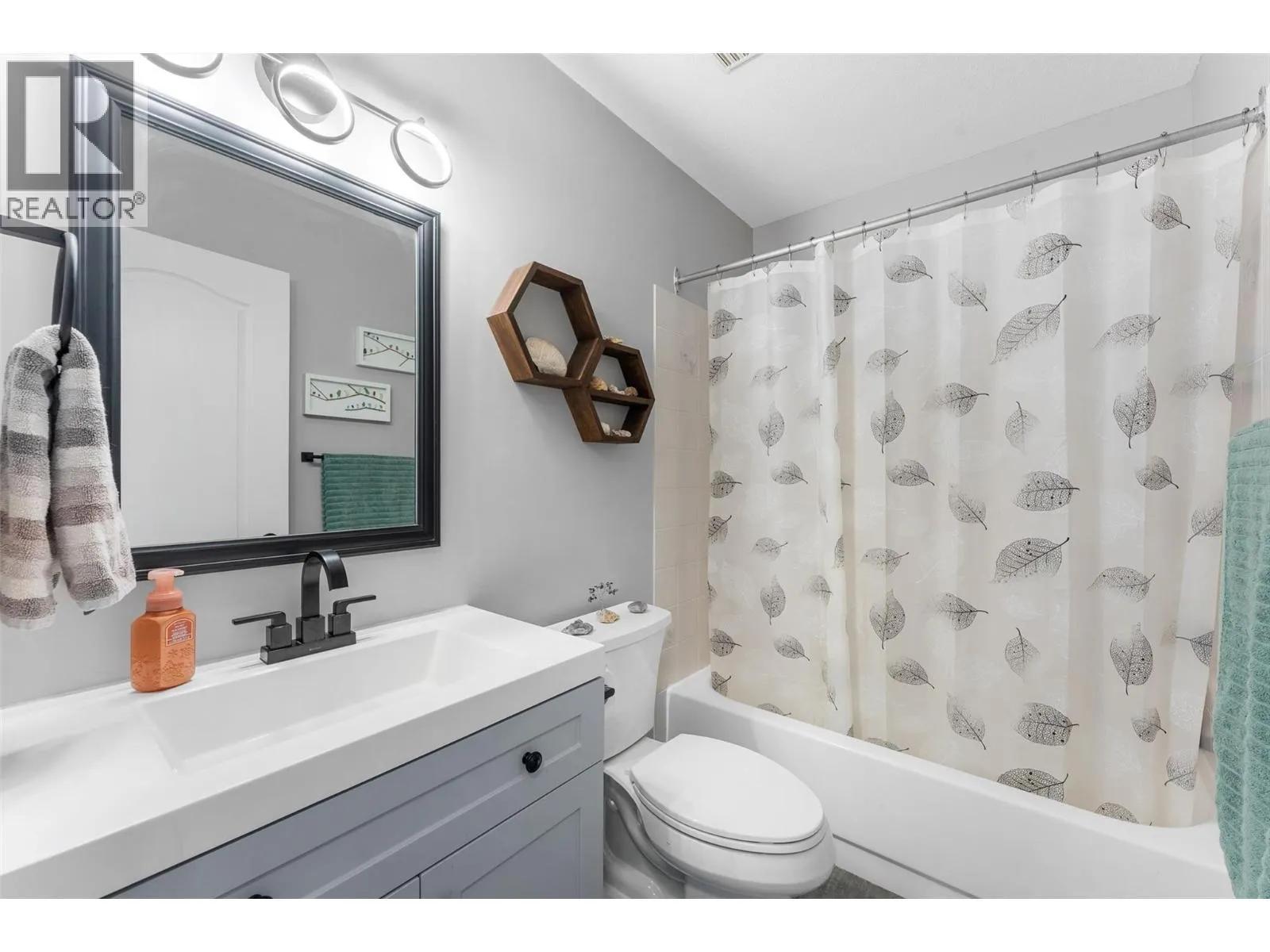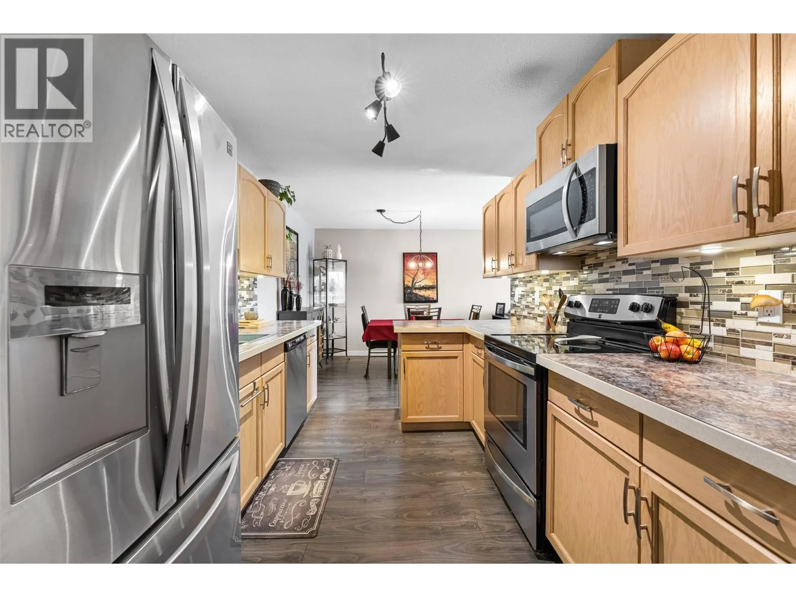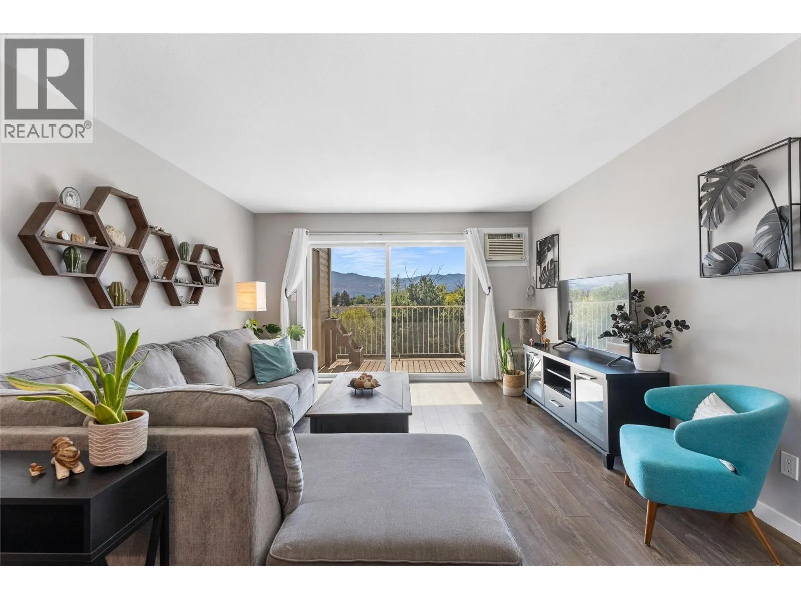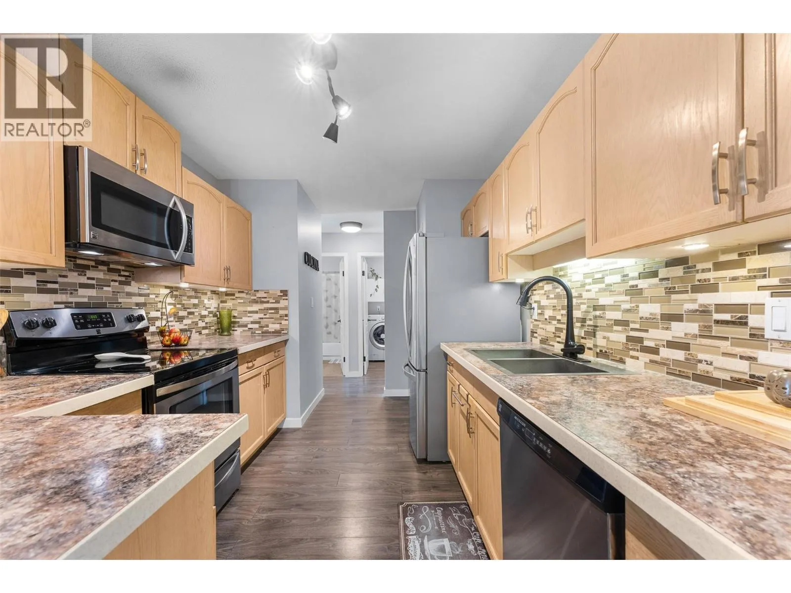 Welcome to Creekside Villas, perfectly positioned in the heart of Kelownaâs Lower Mission. This top-floor end unit, set on the quiet side of the building, offers 2 bedrooms and 2 bathrooms, thoughtfully updated interiors, and peaceful creek viewsâa seamless blend of comfort, style, and convenience. Inside has fresh paint, wide-plank laminate floors, and new lighting (all 2019â2020) creating a bright, inviting atmosphere. The kitchen is designed for both style and efficiency with abundant cabinetry, a pantry, tiled backsplash, and stainless appliances. The open-concept dining and living area flows effortlessly to a covered balcony with creek and park viewsâperfect for morning coffee or evening relaxation. The primary suite features two windows framing natural greenery, a double closet, and a renovated ensuite bathroom. A second bedroom and renovated 4-piece bathroom provide flexibility for family or guests. Additional highlights include in-suite laundry with storage, updated windows and patio doors (2024), and thoughtful finishes throughout. Residents of Creekside Villas enjoy exceptional amenities: a pool, hot tub, sauna, fitness centre and secure RV/Boat parking. With just one common wall, this home ensures privacy while offering the benefits of community living. One assigned parking stall and two open parking permits included. Ideally located minutes from shopping, restaurants, beaches, and Okanagan College, this home offers the perfect balance of lifestyle and value. (id:27476)