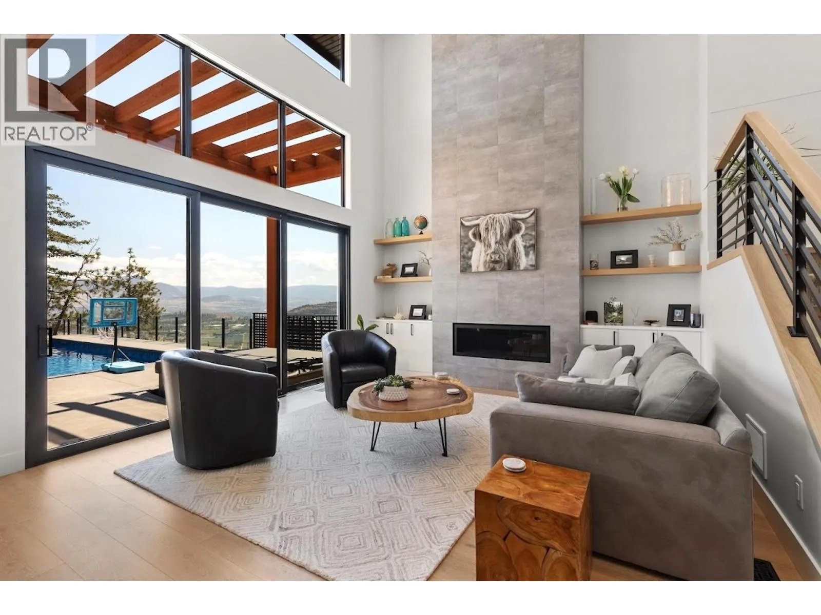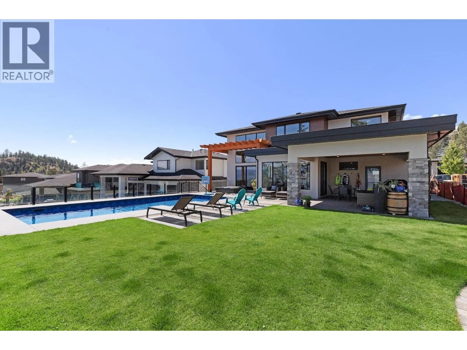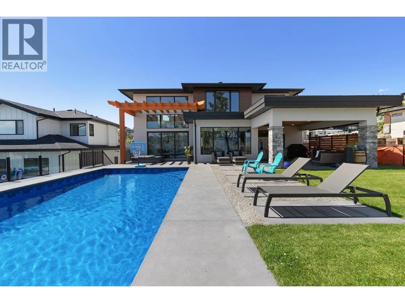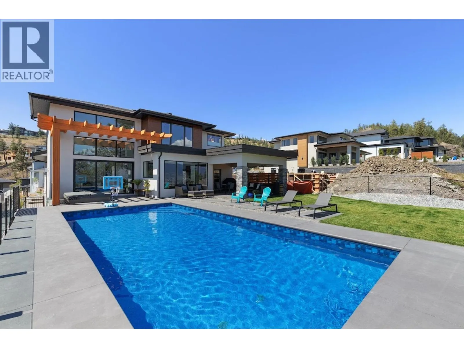 Experience modern luxury and natural beauty in this stunning 4,616 square foot custom home in Wilden, one of Kelownaâs most sought after communities. Thoughtfully designed by Rykon Construction, it features soaring 18 foot ceilings, heated floors in key areas, tri-slider doors leading to an outdoor oasis, and oversized glulam posts and beams with a pergola. The lavish kitchen boasts an eight foot by five foot island, double fridge and freezer, induction cooktop, double wall ovens, and separate prep kitchen. The kitchen flows to the dining room and living room that features two story ceilings and floor-to-ceiling windows to showcase the unobstructed east facing valley views. This level also includes two offices, laundry room, and bathroom. Upstairs is the luxurious primary suite with views and spa like ensuite, along with two more bedrooms, each with an ensuite. The basement includes a theater room with a 100 inch projector, game room, wet bar, guest bedroom, bathroom, and fitness room. Nothing has been spared in this home as smart home automation controls lighting, blinds, security, and more. The oversized 700 square feet two car garage is designed with an EV charger, built-in workbench, cabinets, and room for bikes and all your gear to embrace the Okanagan lifestyle. Outside, enjoy an eight foot deep 32 foot by 16 foot salt water pool, hot tub, covered patio, and tiered lot maximizing light and privacy. Located near Wildenâs extensive trail network and minutes from downtown, this home offers a blend of luxury, functionality, and lifestyle. (id:27476)