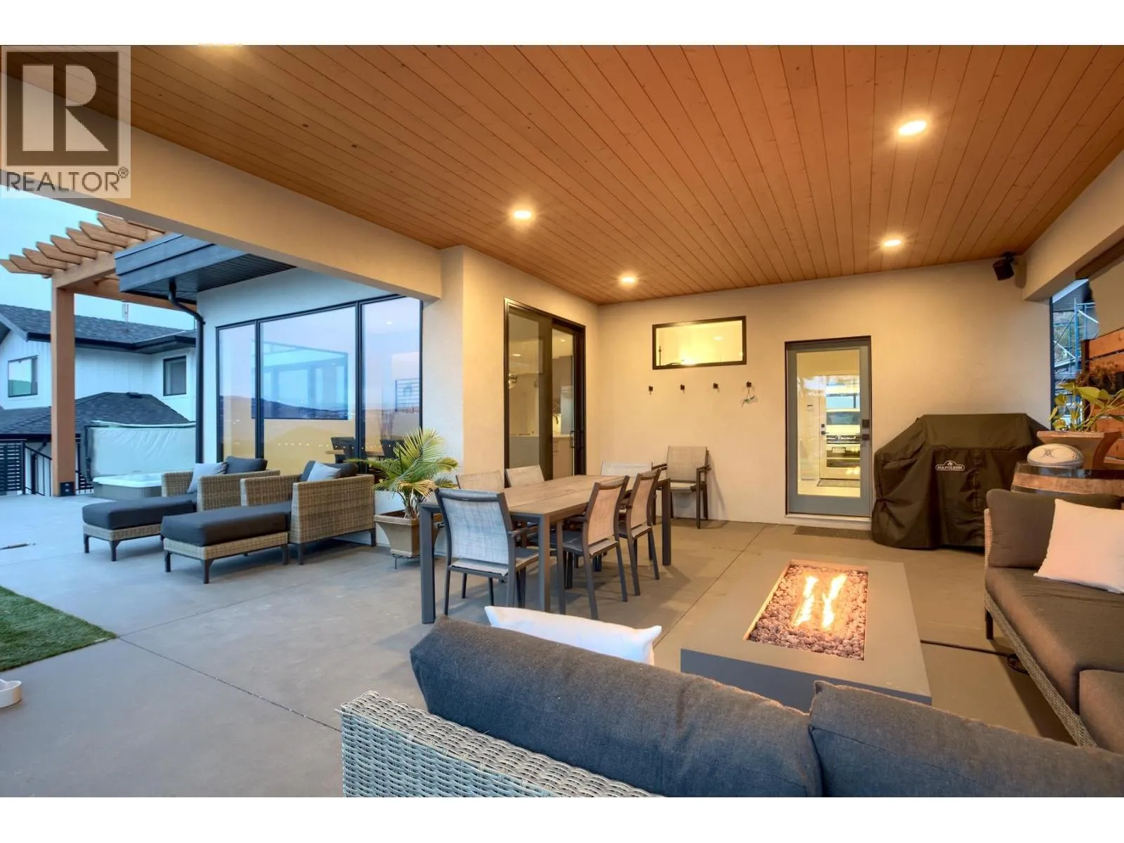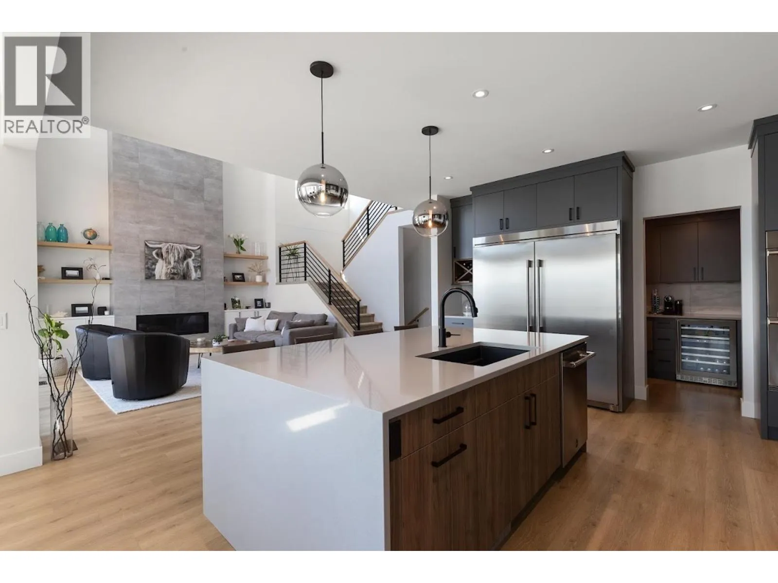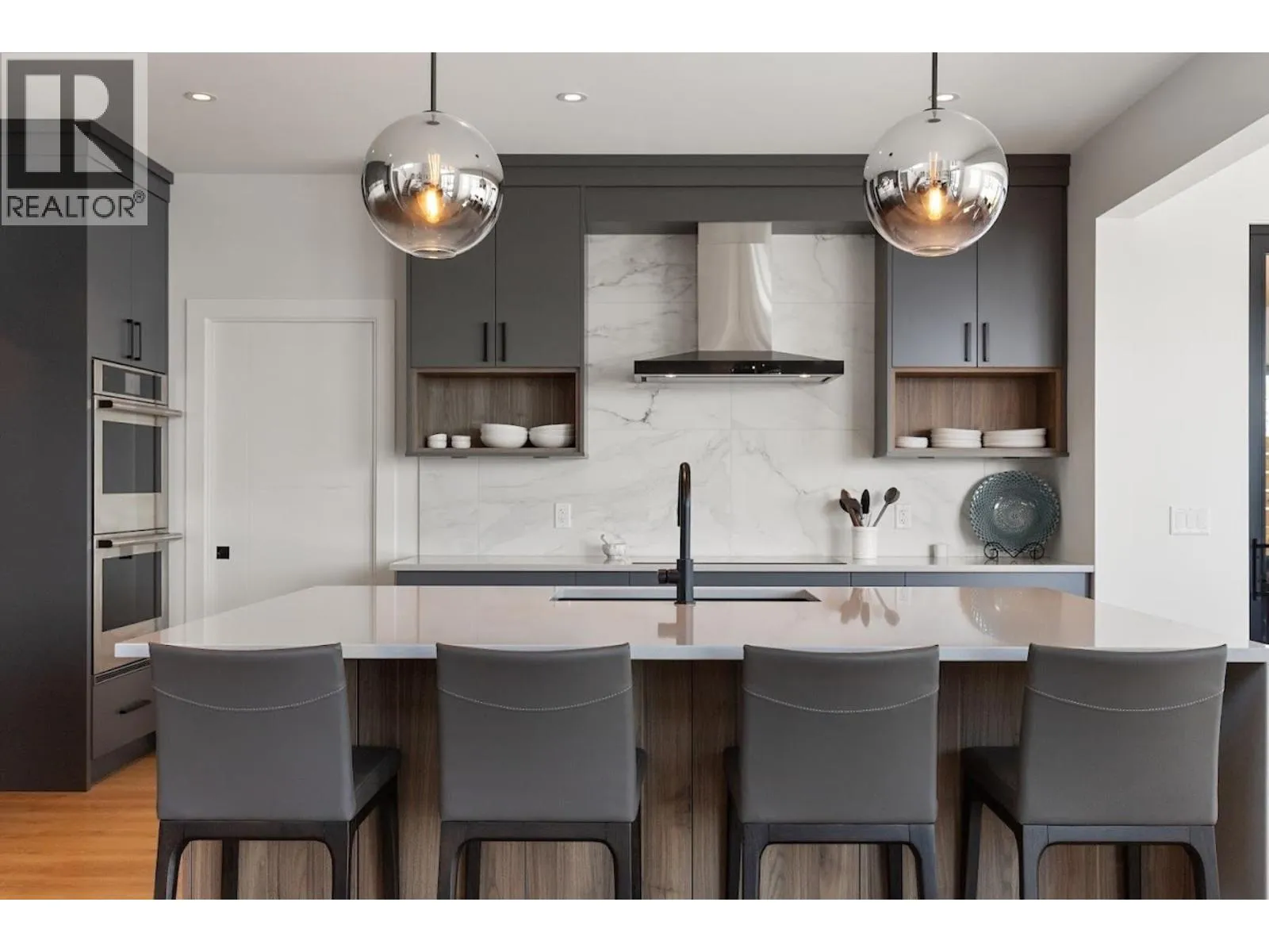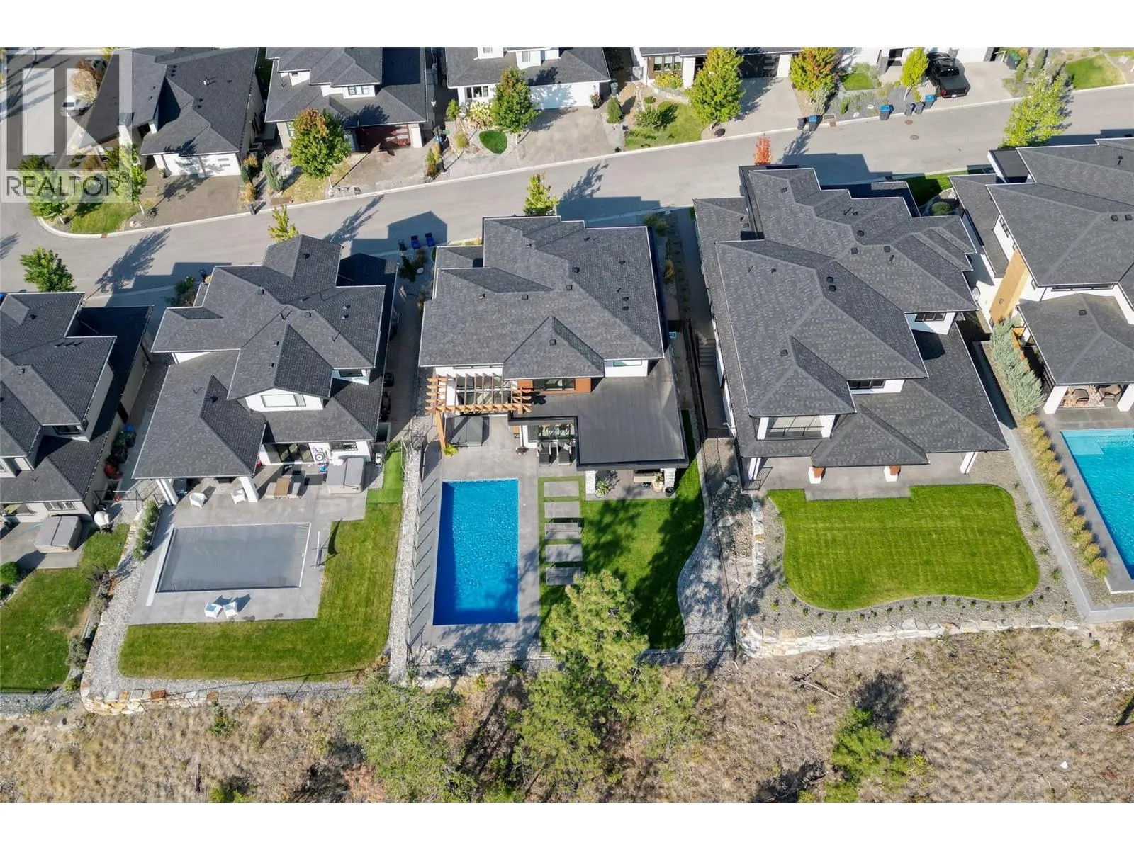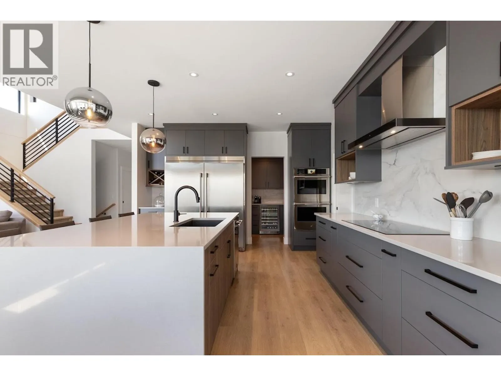 Experience modern luxury and natural beauty in this stunning 4,616 square foot custom home in Wilden, one of Kelownaâs most sought after communities. Thoughtfully designed by Rykon Construction, it features soaring 18 foot ceilings, heated floors in key areas, tri-slider doors leading to an outdoor oasis, and oversized glulam posts and beams with a pergola. The lavish kitchen boasts an eight foot by five foot island, double fridge and freezer, induction cooktop, double wall ovens, and separate prep kitchen. The kitchen flows to the dining room and living room that features two story ceilings and floor-to-ceiling windows to showcase the unobstructed east facing valley views. This level also includes two offices, laundry room, and bathroom. Upstairs is the luxurious primary suite with views and spa like ensuite, along with two more bedrooms, each with an ensuite. The basement includes a theater room with a 100 inch projector, game room, wet bar, guest bedroom, bathroom, and fitness room. Nothing has been spared in this home as smart home automation controls lighting, blinds, security, and more. The oversized 700 square feet two car garage is designed with an EV charger, built-in workbench, cabinets, and room for bikes and all your gear to embrace the Okanagan lifestyle. Outside, enjoy an eight foot deep 32 foot by 16 foot salt water pool, hot tub, covered patio, and tiered lot maximizing light and privacy. Located near Wildenâs extensive trail network and minutes from downtown, this home offers a blend of luxury, functionality, and lifestyle. (id:27476)