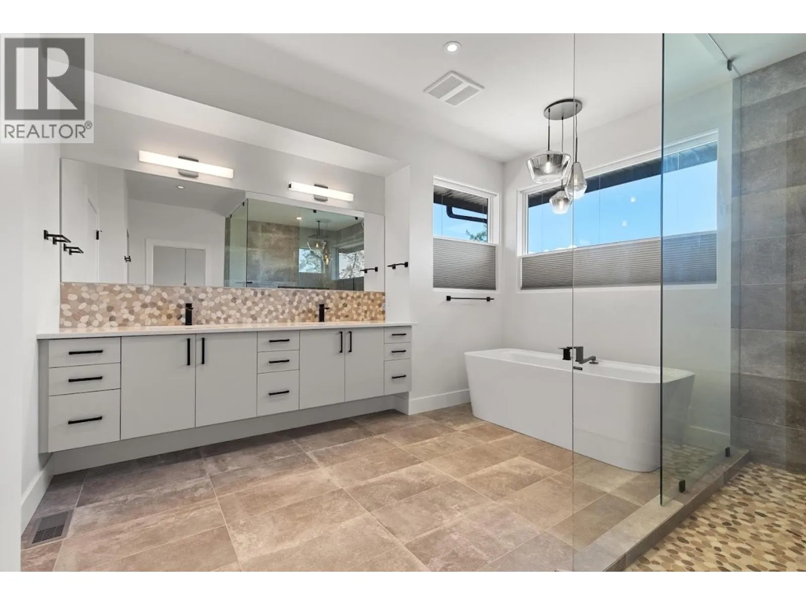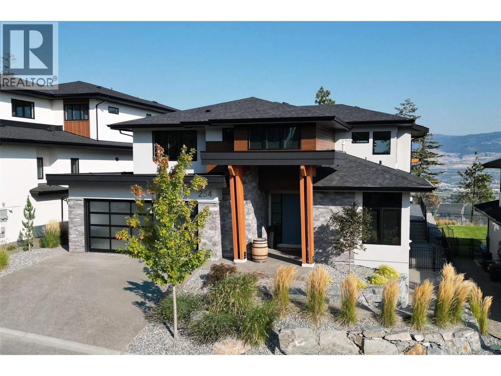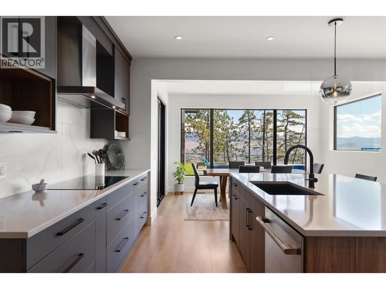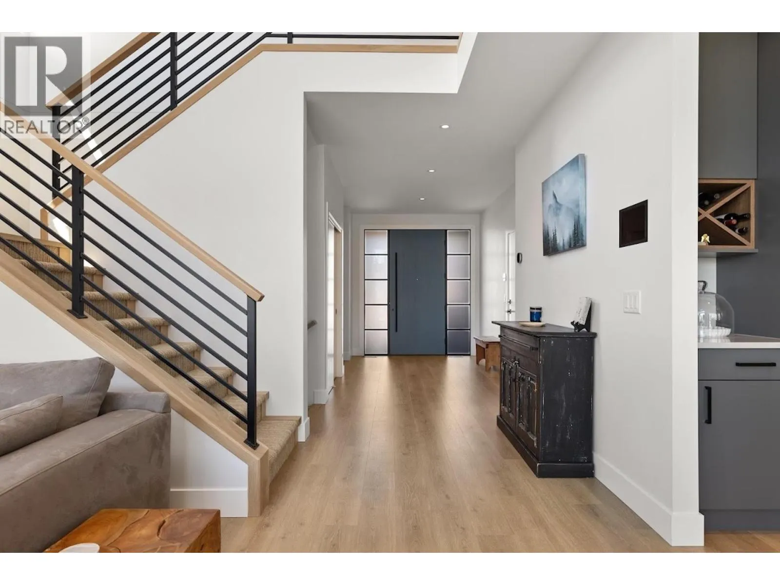 Experience modern luxury and natural beauty in this stunning 4,616 square foot custom home in Wilden, one of Kelownaâs most sought after communities. Thoughtfully designed by Rykon Construction, it features soaring 18 foot ceilings, heated floors in key areas, tri-slider doors leading to an outdoor oasis, and oversized glulam posts and beams with a pergola. The lavish kitchen boasts an eight foot by five foot island, double fridge and freezer, induction cooktop, double wall ovens, and separate prep kitchen. The kitchen flows to the dining room and living room that features two story ceilings and floor-to-ceiling windows to showcase the unobstructed east facing valley views. This level also includes two offices, laundry room, and bathroom. Upstairs is the luxurious primary suite with views and spa like ensuite, along with two more bedrooms, each with an ensuite. The basement includes a theater room with a 100 inch projector, game room, wet bar, guest bedroom, bathroom, and fitness room. Nothing has been spared in this home as smart home automation controls lighting, blinds, security, and more. The oversized 700 square feet two car garage is designed with an EV charger, built-in workbench, cabinets, and room for bikes and all your gear to embrace the Okanagan lifestyle. Outside, enjoy an eight foot deep 32 foot by 16 foot salt water pool, hot tub, covered patio, and tiered lot maximizing light and privacy. Located near Wildenâs extensive trail network and minutes from downtown, this home offers a blend of luxury, functionality, and lifestyle. (id:27476)