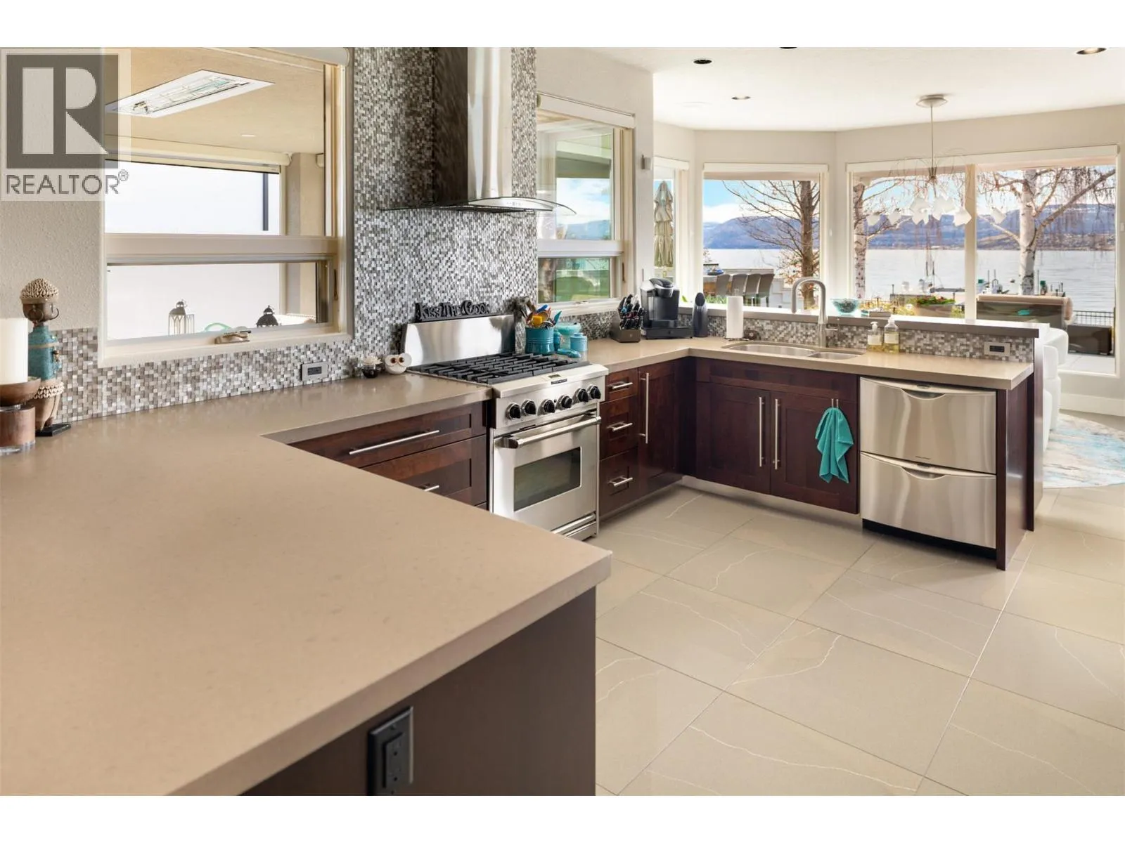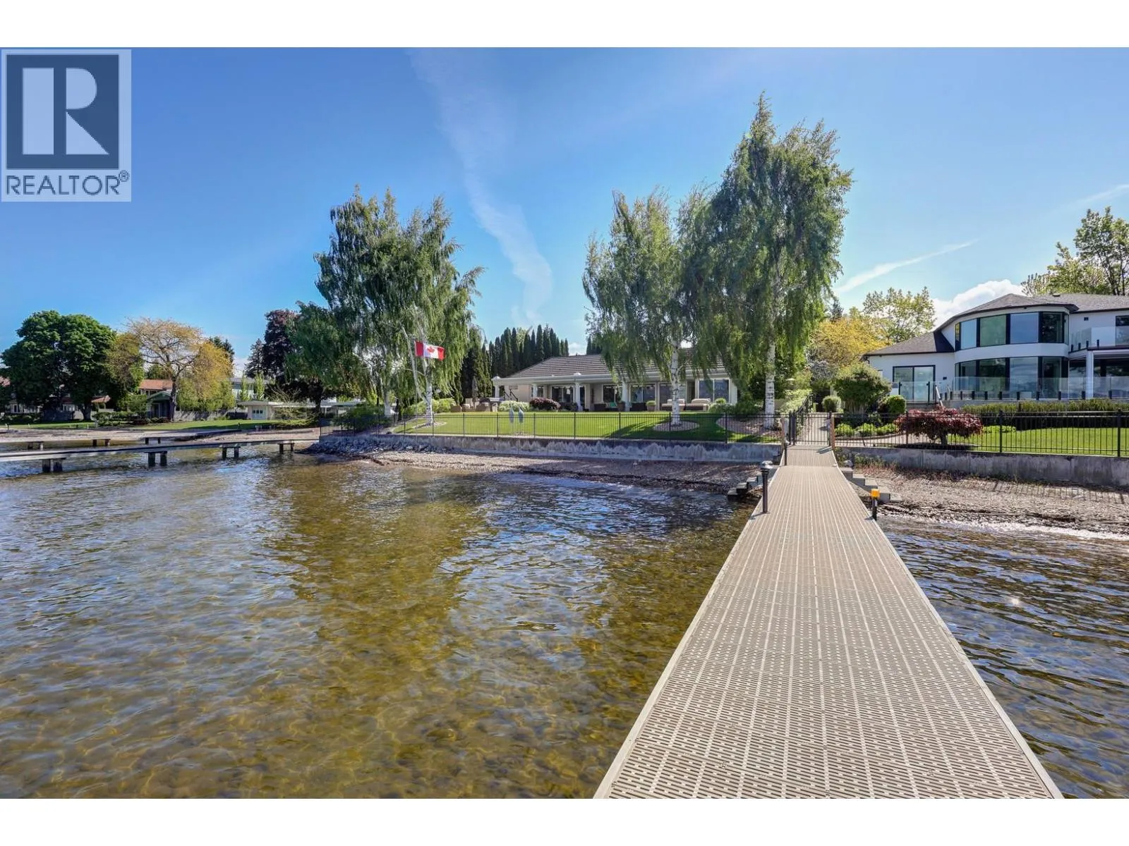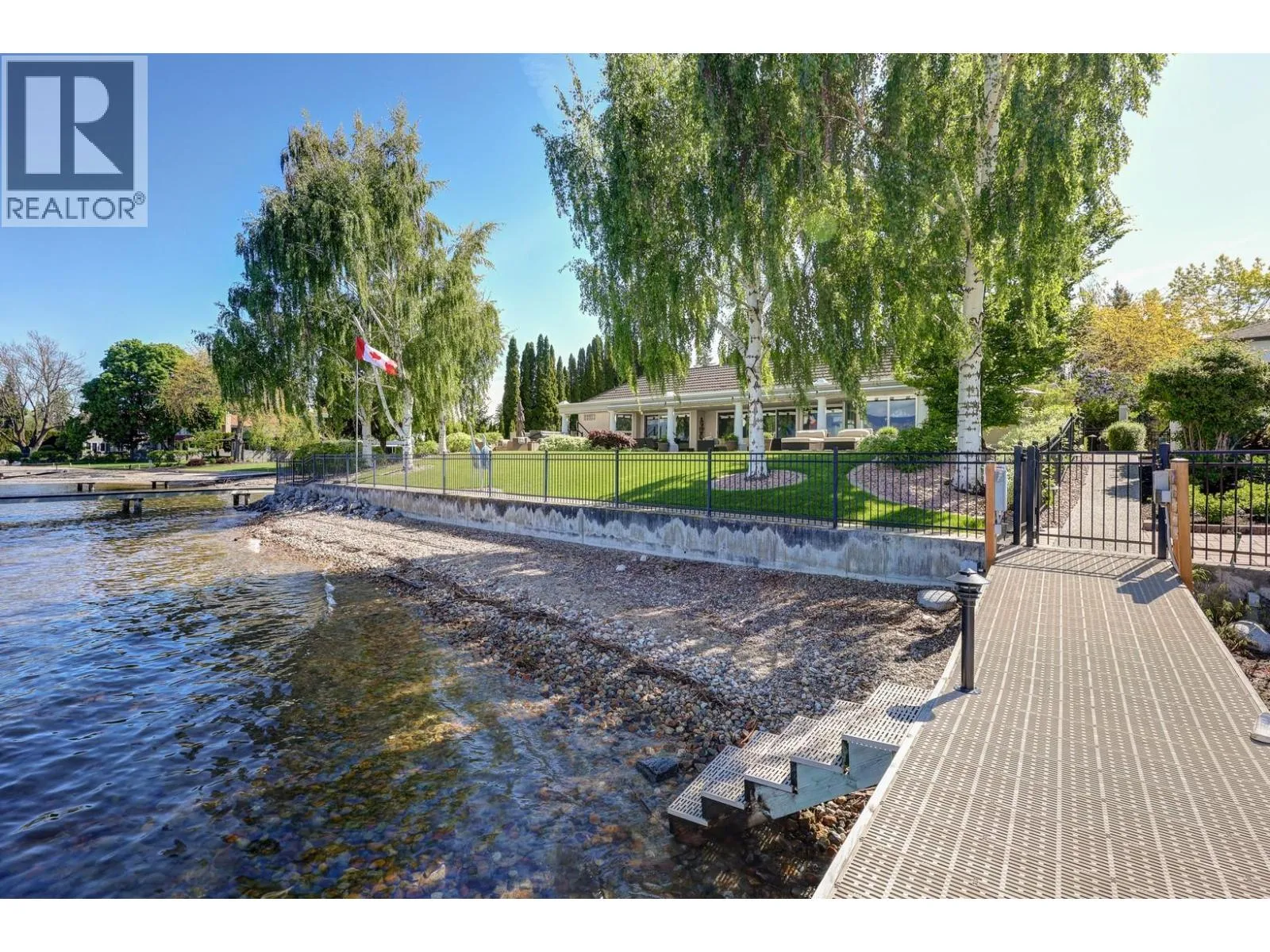 Rare offering on the shores of Okanagan Lake. This one-level lakeshore home in Kelownaâs coveted Lower Mission offers modern comfort with exceptional privacy. Set at the end of a quiet no-thru road, the .49-acre property boasts over 105 ft of level beachfront, mature landscaping, and a shared dock with boat and Seadoo lifts. Spanning over 3,600 sq ft, this 3-bed, 3-bath rancher with 1 bed/1 bath guest house is designed for effortless indoor-outdoor living, featuring floor-to-ceiling sliding doors and stunning lake views from nearly every room. The gourmet kitchen is perfect for entertaining, complete with custom cabinetry, expansive counters, professional-grade appliancesâincluding a gas range, double oven, and dual dishwashersâand a charming breakfast nook with lake views and patio access. The generous primary suite offers direct patio access, a spa-inspired ensuite, and a walk-in closet with a skylight and center island. A detached guest casita with its own bed and bath provides the ideal retreat for visitors. Outside, the expansive patio with built-in BBQ, outdoor kitchen, ceiling fan, and heaters sets the stage for lakeside gatherings. Additional highlights include a triple garage, smart home features, heated floors, and a private hot tub. A rare opportunity to live lakeside in one of Kelownaâs most sought-after neighbourhoods, just minutes to downtown, world-class wineries, and local golf courses. (id:27476)