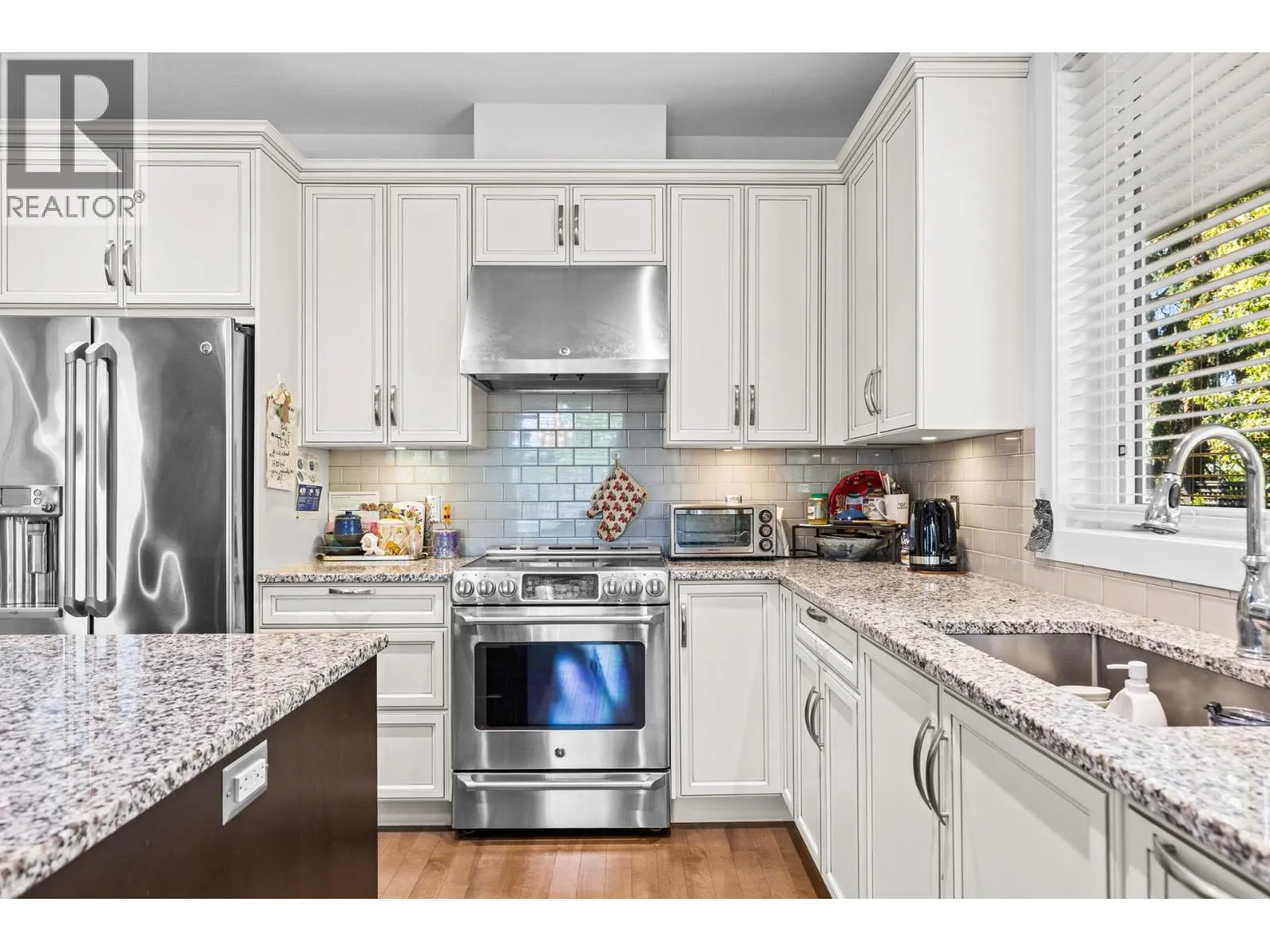 Welcome to Gablecraft in the Mission! This beautiful corner townhome offers a rare combination of privacy, style, and functionality in one of Kelownaâs most sought-after complexes. With mature landscaping, and timeless curb appeal including stone accents, tiled terrace, and a charming front gate, this home stands out from the rest. Inside, youâll find a thoughtful two-bedroom, two-bathroom layout with bedrooms set on opposite sides of the entry hall for added privacy. Soaring ceilings and oversized windows fill the home with natural light, while quality finishes like granite counters, custom tile work, and double sinks in the primary ensuite provide a touch of luxury. The open-concept living and dining areas flow seamlessly into a chef-inspired kitchen featuring a large island, GE stainless steel appliances, soft-close cabinetry, and ample workspace, perfect for both everyday living and entertaining. A gas fireplace, upgraded ceiling beams, and sliding glass doors to the back patio with views of the southeast hills add warmth and character. Additional features include a spacious double garage, a convenient laundry room just off the kitchen, and a versatile flex area that adapts to your lifestyle. Fully fenced private yard with concrete patio area. (id:27476)
