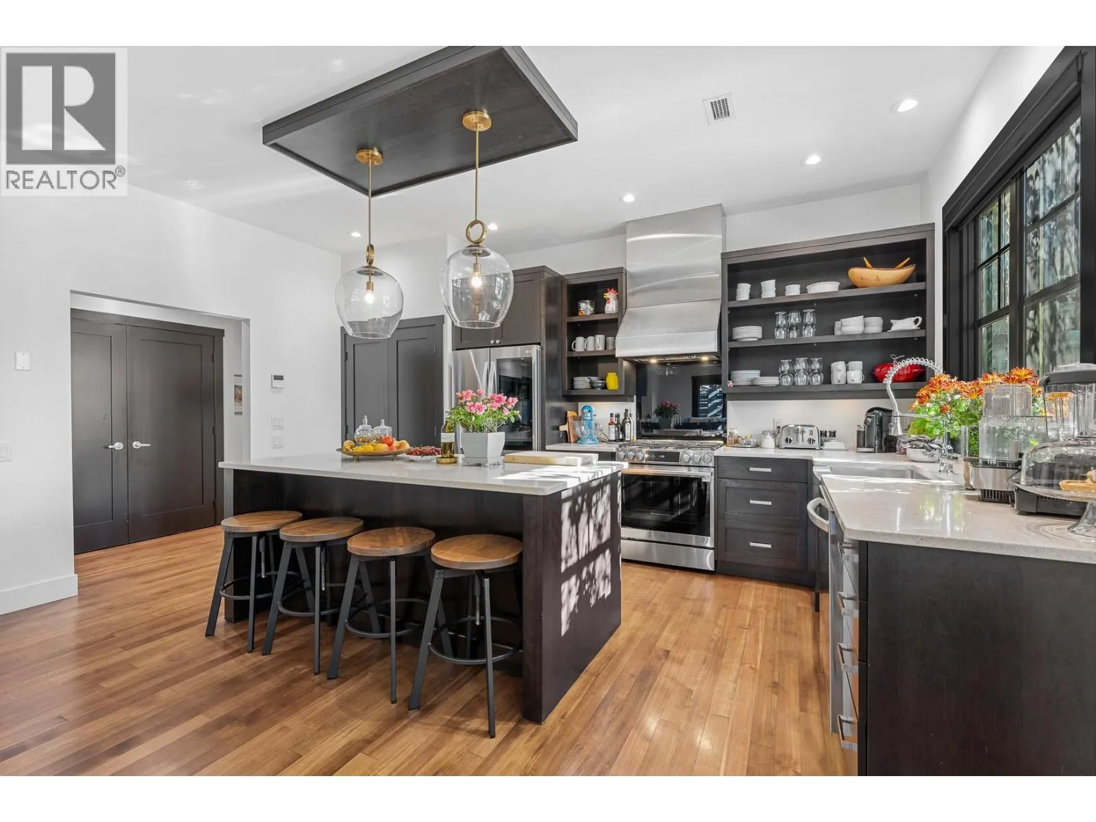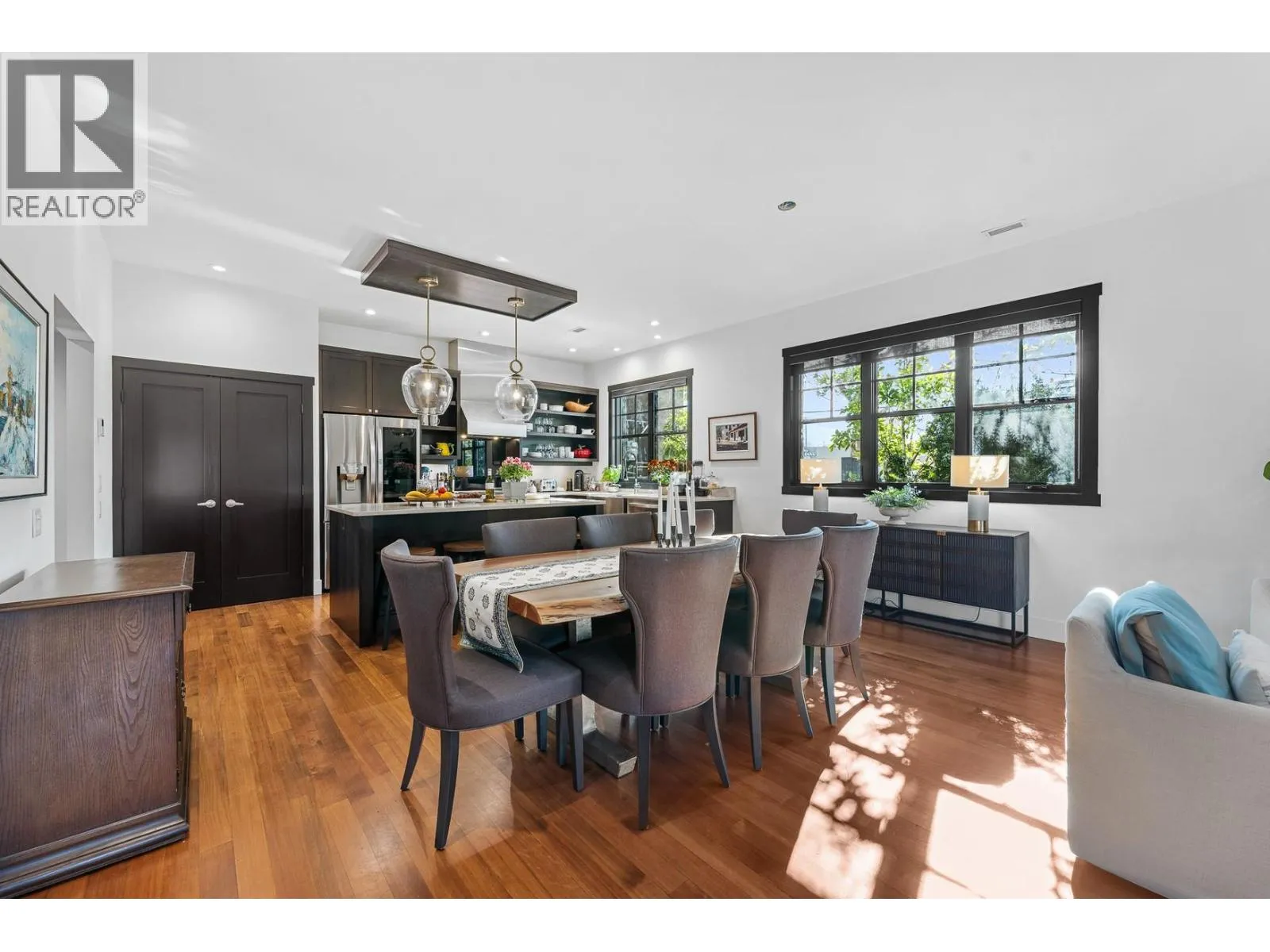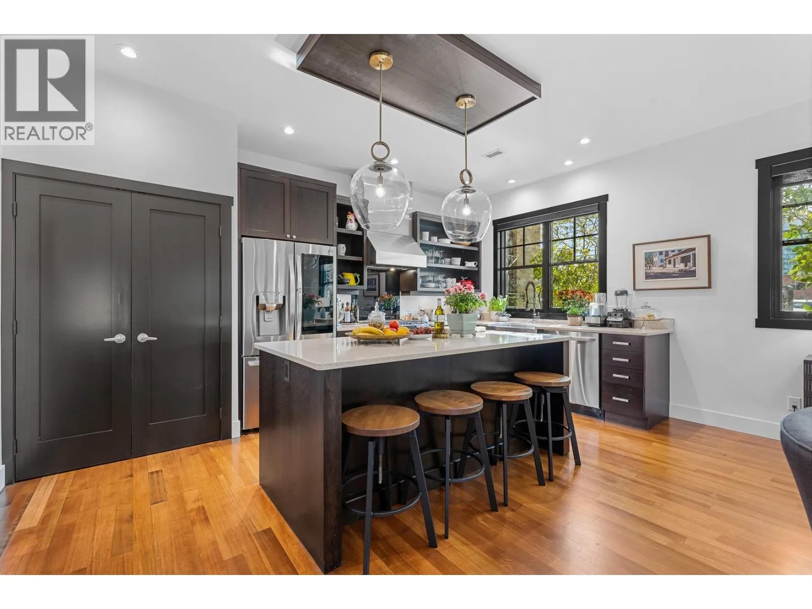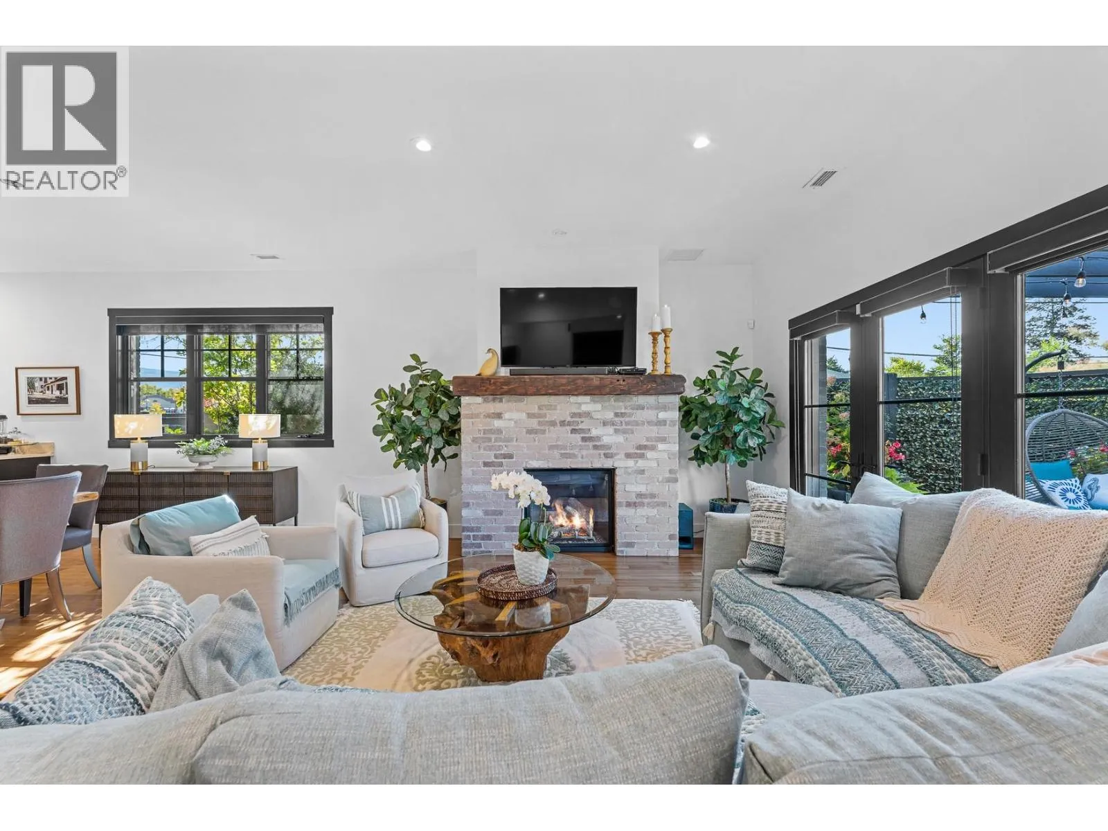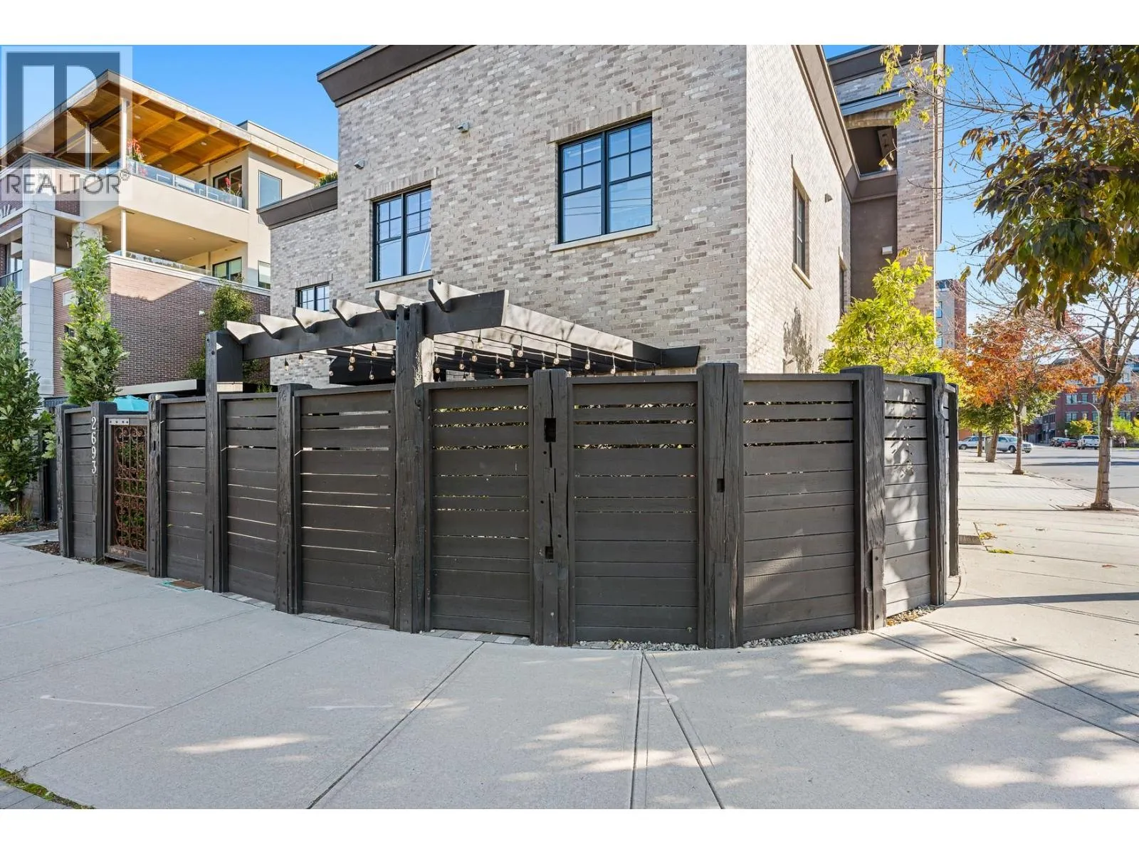 Nestled in the heart of South Pandosy, one of Kelowna's most sought-after neighborhoods, this beautiful brownstone showcases luxury and urban sophistication. This home features main-level living with an open-concept layout, seamlessly integrating the kitchen, dining, and living areasâideal for daily life and entertaining. The gourmet kitchen is a chefâs dream, complete with custom cabinetry, professional-grade stainless steel appliances, a spacious center island, and elegant white quartz countertops. Fir wood floors extend throughout the main level, while a cozy built-in desk provides a dedicated workspace off the living room. The living room features a brick-surround gas fireplace as its focal point. French doors open to a private, fenced patio shaded by a pergola, surrounded by mature landscaping that enhances privacy and creates a tranquil outdoor escape. Ascend to the second level, where youâll find two primary retreats, each with its own en suite, making it an ideal layout for guests. The main primary en suite is a sanctuary of luxury, offering a glass-enclosed shower, floating double vanity, and a classic claw-footed tub. With a walk score of 93, this property offers the ultimate in convenience, situated just minutes from the boutique shops, vibrant cafes, and the Abbott Street corridor. one-car garage. (id:27476)