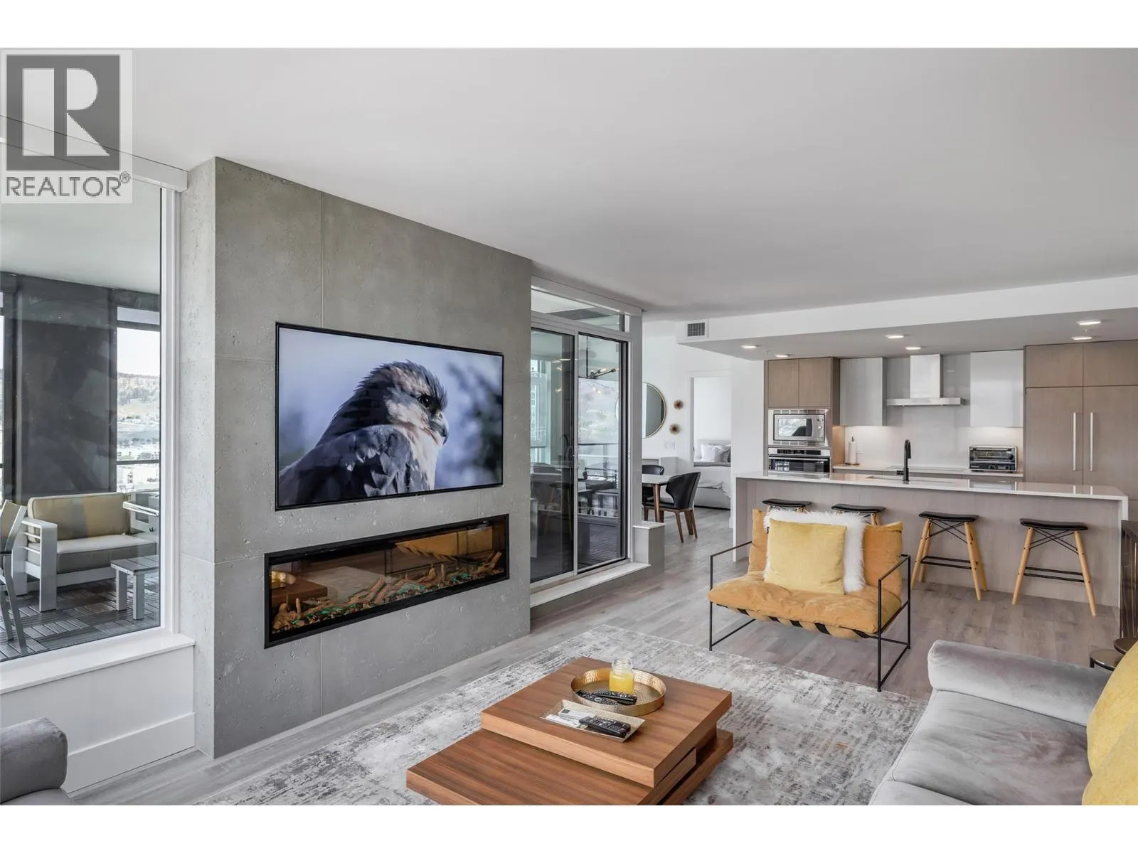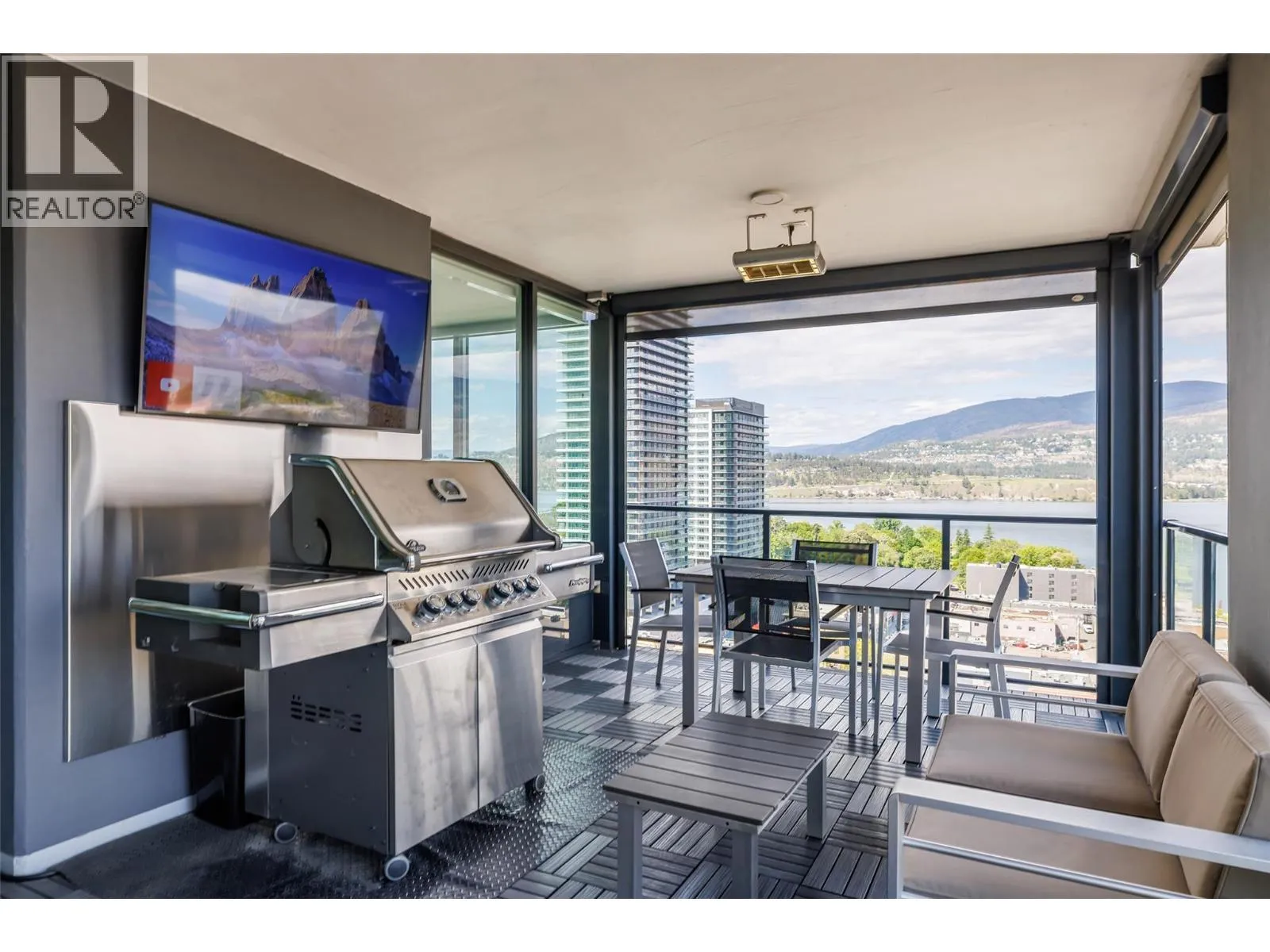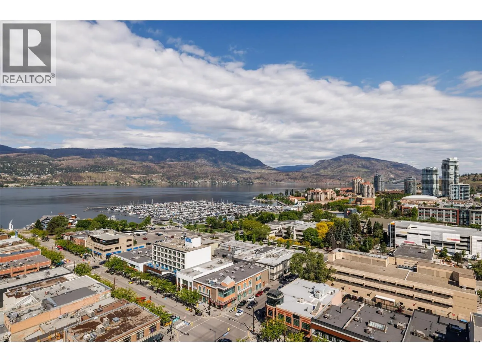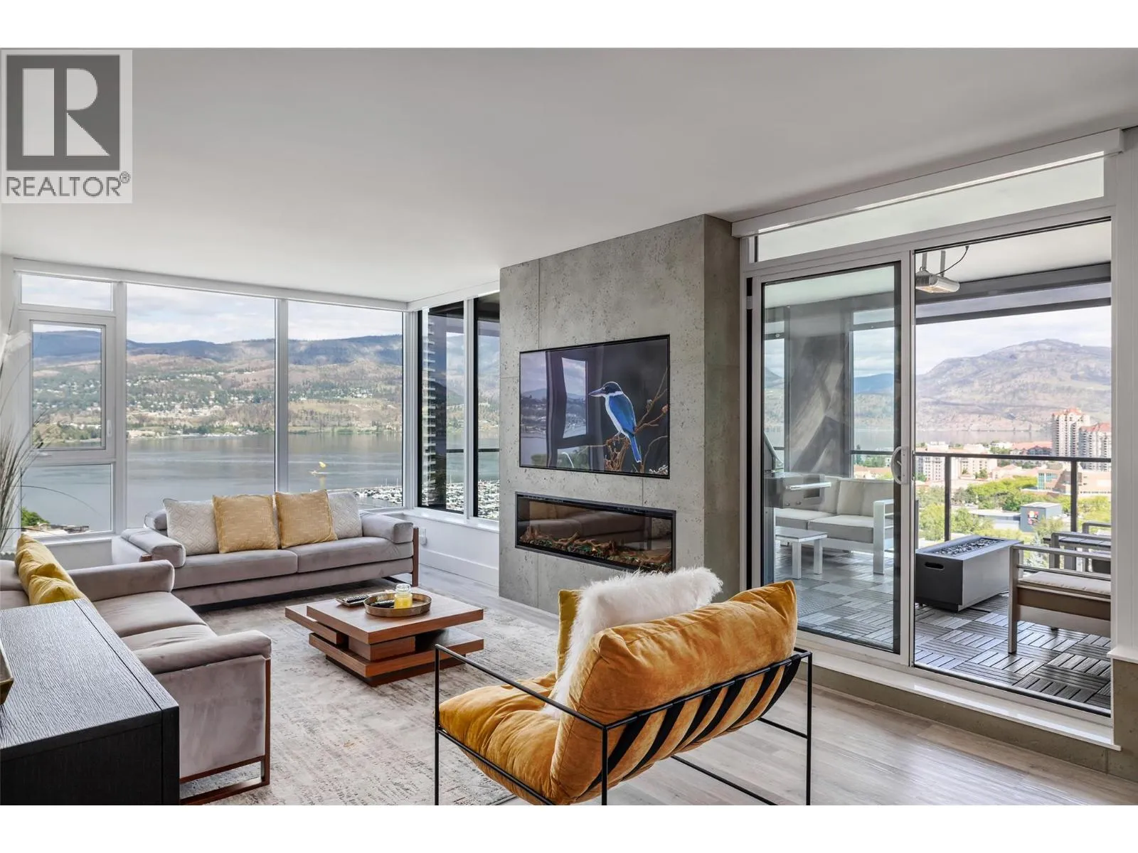 Discover Sub-Penthouse luxury in the heart of downtown Kelowna. Welcome to ELLA, where elevated design meets urban convenience. Perched on the 20th floor, this 2 BEDROOM +DEN, 2.5 BATH. Sub-penthouse showcases breathtaking lake, city, and valley views. Thoughtfully upgraded with over $140K in custom features including Control4 automation, remote powered blinds, and a stunning floor-to-ceiling fireplace, this residence offers the best in modern living. The chefâs kitchen boasts integrated appliances, quartz countertops, a Marvel beverage fridge, and an expansive island with seating for 4. Entertain effortlessly in the open-concept living and dining areas, or take the party outdoors on your 19'x11' covered terrace, complete with infrared heaters, privacy screens, a wall mounted tv and panoramic vista views. The spacious primary suite features a walk-through closet and a spa-inspired 5-piece ensuite with heated floors, a soaker tub, and a glass enclosed shower. A private den with built-in desk, a second bedroom with full ensuite bath, and premium extras including 3 SIDE BY SIDE PARKING STALLS & 2 LOCKERS. This truly is the complete package. Prime location, located steps to Kelownaâs top dining, shops, Waterfront Park, and the marina. (id:27476)
